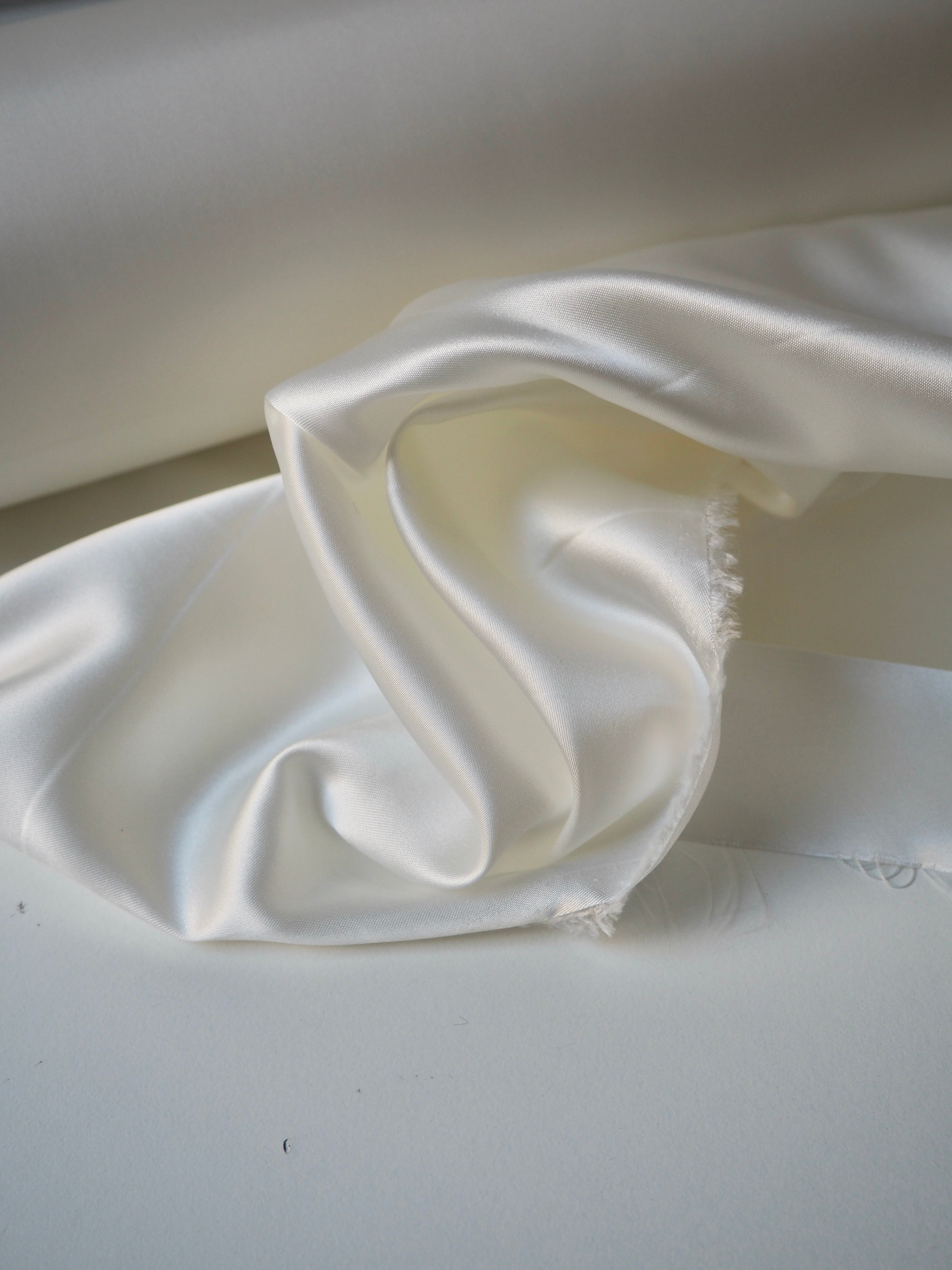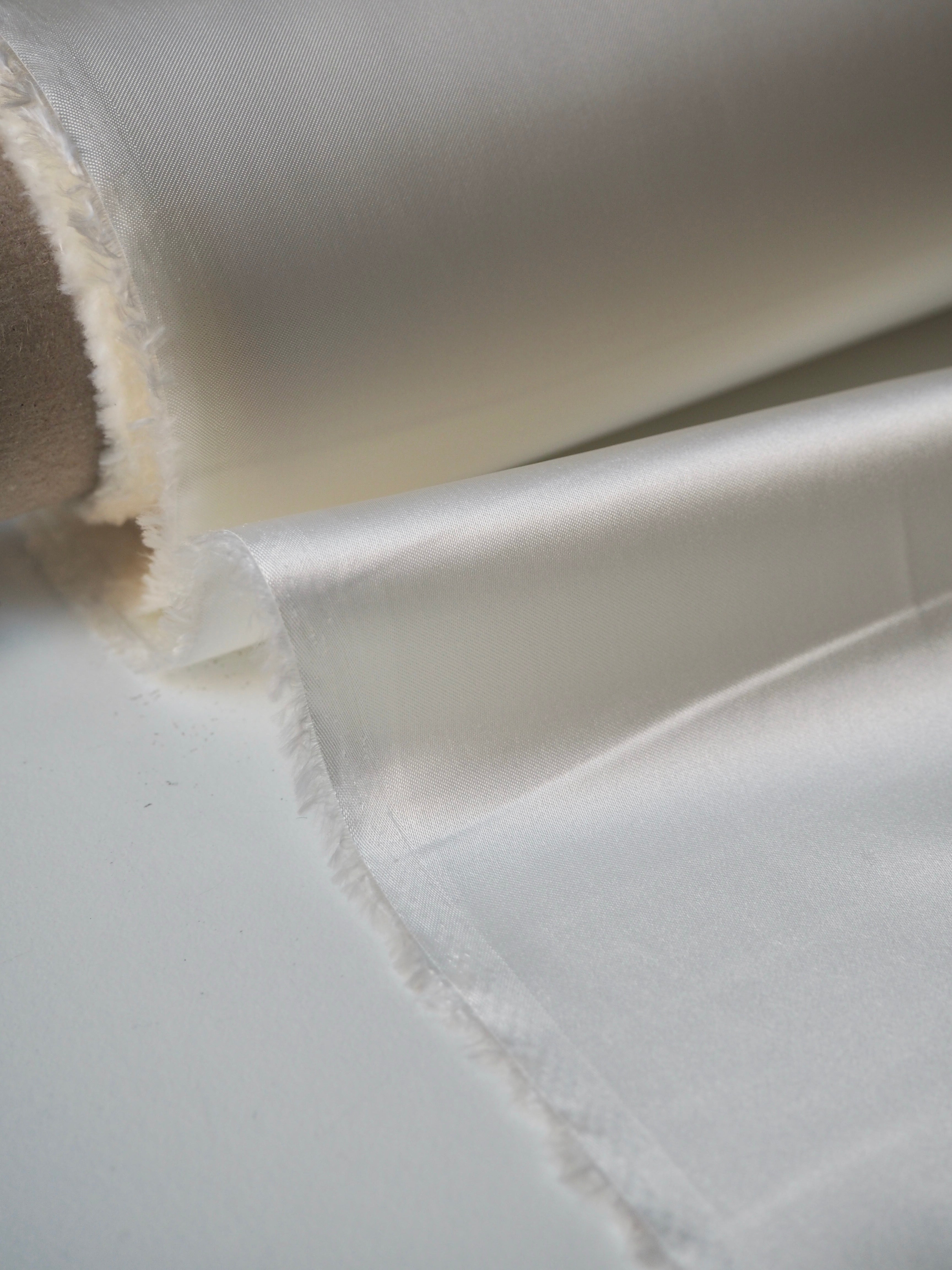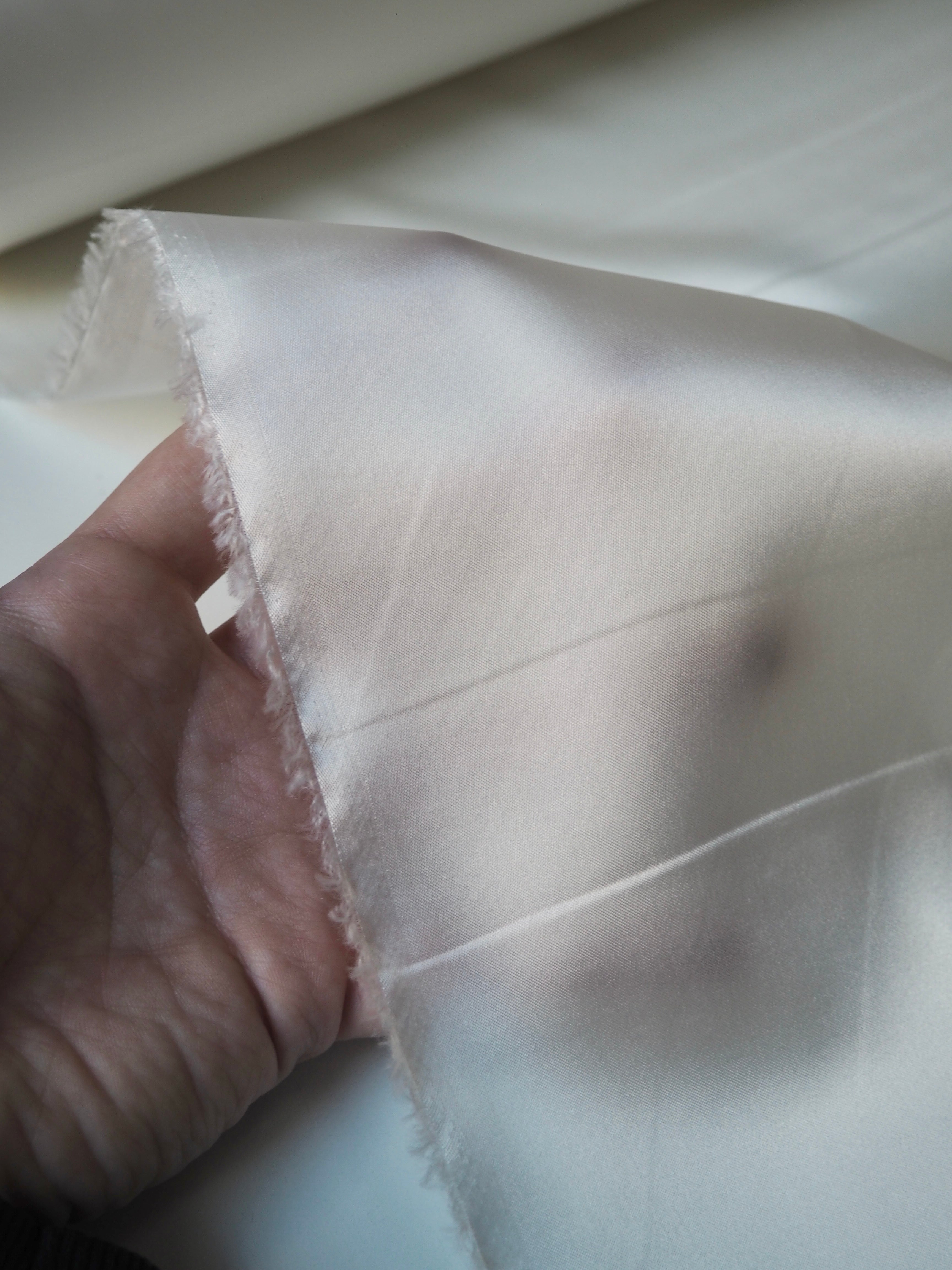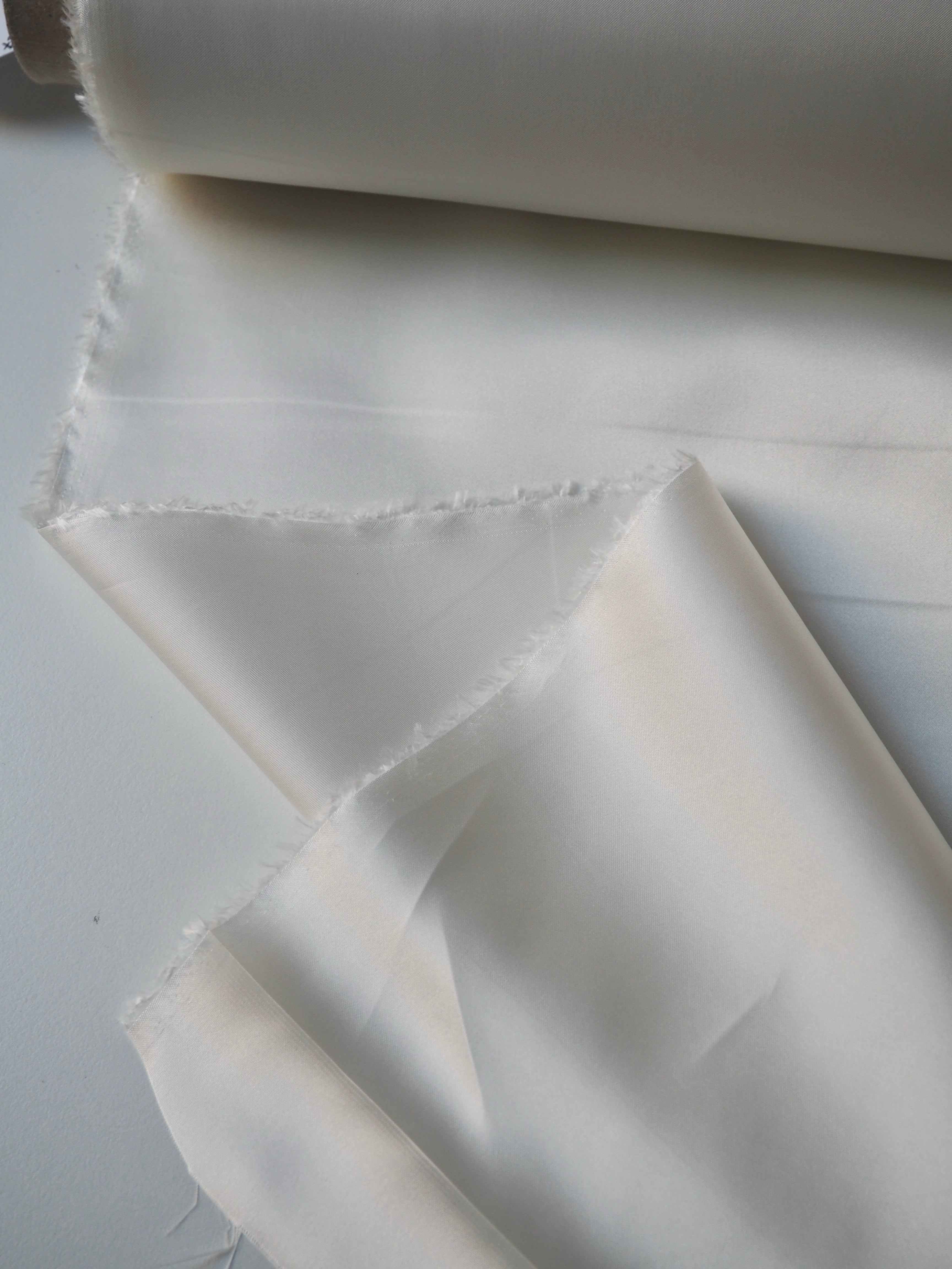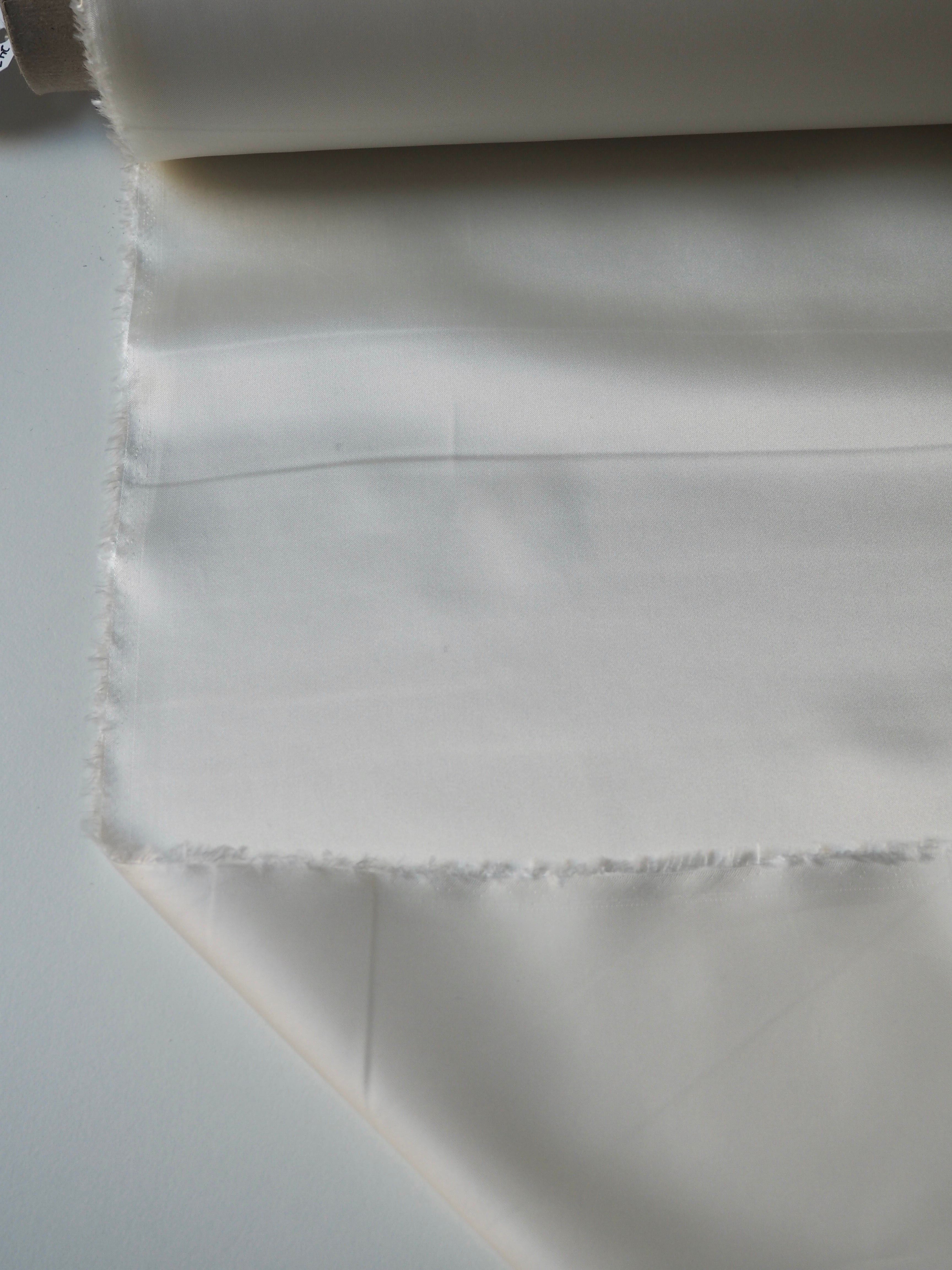 This ex-designer fabric is a lining. It has a satin weave with a gentle drape. Lightweight with beautiful movement and medium bright sheen finish. Hold shape well, has a nice light structure. Mostly opaque. Ideal for lining any garment!
