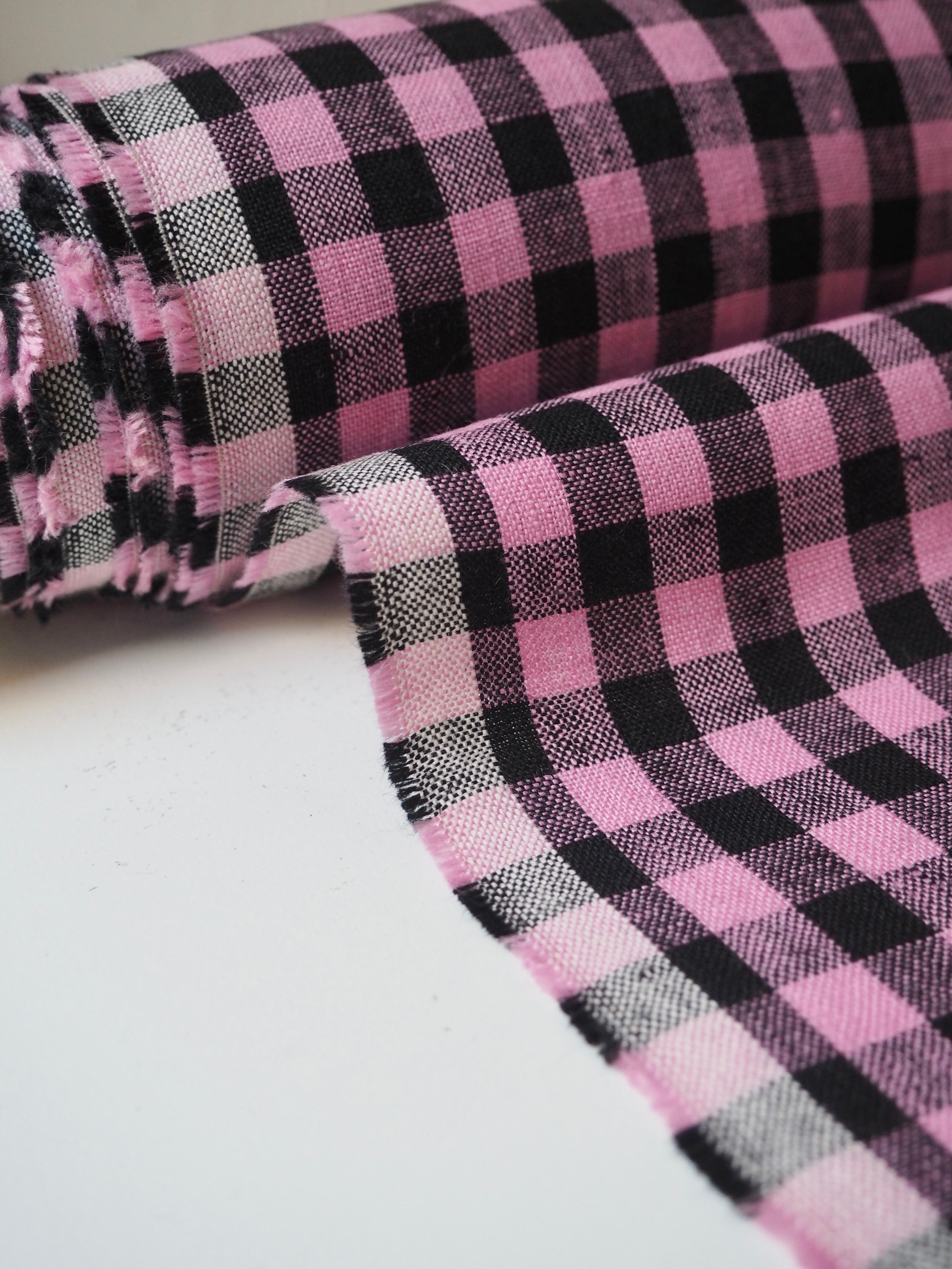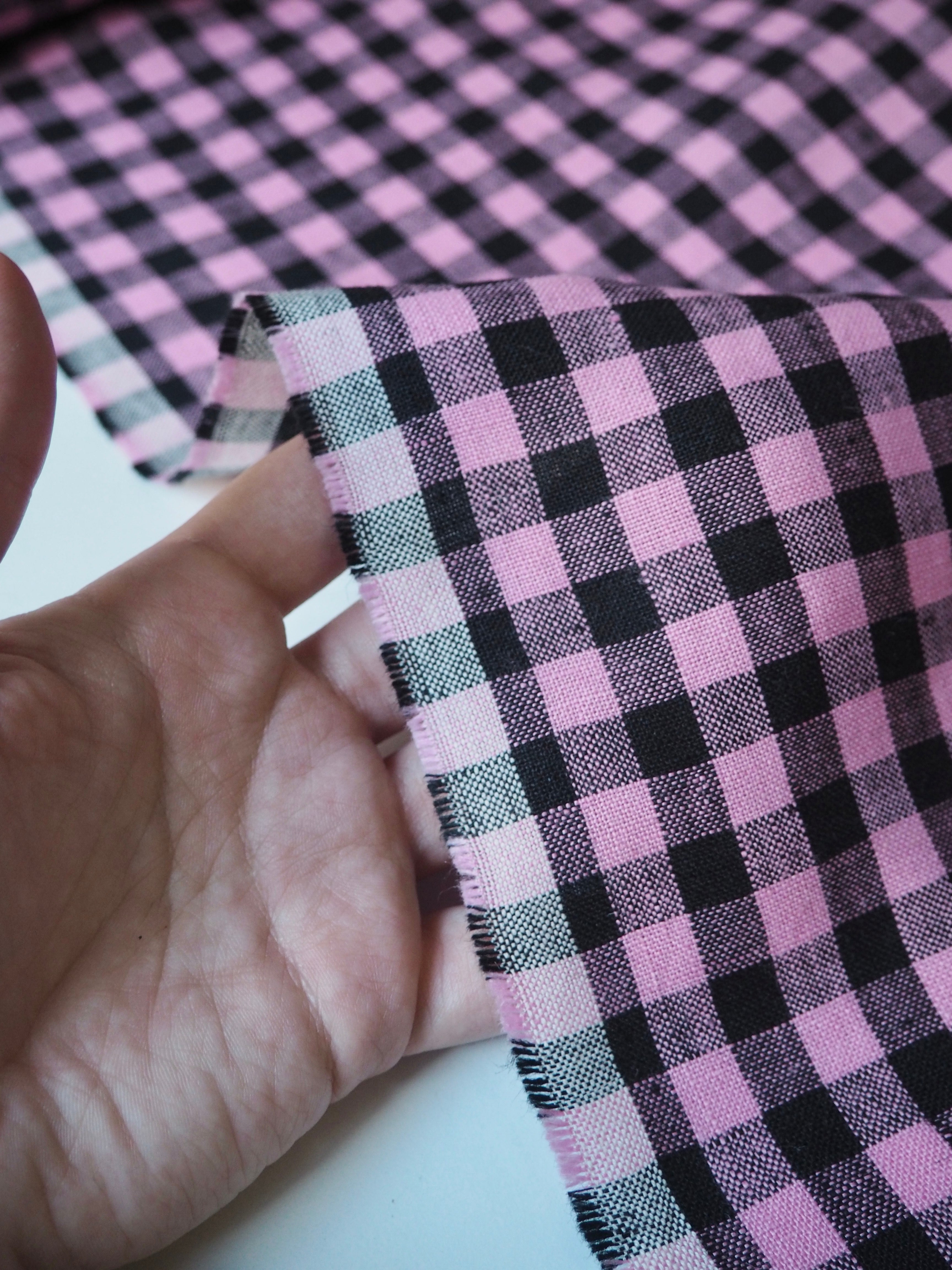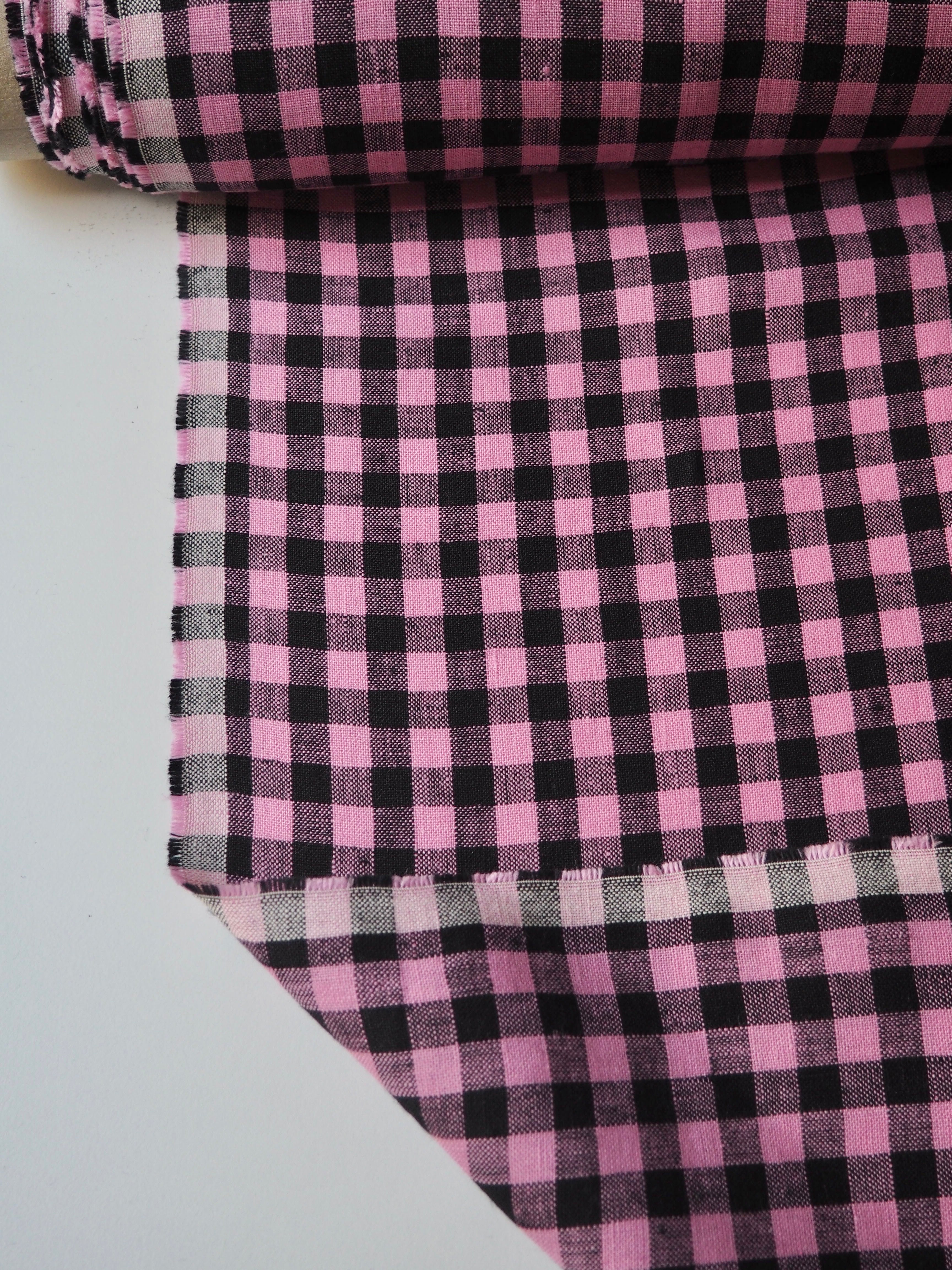 This ex-designer fabric is a lovely linen. It's a pink and black colourway, in a gingham check. It has a soft and gentle linen weave with a typical linen texture, and a brilliant handle that's so wearable. Lightweight with a gentle structured drape, and fully opaque. From popular London-based brand Beyond Nine. Lovely for a bias dress of skirt, summer tops or Everyday Trousers!