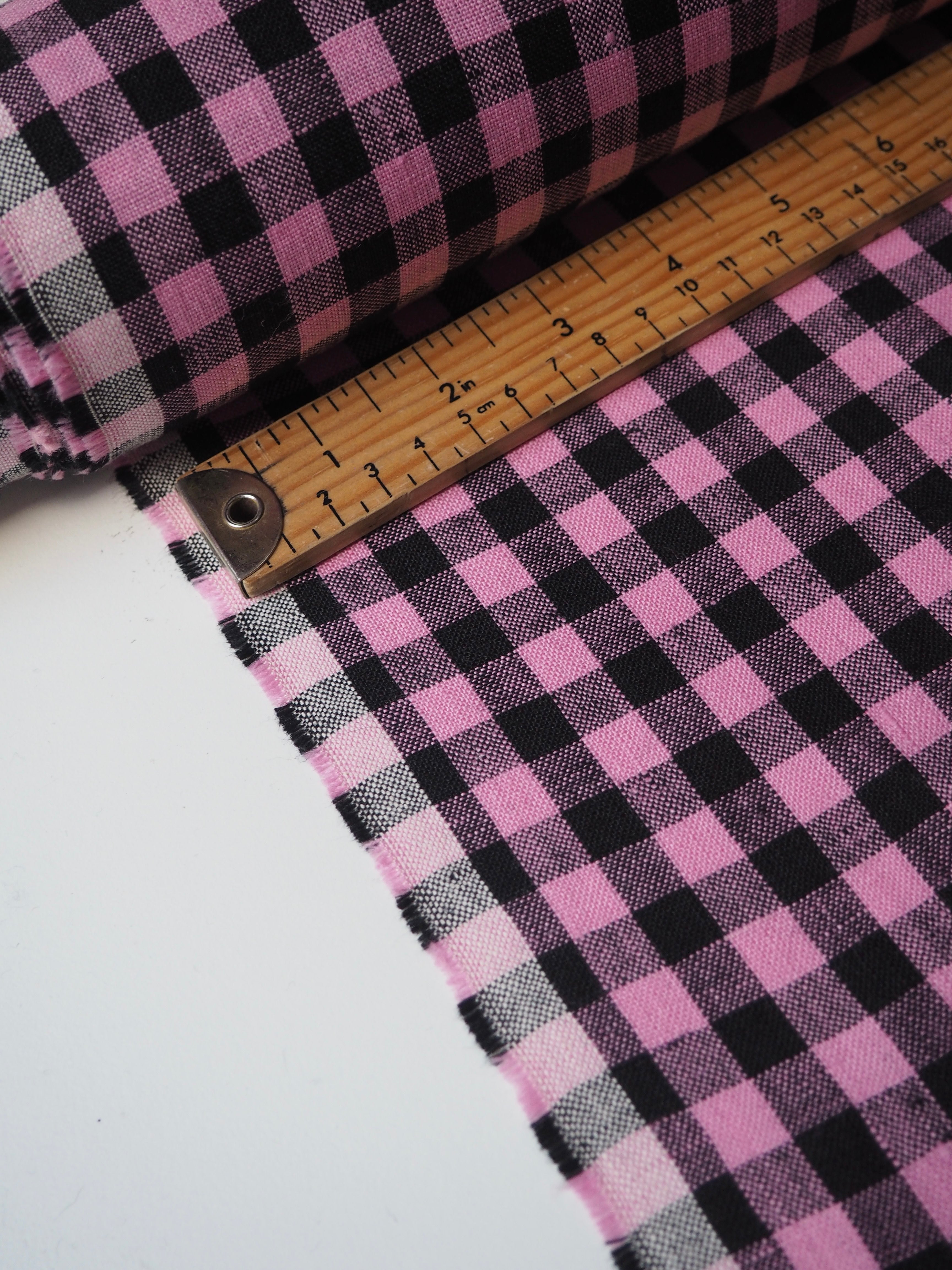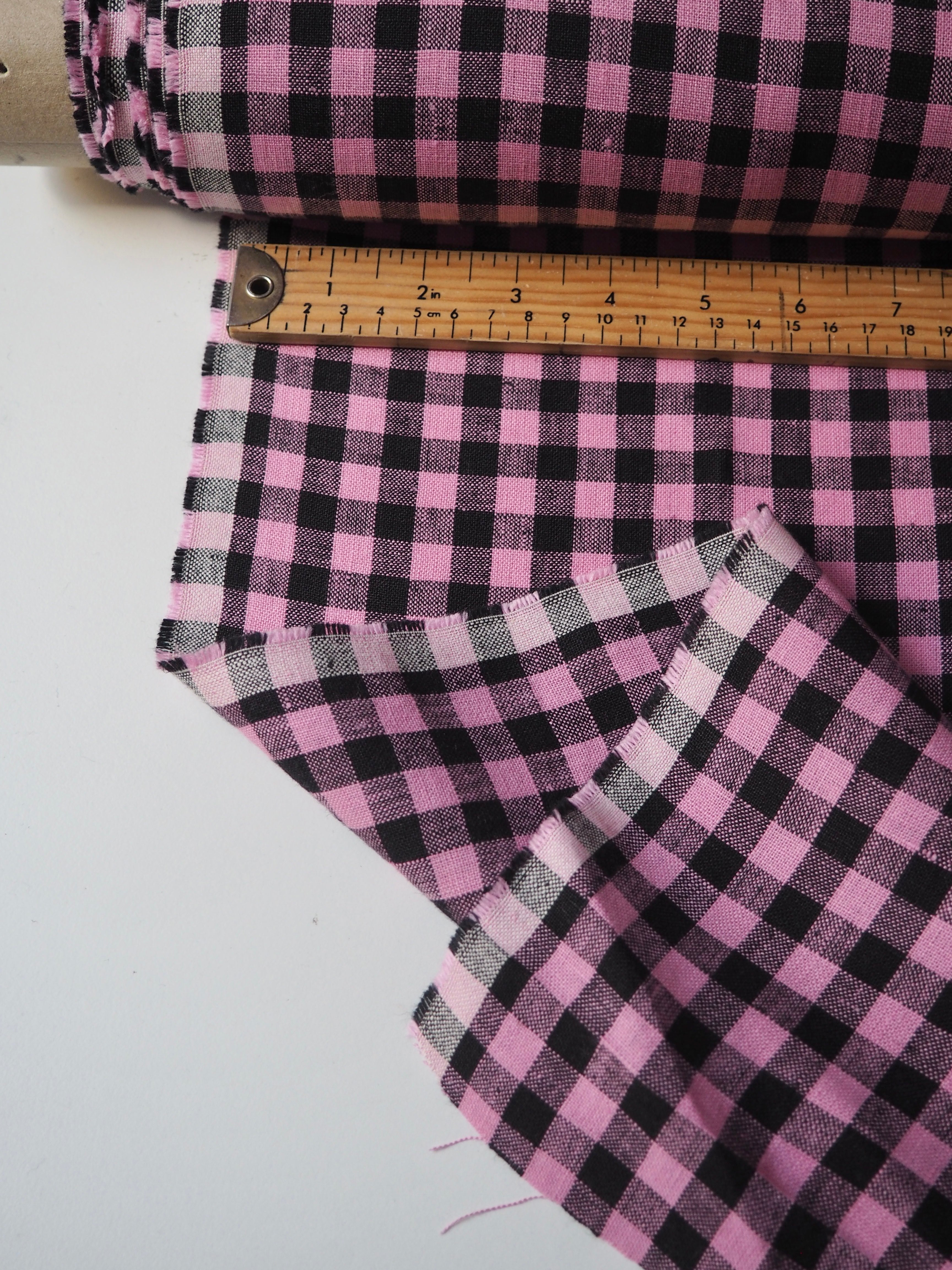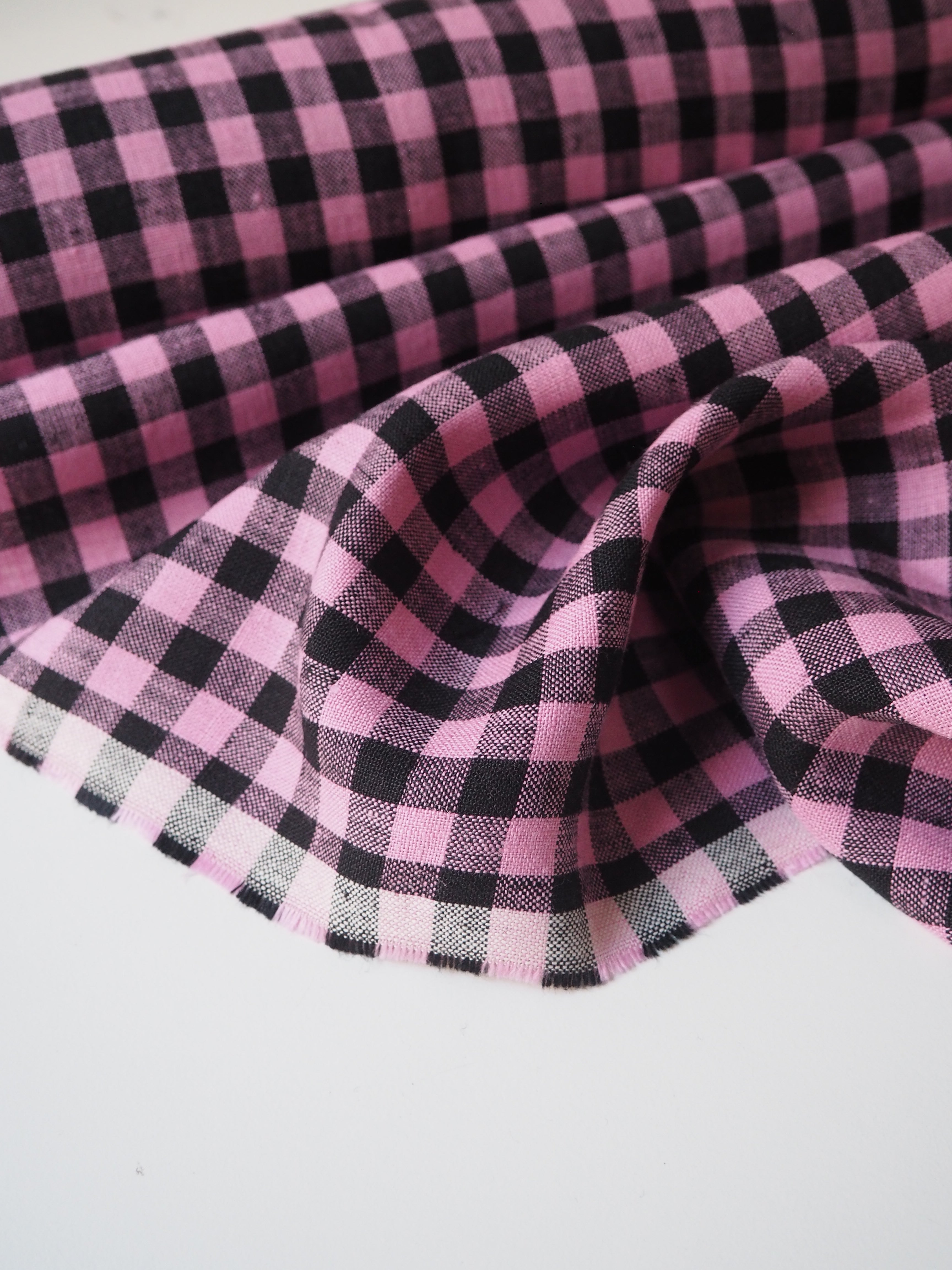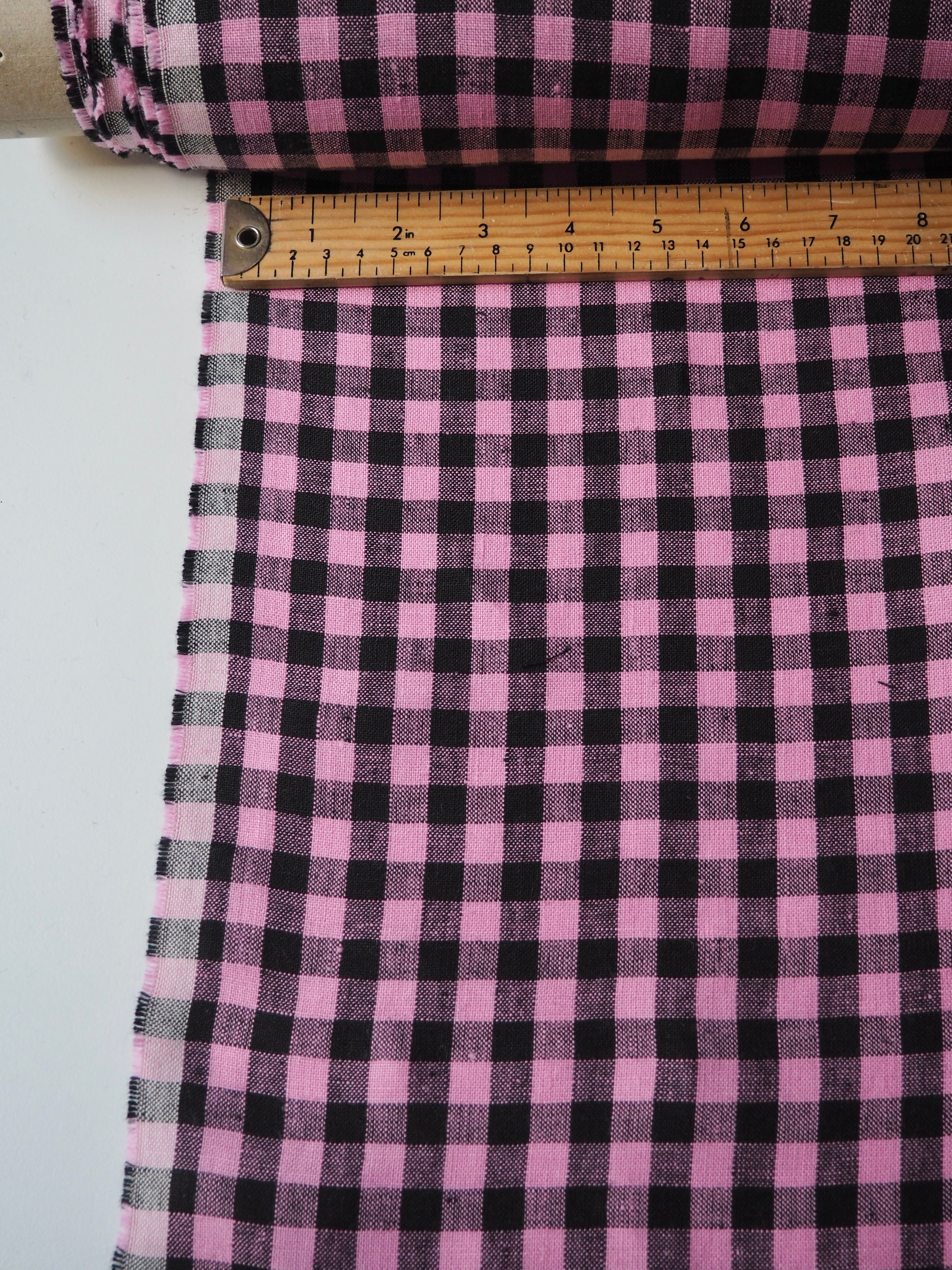 This ex-designer fabric is a lovely linen. It's a pink and black colourway, in a gingham check. It has a soft and gentle linen weave with a typical linen texture, and a brilliant handle that's so wearable. Lightweight with a gentle structured drape, and fully opaque. From popular London-based brand Beyond Nine. Lovely for a bias dress of skirt, summer tops or Everyday Trousers!