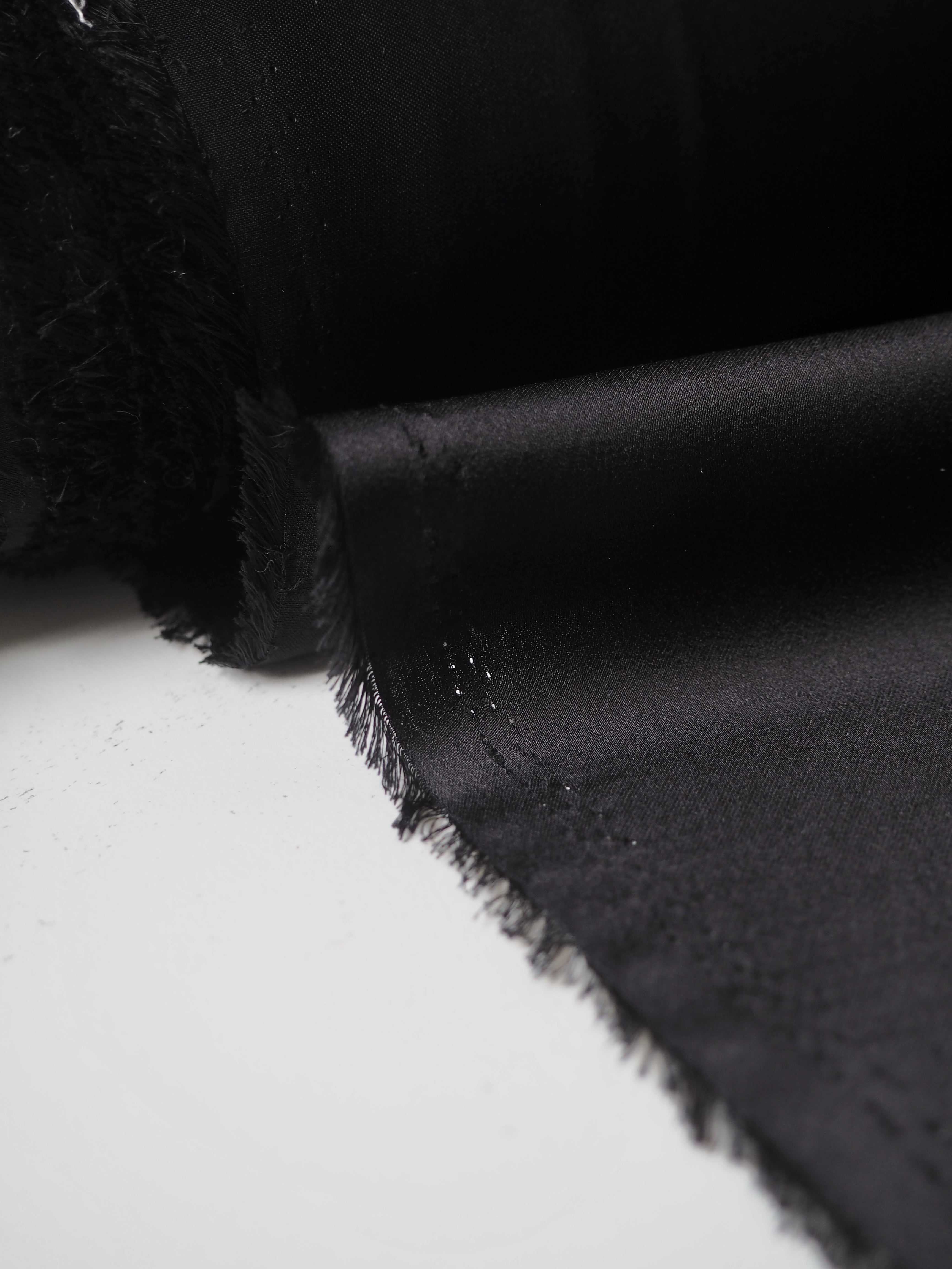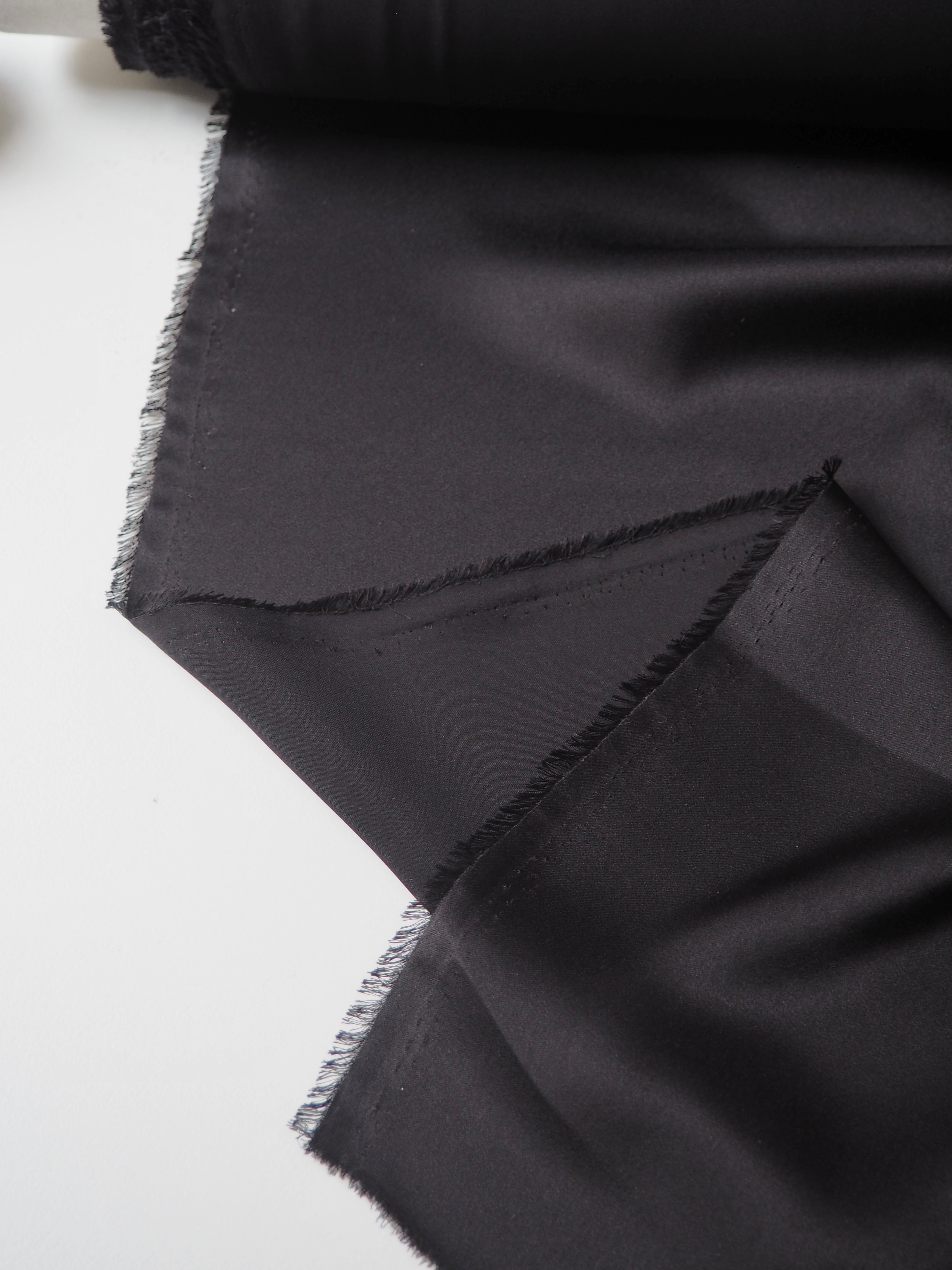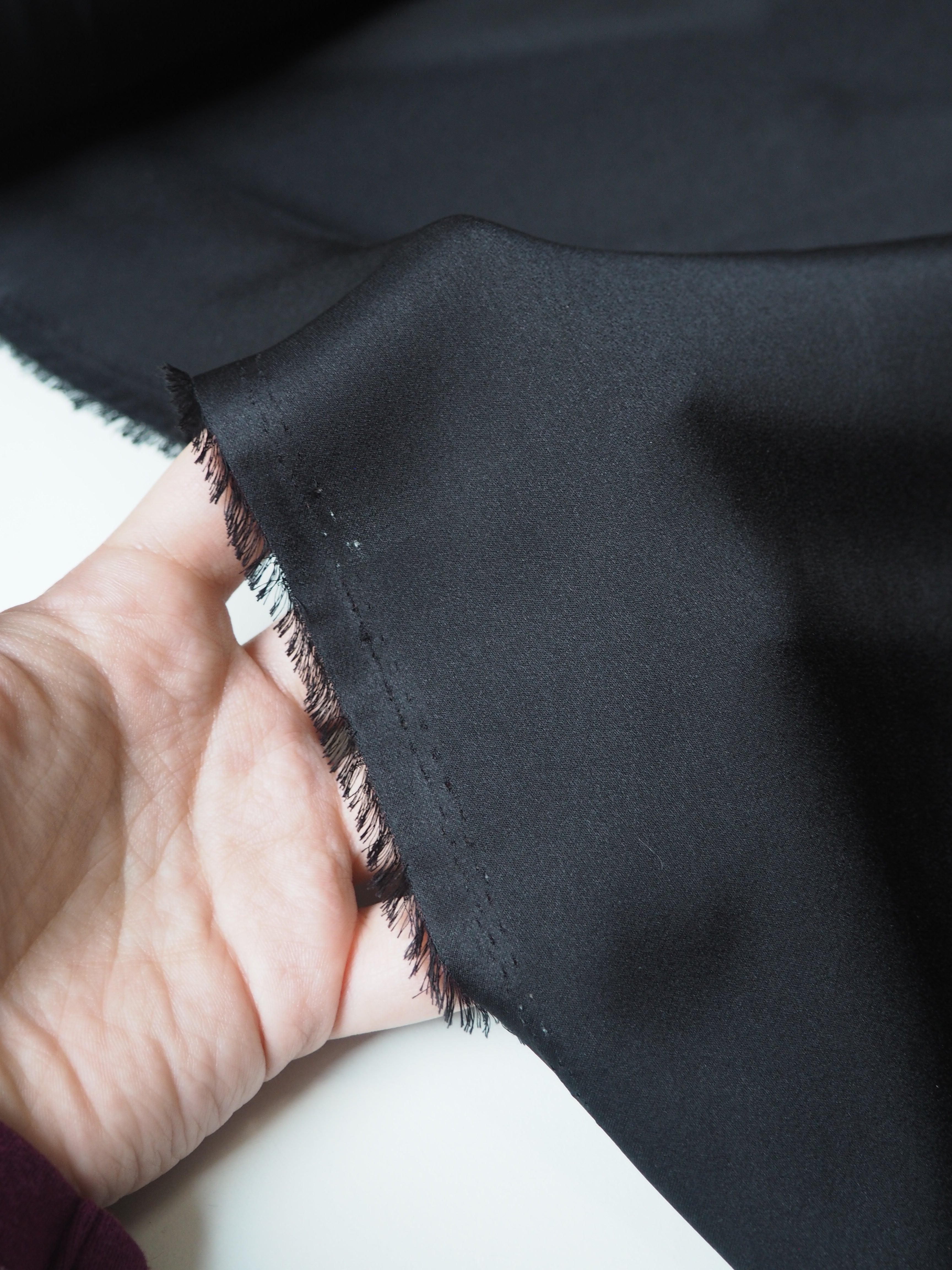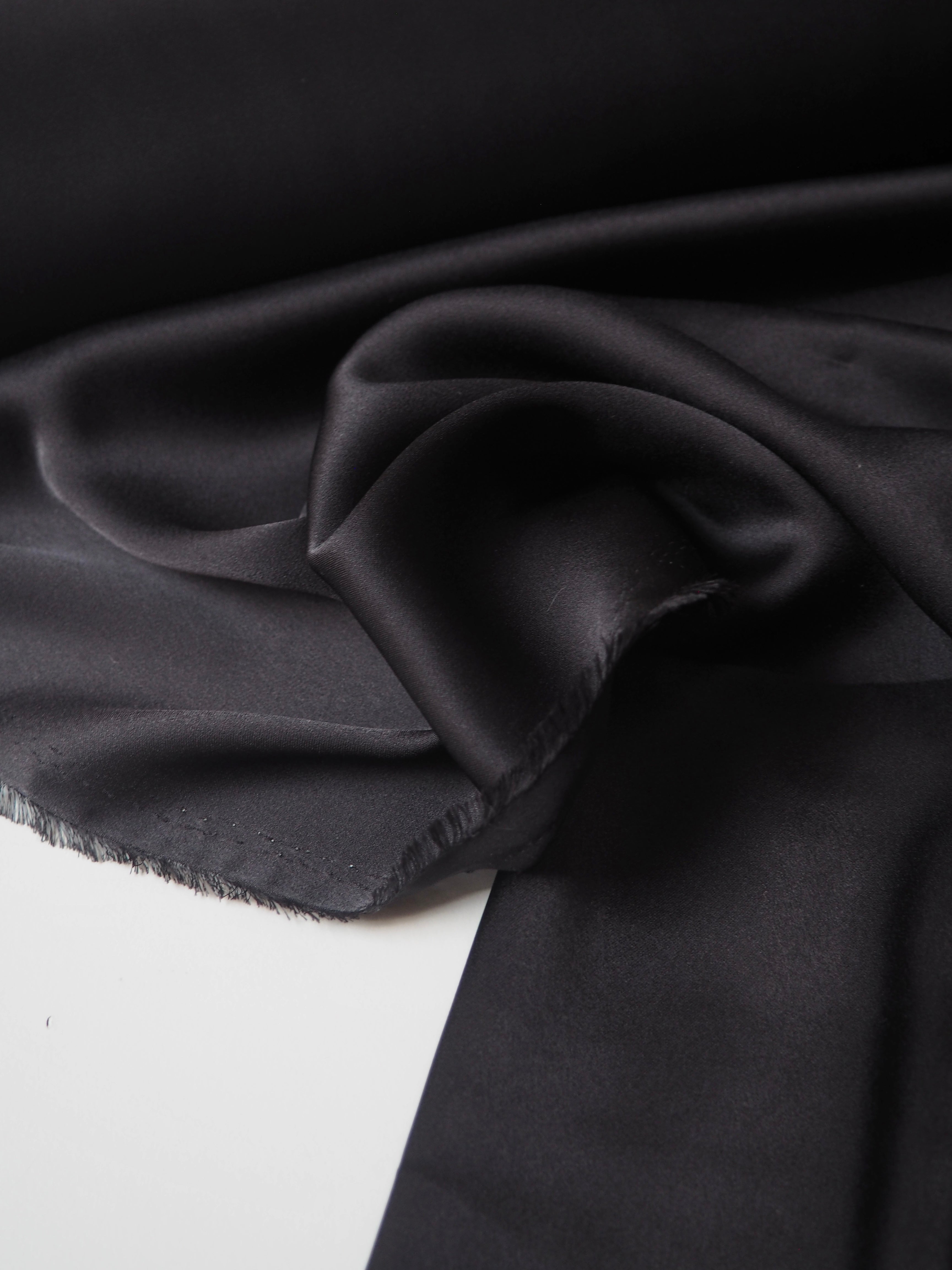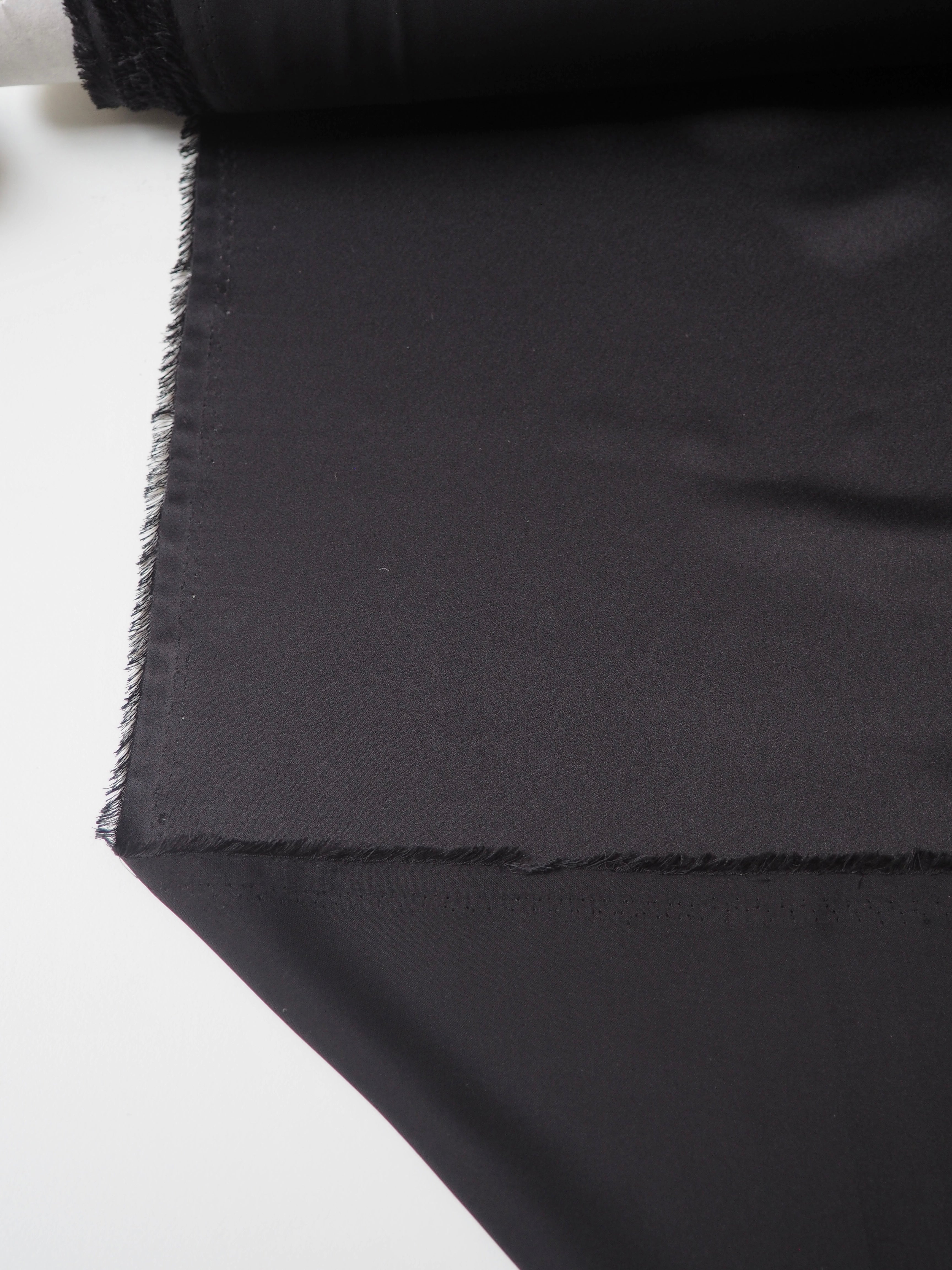This ex-designer fabric is a satin. It's in classic black, in a light weight. It has a very smooth handle, slinky feel, and great movement and drape. Has a lovely smooth, satin sheen on the topside, with a smooth reverse. Has a lovely handle, and is almost fully opaque, but lets a little light in. Perfect for bias dresses! or even fancy pyjamas!