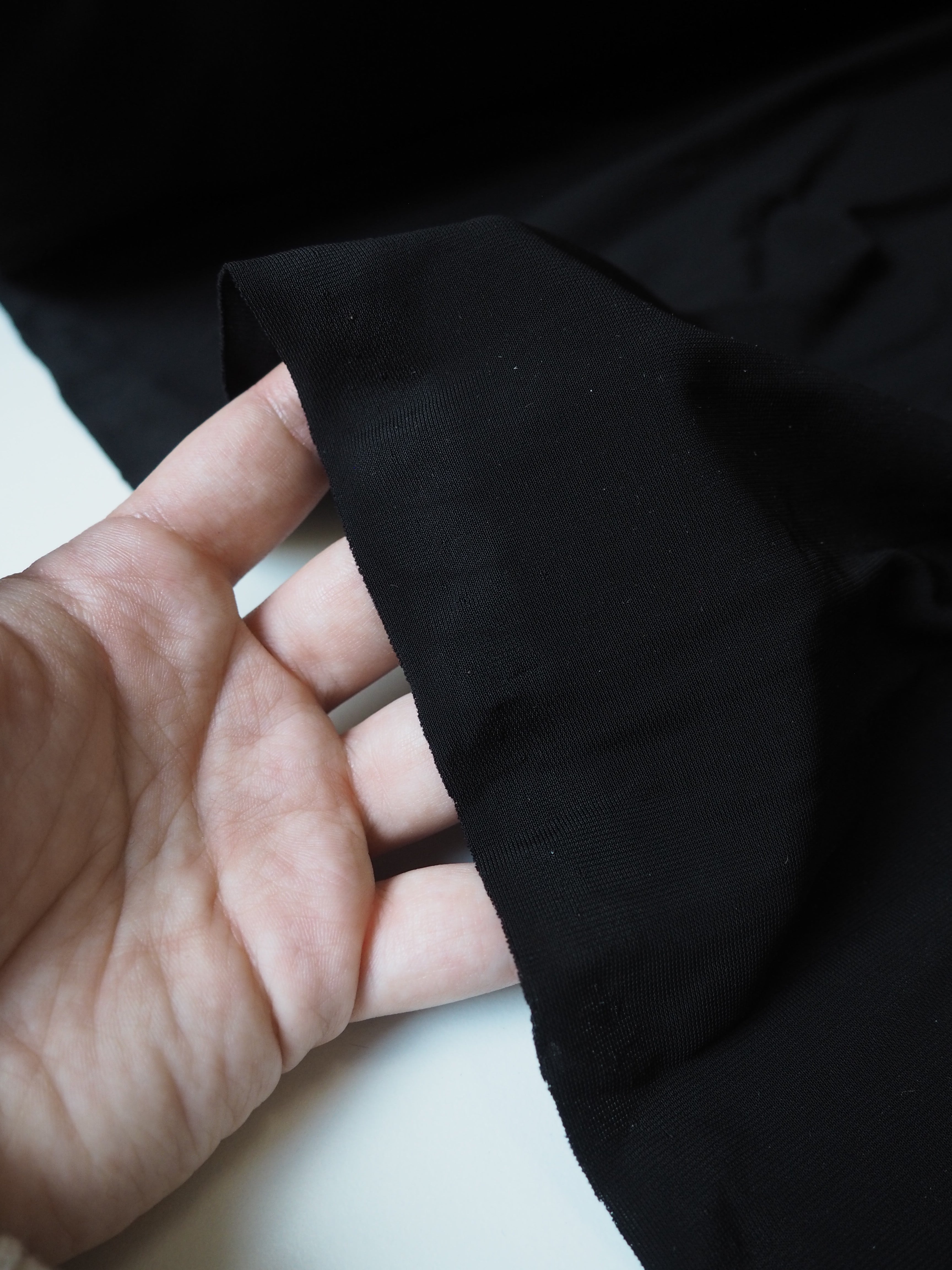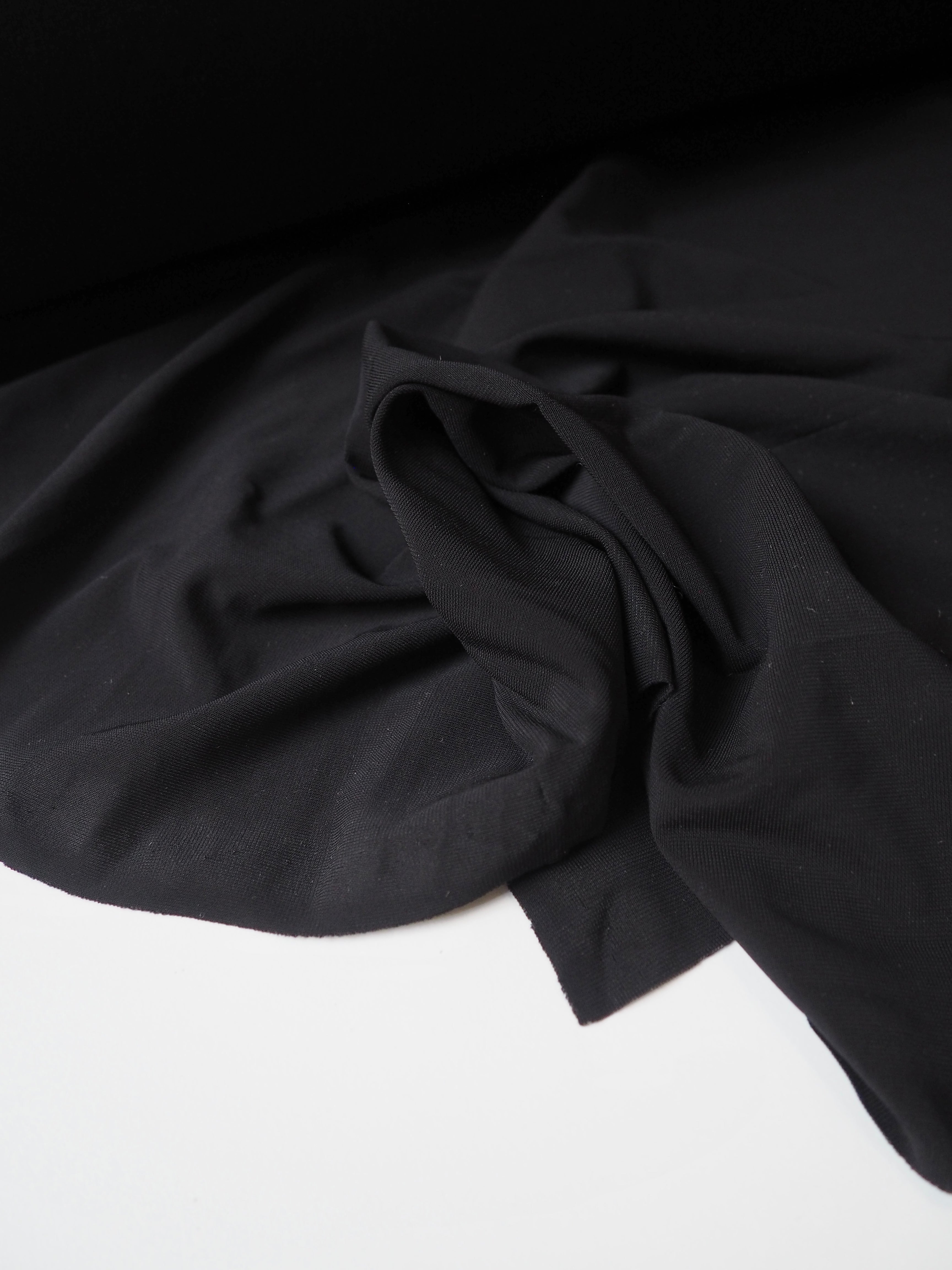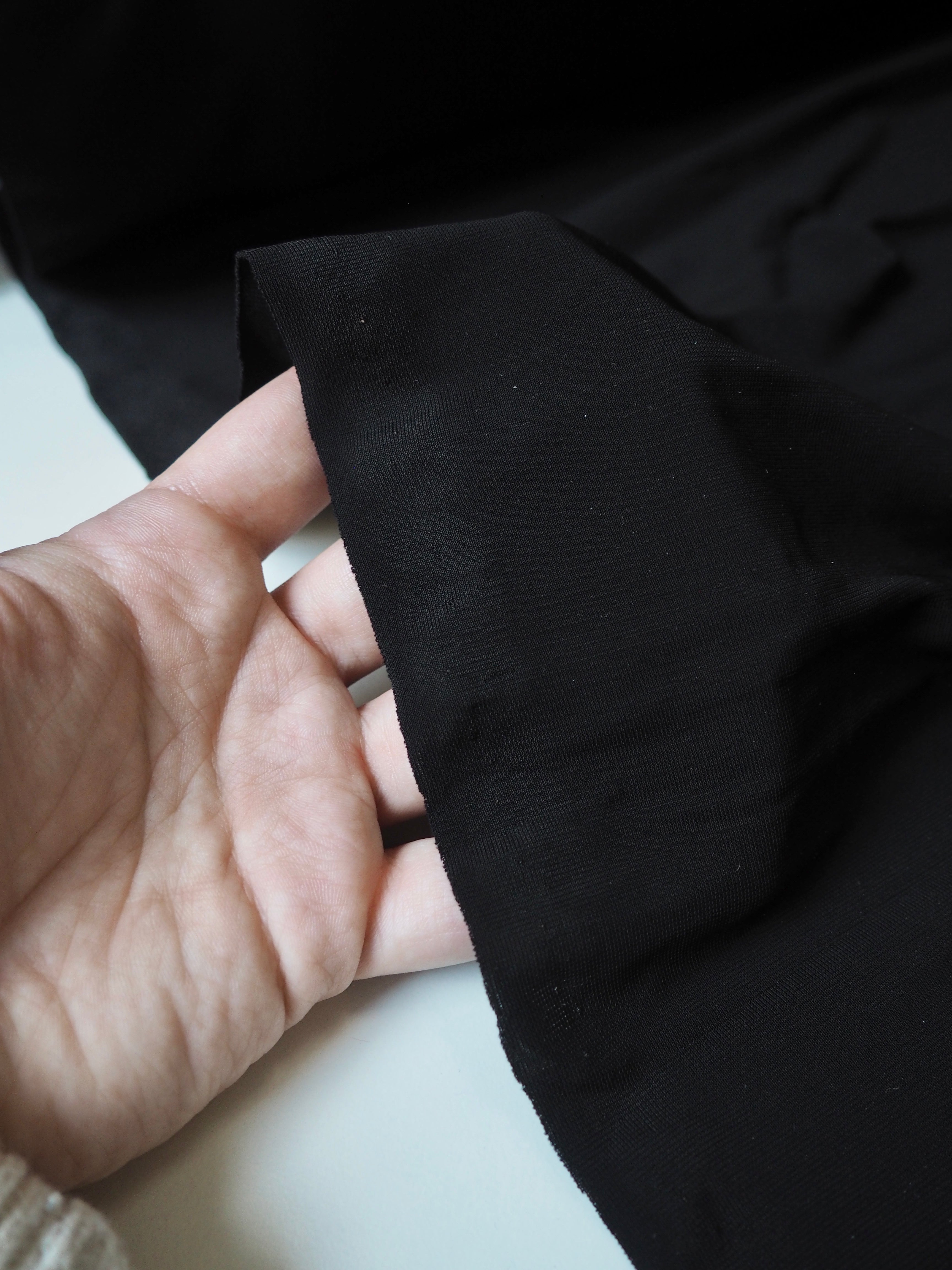 This ex-designer fabric is a jersey. It has a beautiful drape that’s quite swishy, and a slinky handle. It's lightweight, with a lovely smooth handle, and is quite breathable. Has about 40% stretch both ways. Mostly opaque but a little sheer. Perfect for a dress or elevated basics!