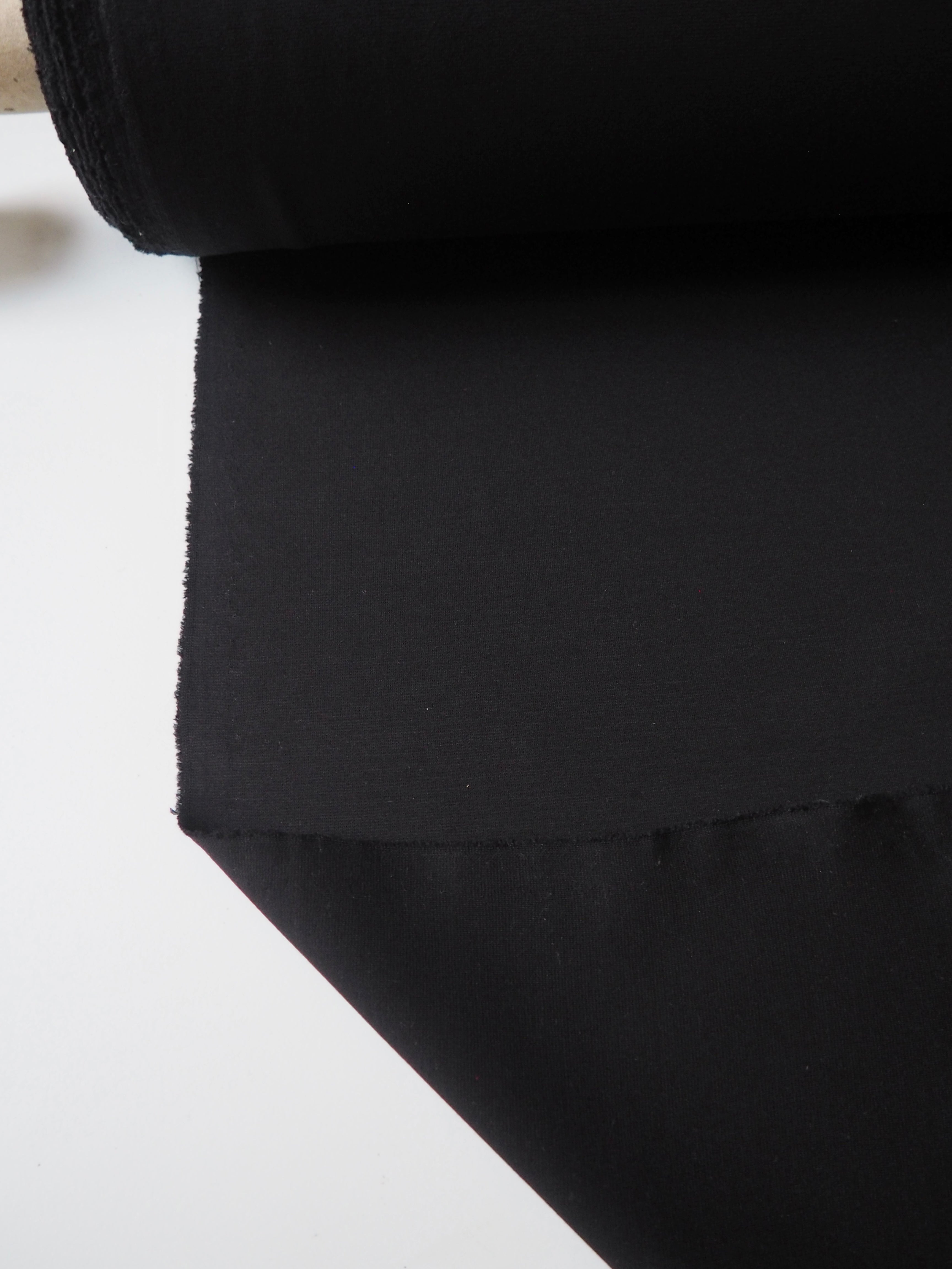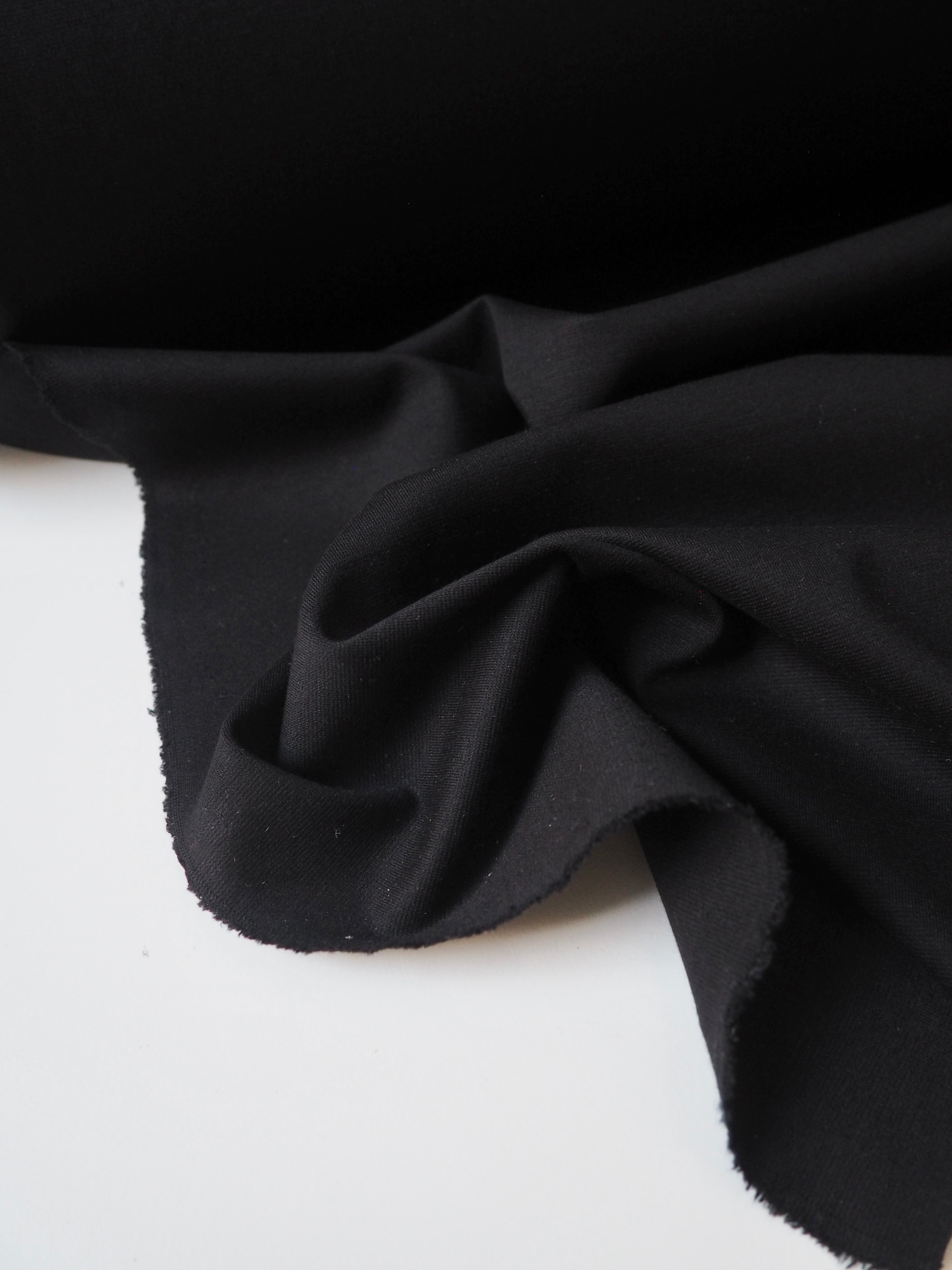 This ex-designer fabric is a jersey. Ponte di Roma is a double interlock jersey with a medium weight. It's quite dense, and has a great structure to play with. It has a very soft and lovely handle. Has a good 40% stretch both ways, and great recovery. Perfect for staple pieces!