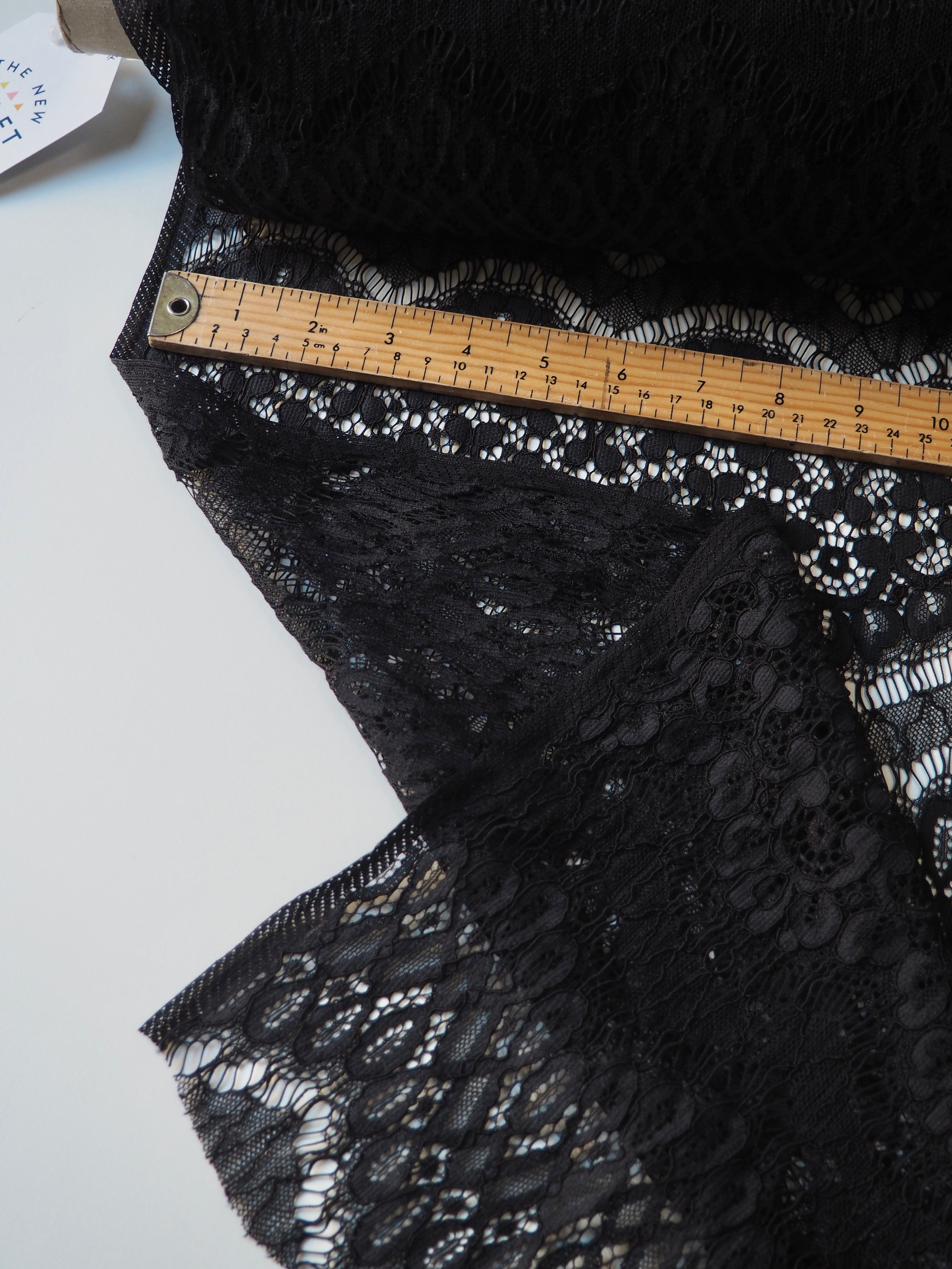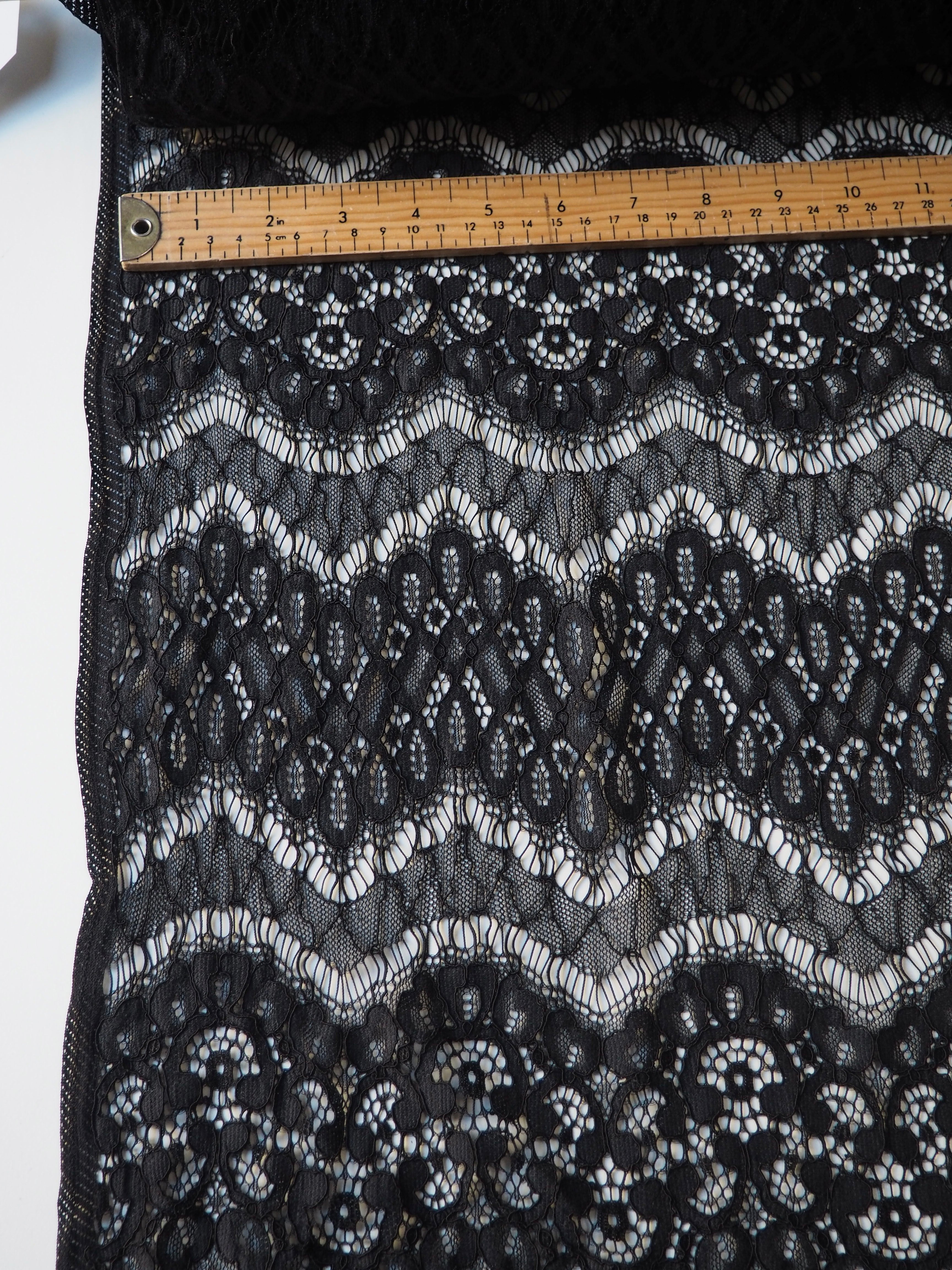 This ex-designer fabric is a top quality lace. It's corded with a striped and scallop combined weave. The fabric can be used as one piece or the motifs could be cut out and appliqued on for denser coverage or as trim. Lovely drape and soft, comfortable handle. Perfect for lingerie, nightwear or adding a lace embellishment to a dress!
