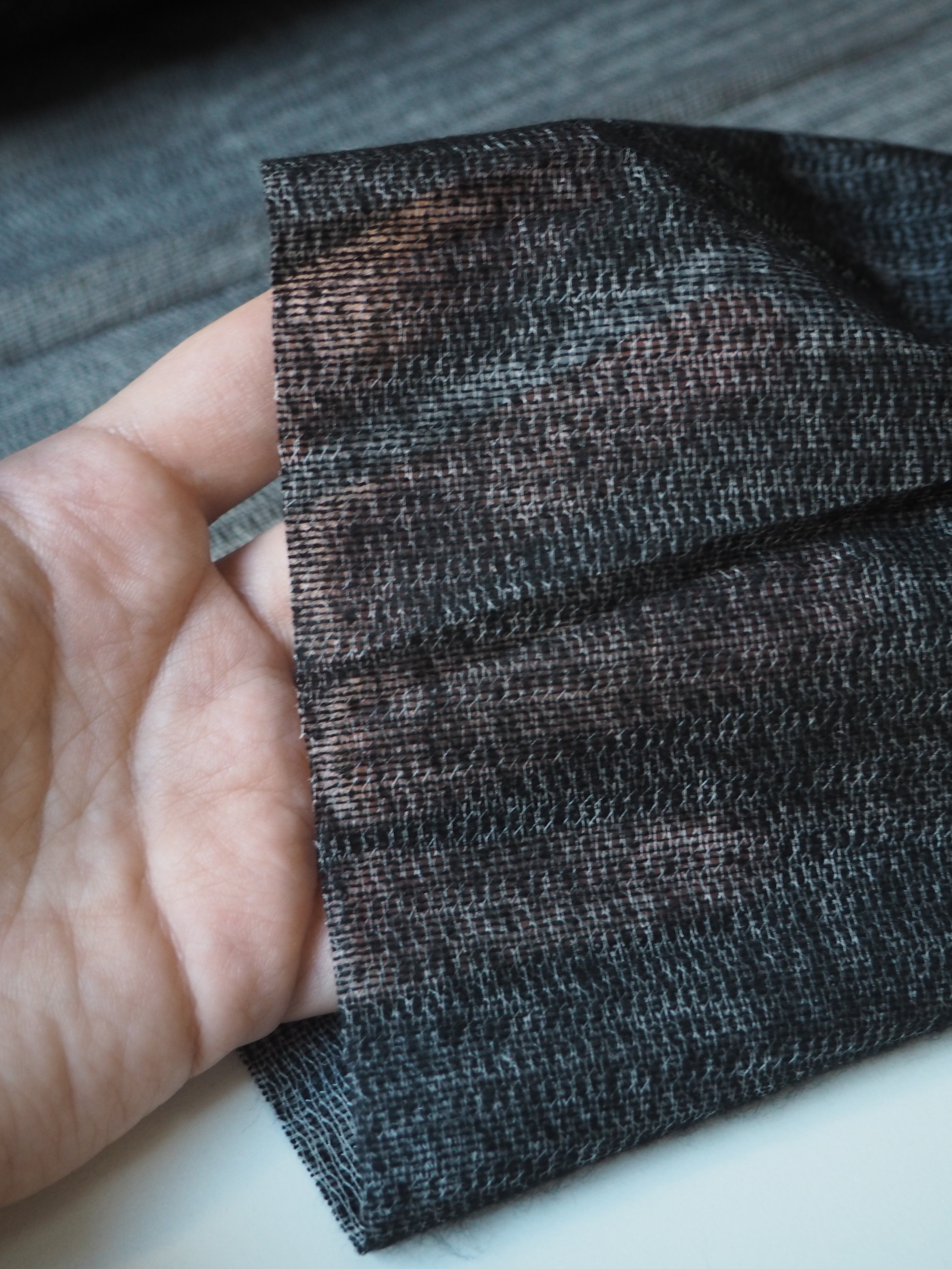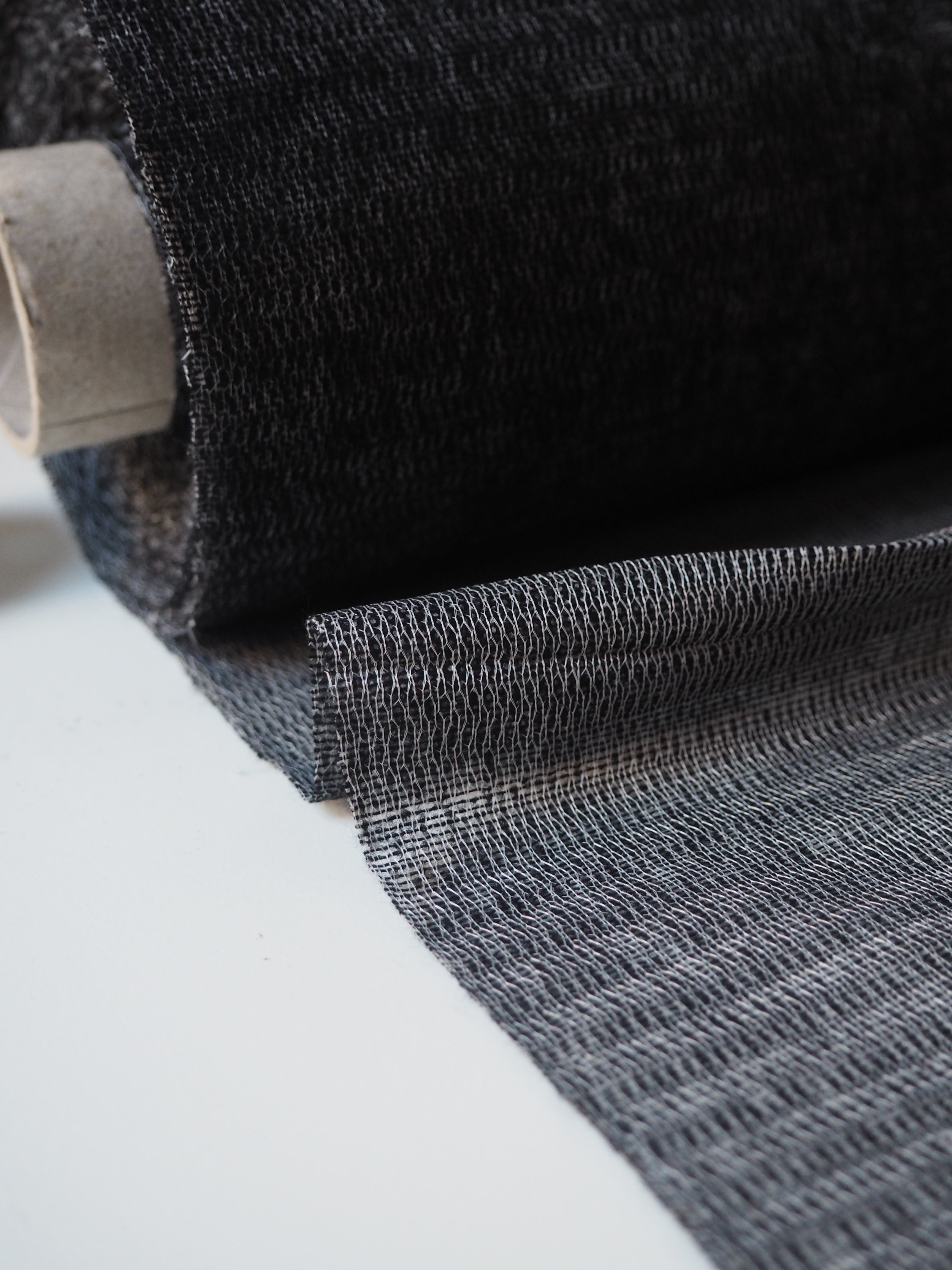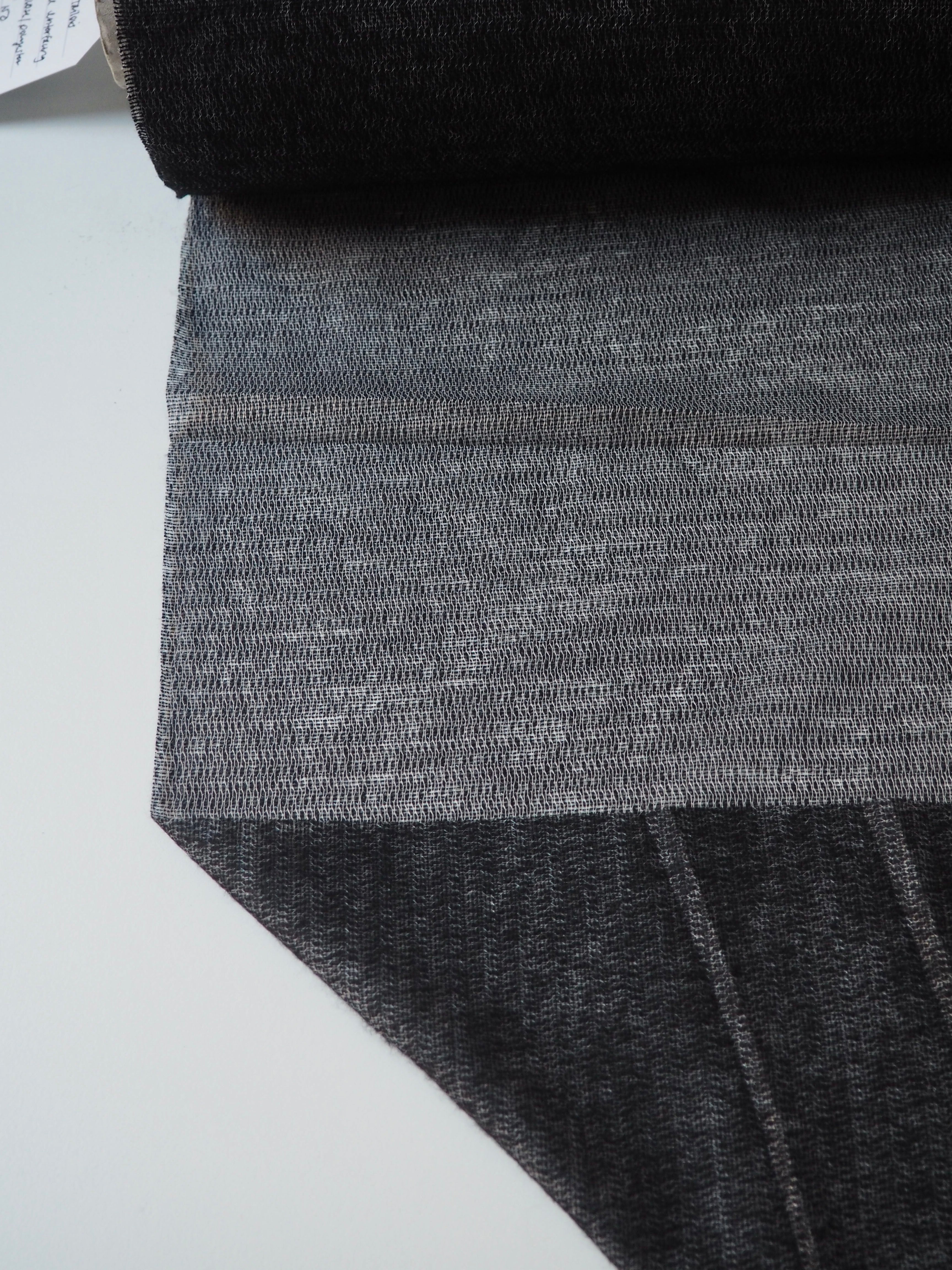 This ex-designer fabric is an interfacing. In a black and grey marl, and medium weight with a lovely drape. Soft and fuses well! Great quality and comfortable handle! Ideal for any medium to heavy weight project, like tailoring and winter coats, as it adds structure without adding stiffness!