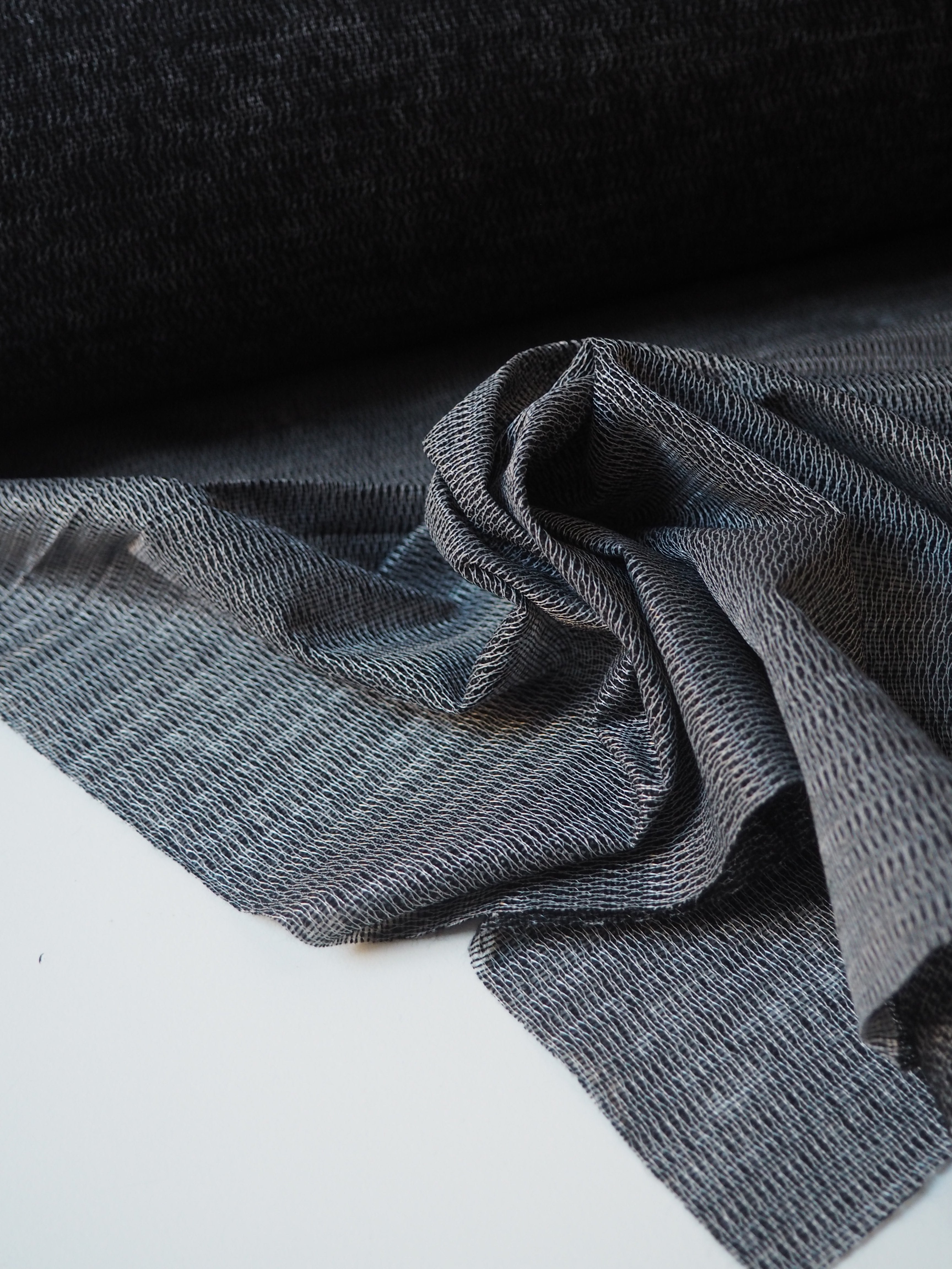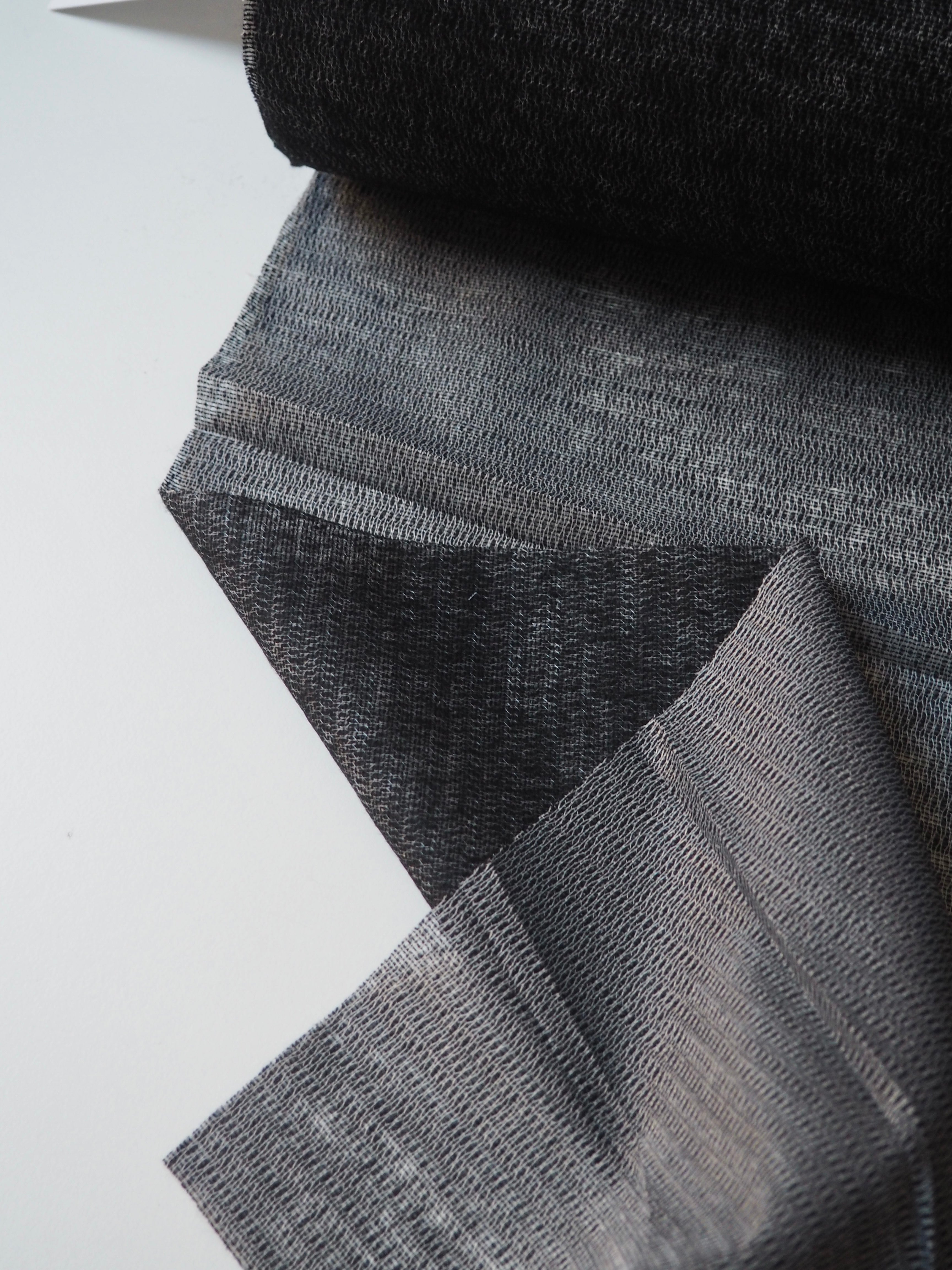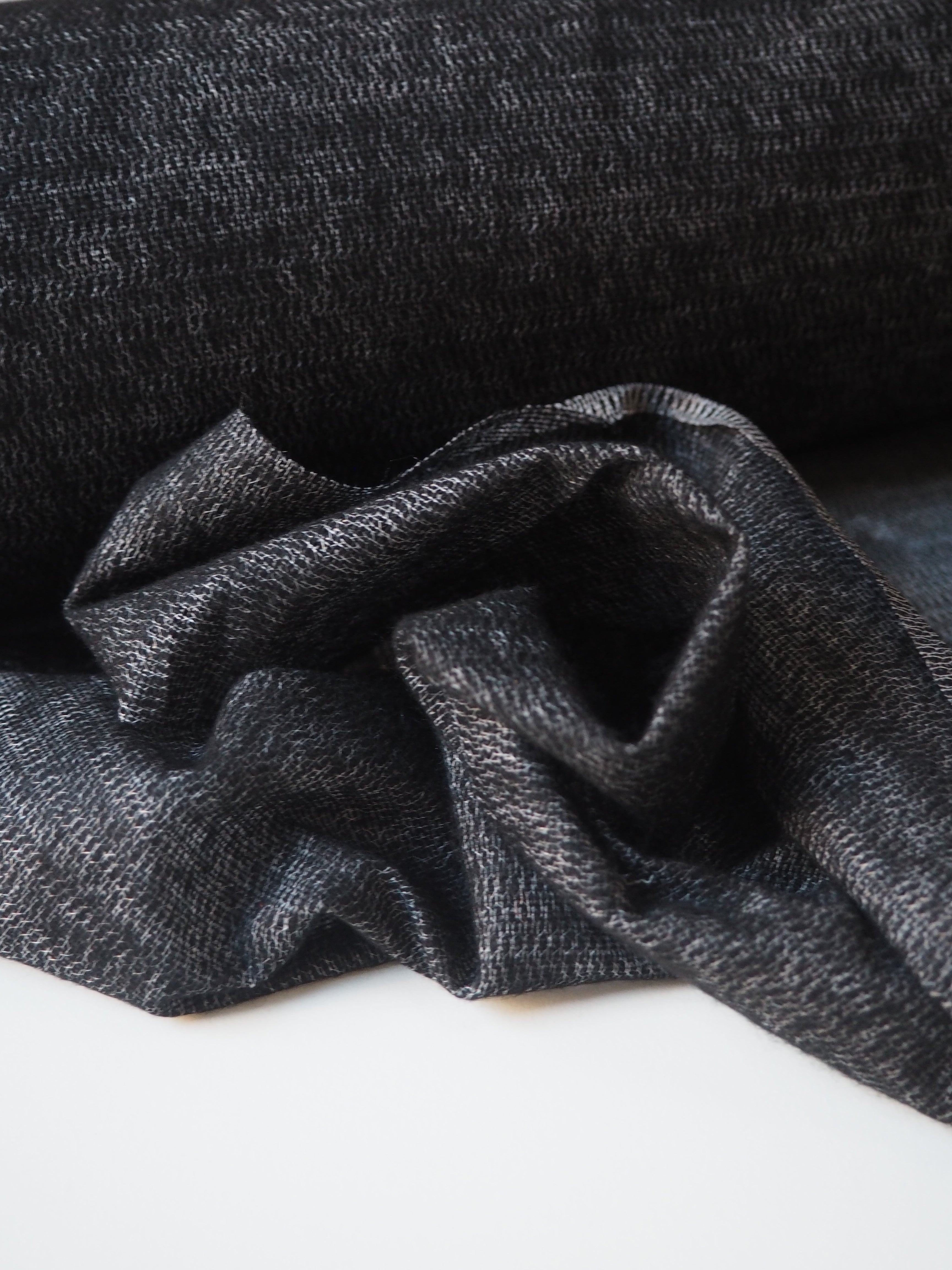 This ex-designer fabric is an interfacing. In a black and grey marl, and medium weight with a lovely drape. Soft and fuses well! Great quality and comfortable handle! Ideal for any medium to heavy weight project, like tailoring and winter coats, as it adds structure without adding stiffness!