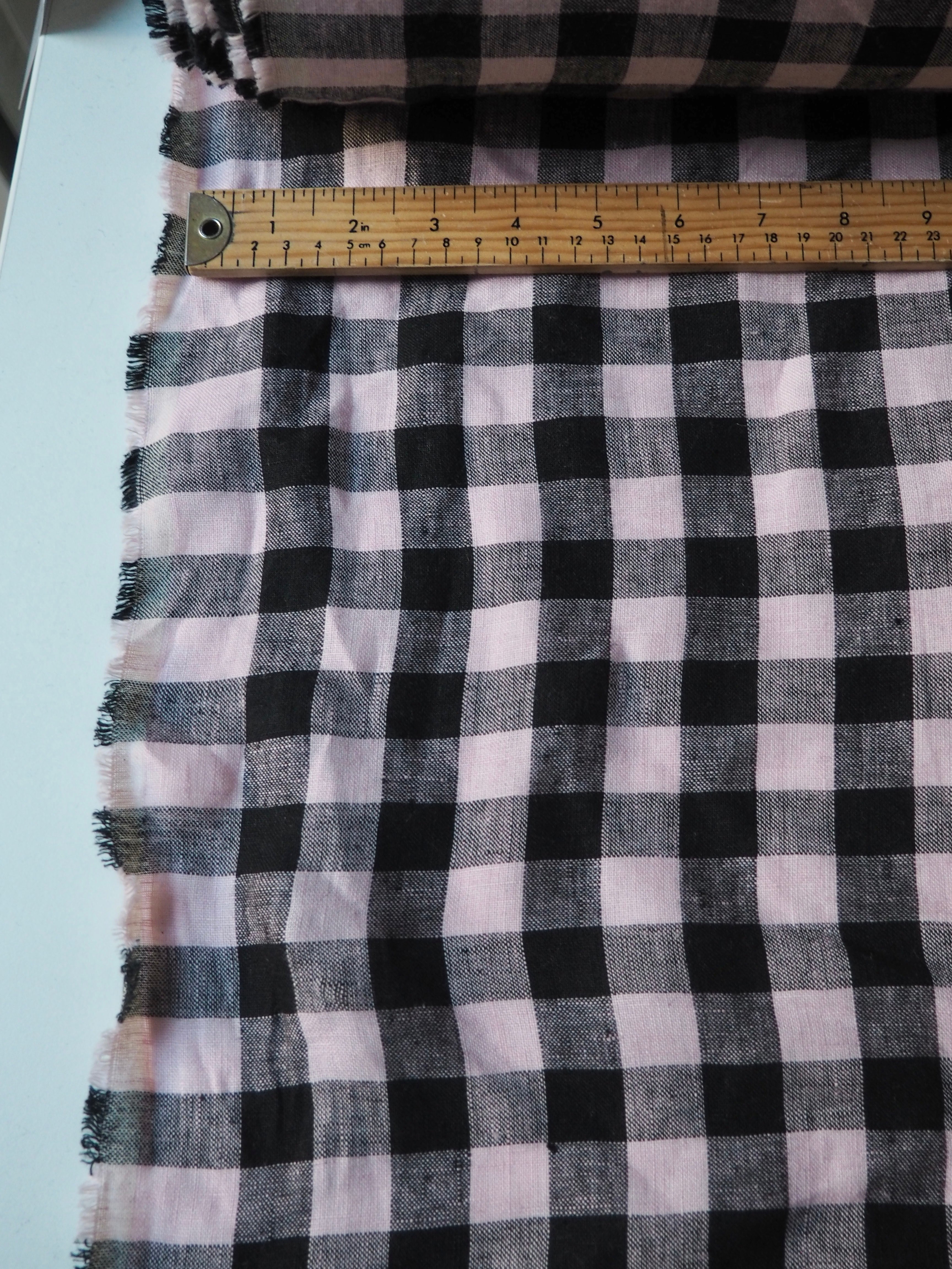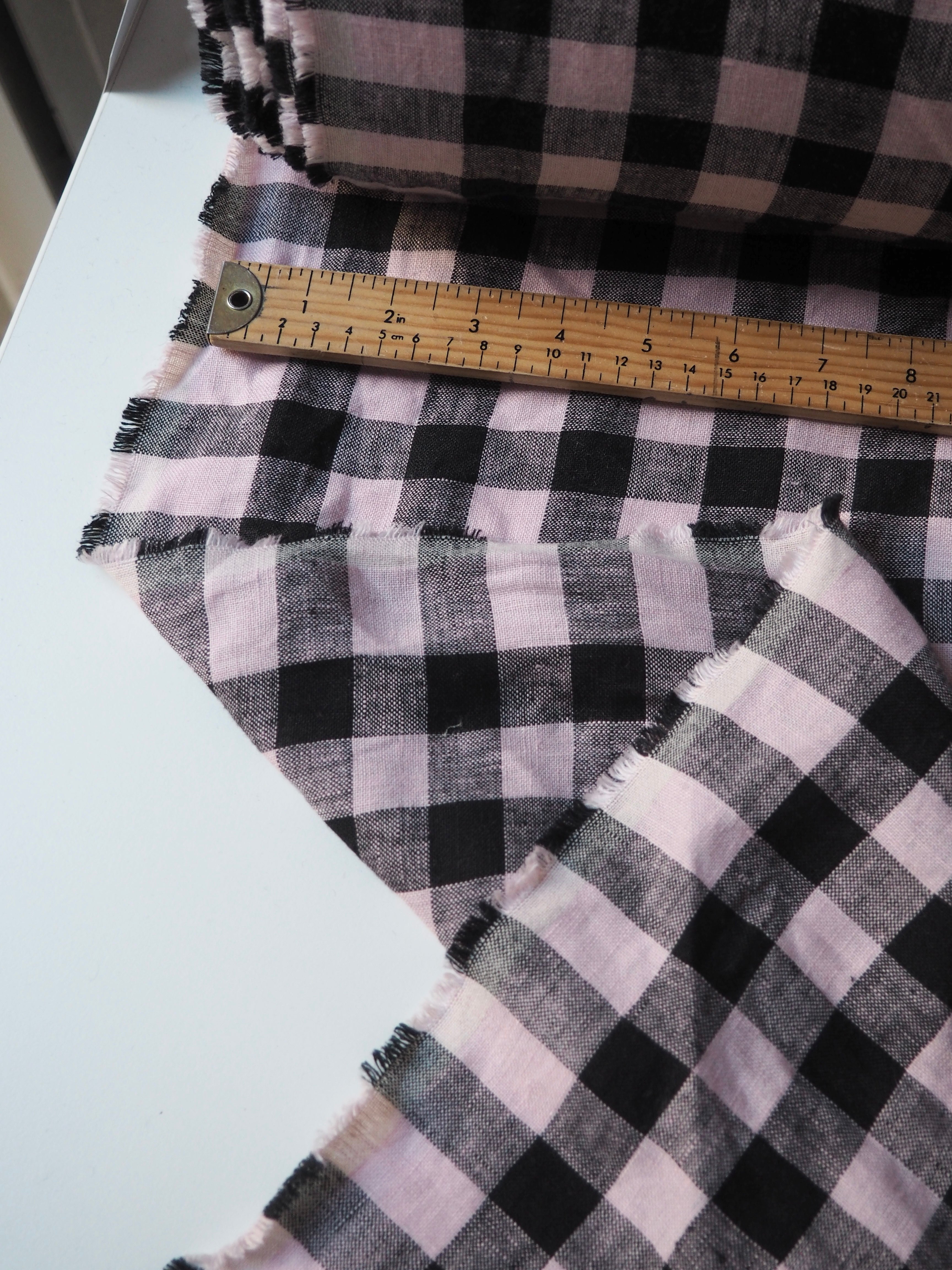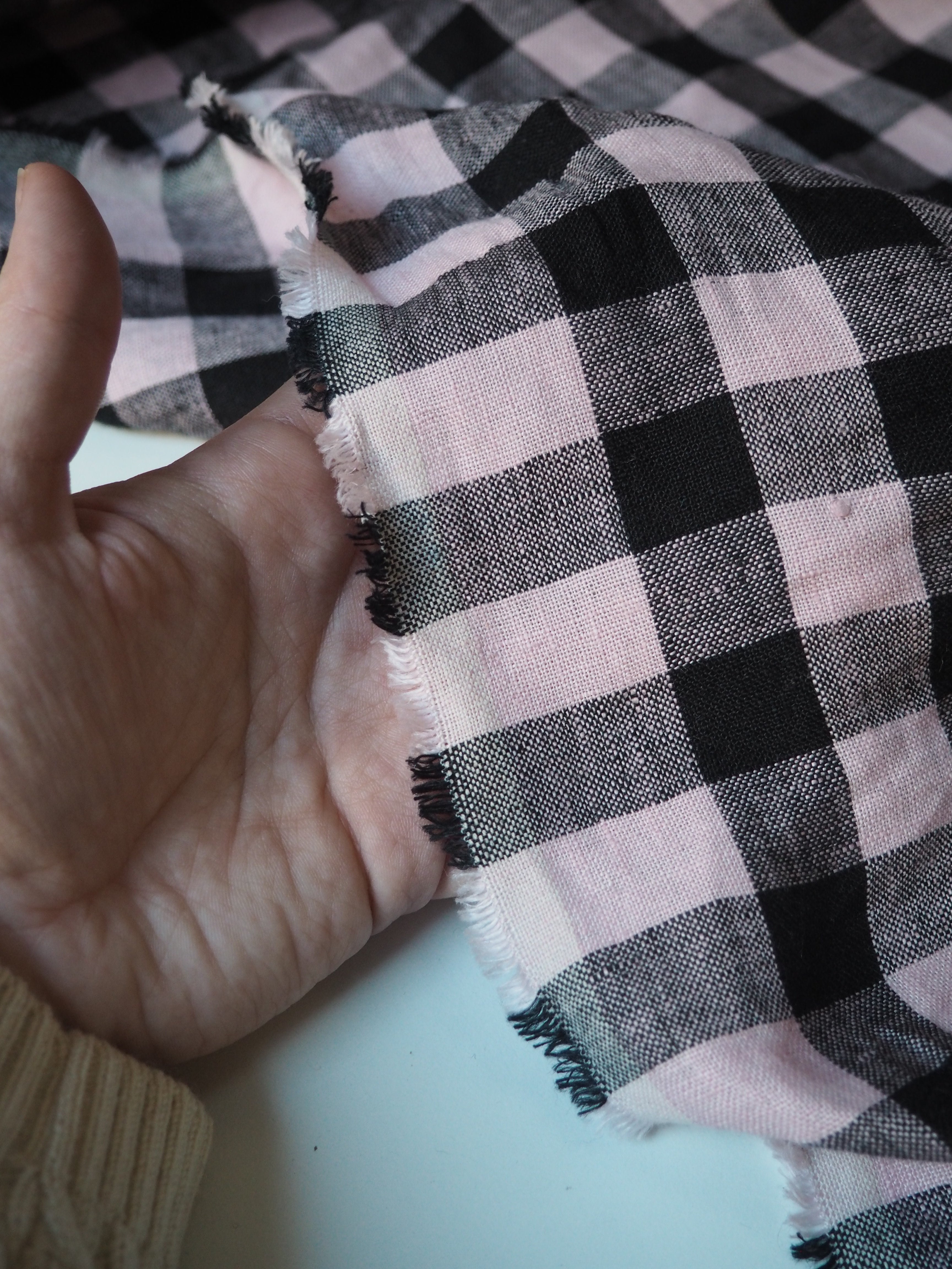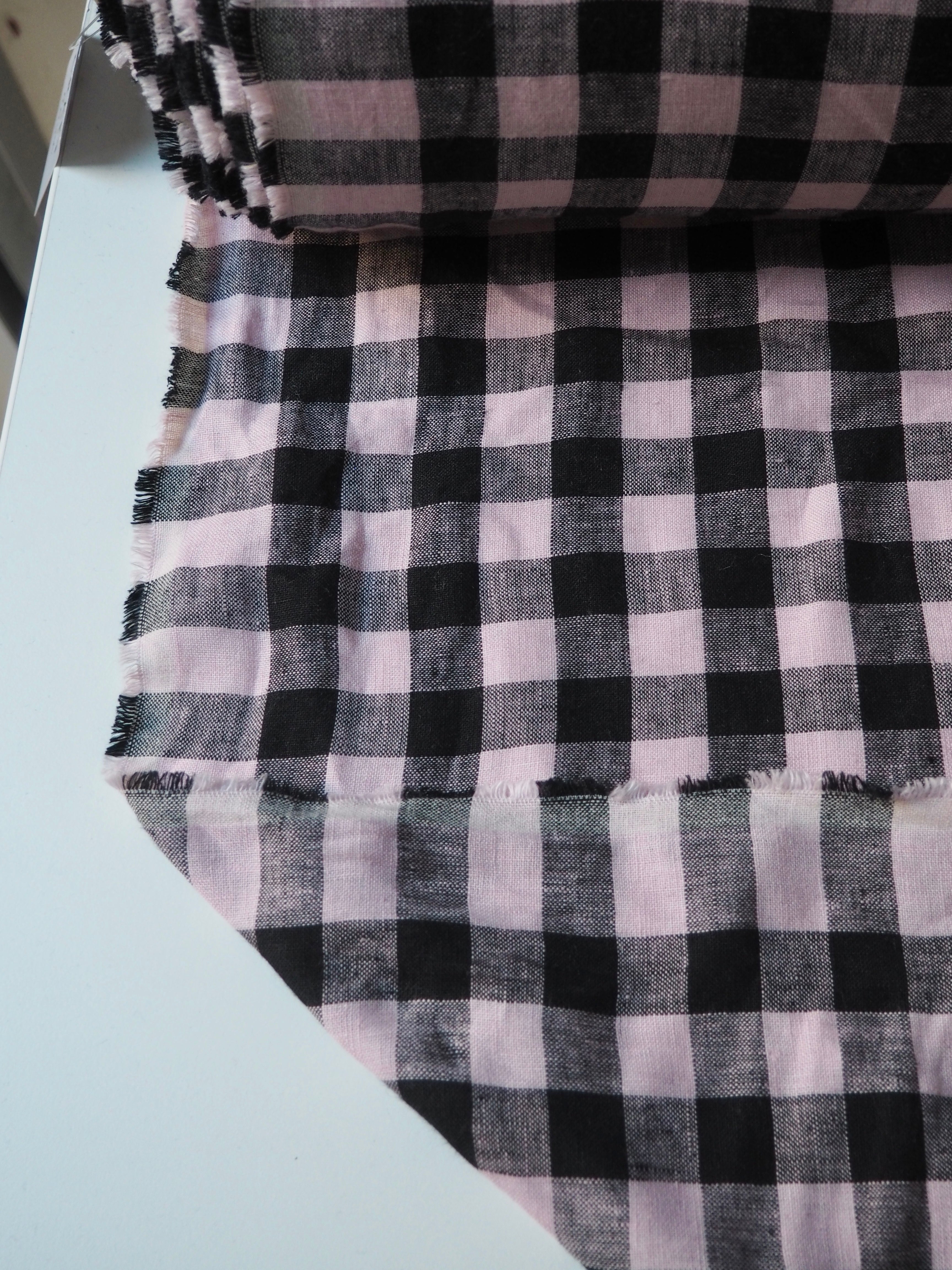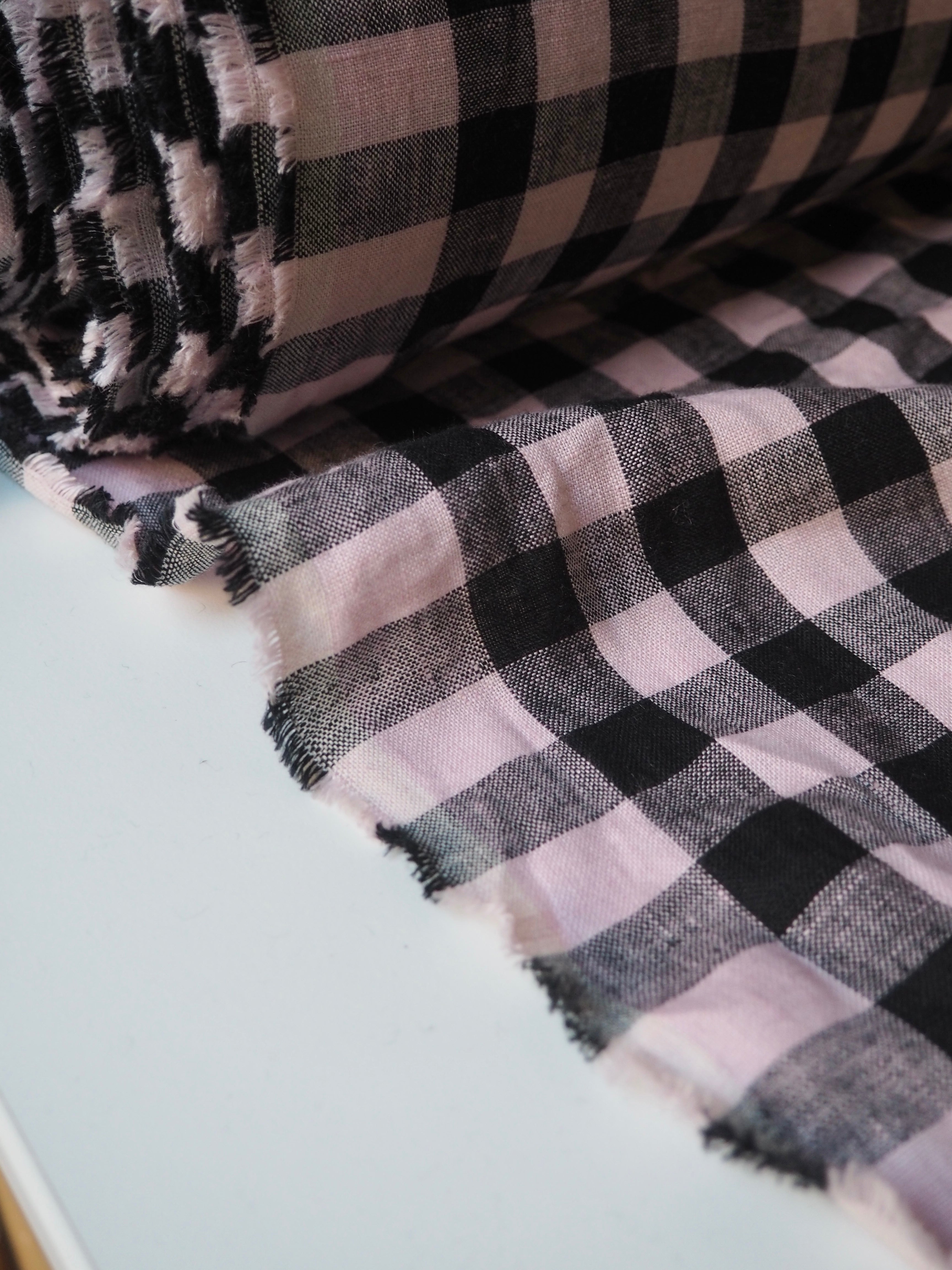 This ex-designer fabric is a lovely linen. It's a pale pink and black colourway, in a gingham check. It has a soft and gentle linen weave with a typical linen texture, and a brilliant handle that's so wearable. Lightweight with a gentle structured drape, and fully opaque. From popular London-based brand Beyond Nine. Lovely for a bias dress of skirt, summer tops or Everyday Trousers!