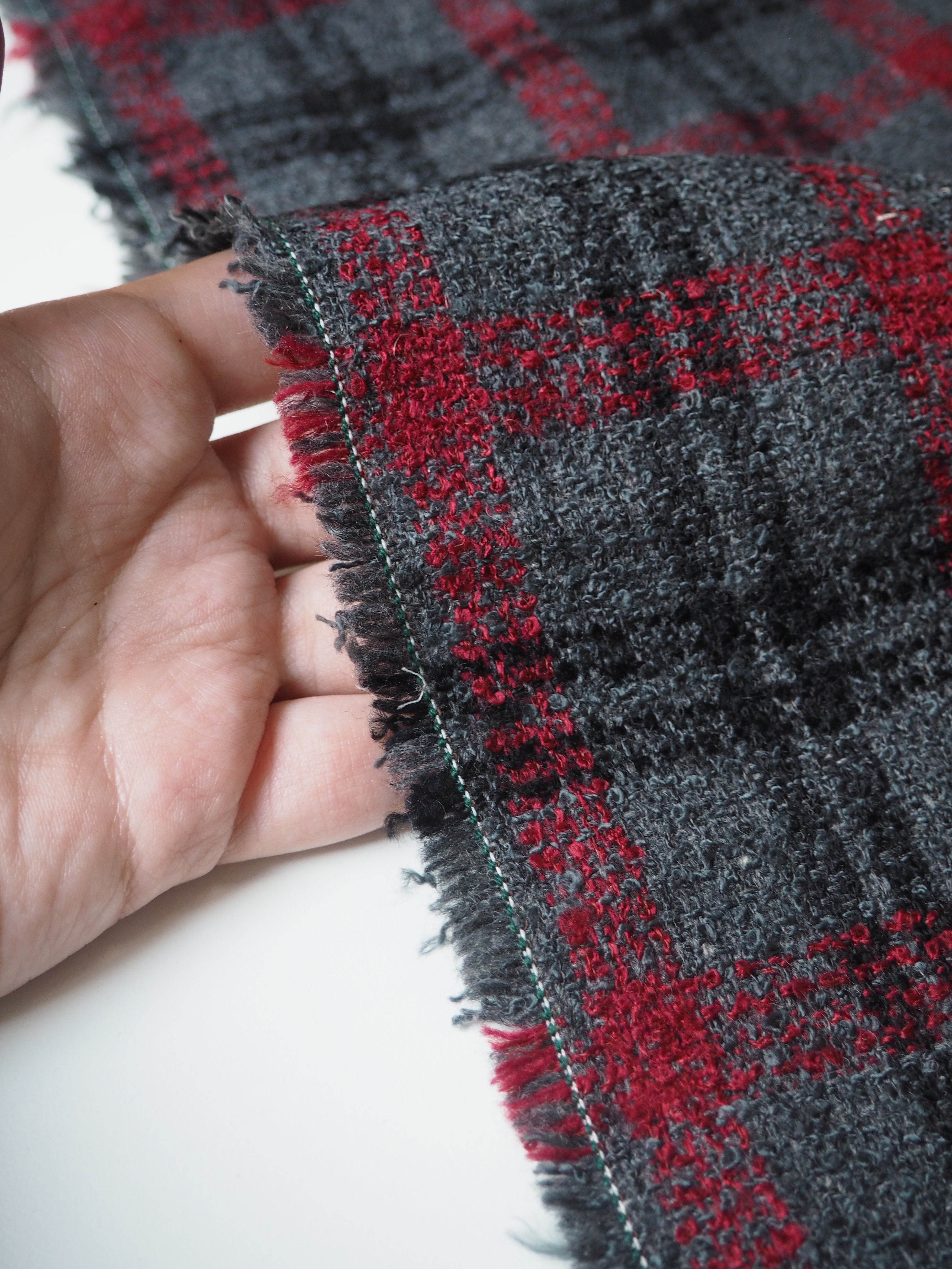 This ex-designer fabric is a tweed. It's a grey, black, and red check. It has a lovely soft handle and beautiful movement and drape. It's light to medium weight and opaque. The blend of wool, poly, and cotton make it versatile and wearable all year around. Perfect for light jackets, scarves, or a coordinated set!