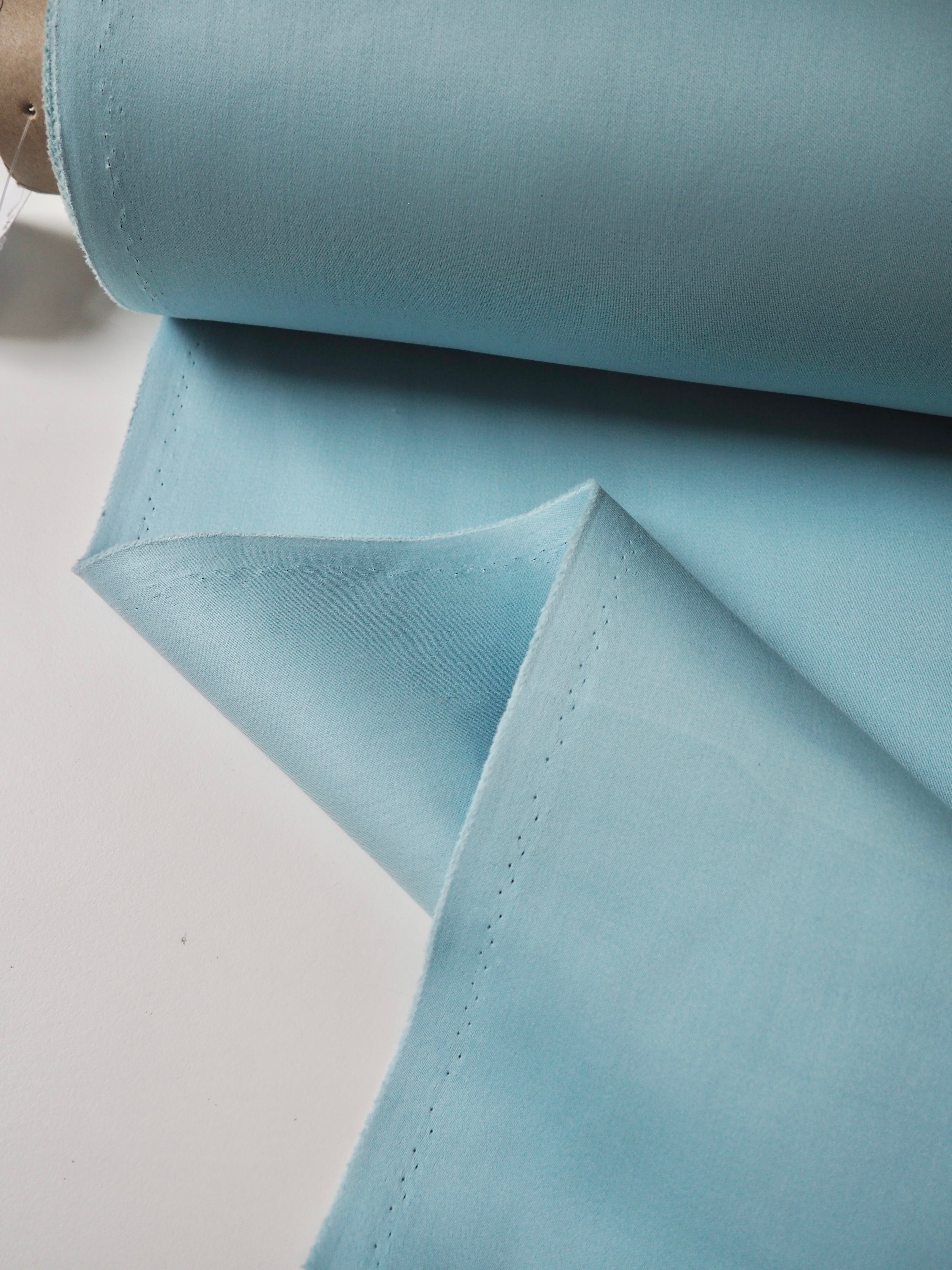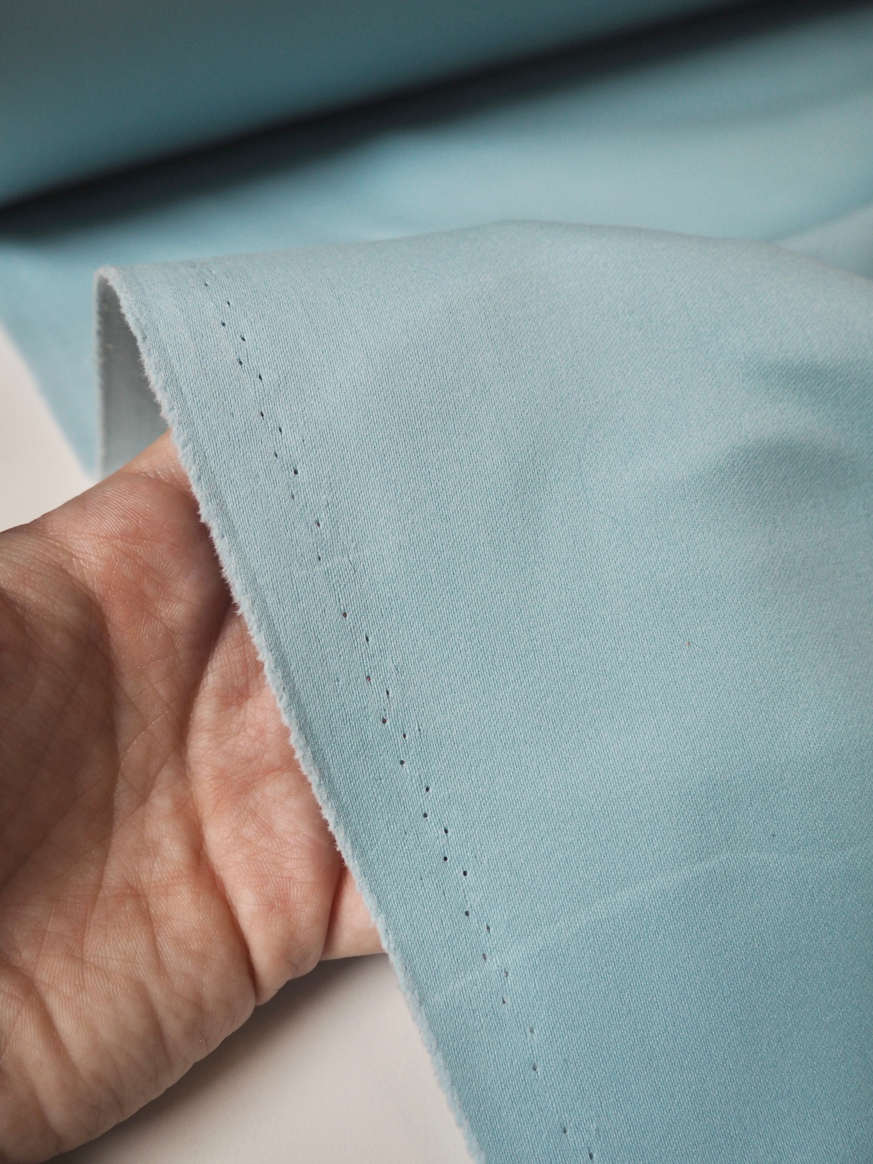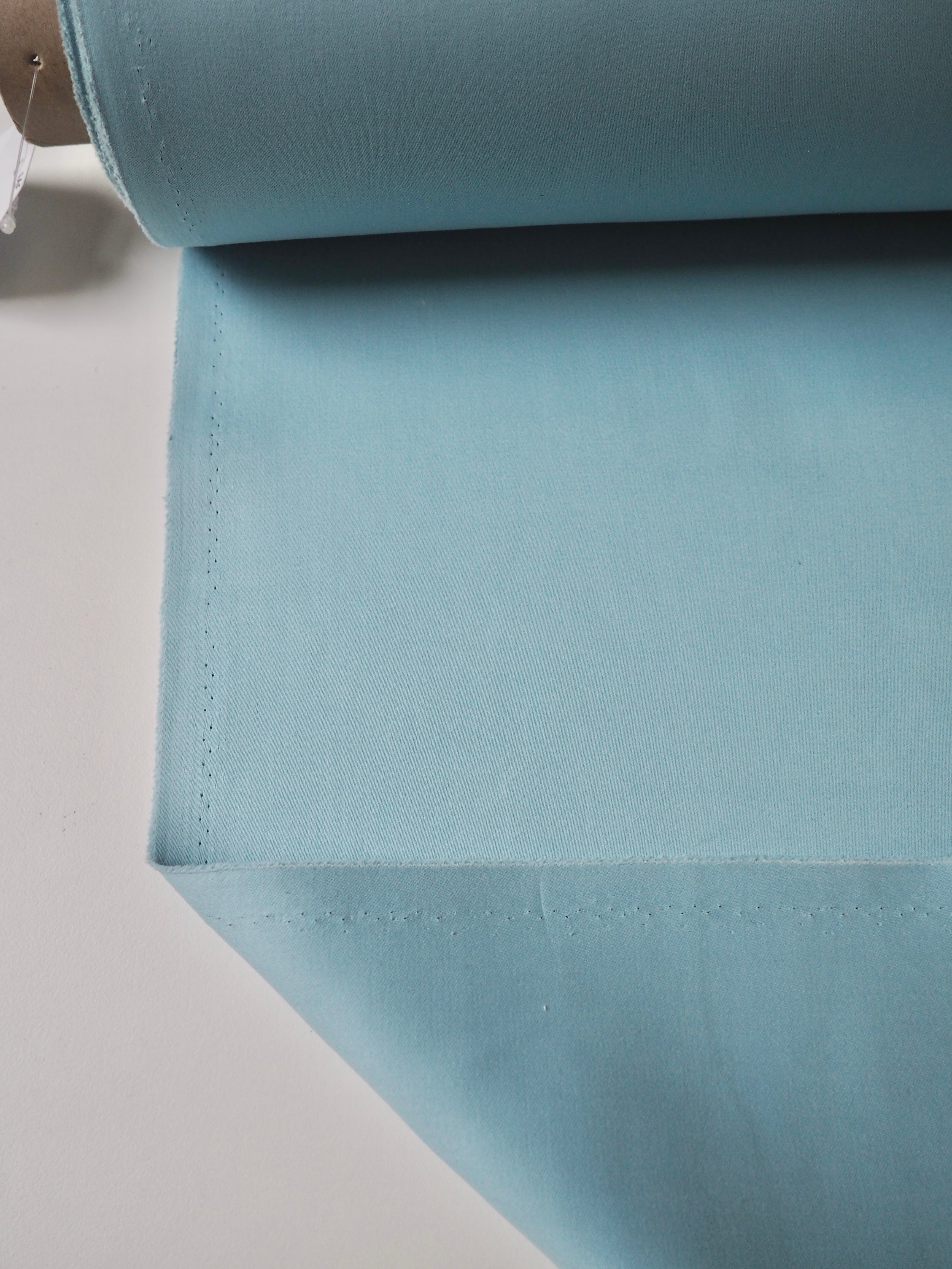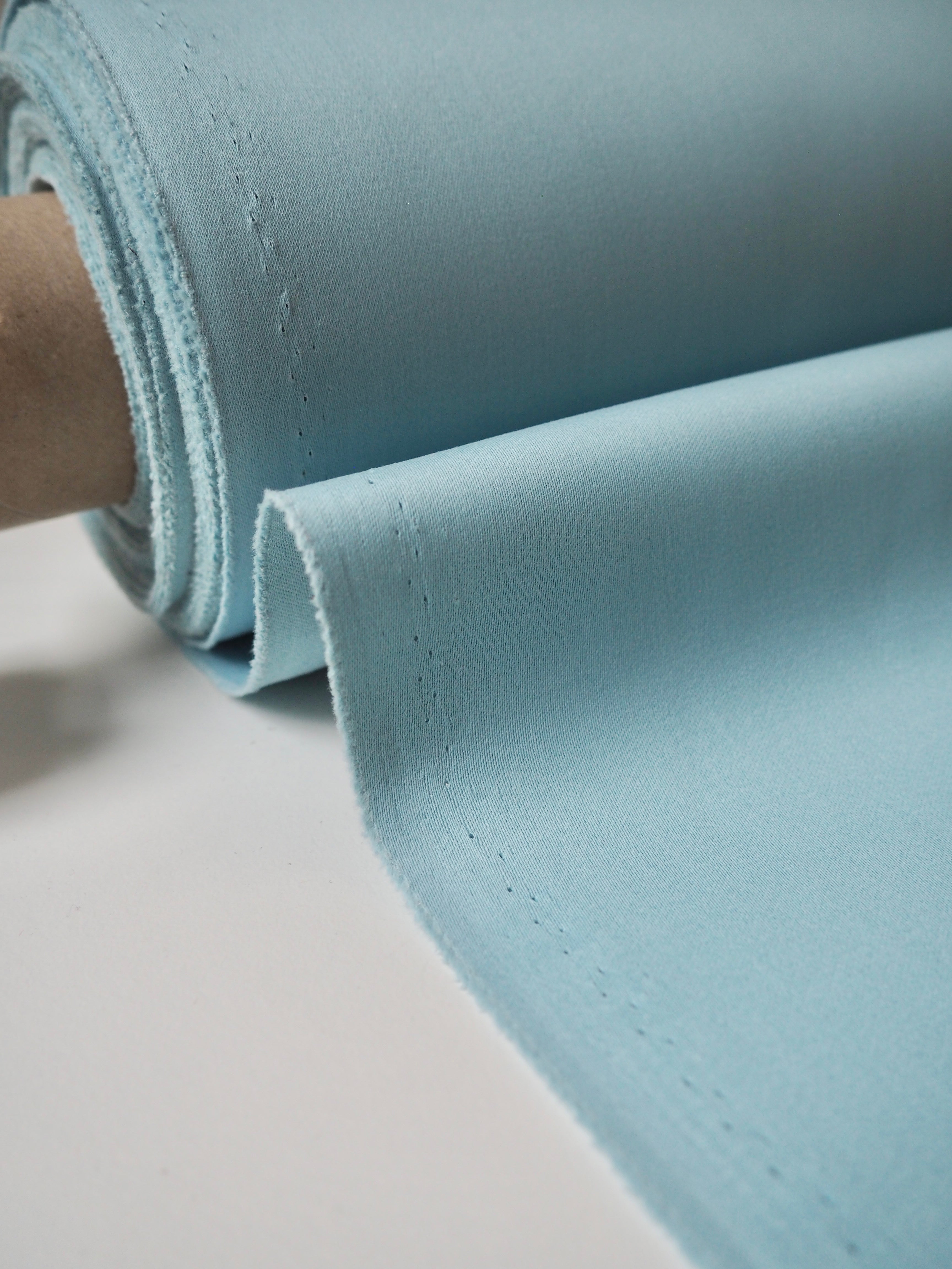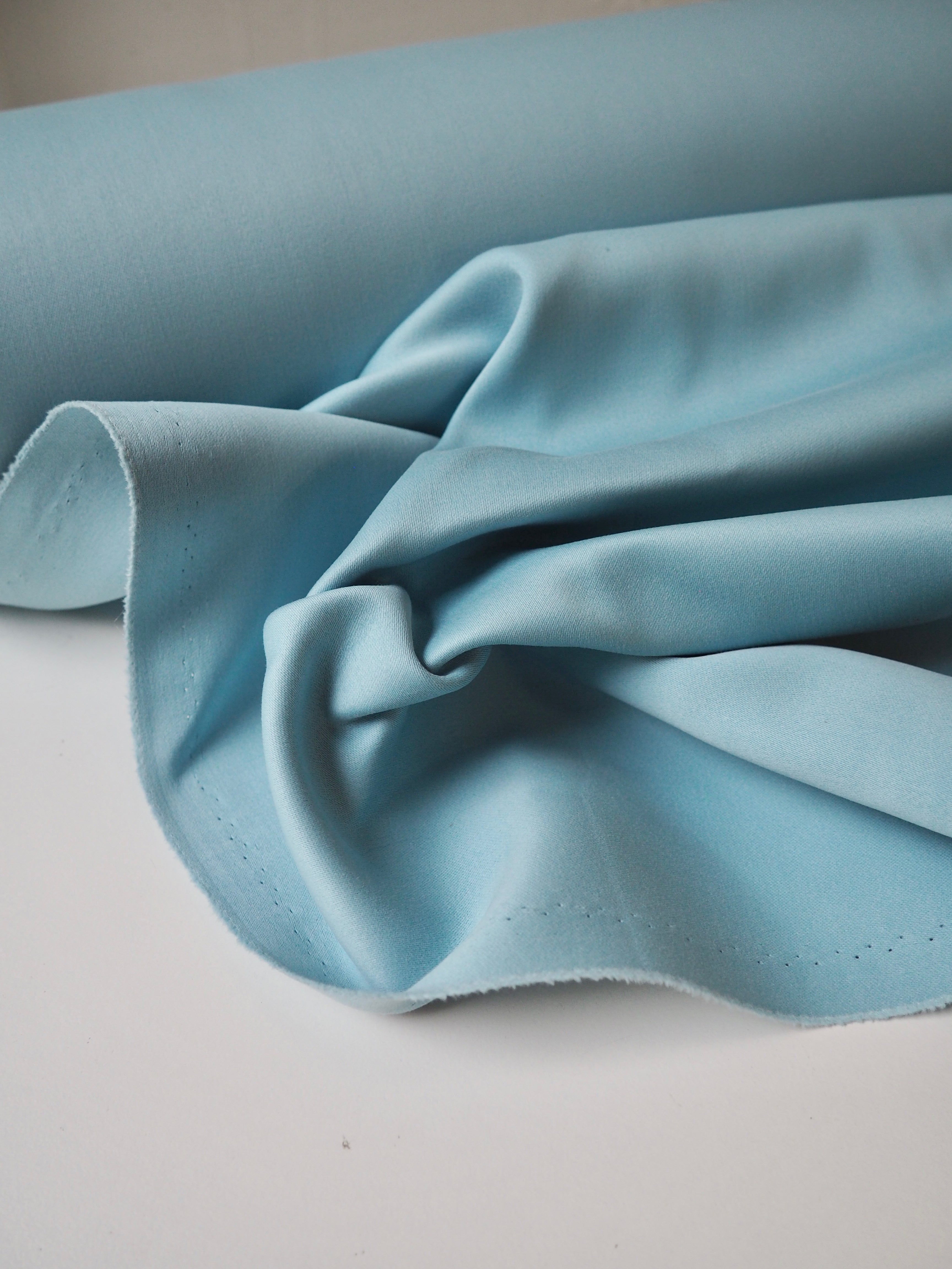This ex-designer fabric is a double cotton sateen. In a lovely baby blue colour. It's double faced, with a very structured handle and sateen finish on both sides. It's medium to heavy weight, with a lovely soft feel. Such a sturdy but lovely cloth! We love this for jacket!