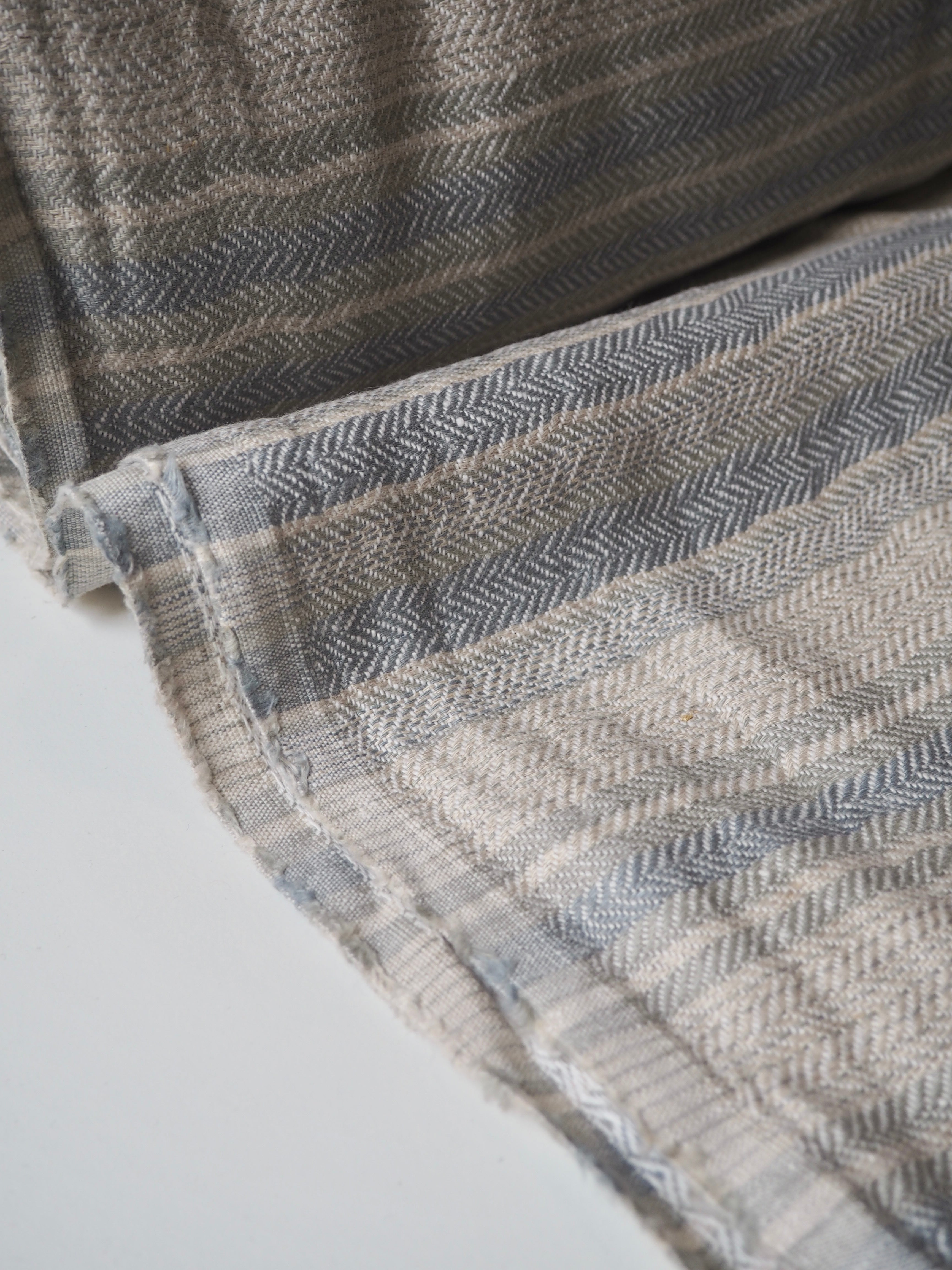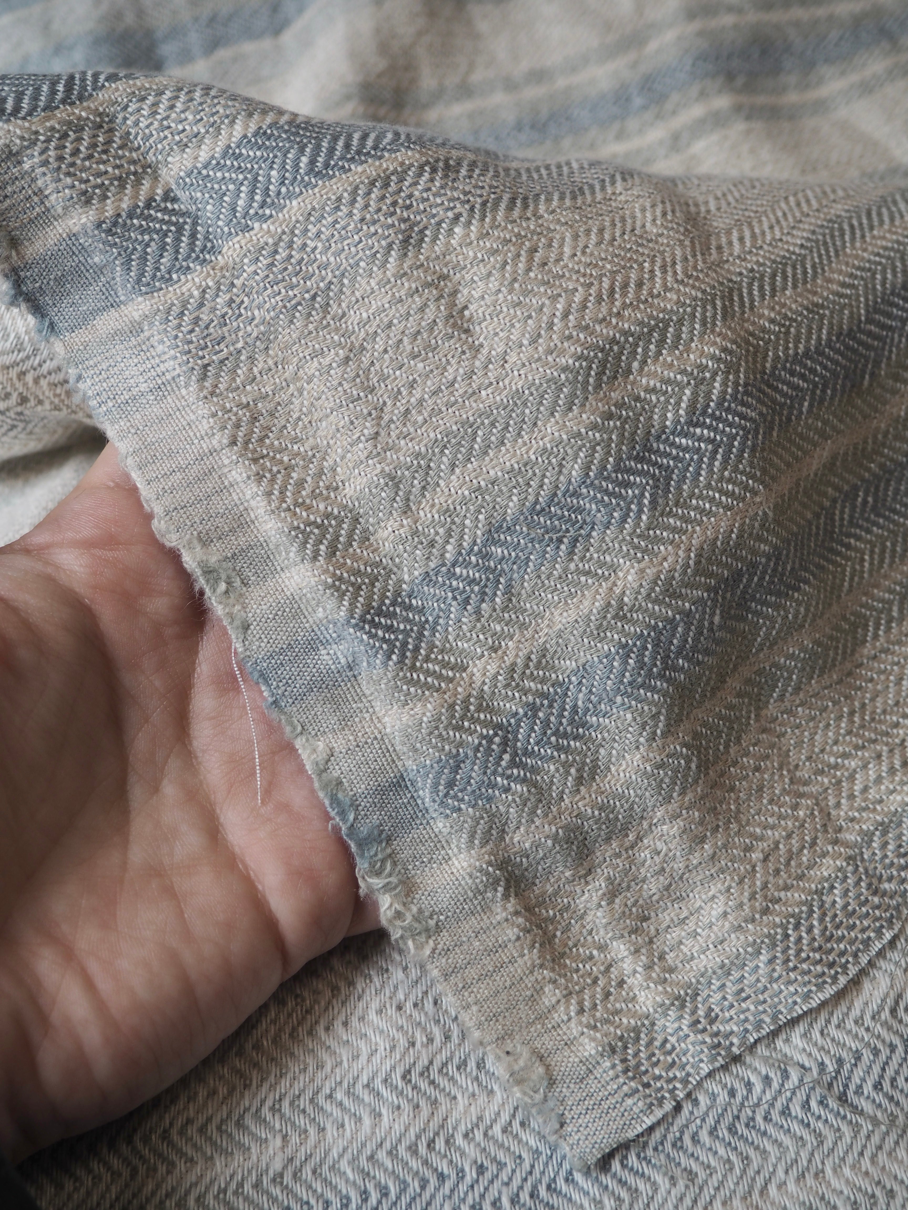 This ex-designer fabric is an extra wide linen. It has a sturdy but not heavy weave, with a visual texture and subtle herringbone-like texture in a medium weight. Stripes weave down the weft. Has a washed-like handle and a worn-in look. Very soft and fully opaque, and beautiful quality. Has a soft structure, but still drapes nicely. From a home interiors company. Perfect for drapes!