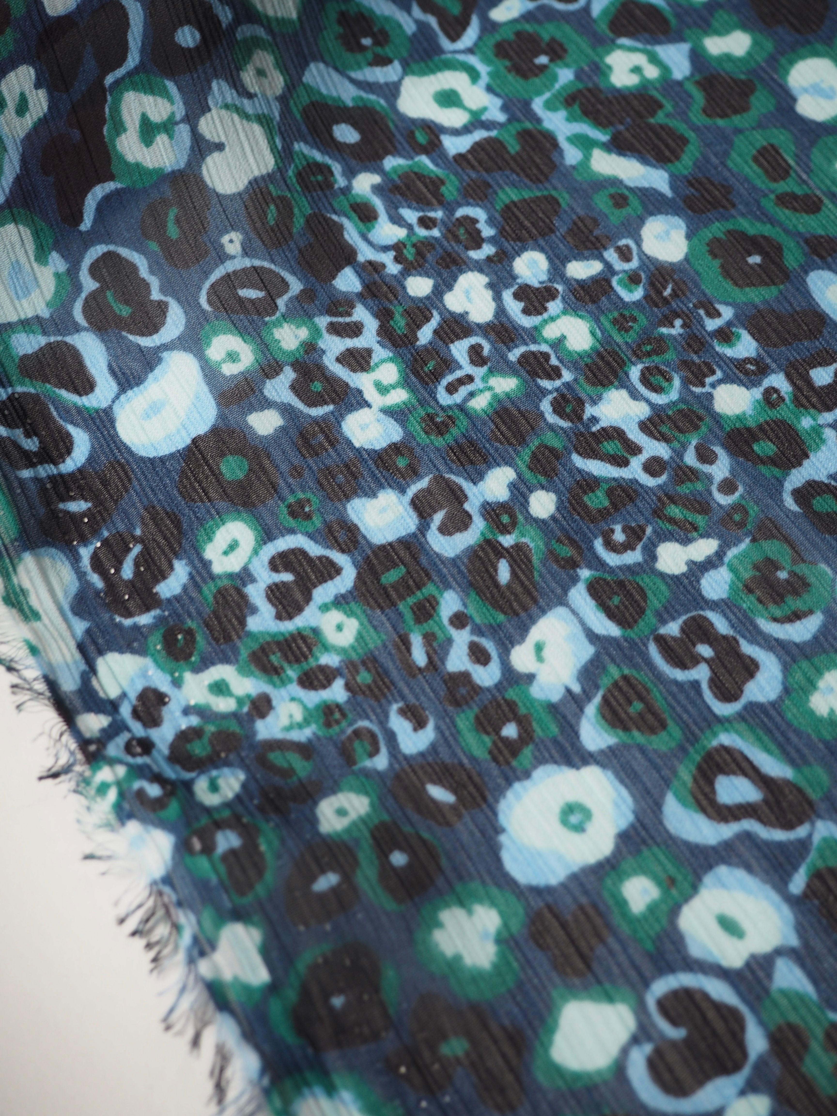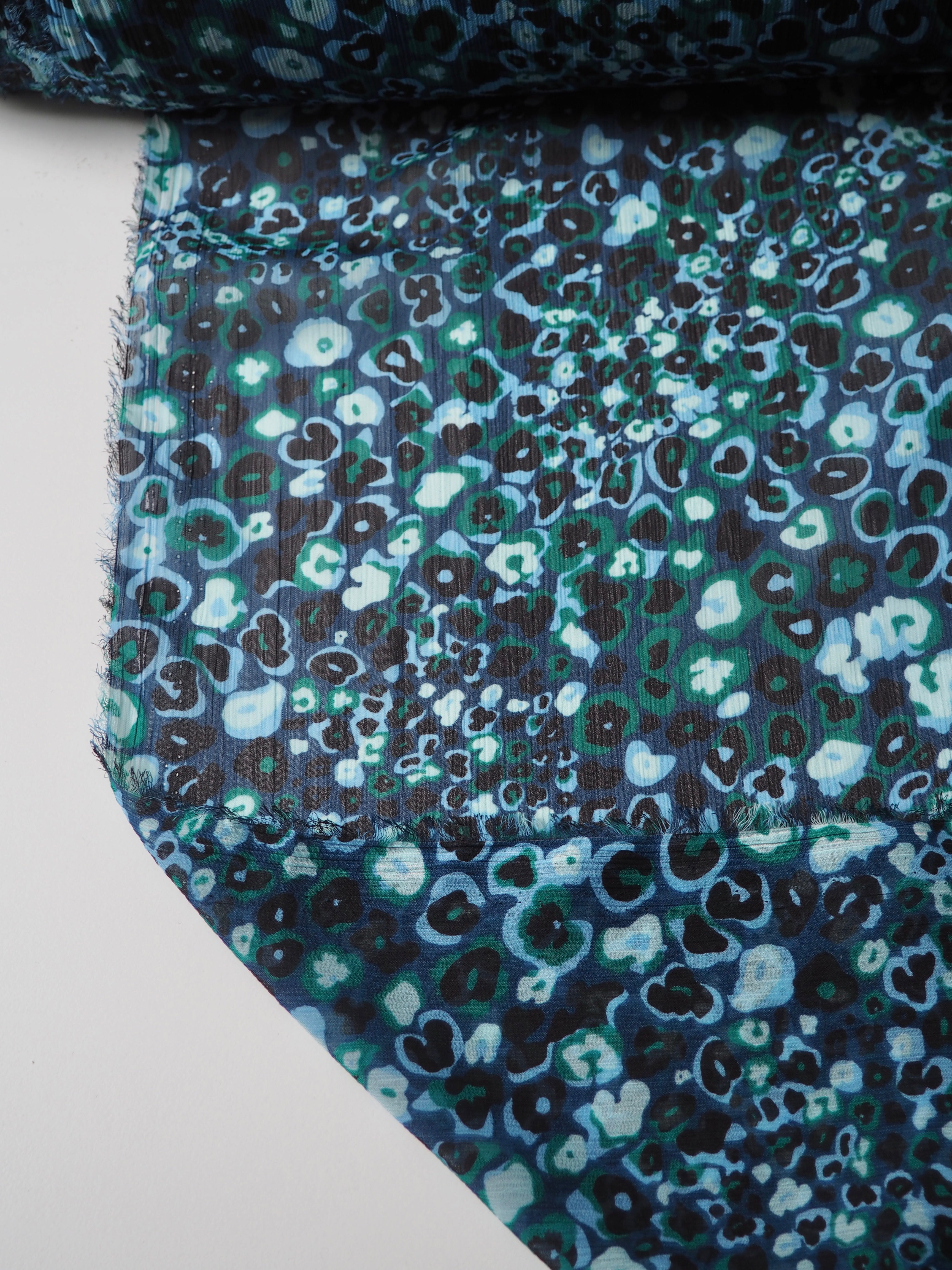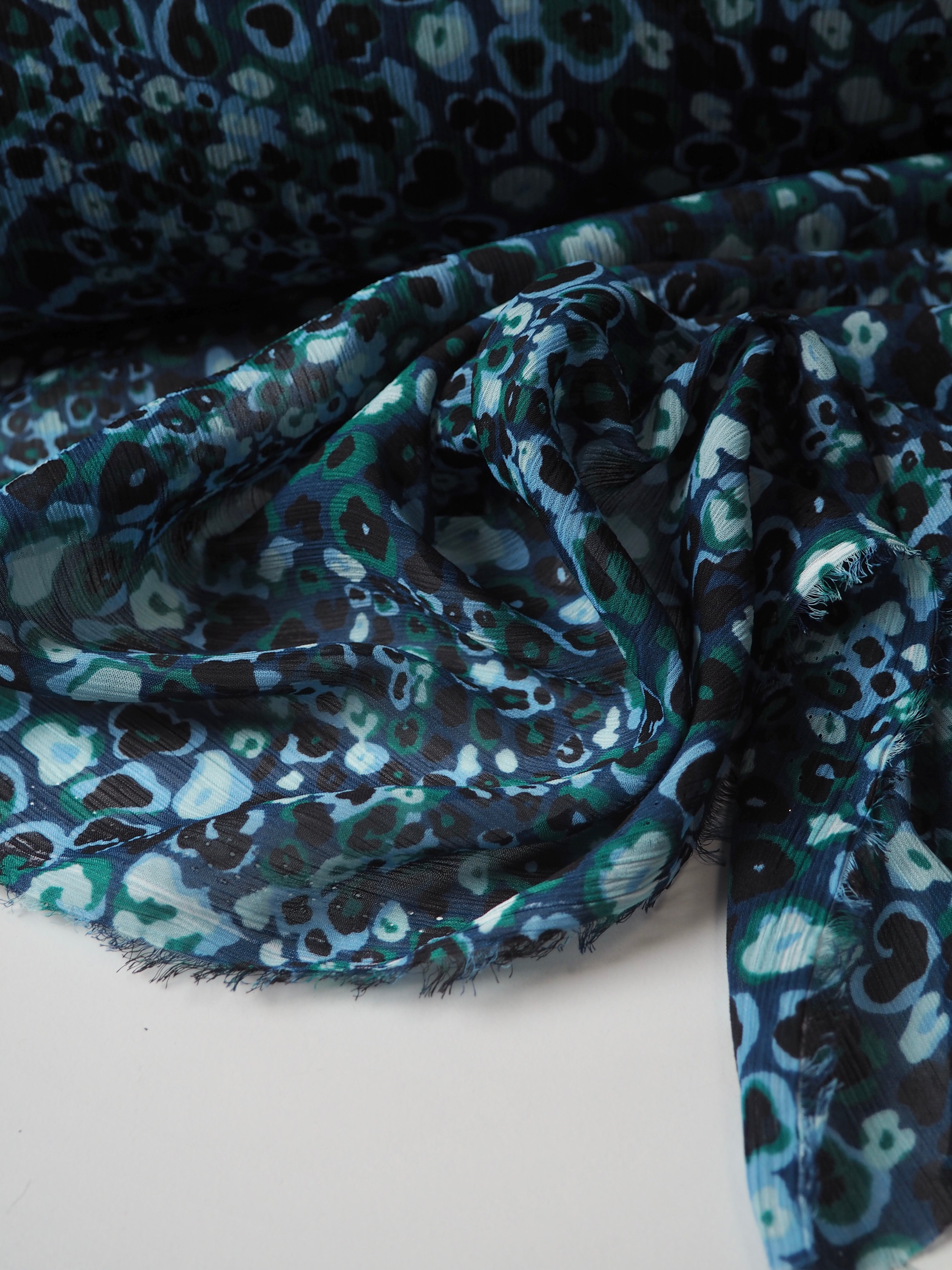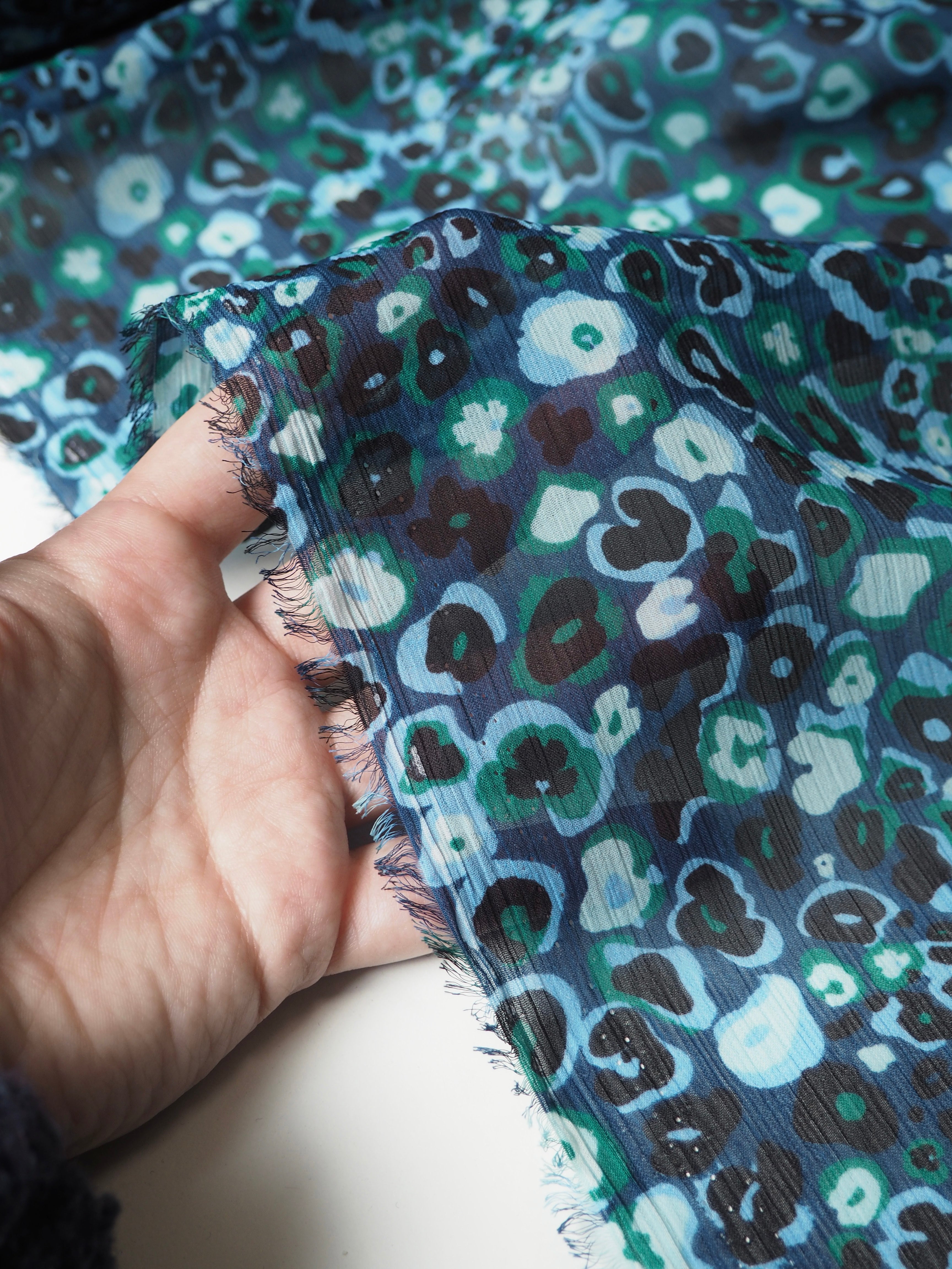 This ex-designer fabric is a printed chiffon. It's a crinkled chiffon with a green and blue floral cheetah print. It's lightweight and semi-sheer, with wonderful drape. It has such a nice crinkly handle as well. Great movement with a flat finish. Perfect for a scarf, drapey top, or swishy skirt!