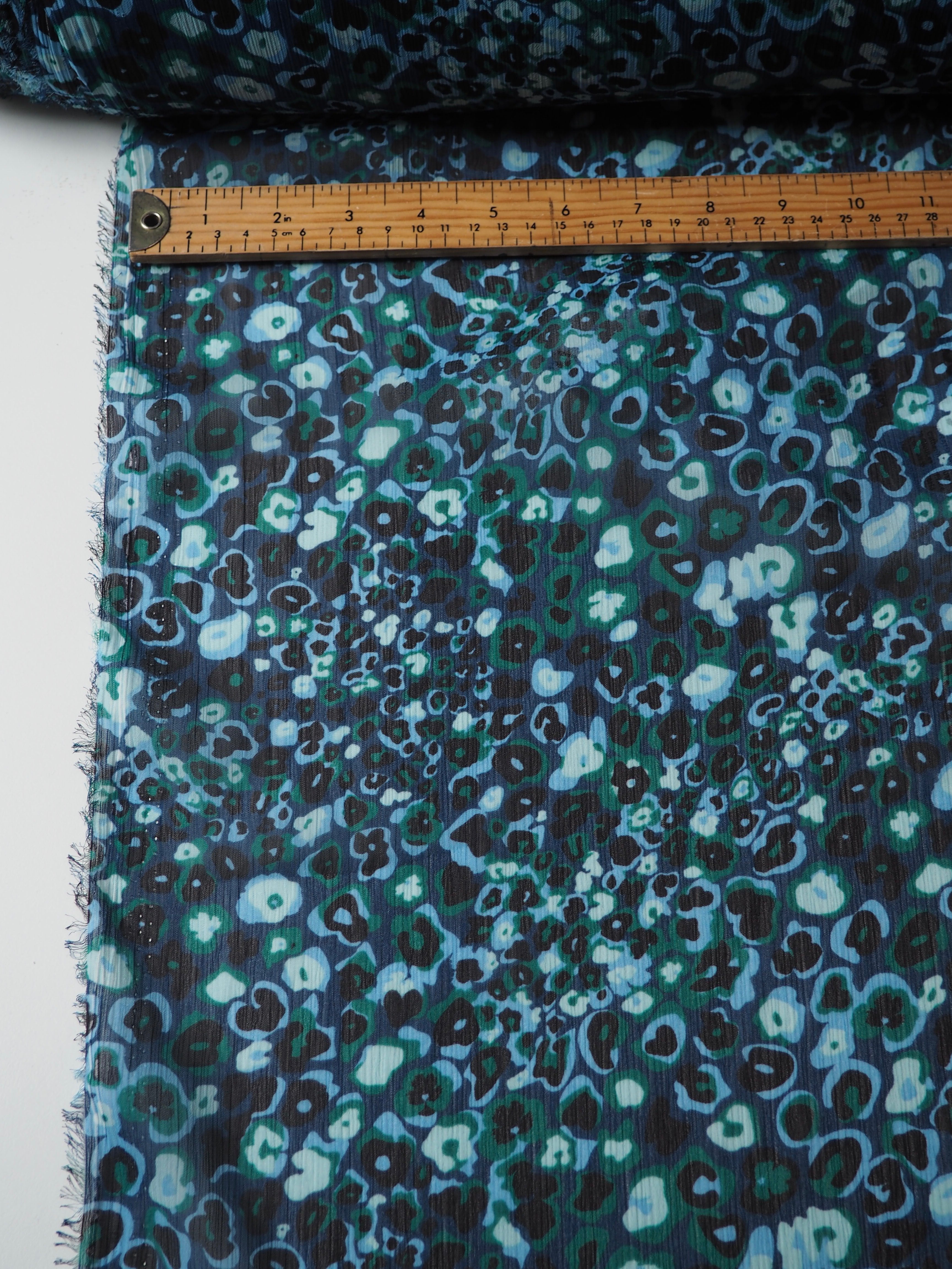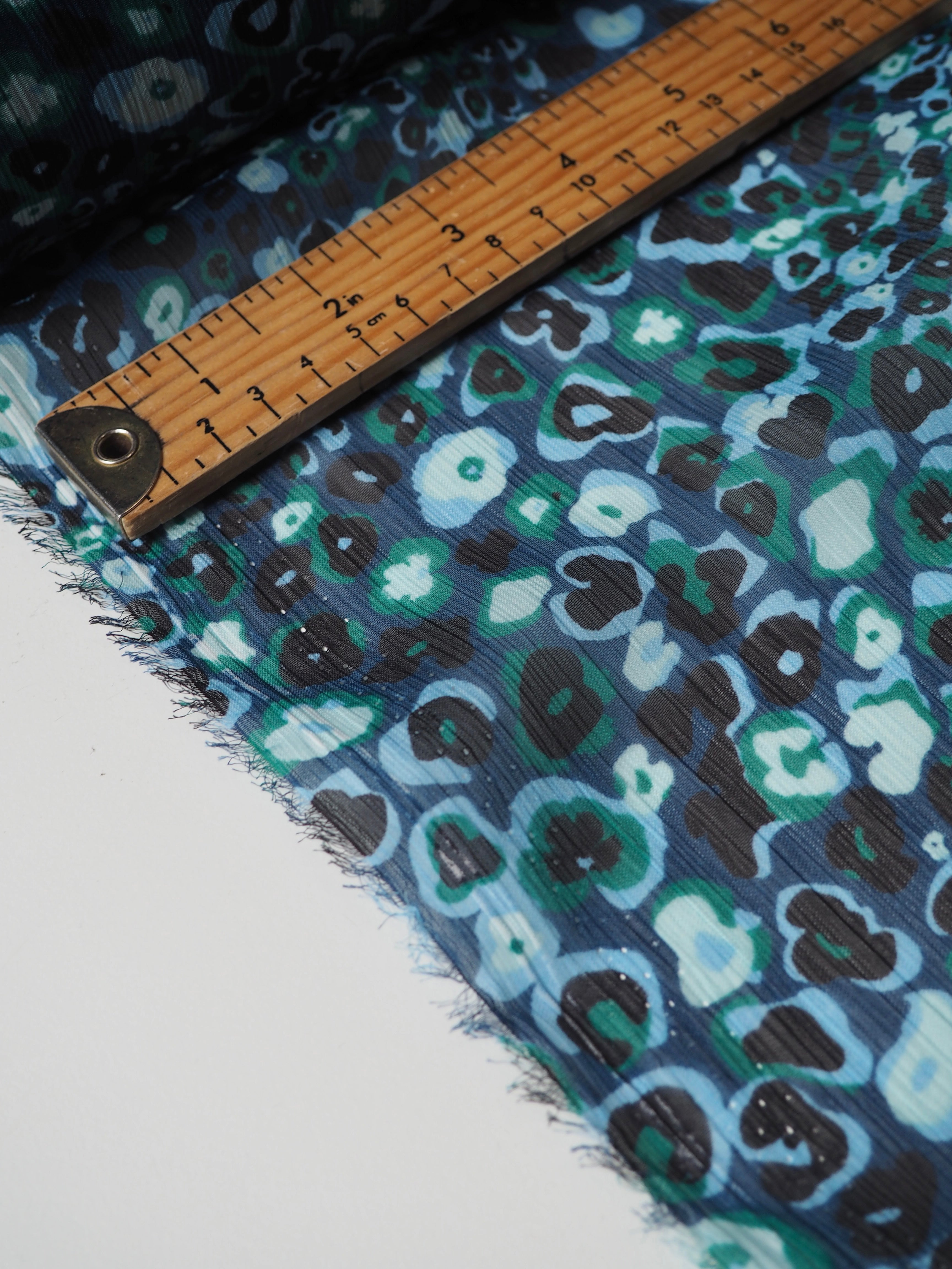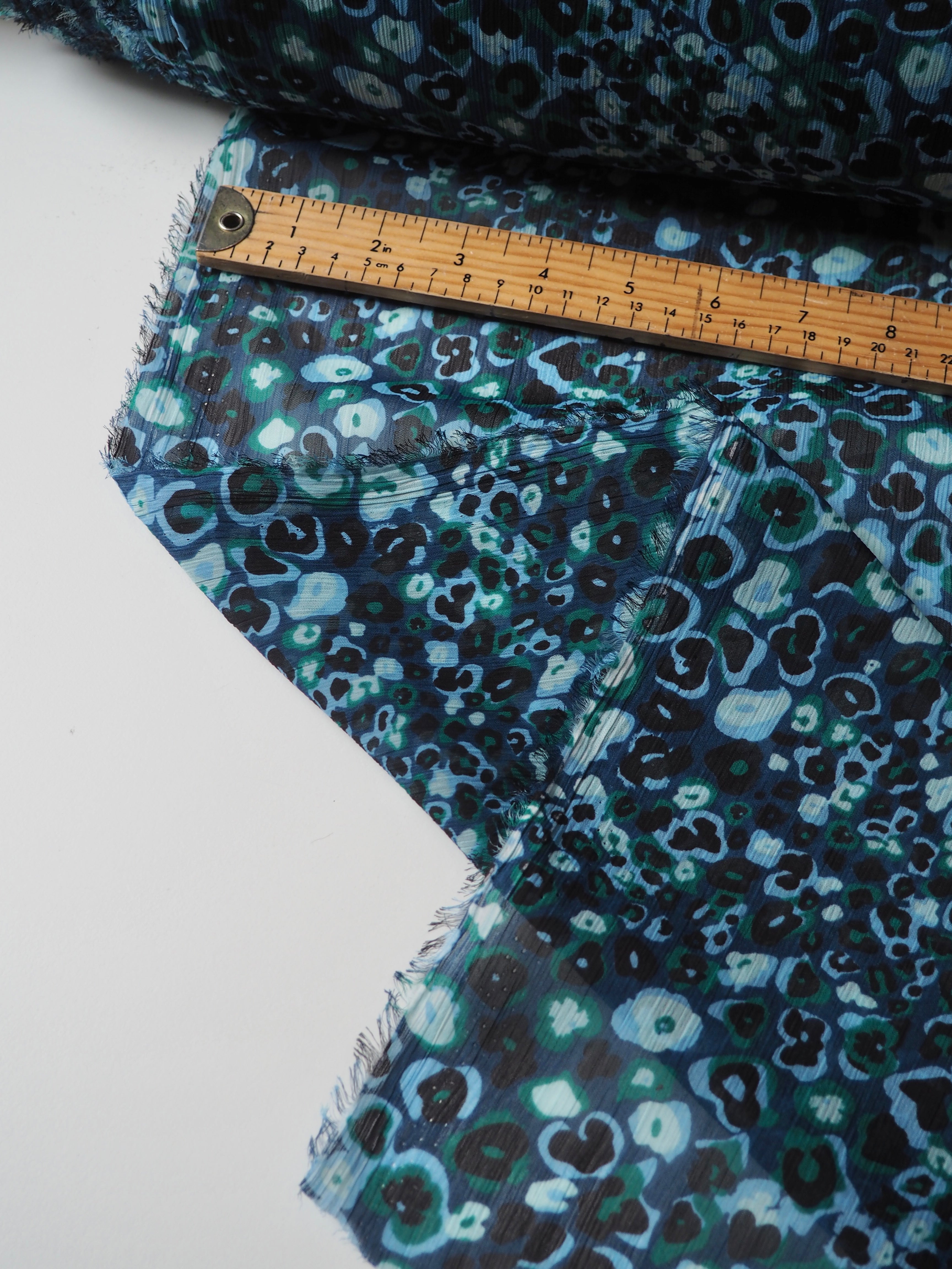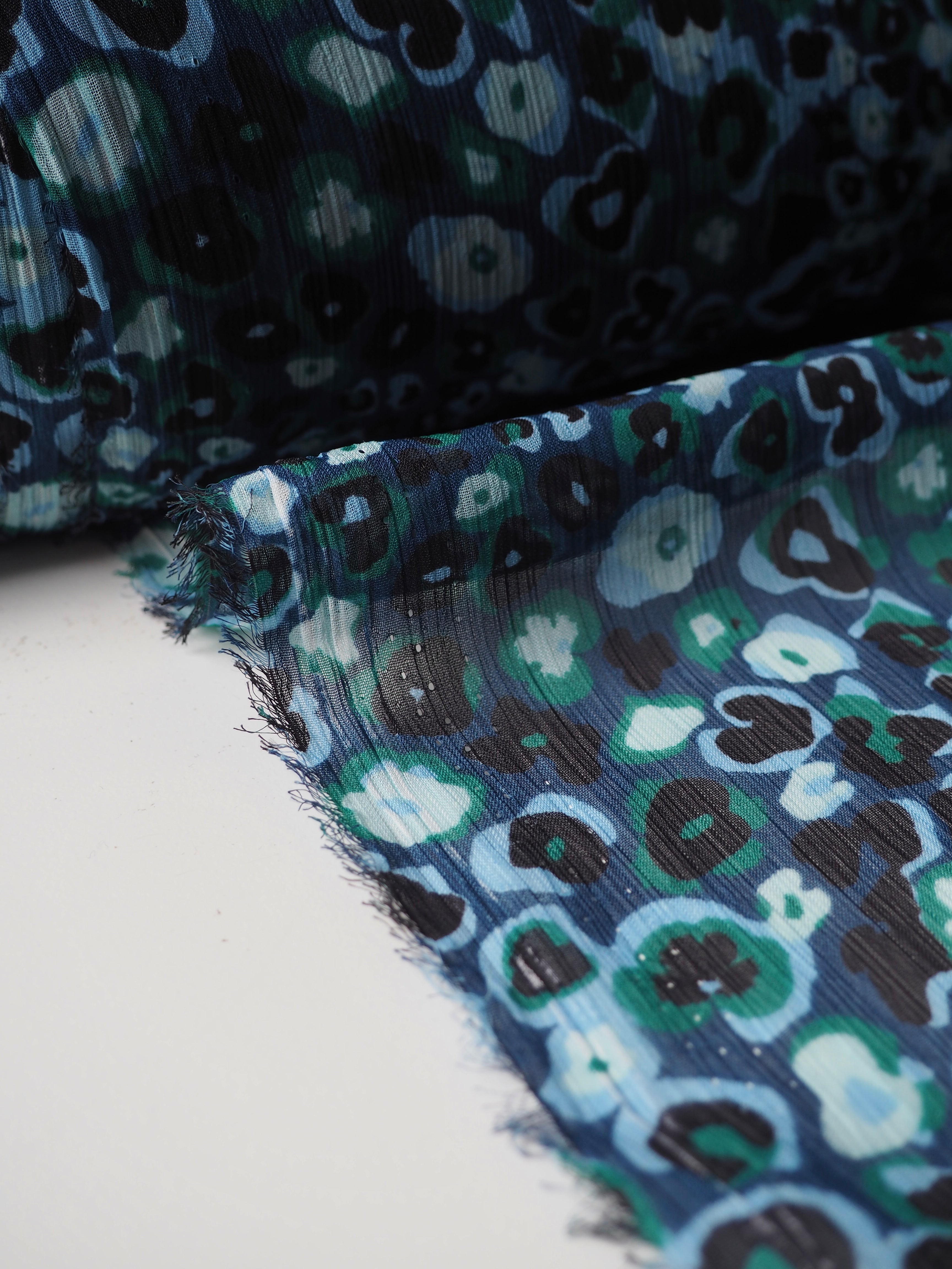 This ex-designer fabric is a printed chiffon. It's a crinkled chiffon with a green and blue floral cheetah print. It's lightweight and semi-sheer, with wonderful drape. It has such a nice crinkly handle as well. Great movement with a flat finish. Perfect for a scarf, drapey top, or swishy skirt!