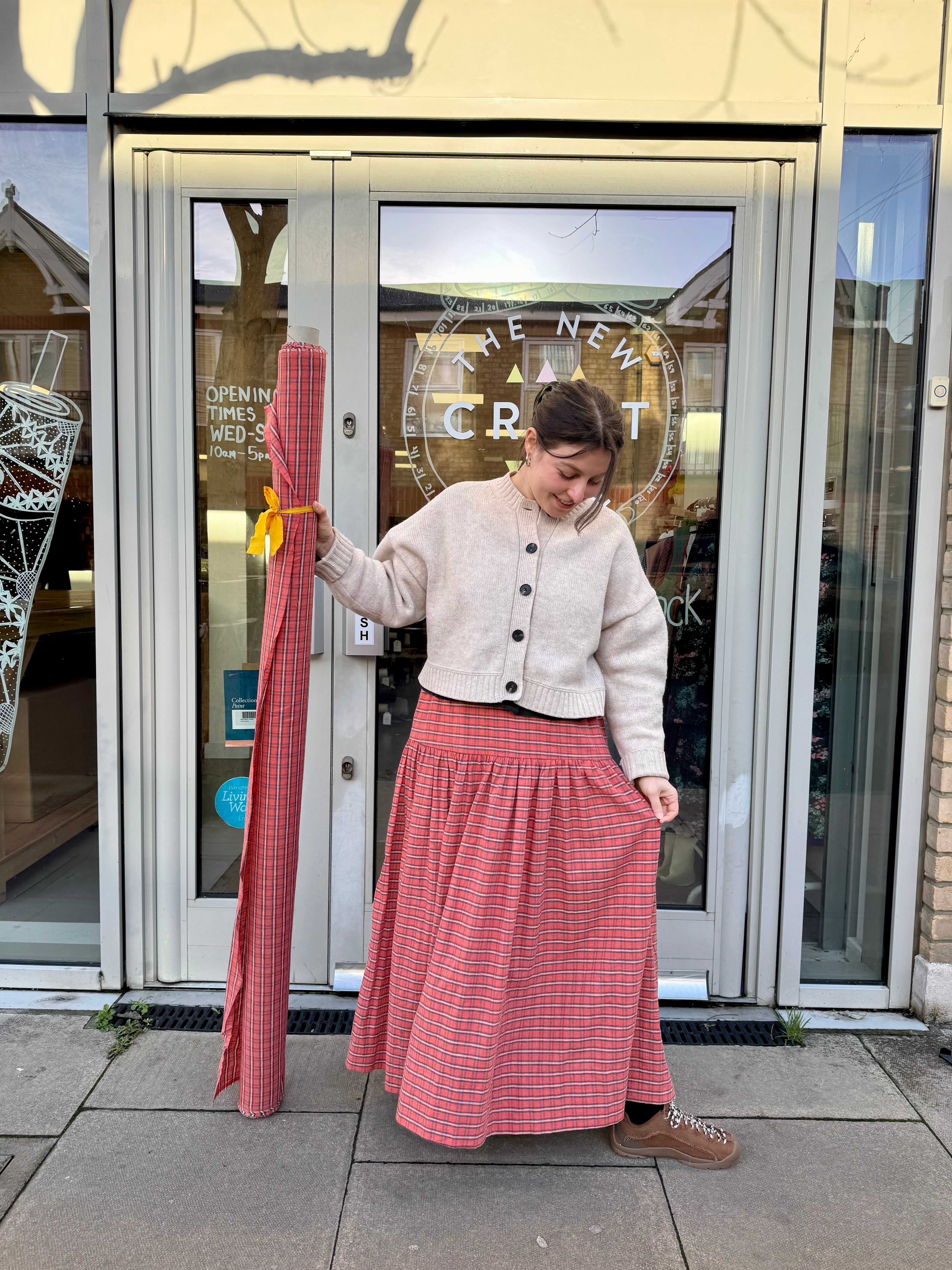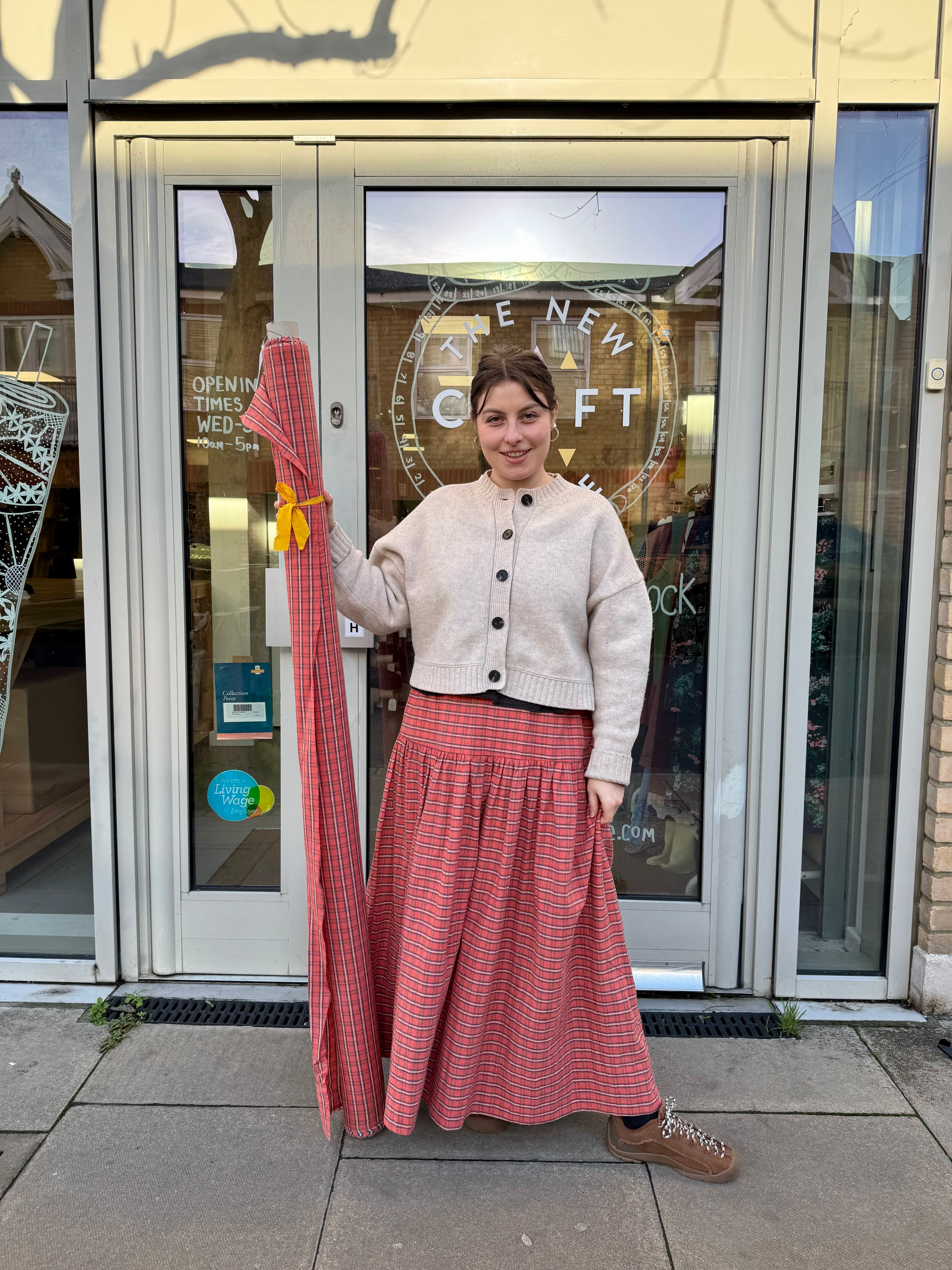 This ex-designer fabric is a cotton/linen. It's a salamander pinky-orange and blue check. It's from a London-based brand called Beyond Nine. It has a super soft and gentle blended weave, with an ideal cotton-y handle that's so wearable. That little bit of linen really elevates the cloth! Very lightweight with a gentle structured drape, breathable, and fully opaque. Lovely for our Everyday Dress/Top, summer tops or Everyday Trousers, (or even a co-ord!), or a tablecloth and napkin set! We can't wait to see what you make!