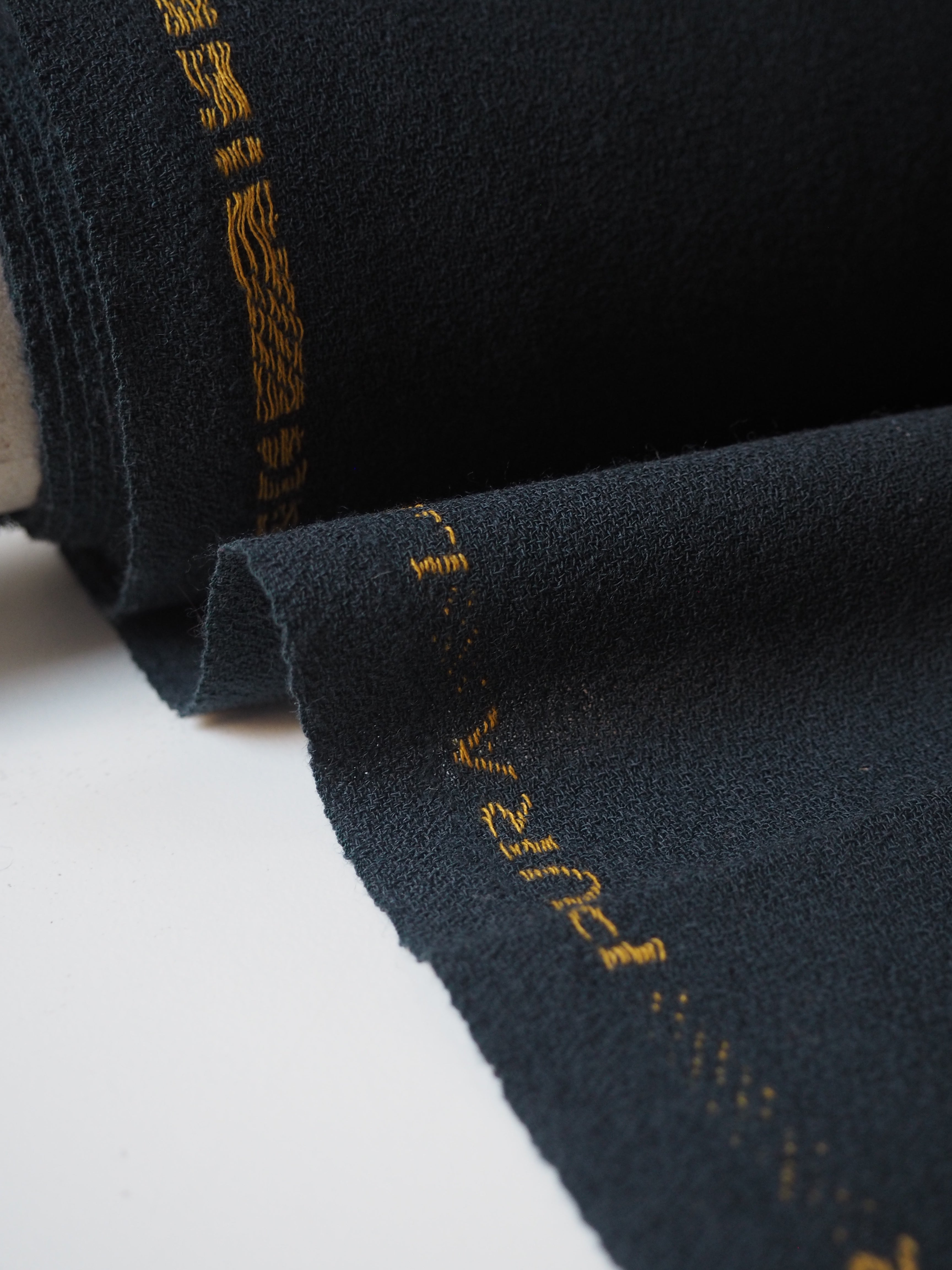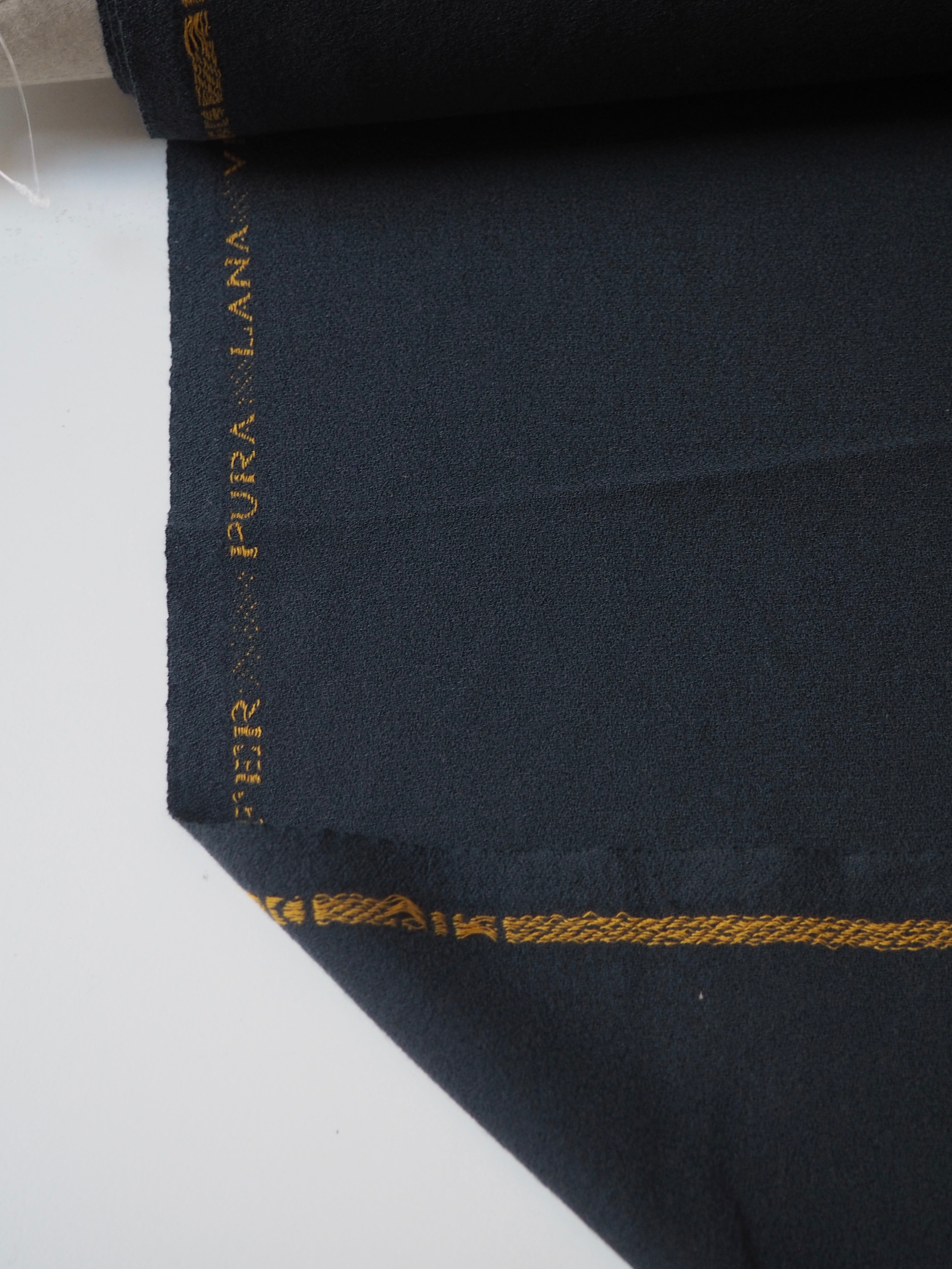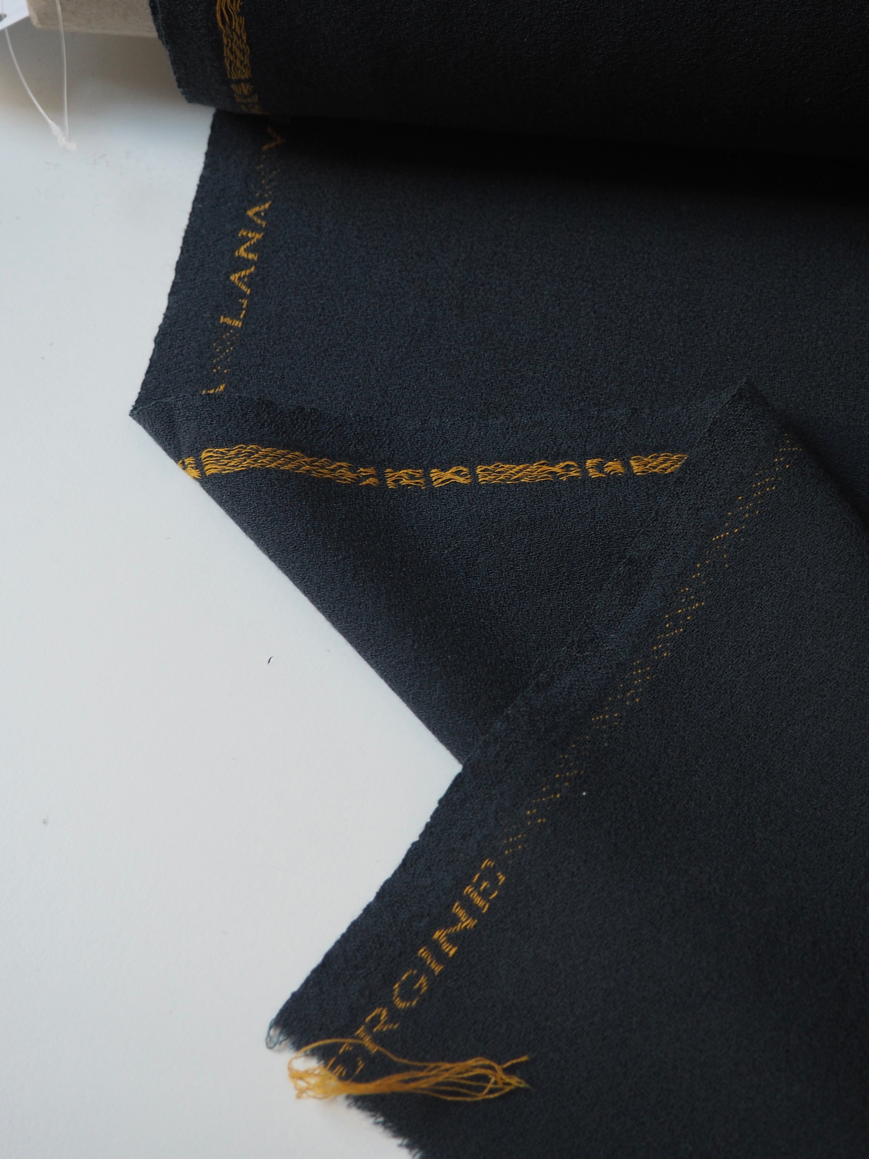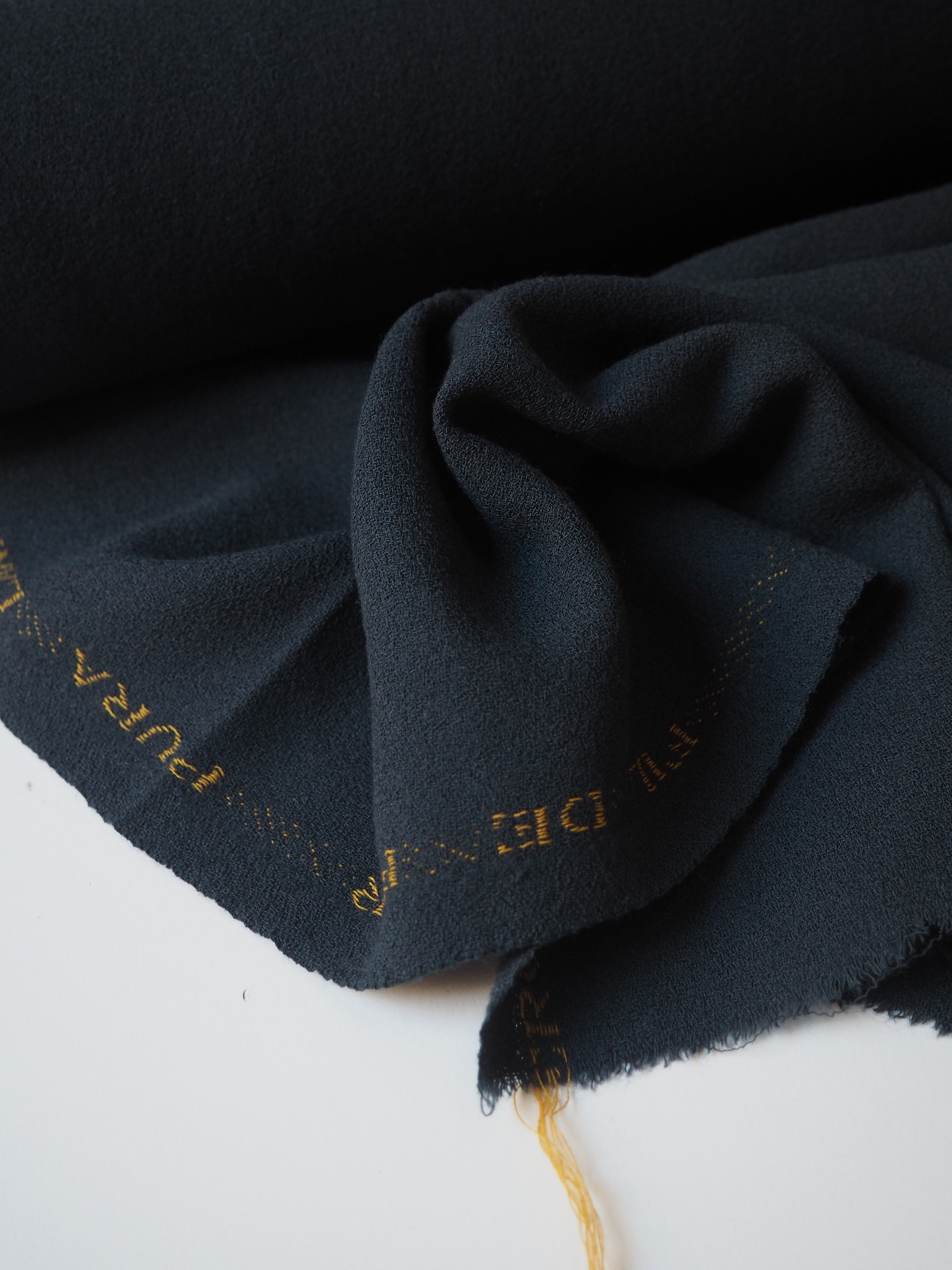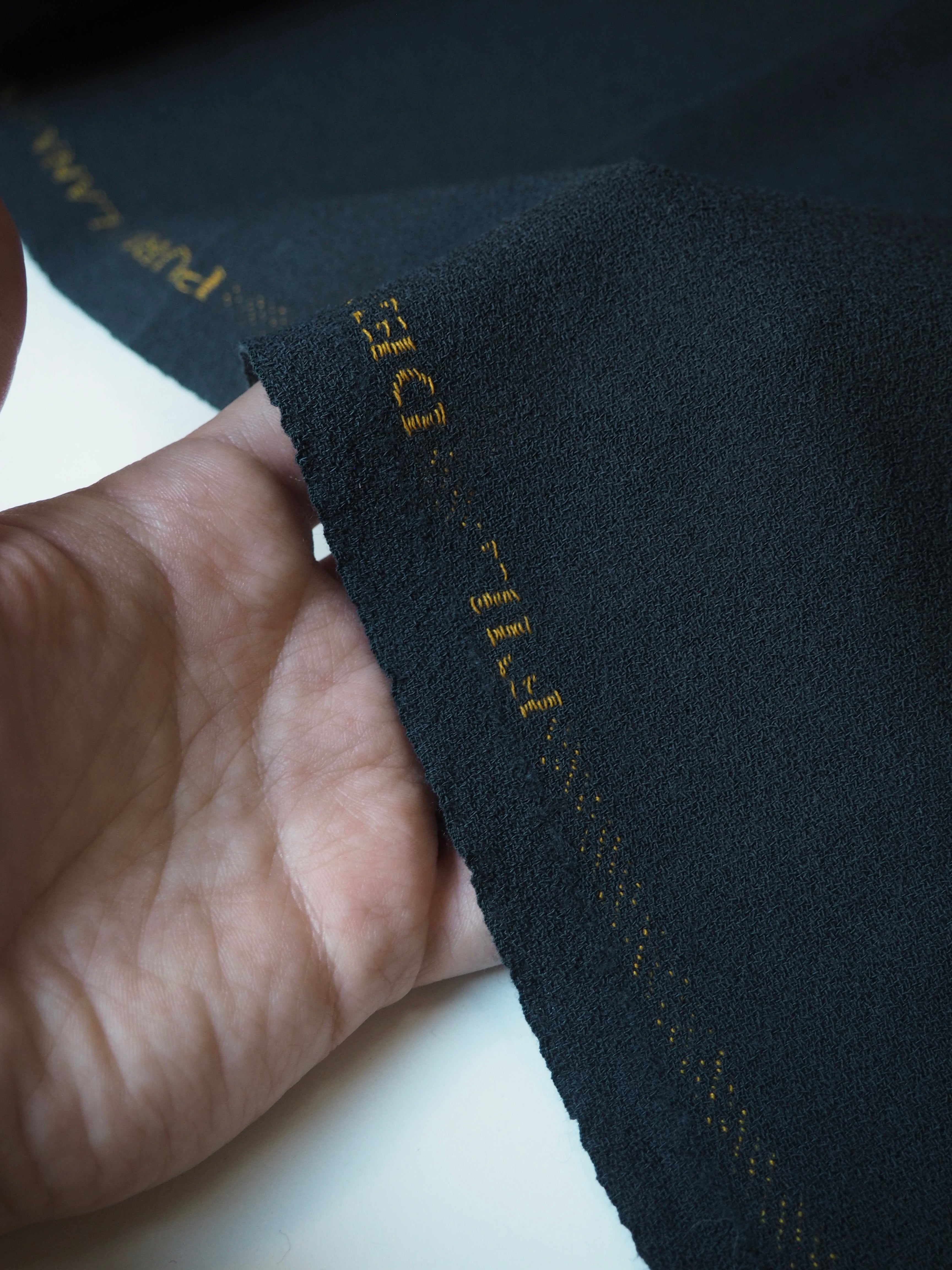 This ex-designer fabric is a wool crepe. It's a beautiful cloth with a sturdy but comfortable weave. It's made of pure wool and feels and looks so luxurious! It has a soft structure and really lovely soft crepe handle. Lightweight, and perfect for tailoring projects. Flexible and has a wonderful drape that makes it so easy to work with! Mostly opaque but lets a little light in. The perfect cloth for a lifetime pair of wide leg trousers!