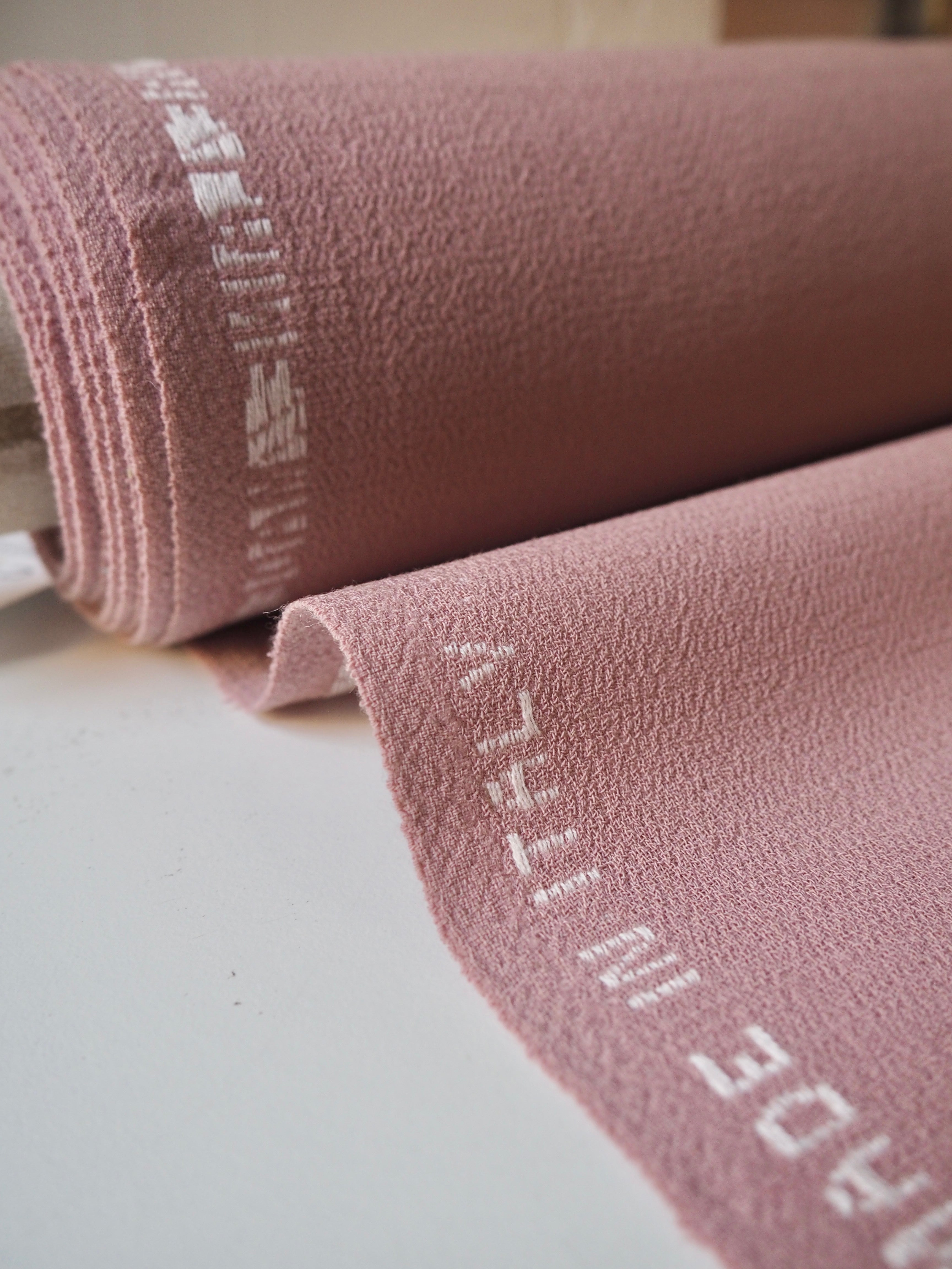 This ex-designer fabric is a wool crepe. It's a double-faced cloth with a sturdy but comfortable weave. It's made of pure wool and feels and looks so luxurious! It has a soft structure and really lovely soft, plush crepe handle. Medium weight, and perfect for tailoring projects. Flexible and has a wonderful drape that makes it so easy to work with! The perfect cloth for a lifetime blazer for all seasons, and wide leg trousers!