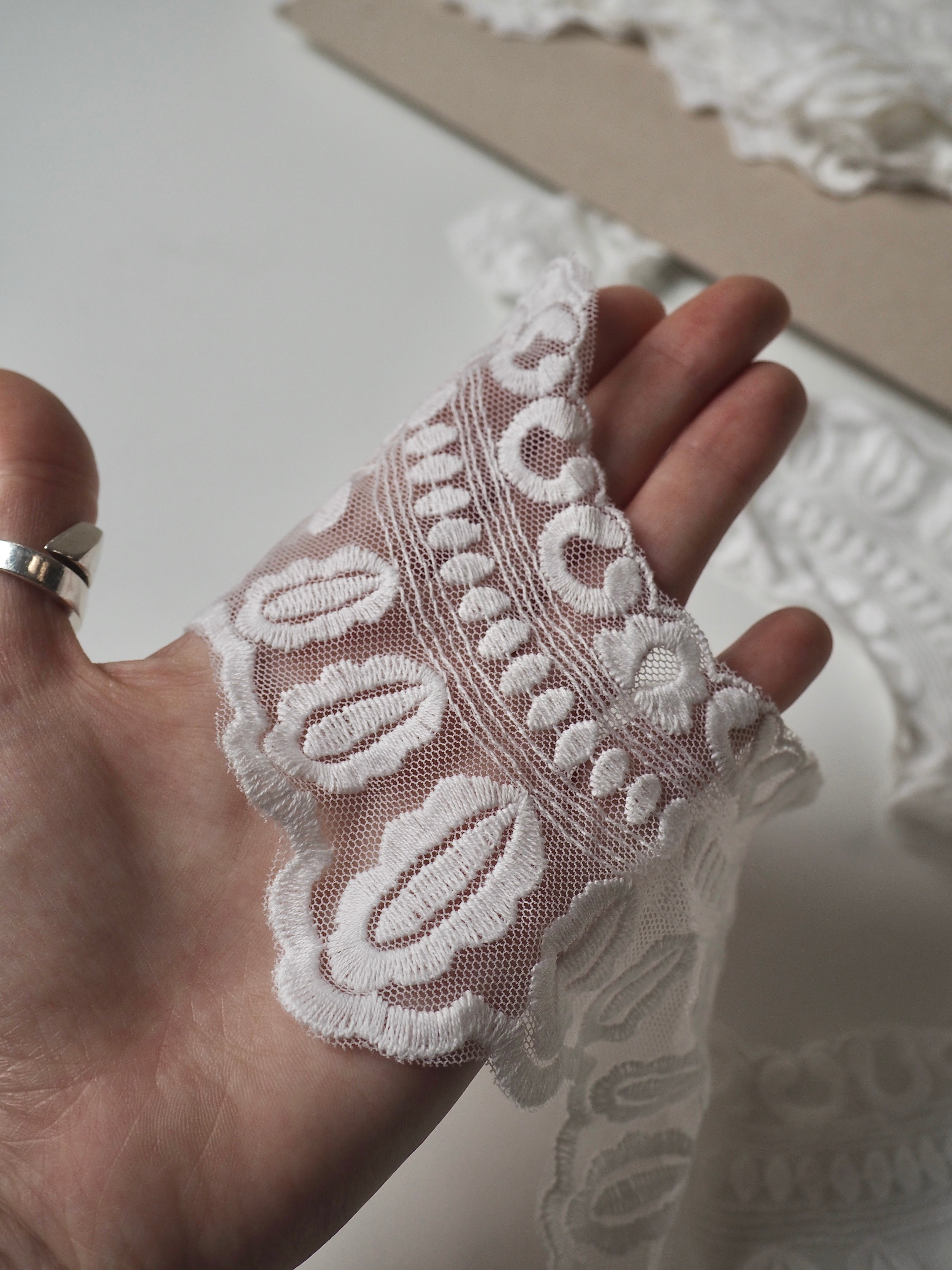 This is a scalloped trim with beautiful abstract floral motifs. It is made of embroidered cotton on a soft tulle base. Would look great as an inlay or could be appliquéd on. Perfect for garments or lingerie, particularly bridal! All our trim is deadstock left over from when a designer has finished sampling their collection.