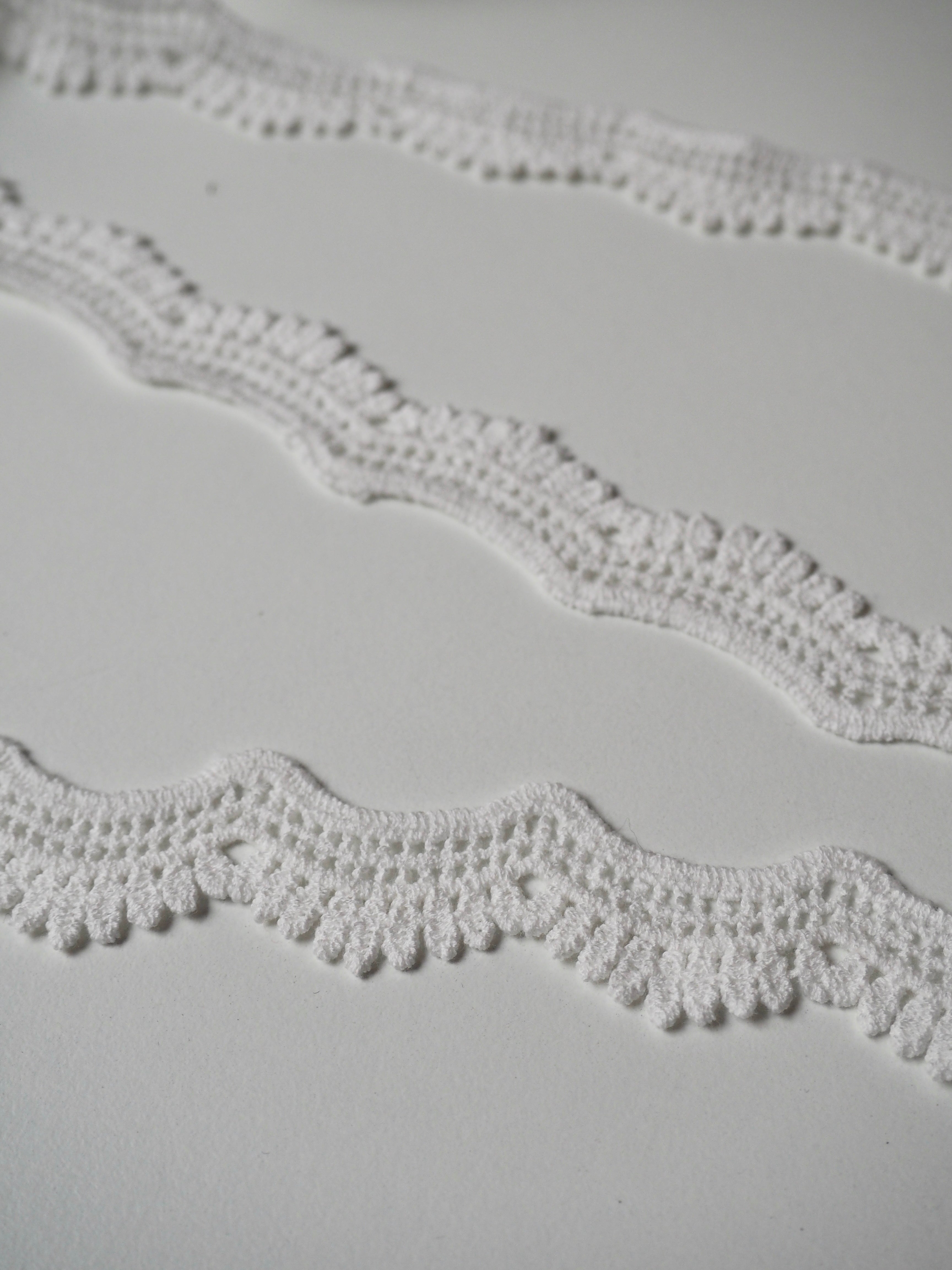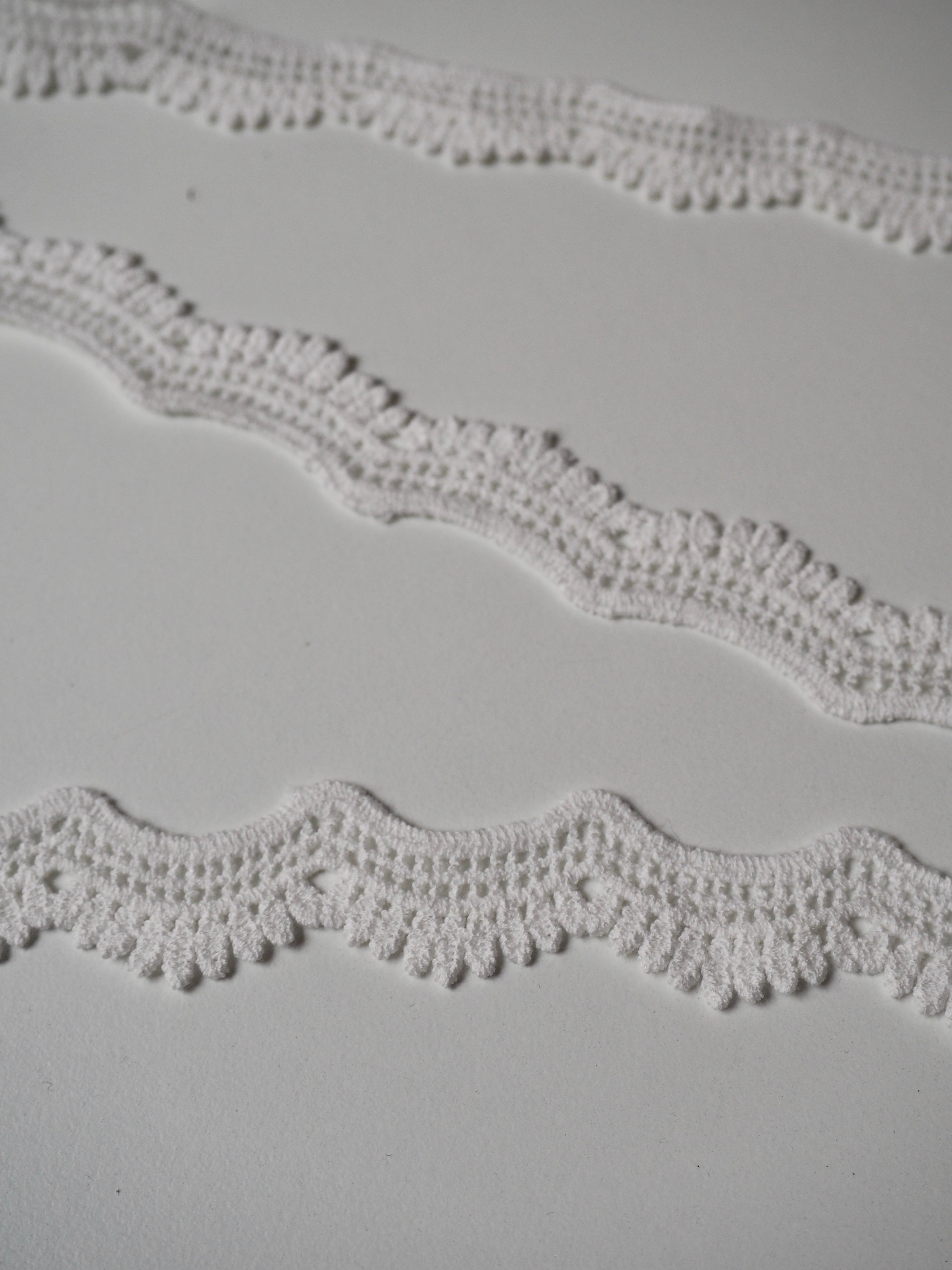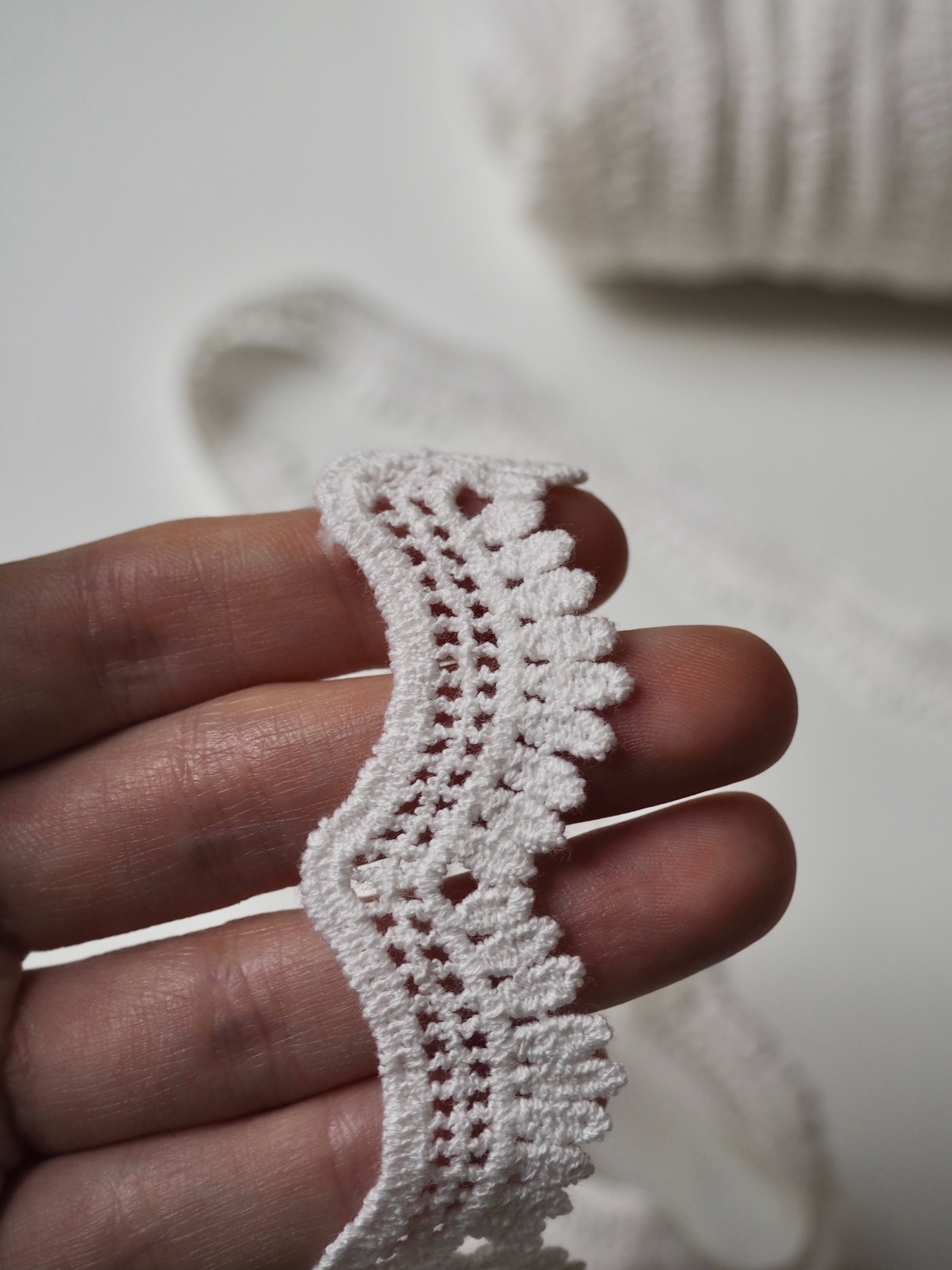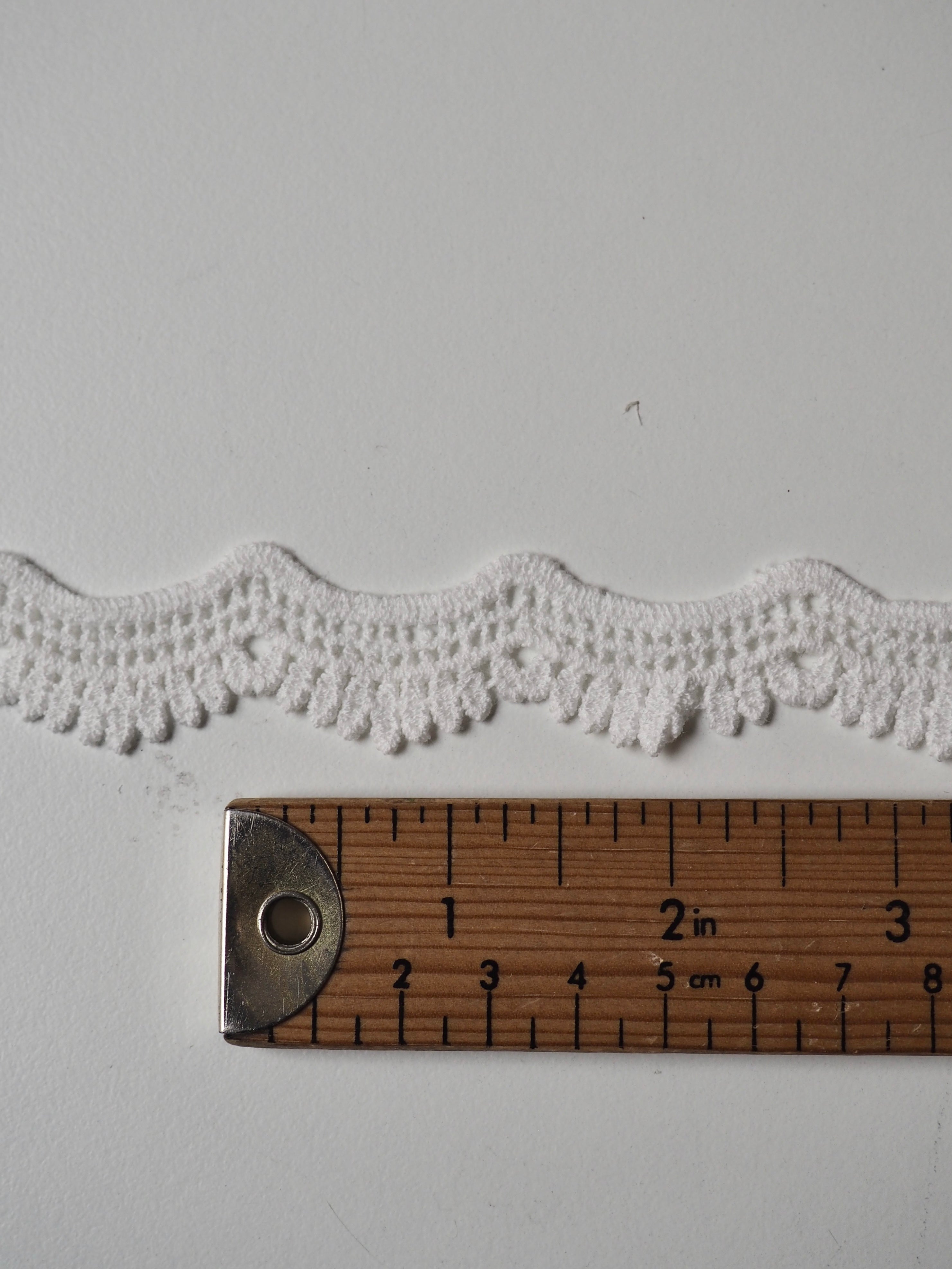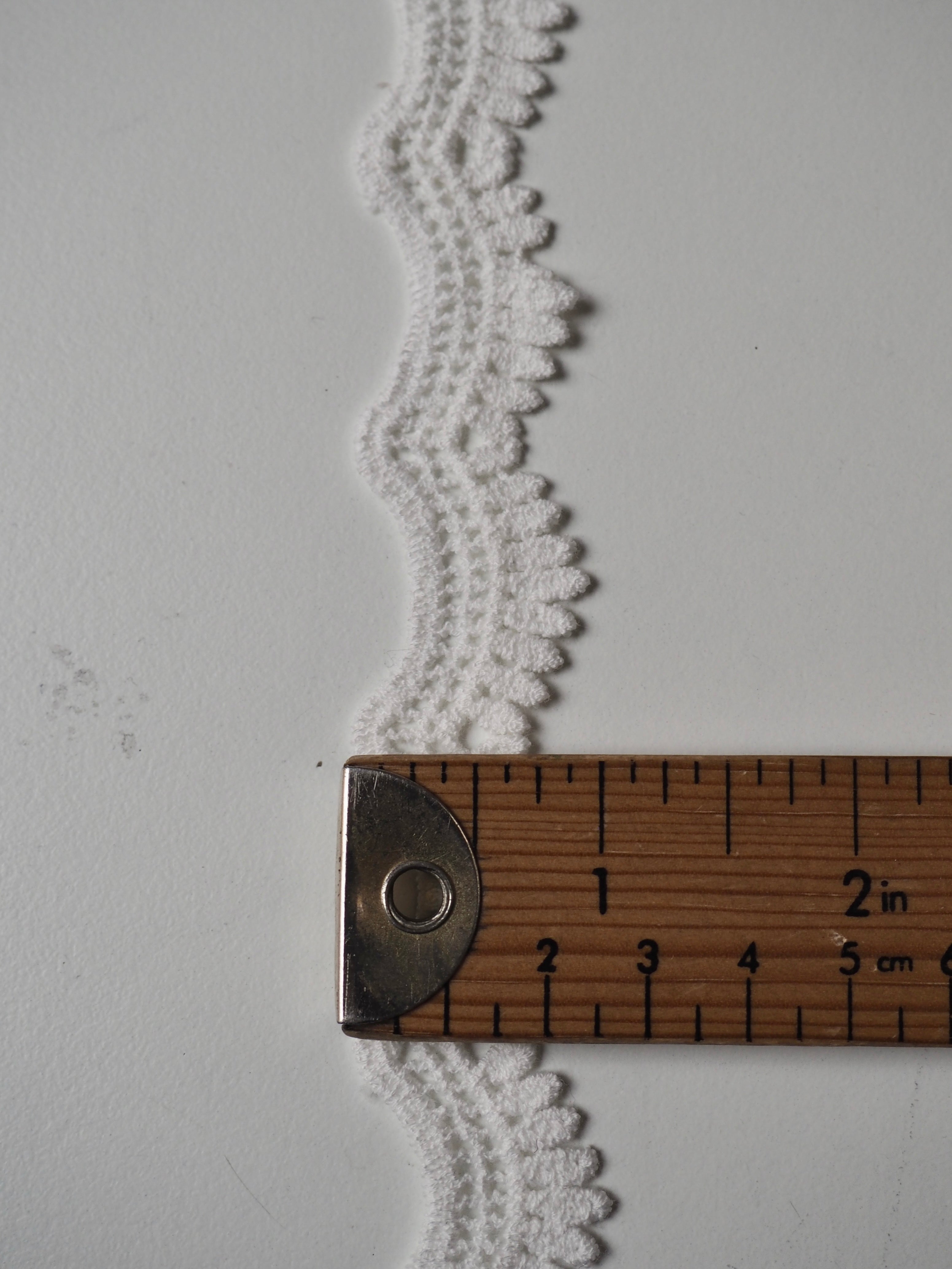 Gorgeous cotton lace trim, with a leaf design border with a gentle scallop effect. Would look great as an inlay or could be appliquéd on. Perfect for garments or lingerie, particularly bridal! All our trim is deadstock left over from when a designer has finished sampling their collection.