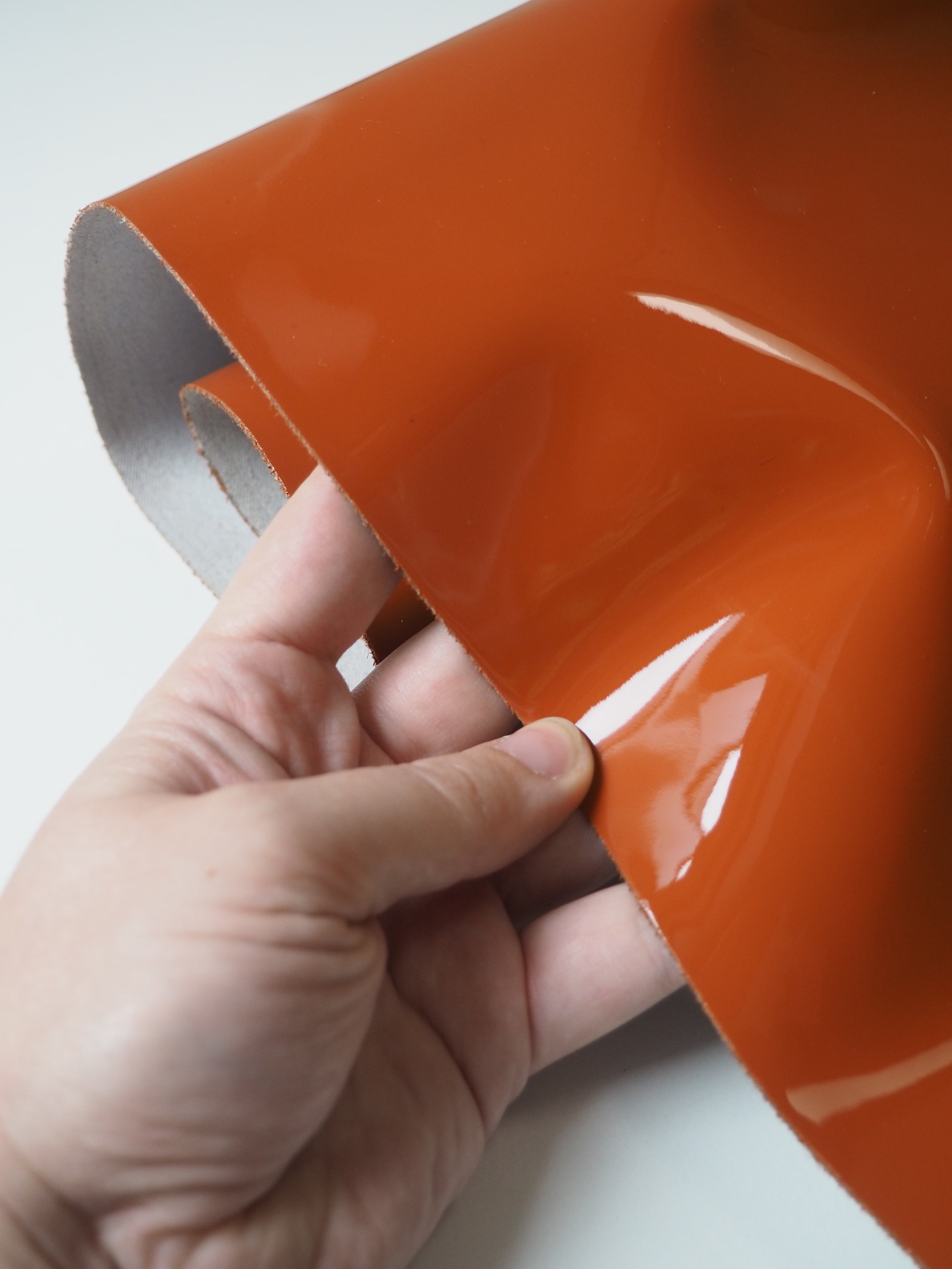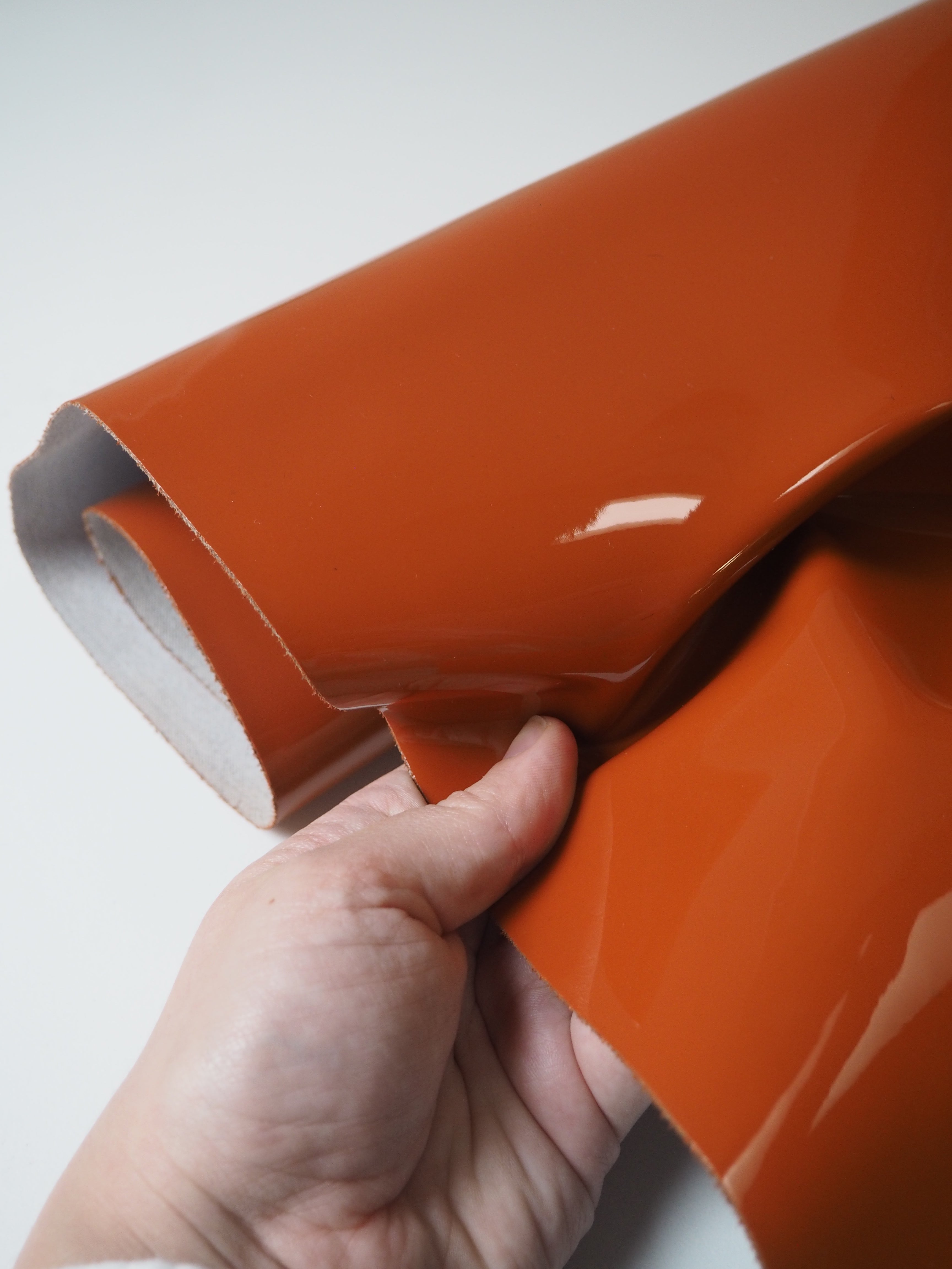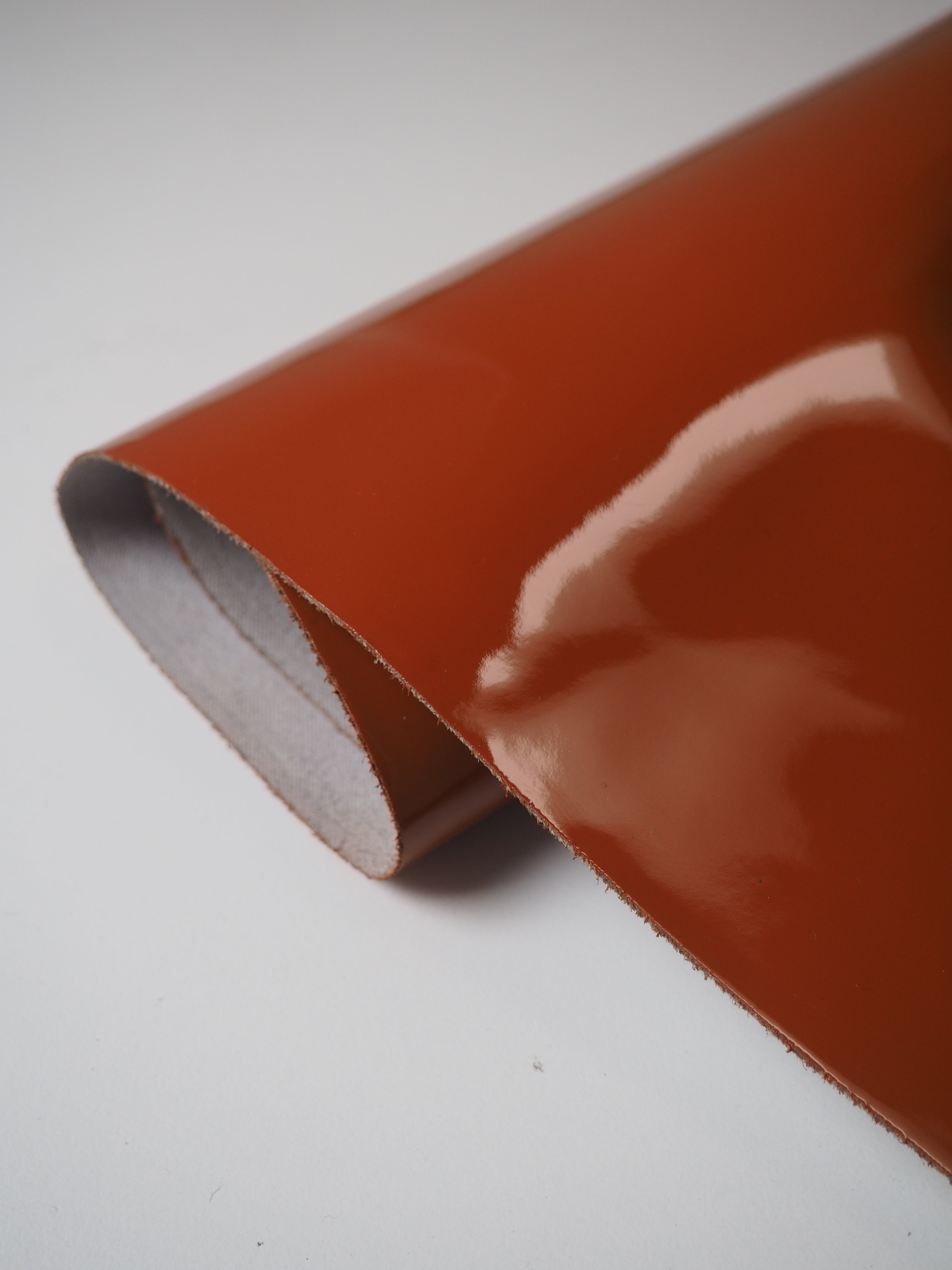 This ex-designer leather is a calfskin. It's a terracotta/burnt sienna brown leather with an extra shiny patent finish. Has a good structure, and is light to medium weight. We would love to see this made up into a bag or purse!