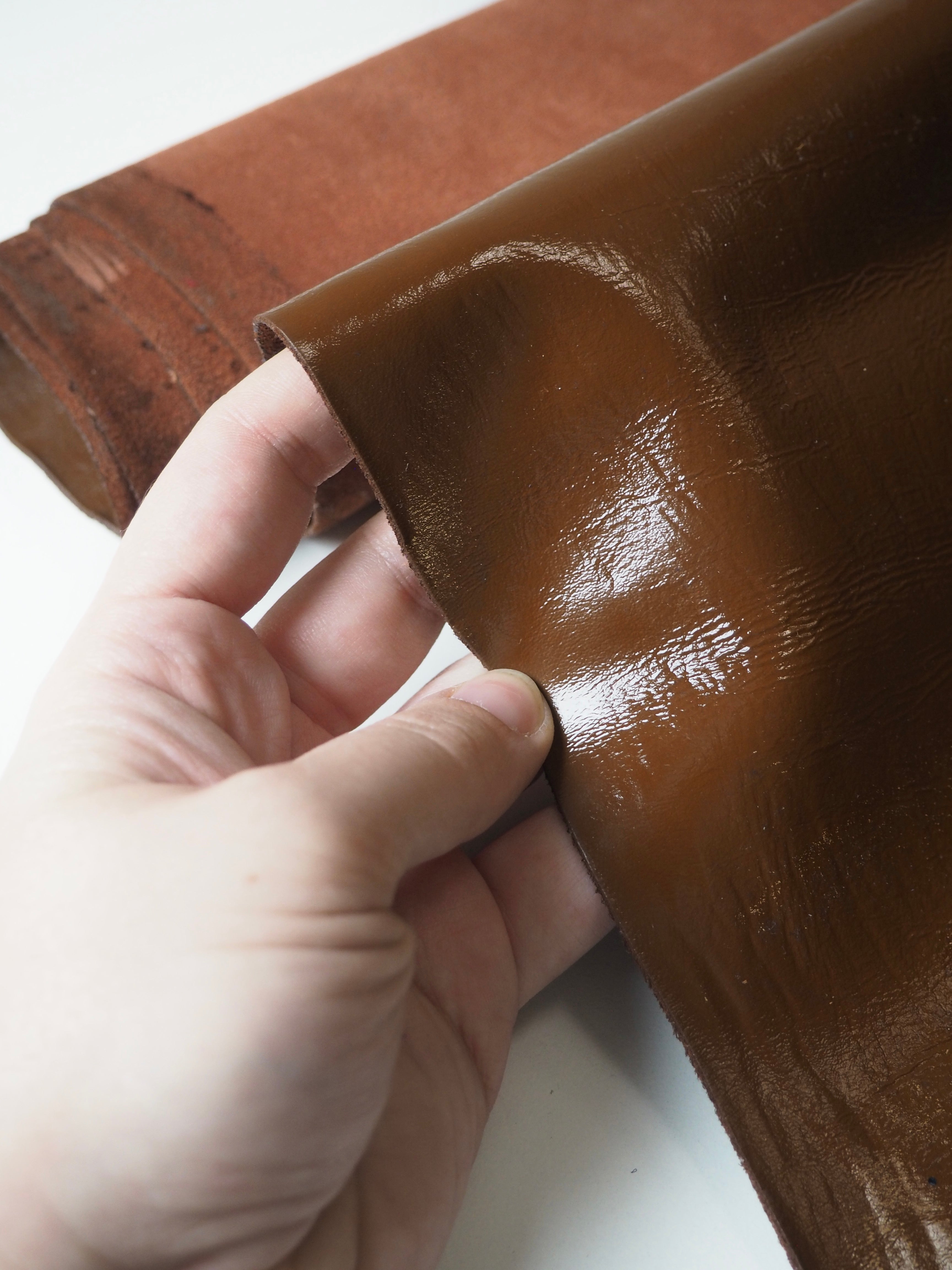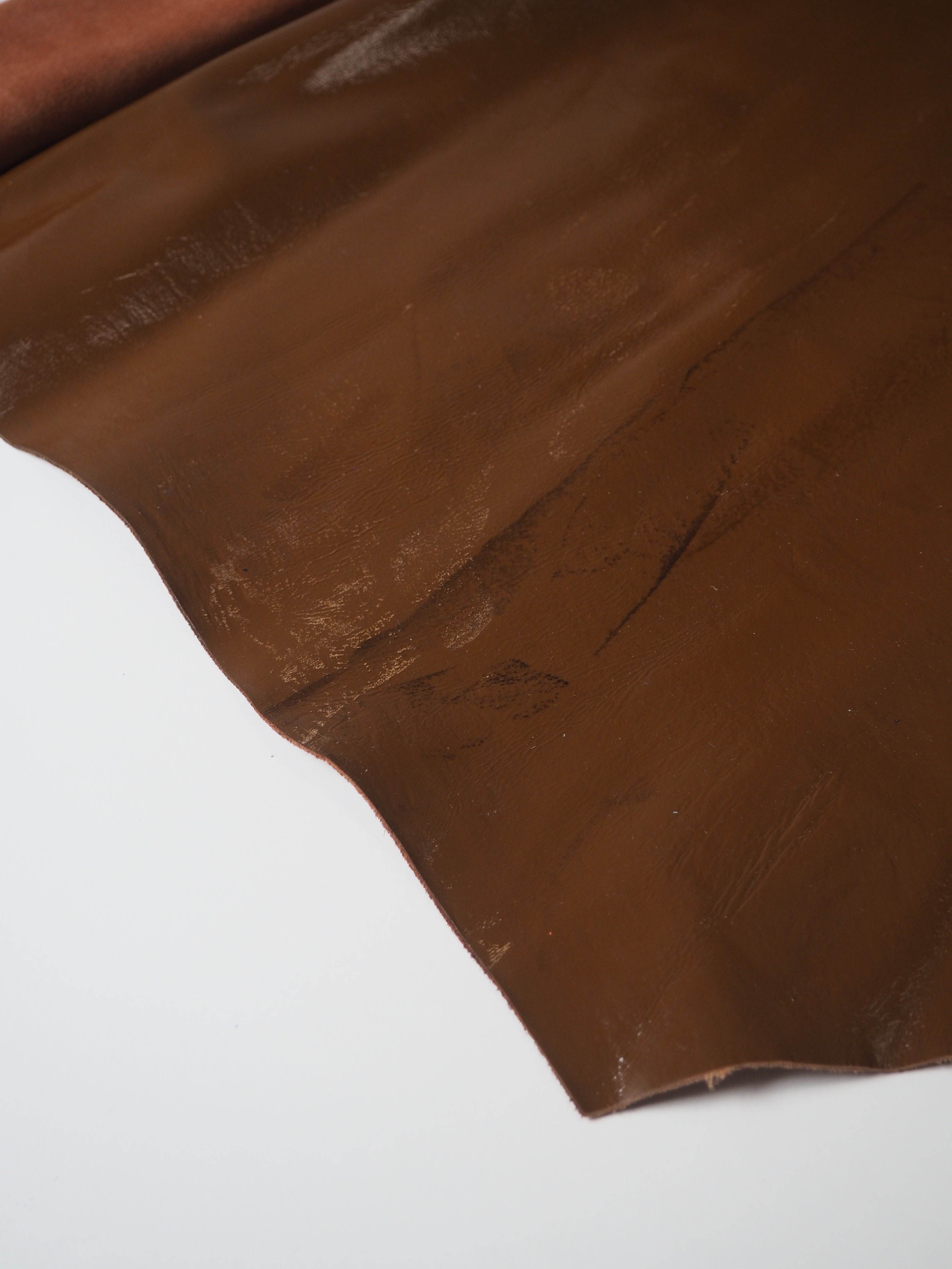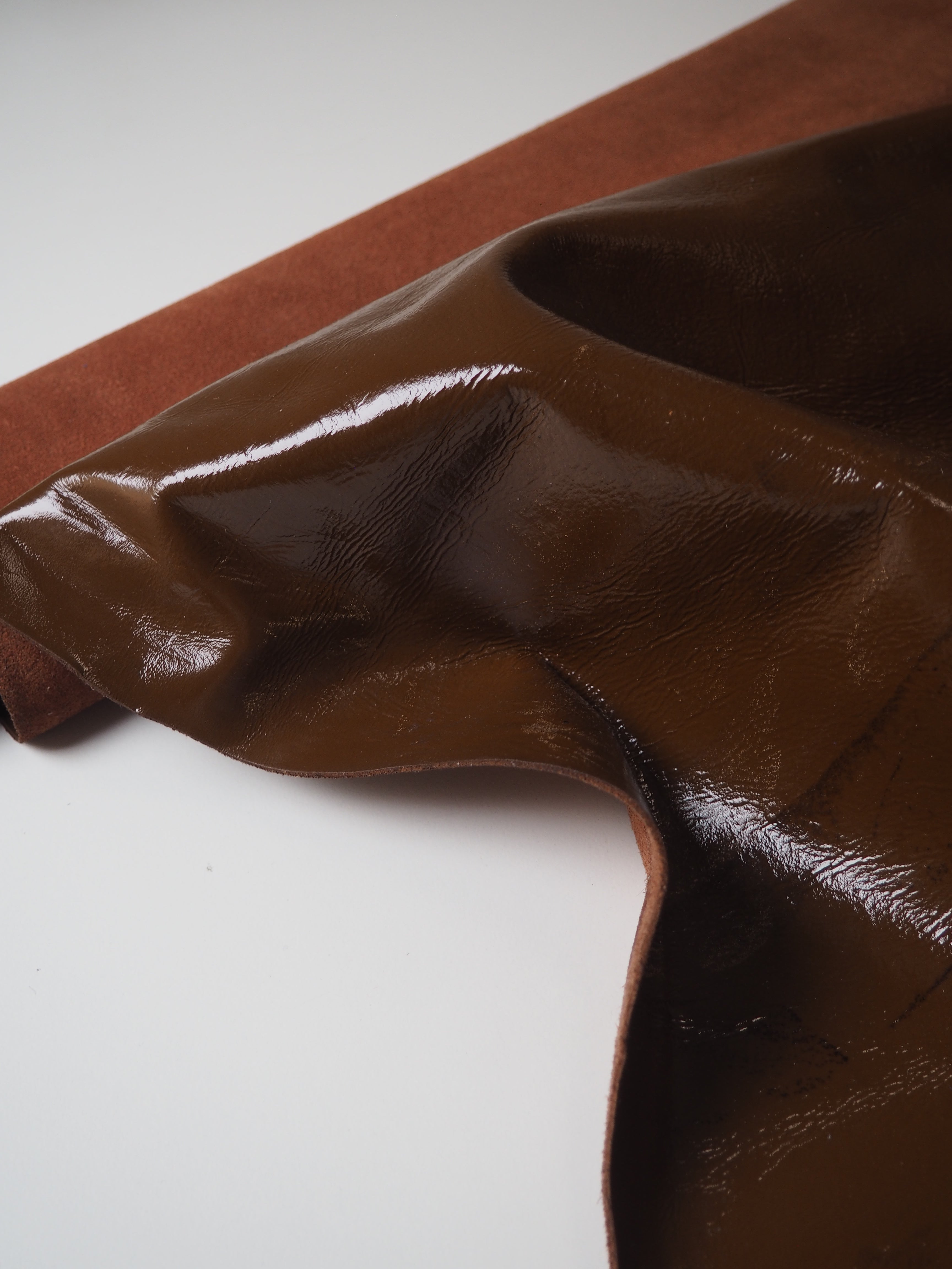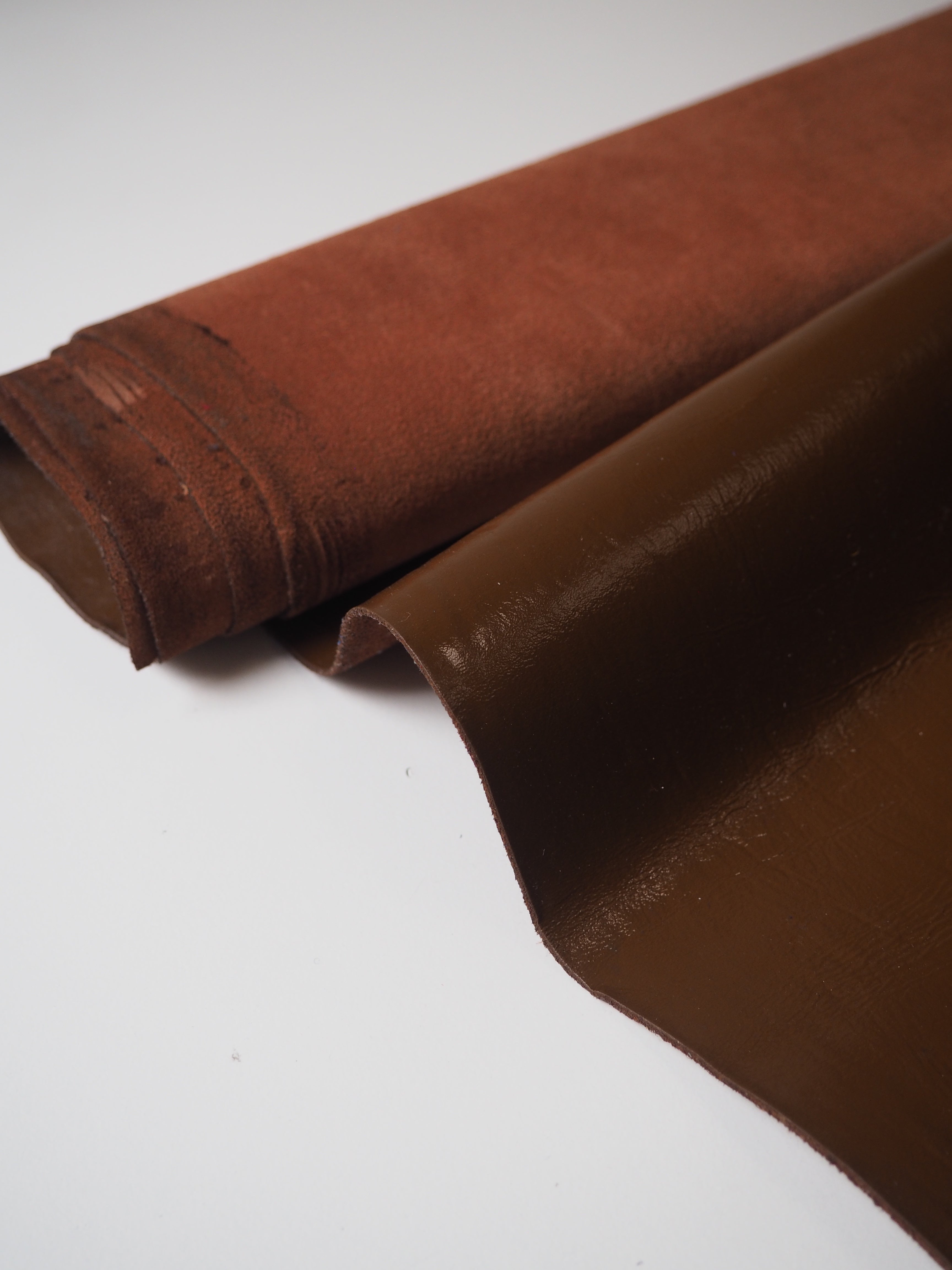 This ex-designer leather is a calfskin. It's a mocha brown leather with a shiny finish. Has a flexible structure, drapes quite well, and is light to medium weight. We would love to see this made up into a bag or purse!