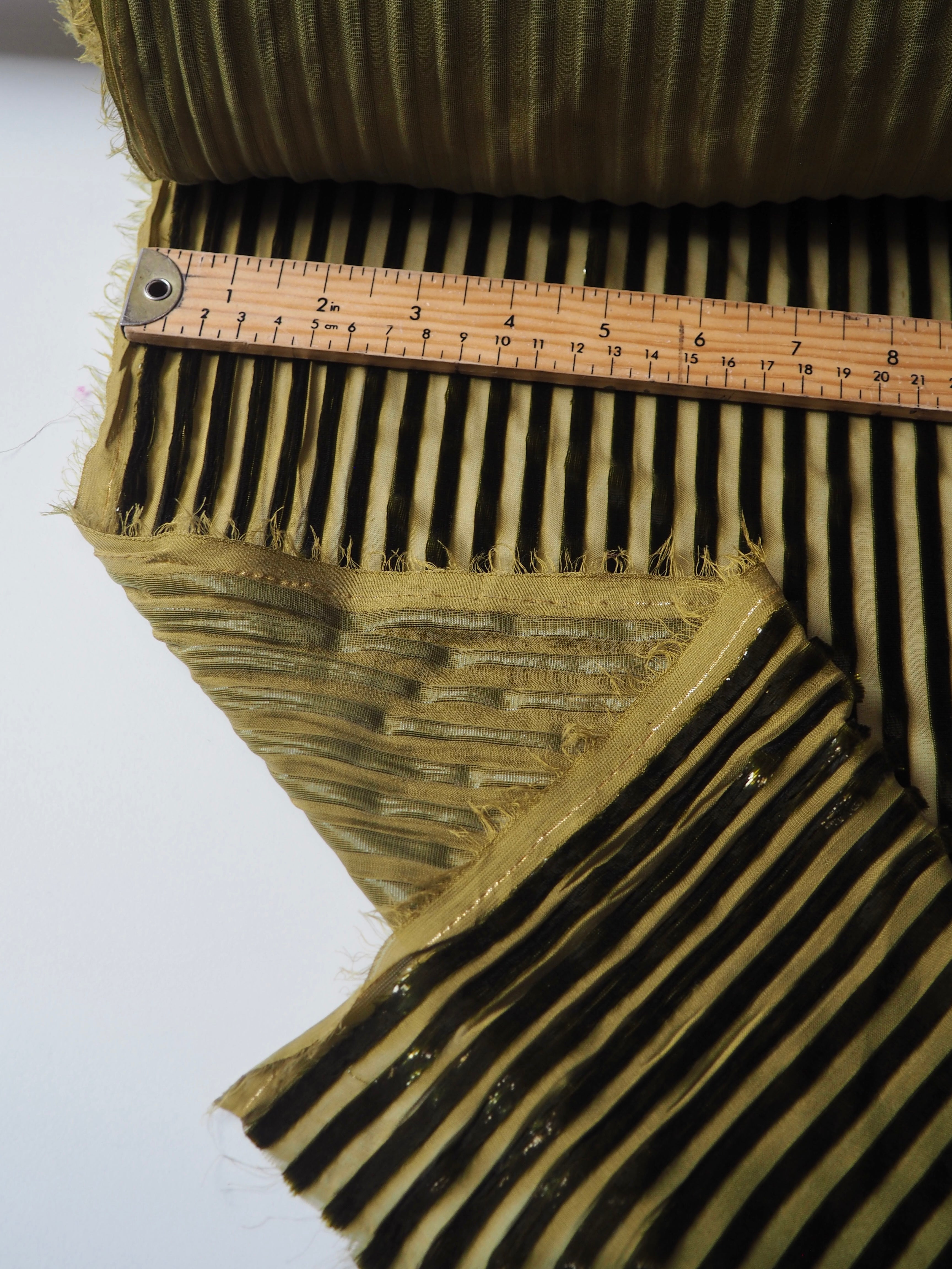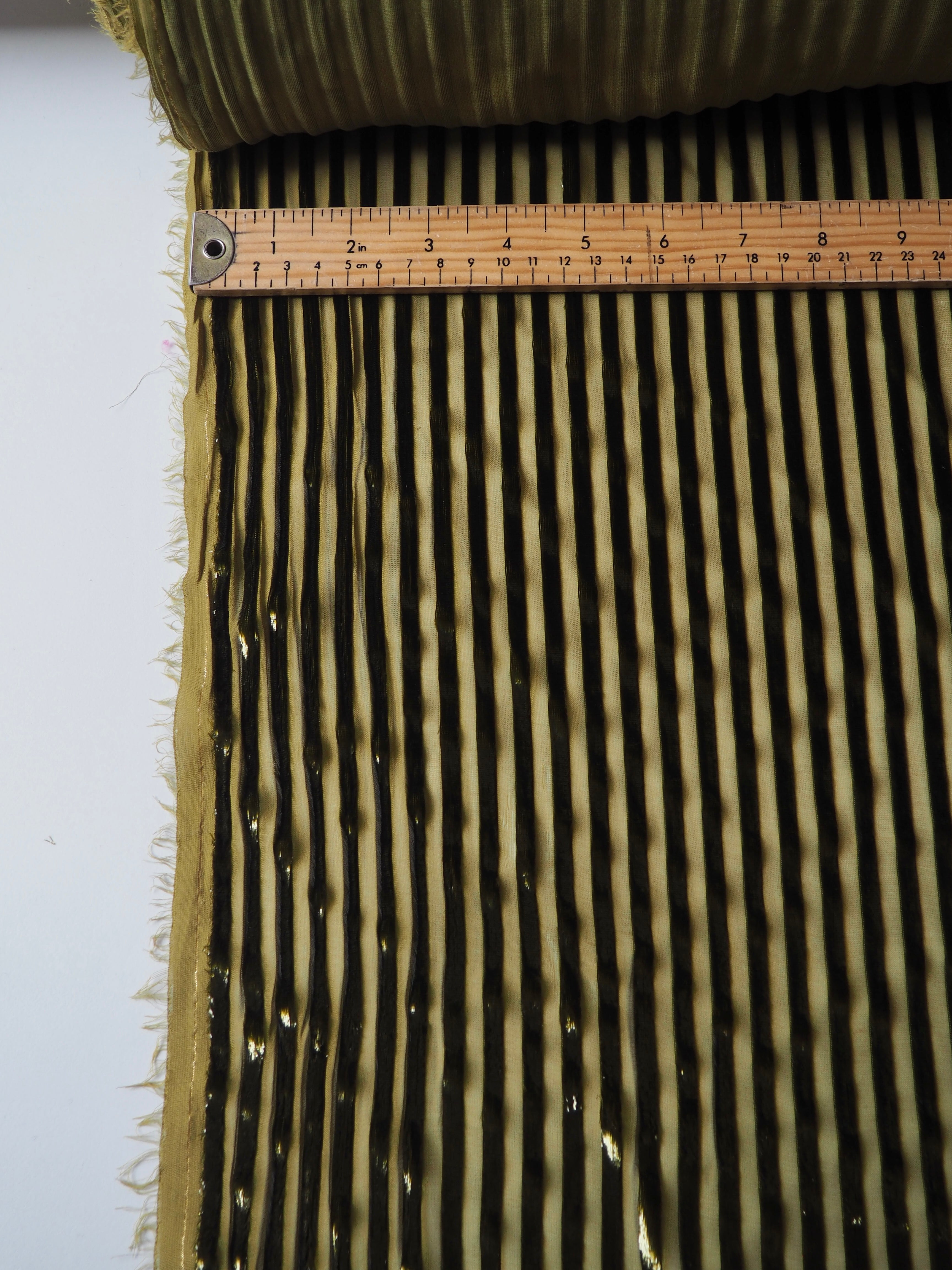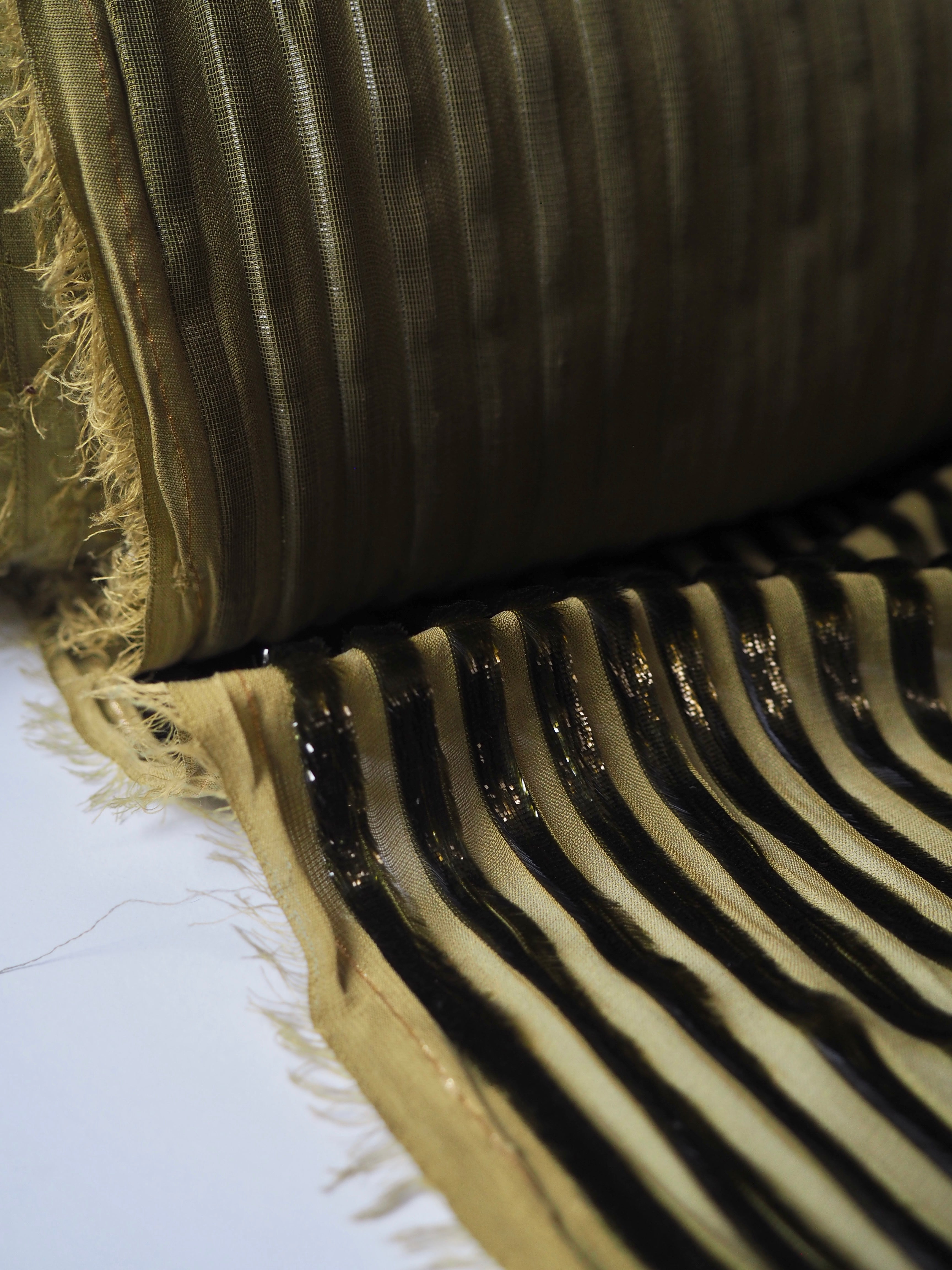 This ex-designer fabric is a unique chiffon. Olive metallic stripes are woven down the warp, with a sheer chiffon opposite. The stripes are in a fringe-y metallic fibre, almost mimicking velvet. It has such a luxurious look and handle! Amazing movement and so gorgeous in the light! Semi-sheer, with an incredible drape. Would look amazing as the overlay of a fancy dress!