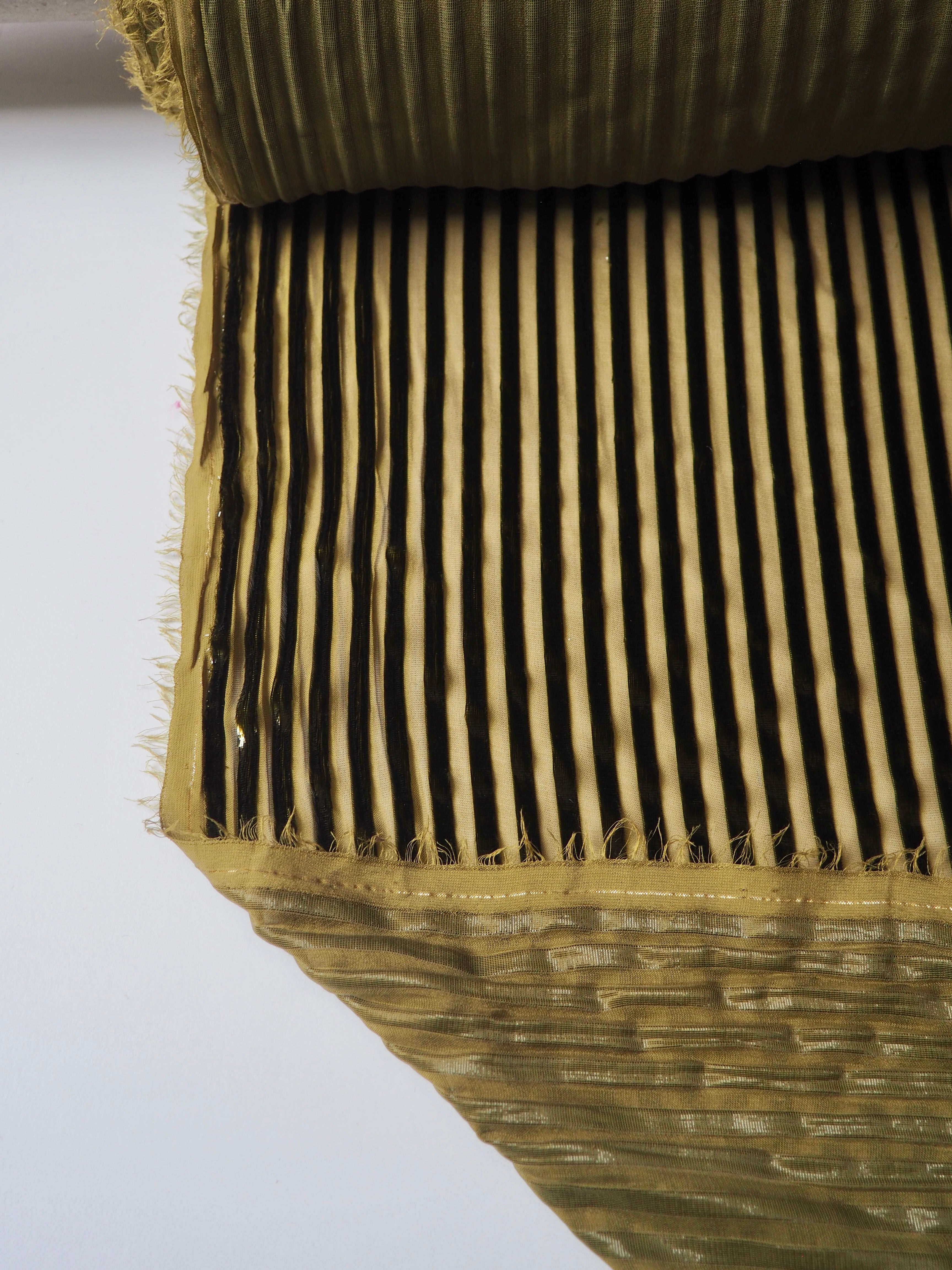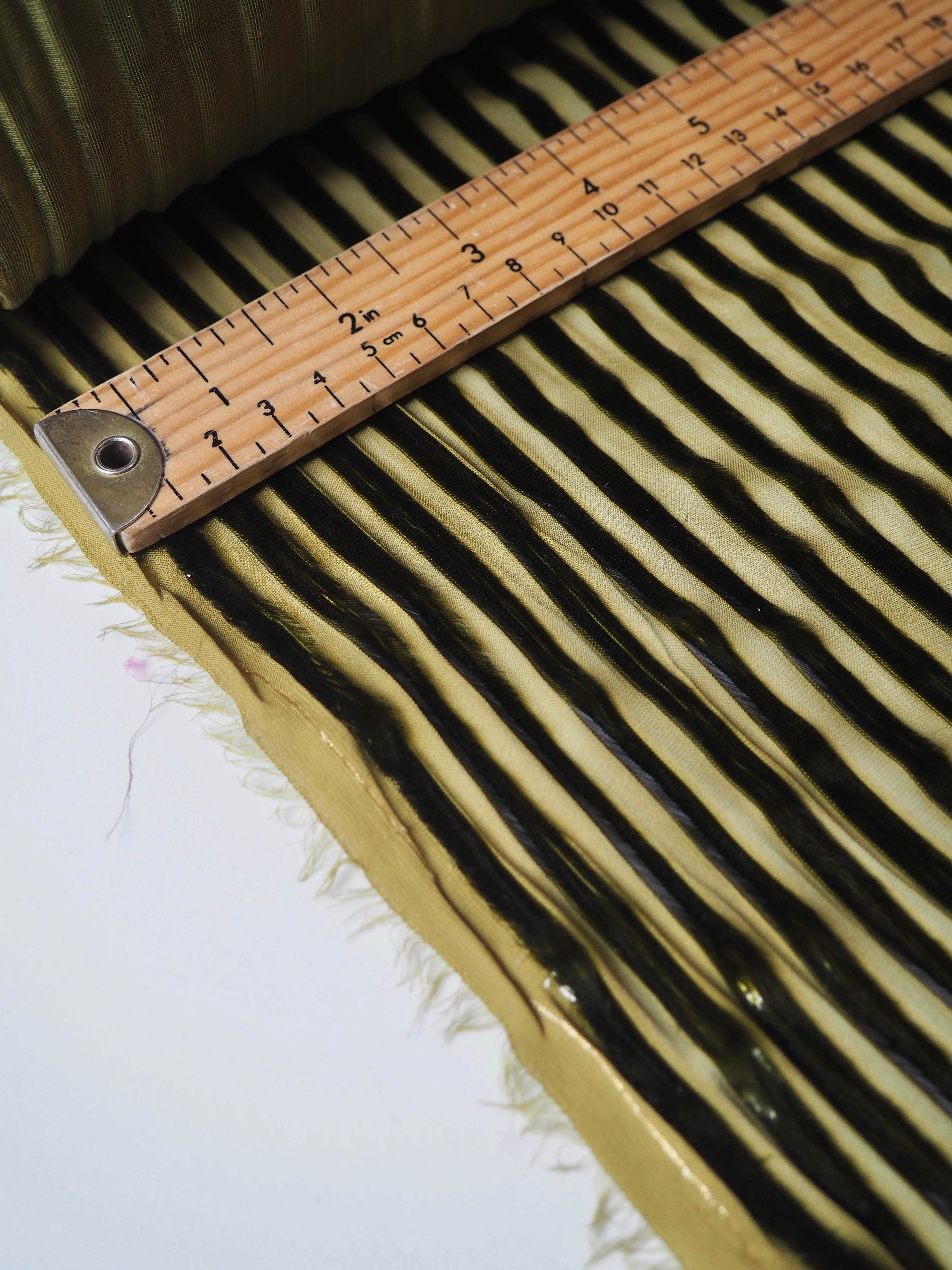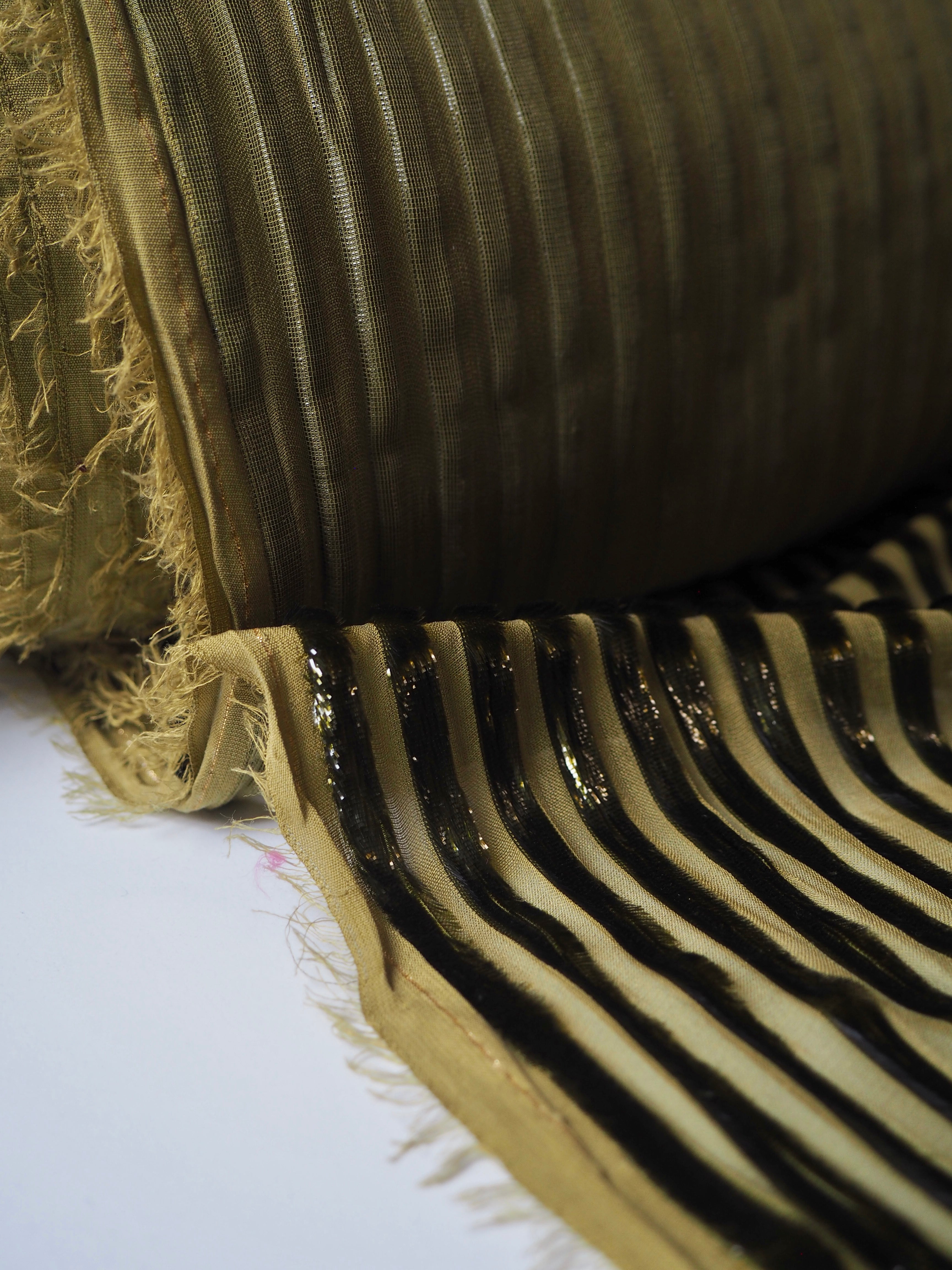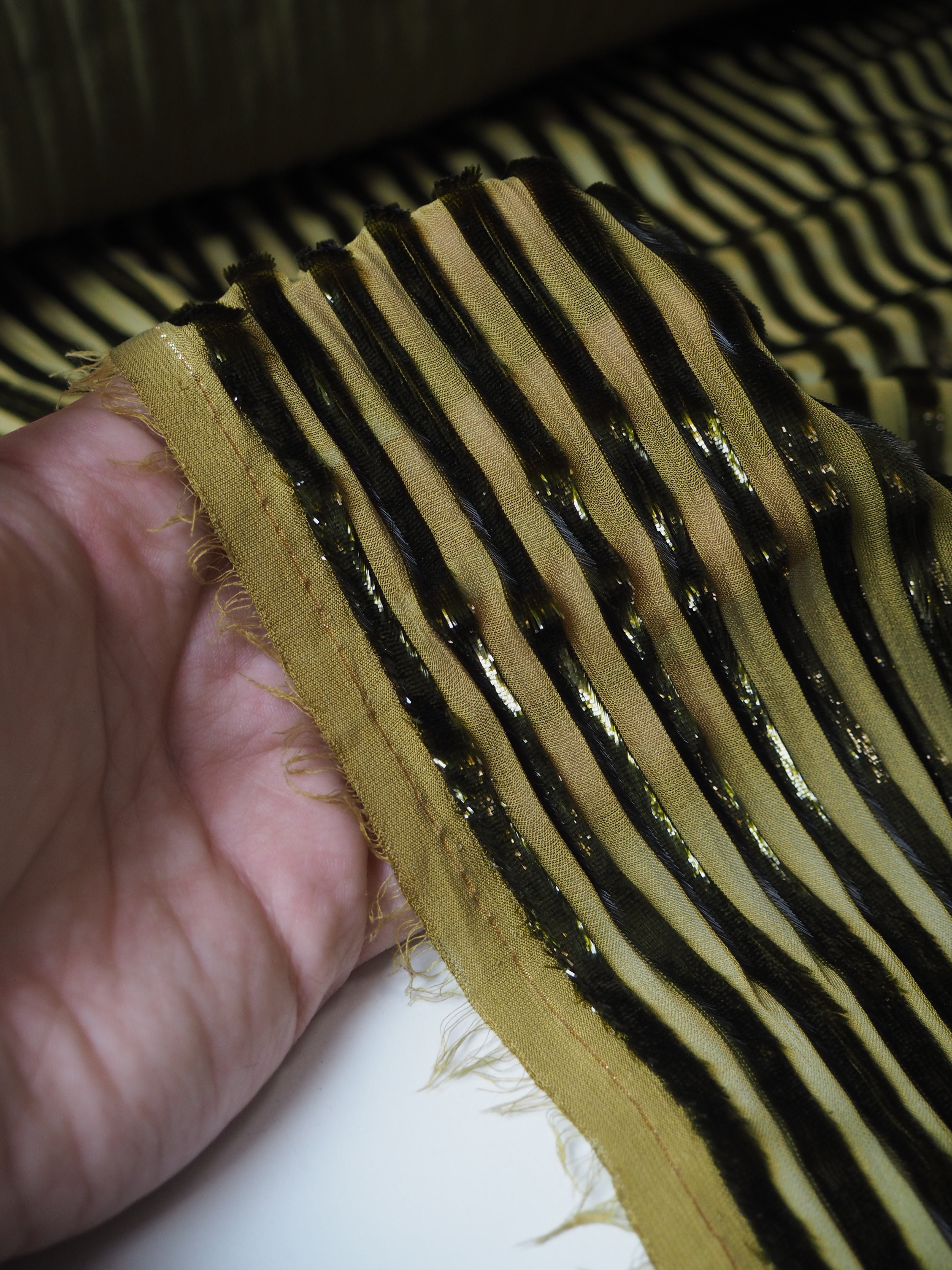 This ex-designer fabric is a unique chiffon. Olive metallic stripes are woven down the warp, with a sheer chiffon opposite. The stripes are in a fringe-y metallic fibre, almost mimicking velvet. It has such a luxurious look and handle! Amazing movement and so gorgeous in the light! Semi-sheer, with an incredible drape. Would look amazing as the overlay of a fancy dress!
