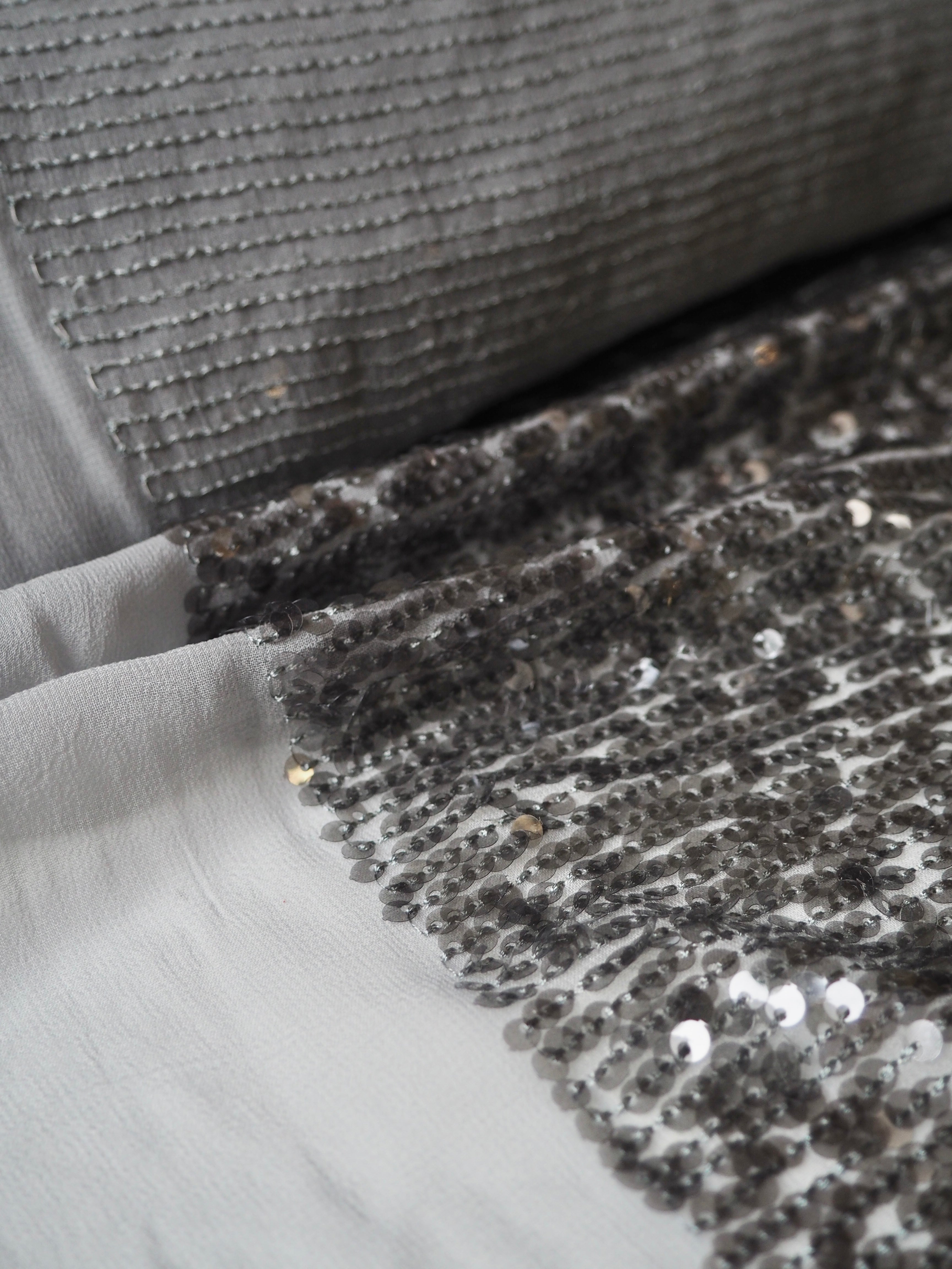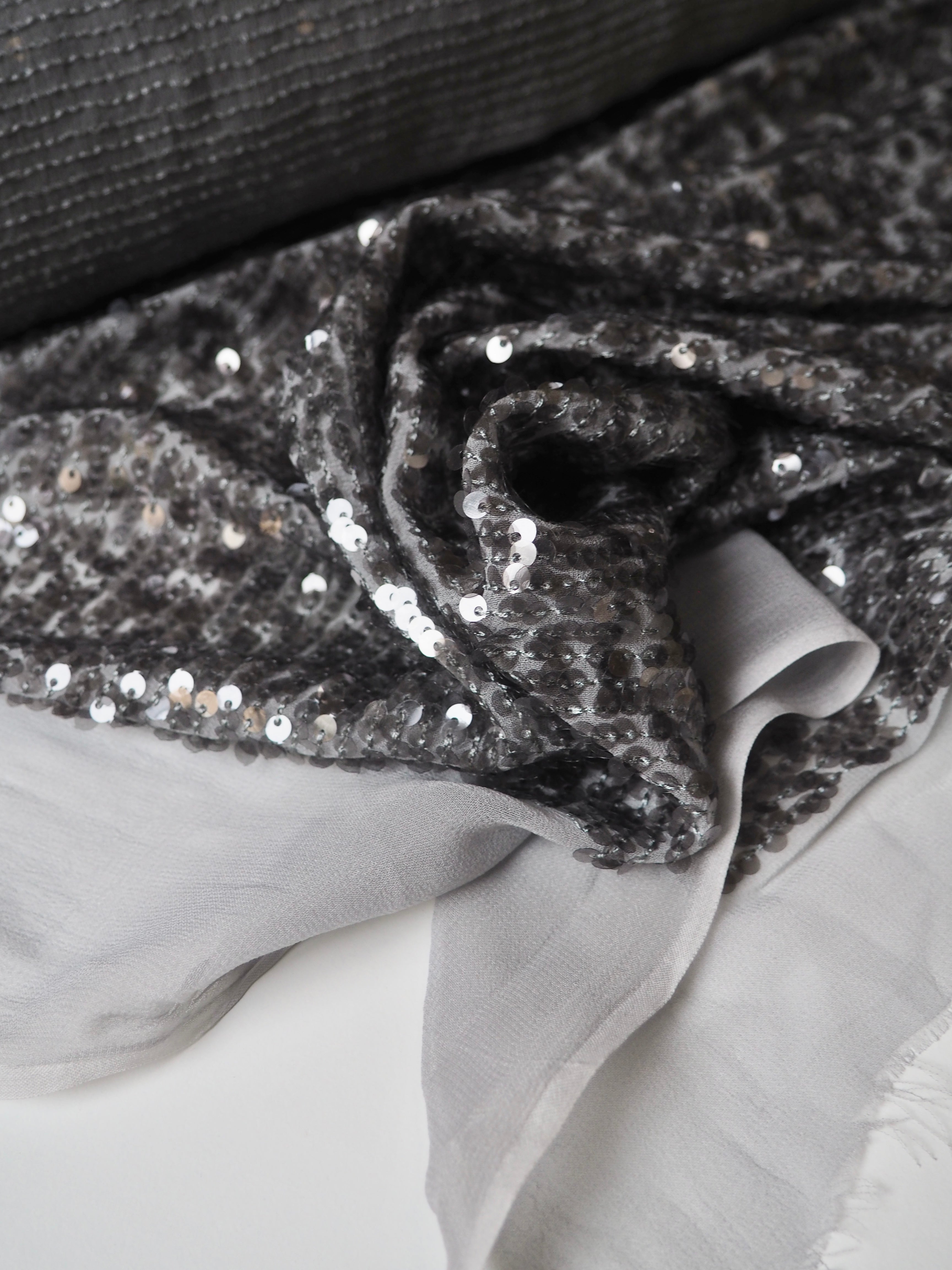 This ex-designer fabric is a sequin chiffon. Shiny grey sequins are woven onto this grey viscose chiffon. It has a luxurious look and handle, with great movement and a beautiful drape. Lightweight, most opaque, and eye-catching. Has a nice gentle handle. Would be perfect for a party dress or skirt!