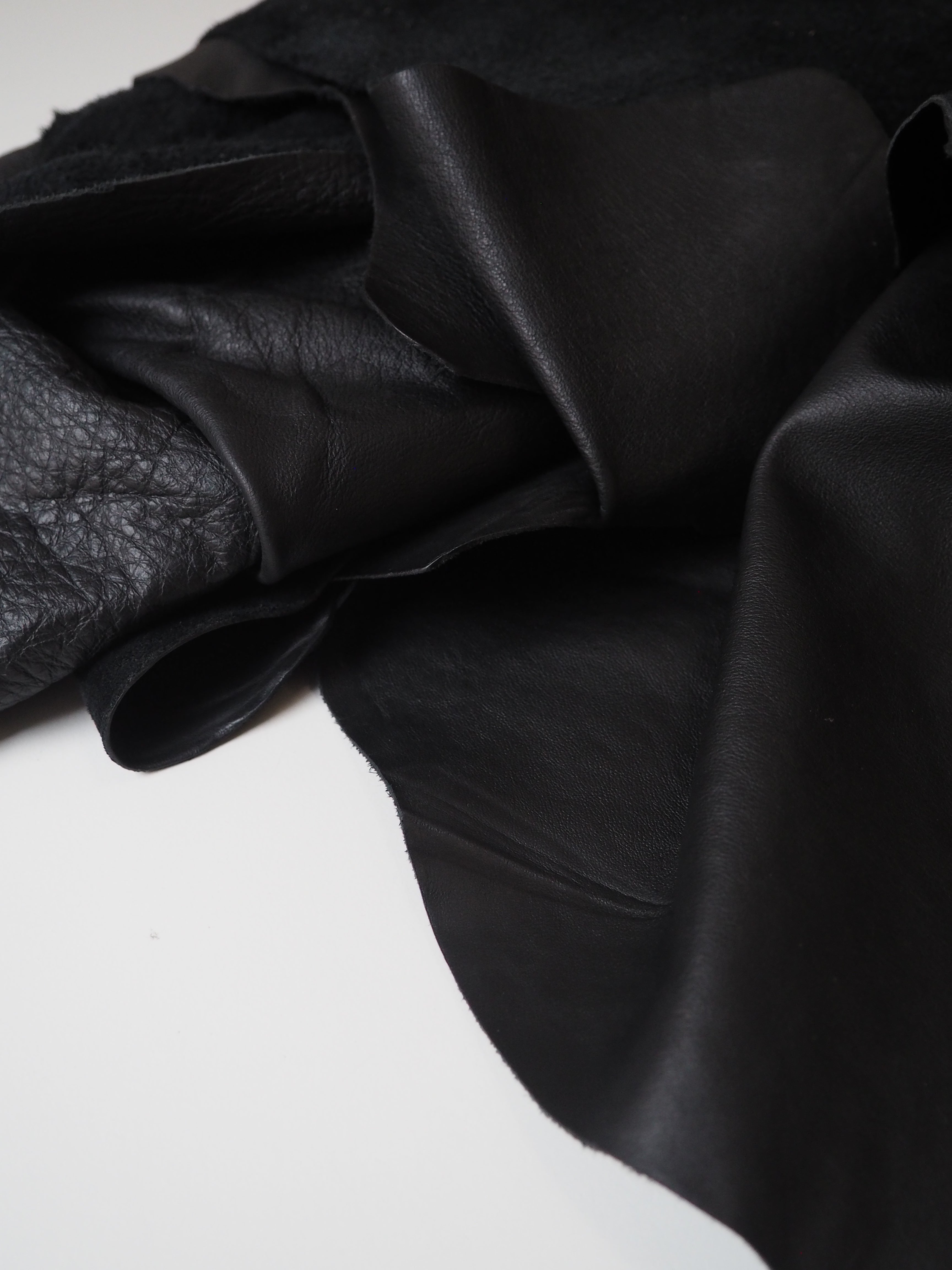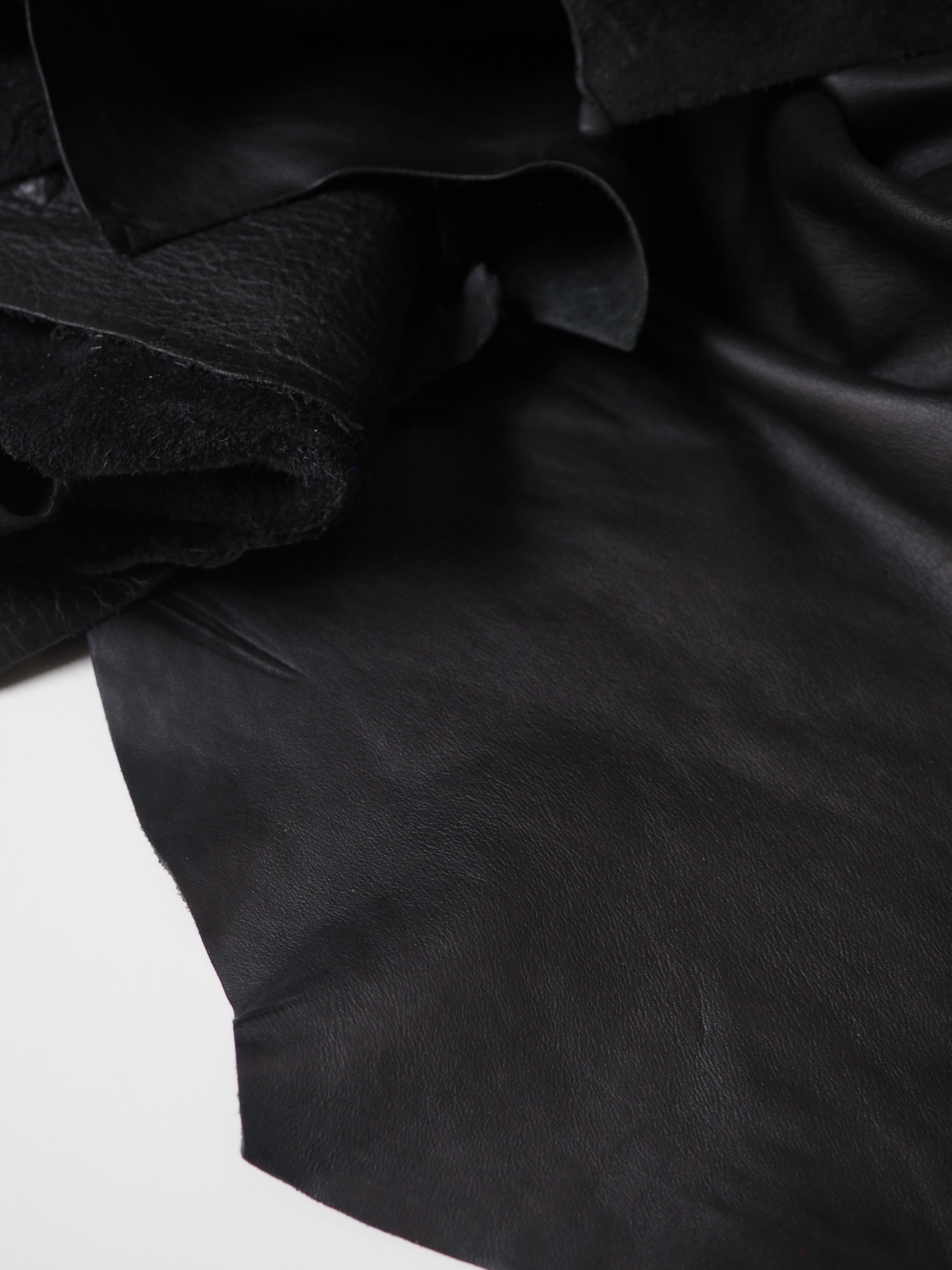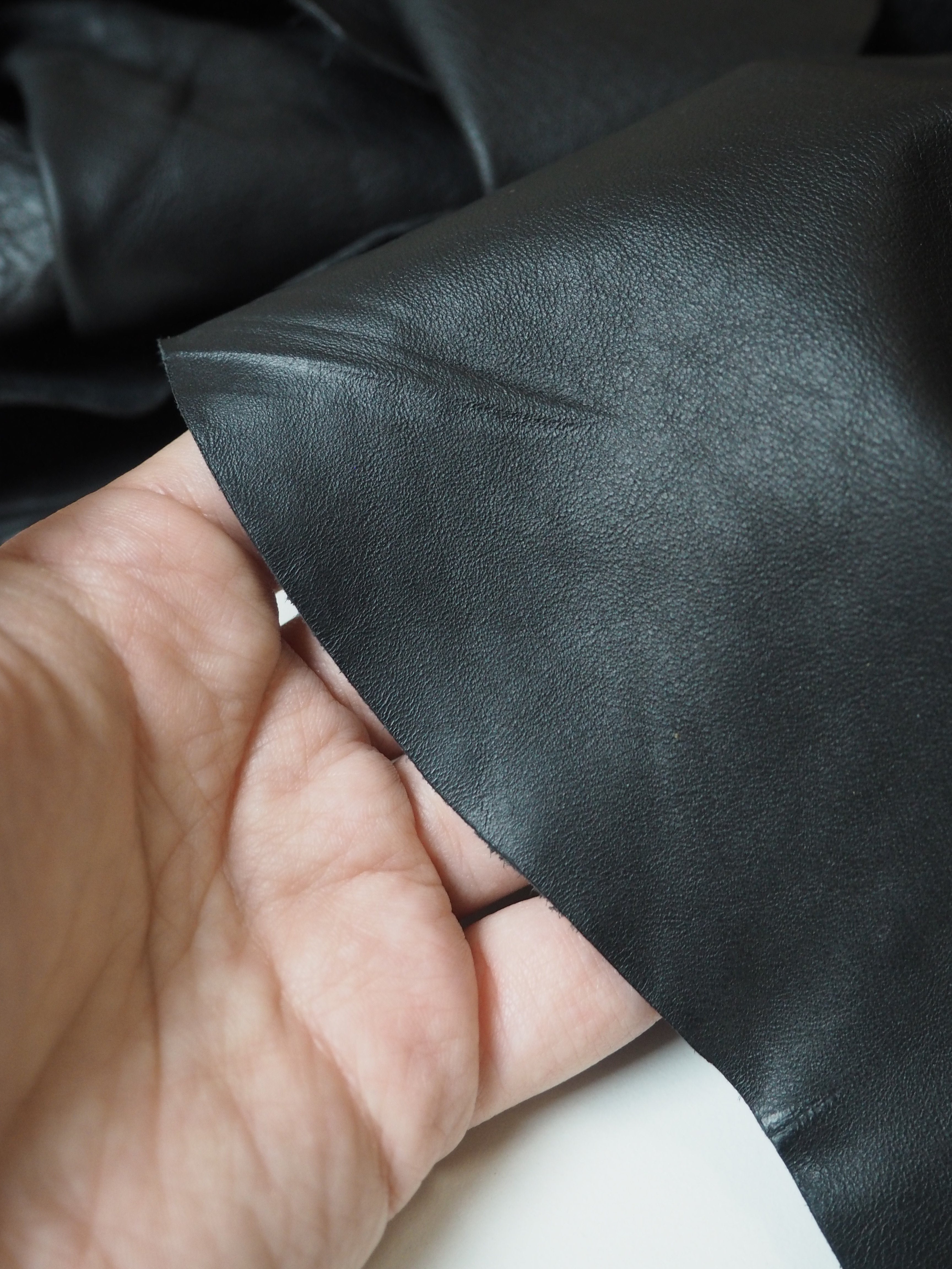 This ex-designer leather is a calfskin. It's a smooth and supple leather with a more natural finish. It has a soft handle, and nice light weight. Drapes nicely with a slight structure. In a true black colour. We would love to see this made up into a jacket!
