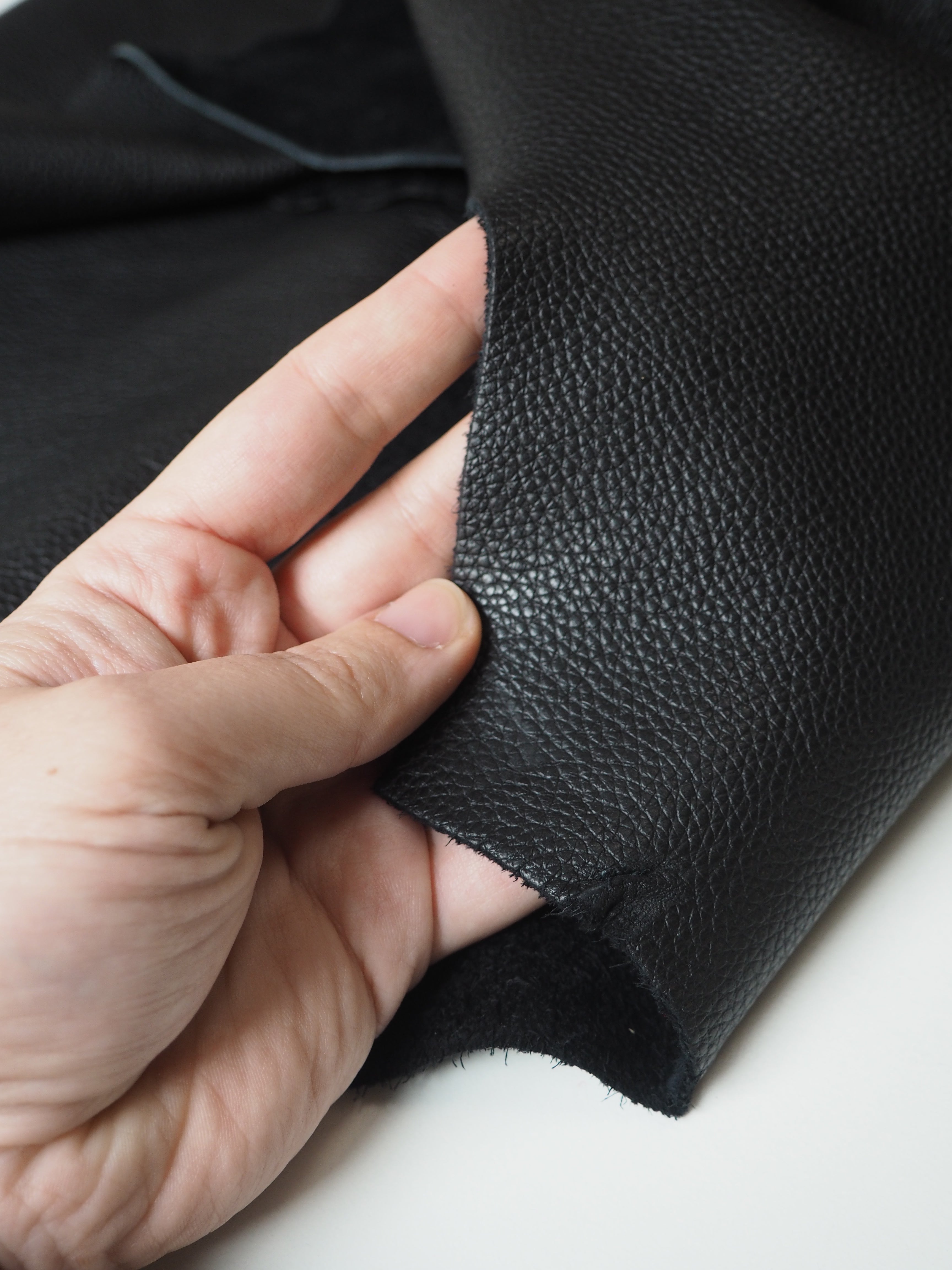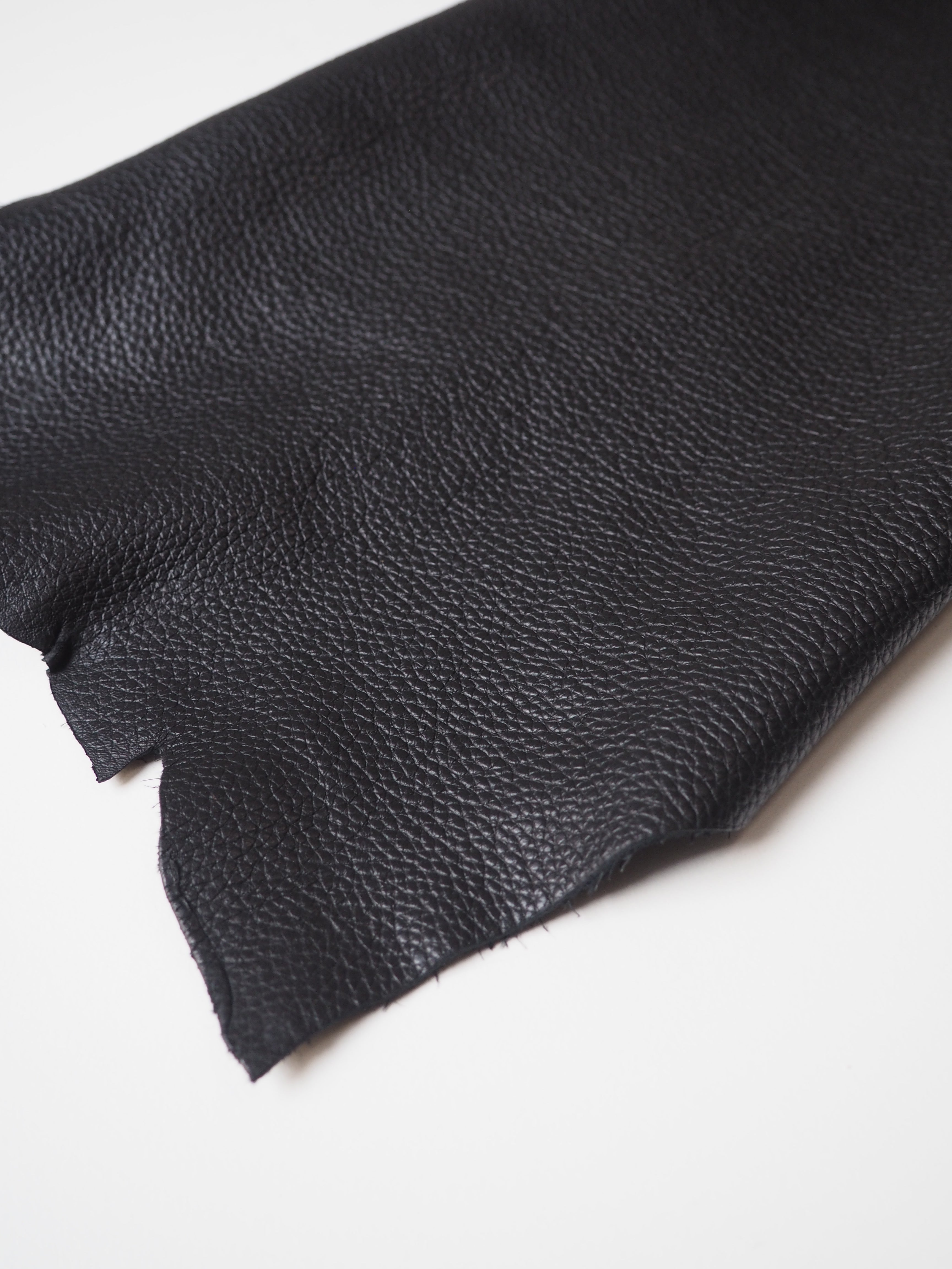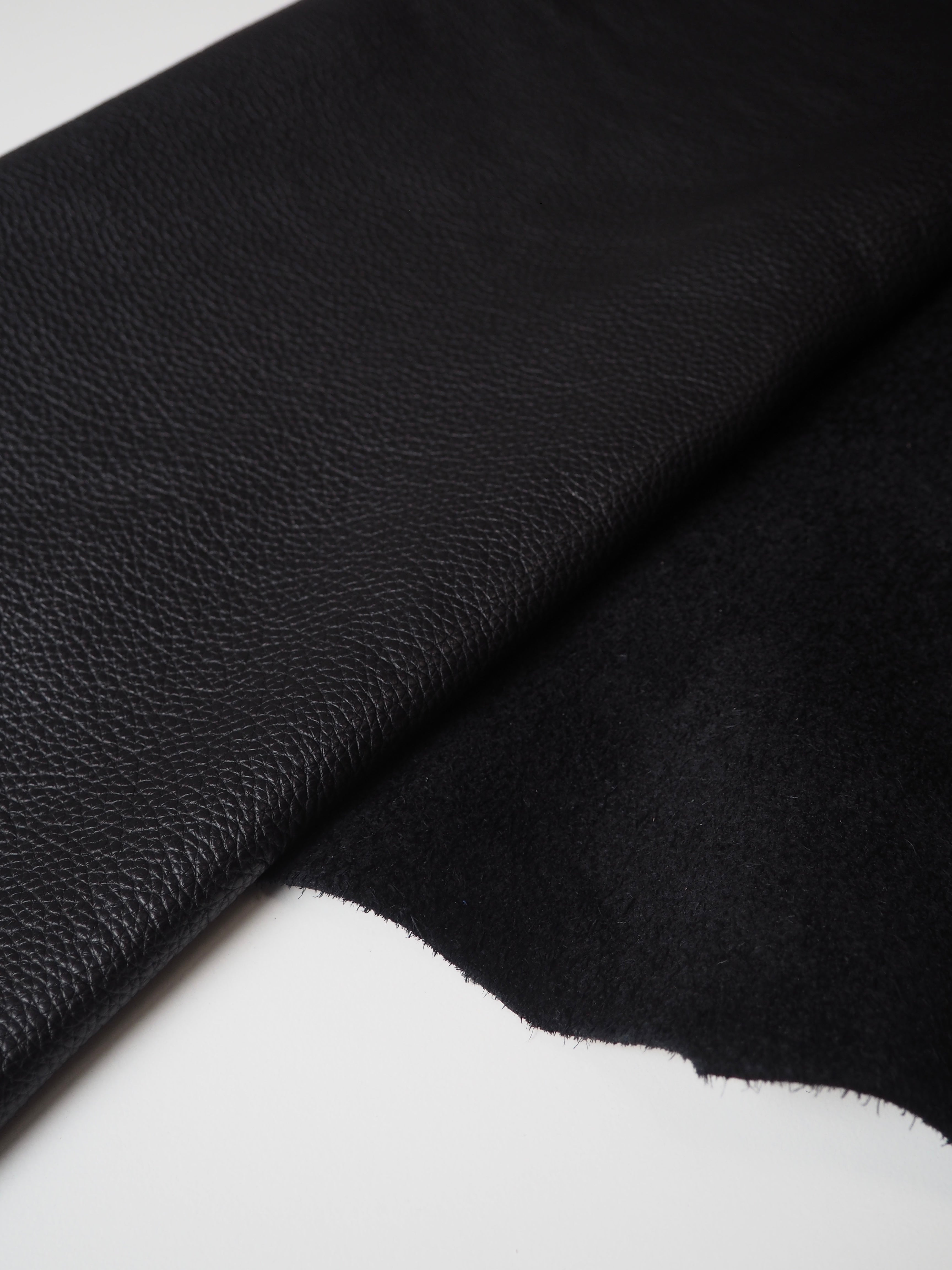 This ex-designer leather is a calfskin. It's a top grain leather with a pebbled finish, a sturdy handle, and nice medium to heavy weight. In a rich black colour. We would love to see this made up into a bag or purse!