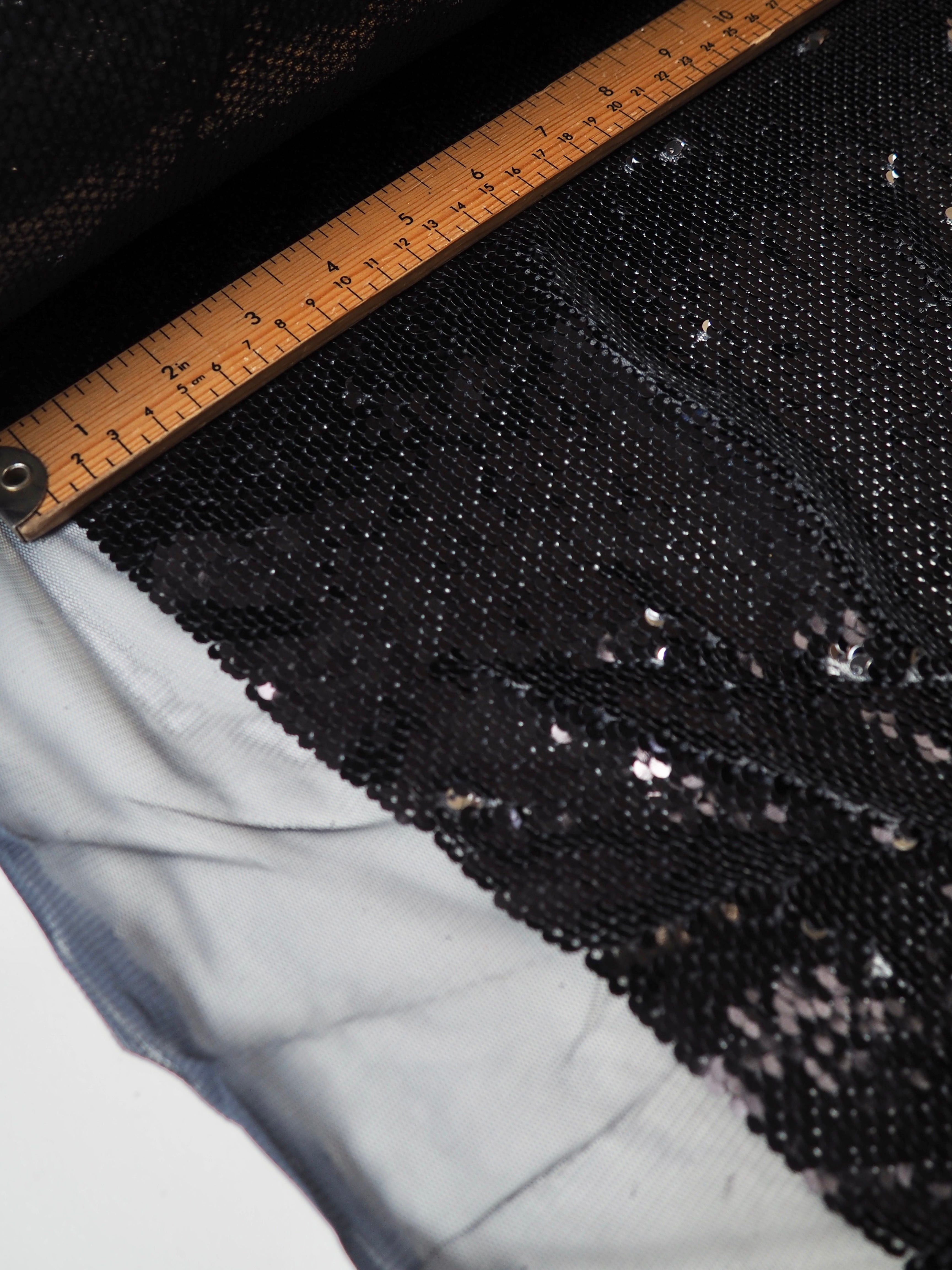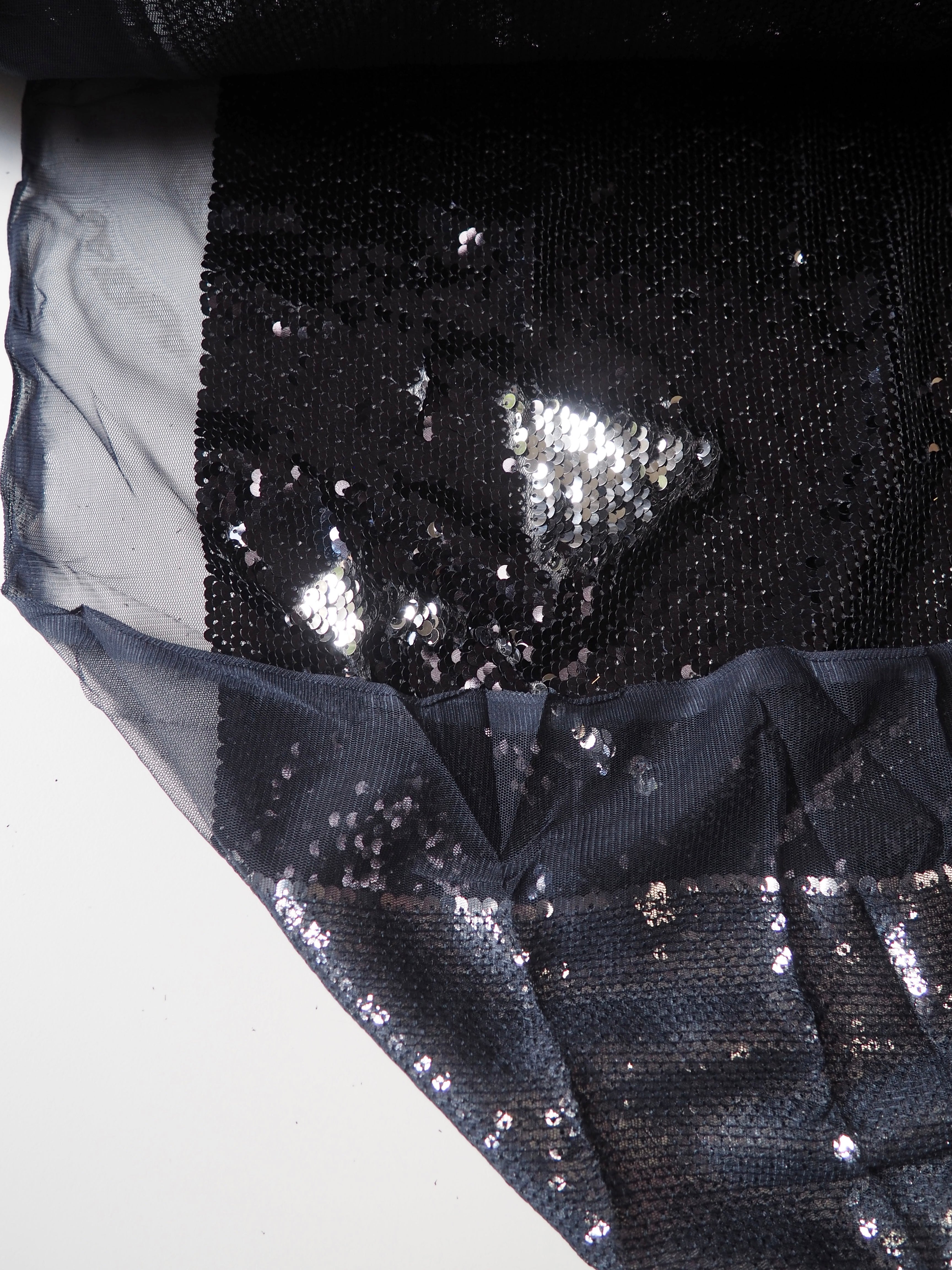 This ex-designer fabric is a sequin tulle. Shiny navy sequins with silver backs are woven into this navy tulle with eye-catching sheen and great movement in the light! It has a mermaid effect so you can pull the sequins either way for the desired effect. Medium to heavy weight and a good drape, and fuller coverage sequins. This fabric would be perfect for a party dress or skirt!