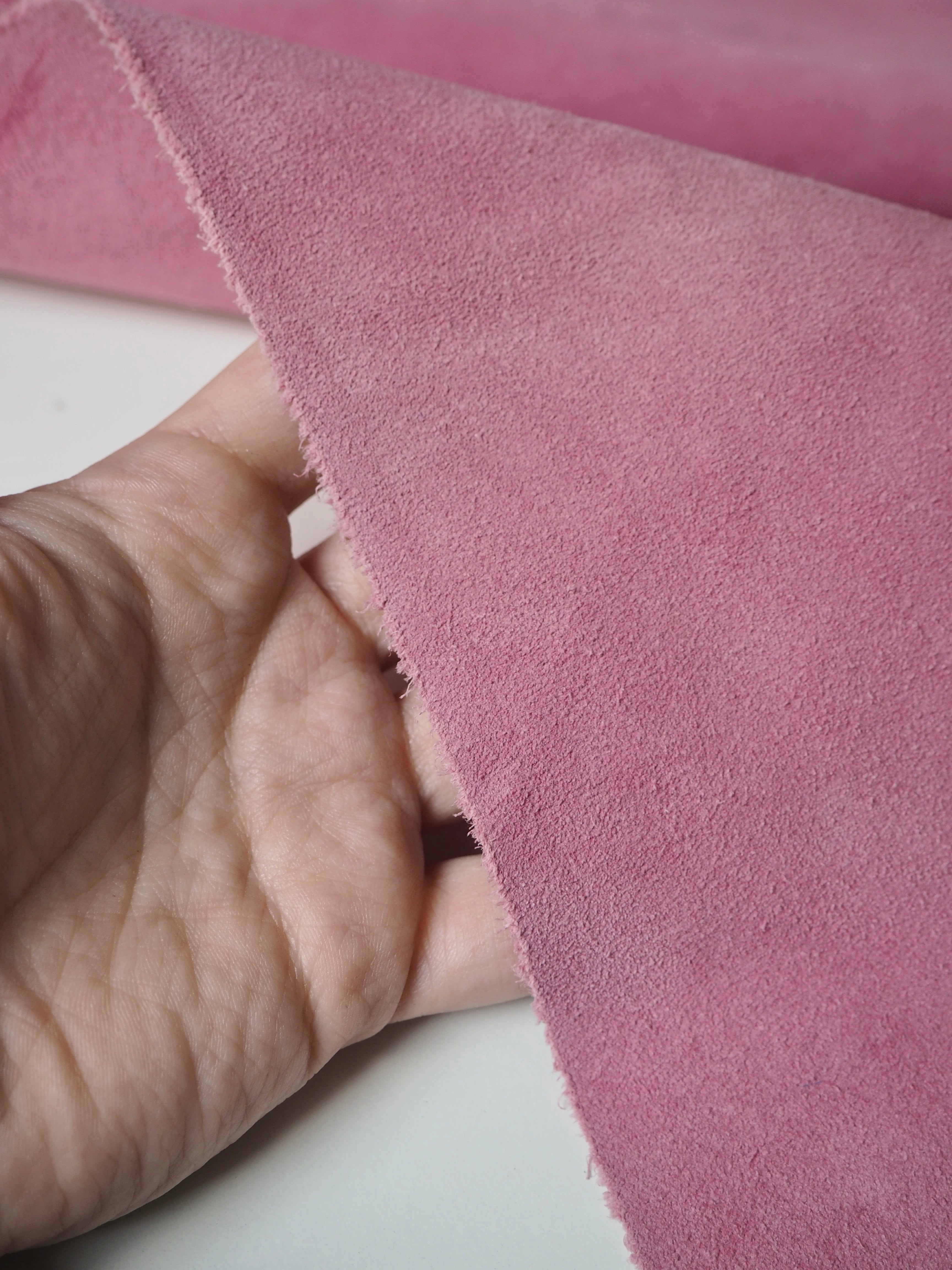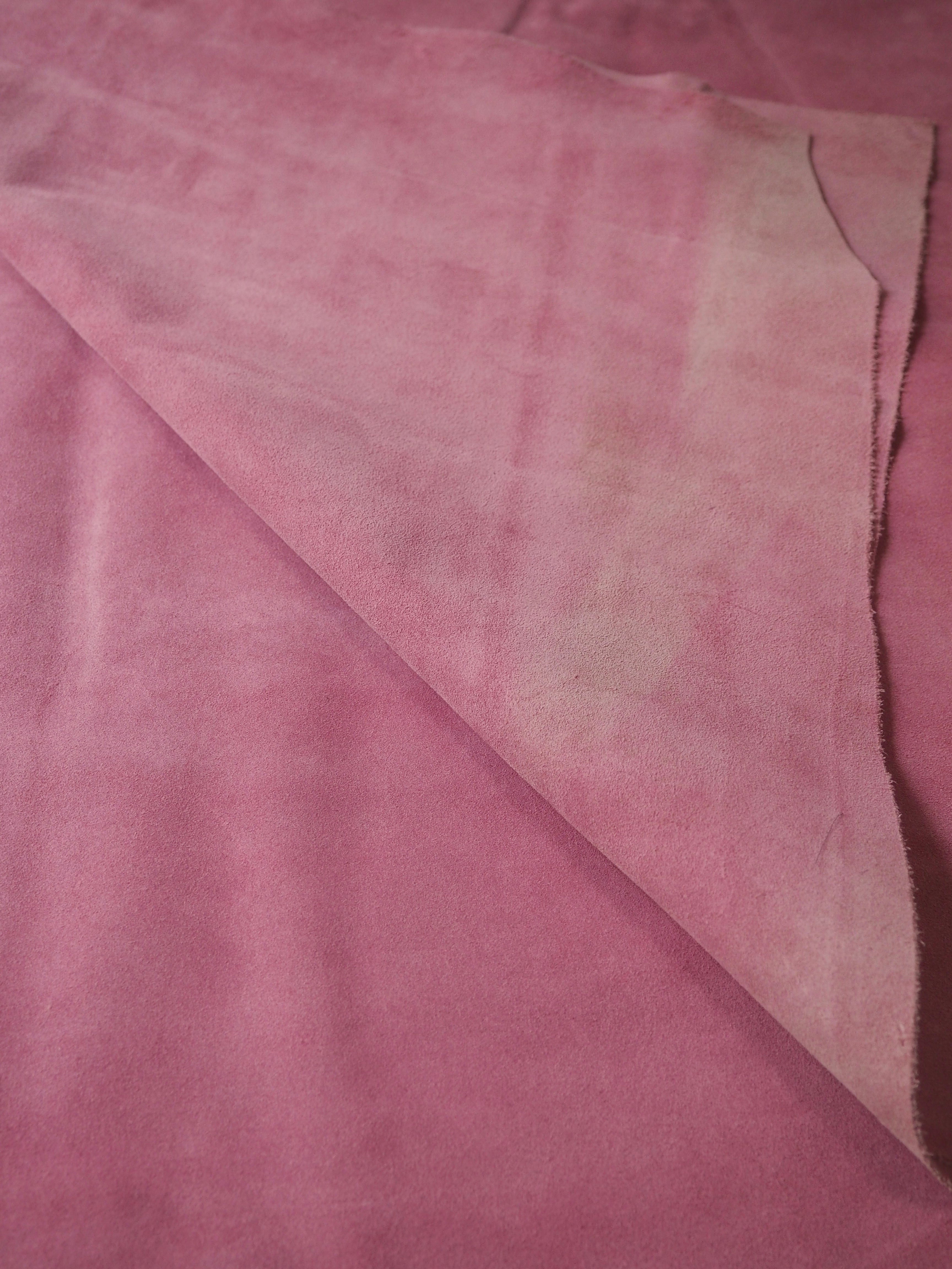 This ex-designer leather is a calfskin. It's a sueded finish, that is very soft and has a nice medium drape. It's light to medium weight. We would love to see this made up into a bag or purse! This leather has some marks outside the measured area.