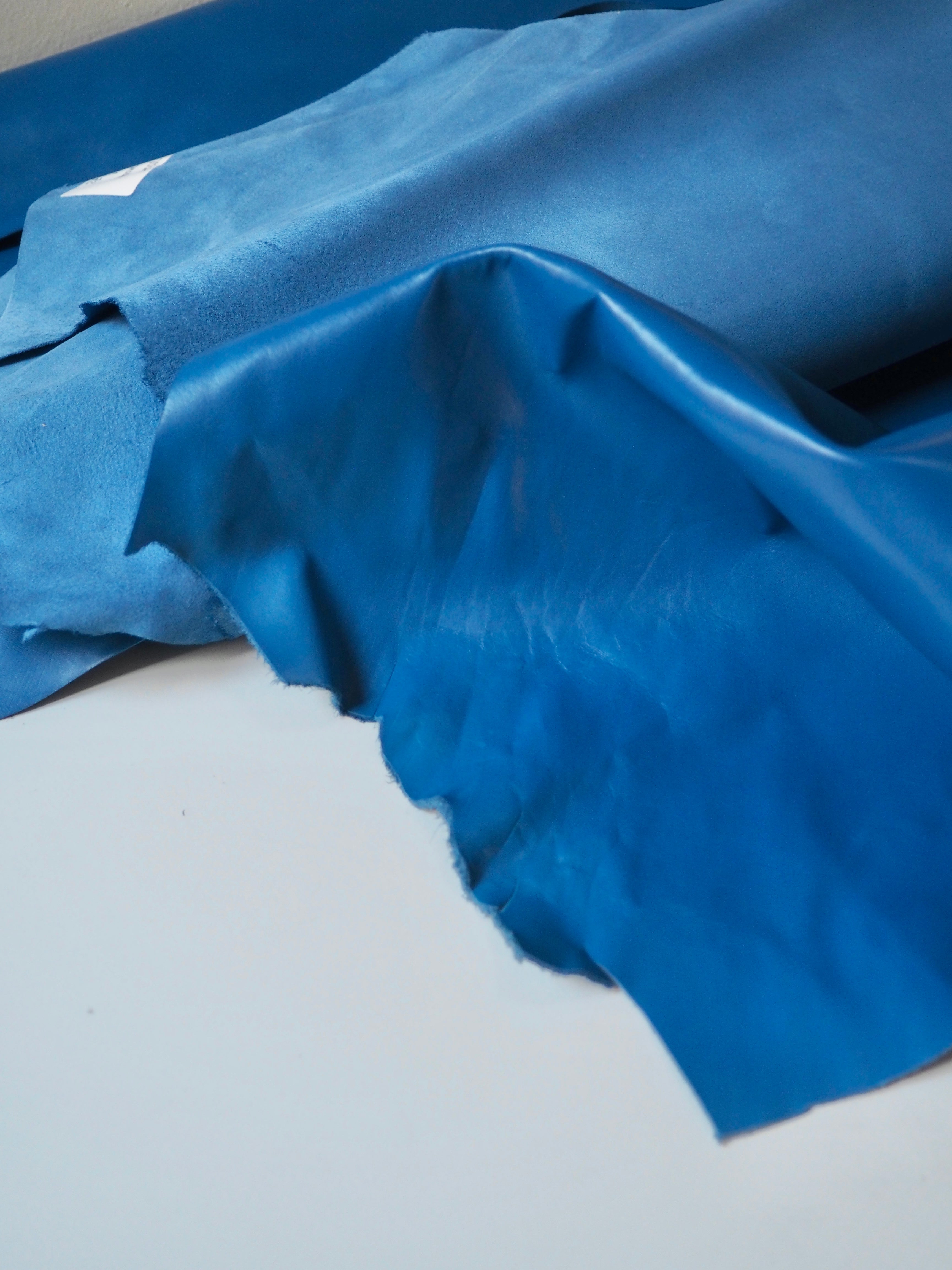 This ex-designer leather is a calfskin. It's a smooth leather with a shiny finish, a crisp handle, and light to medium weight. Has a great structure, in a medium caramel brown colour. We would love to see this made up into a bag or purse!