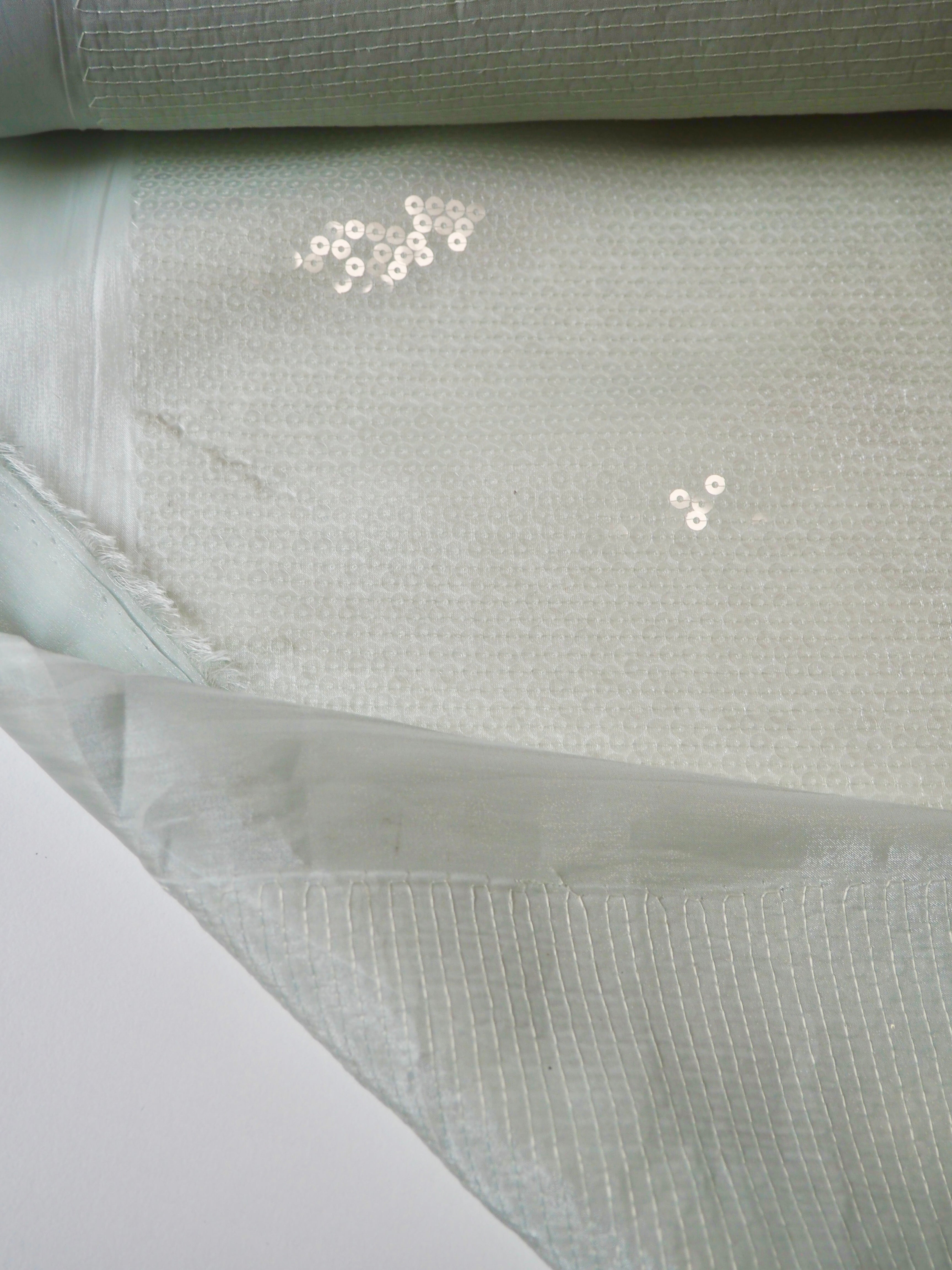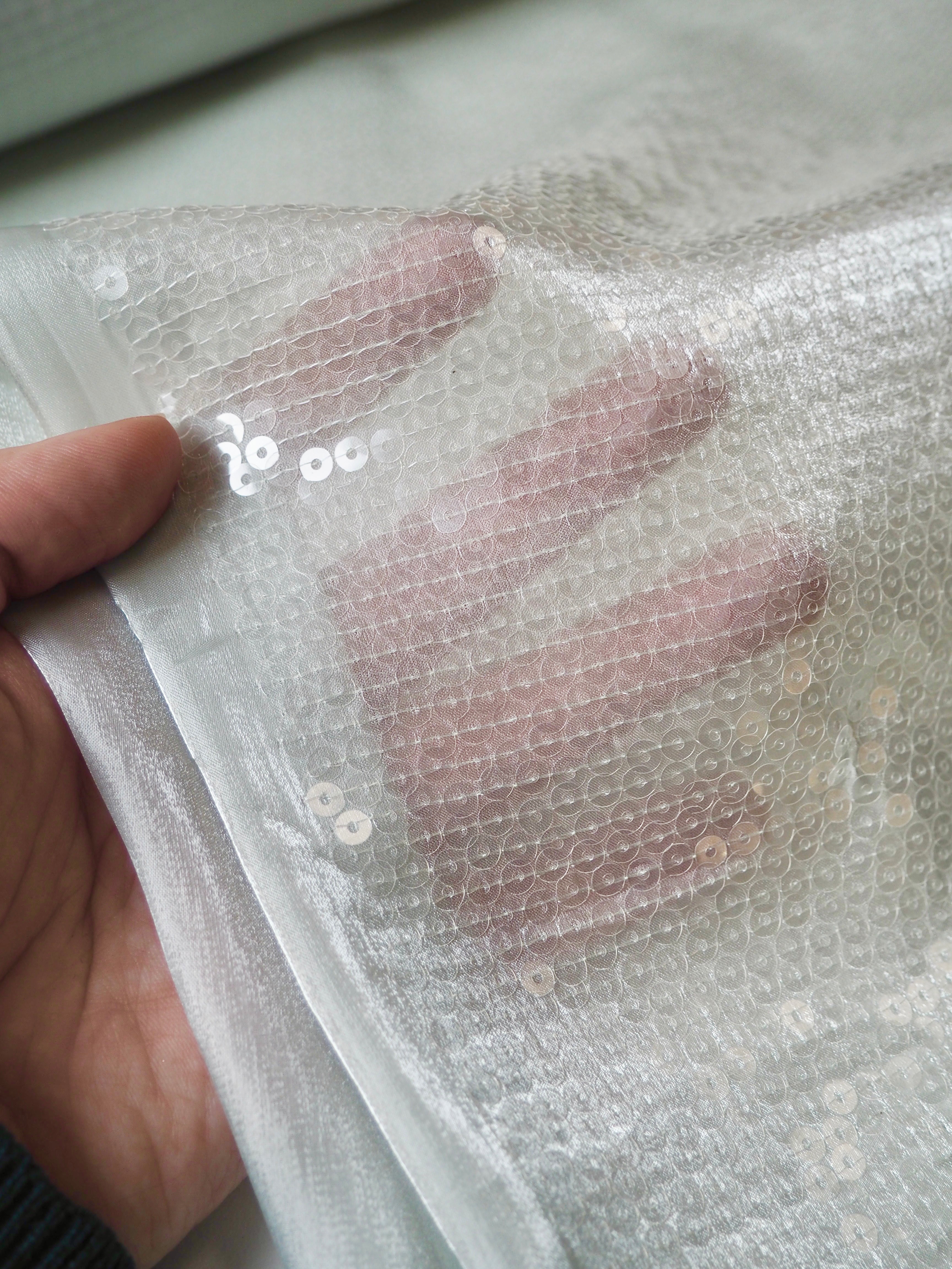 This ex-designer fabric is a sequin organza. Shiny clear sequins are woven in stripes onto this light-shifting sea glass green organza. It's really unique, with great movement and a beautiful drape. Lightweight, semi-sheer, and mesmerizing! Has a nice gentle handle. Would be perfect for a party dress or skirt!