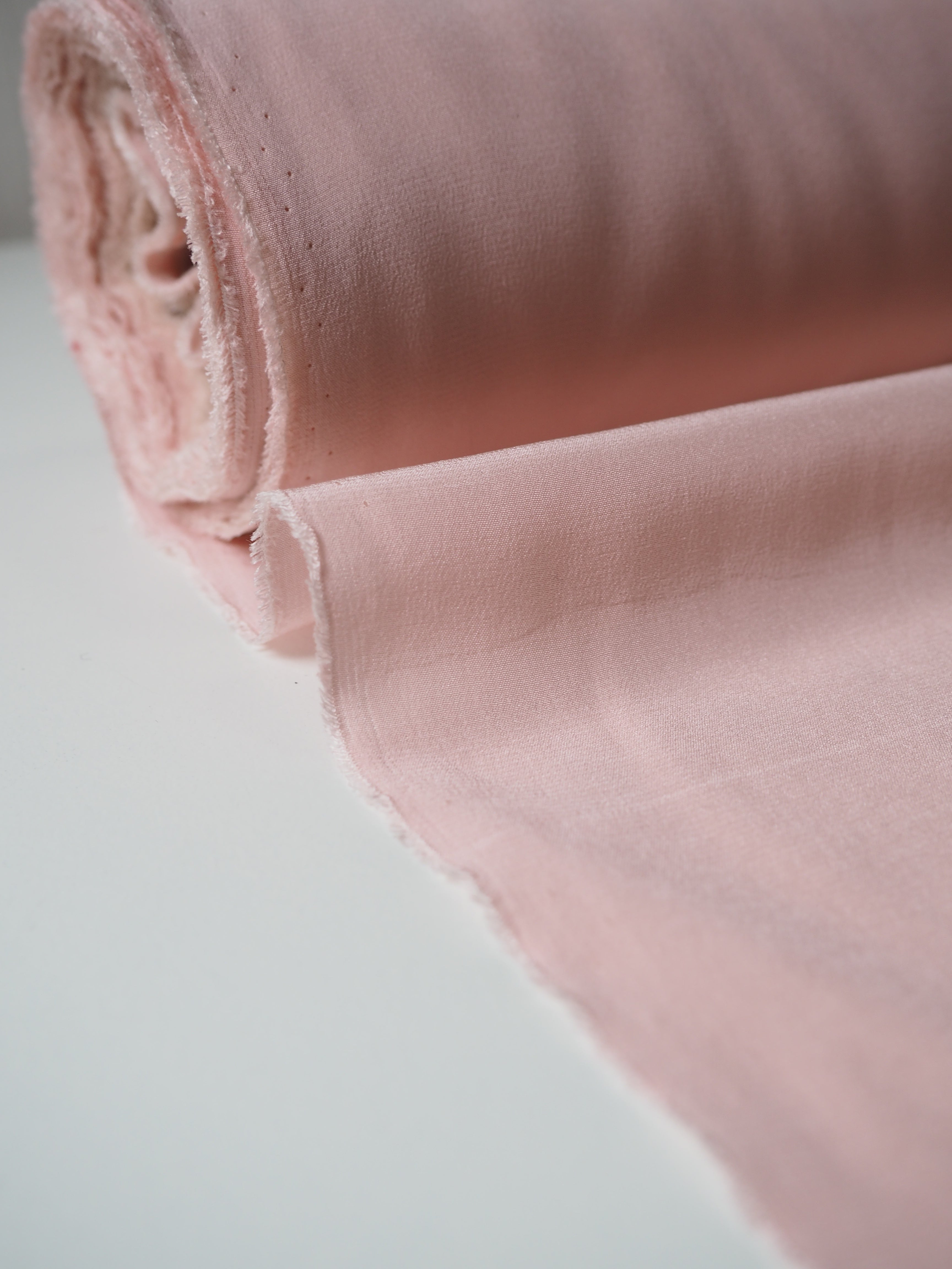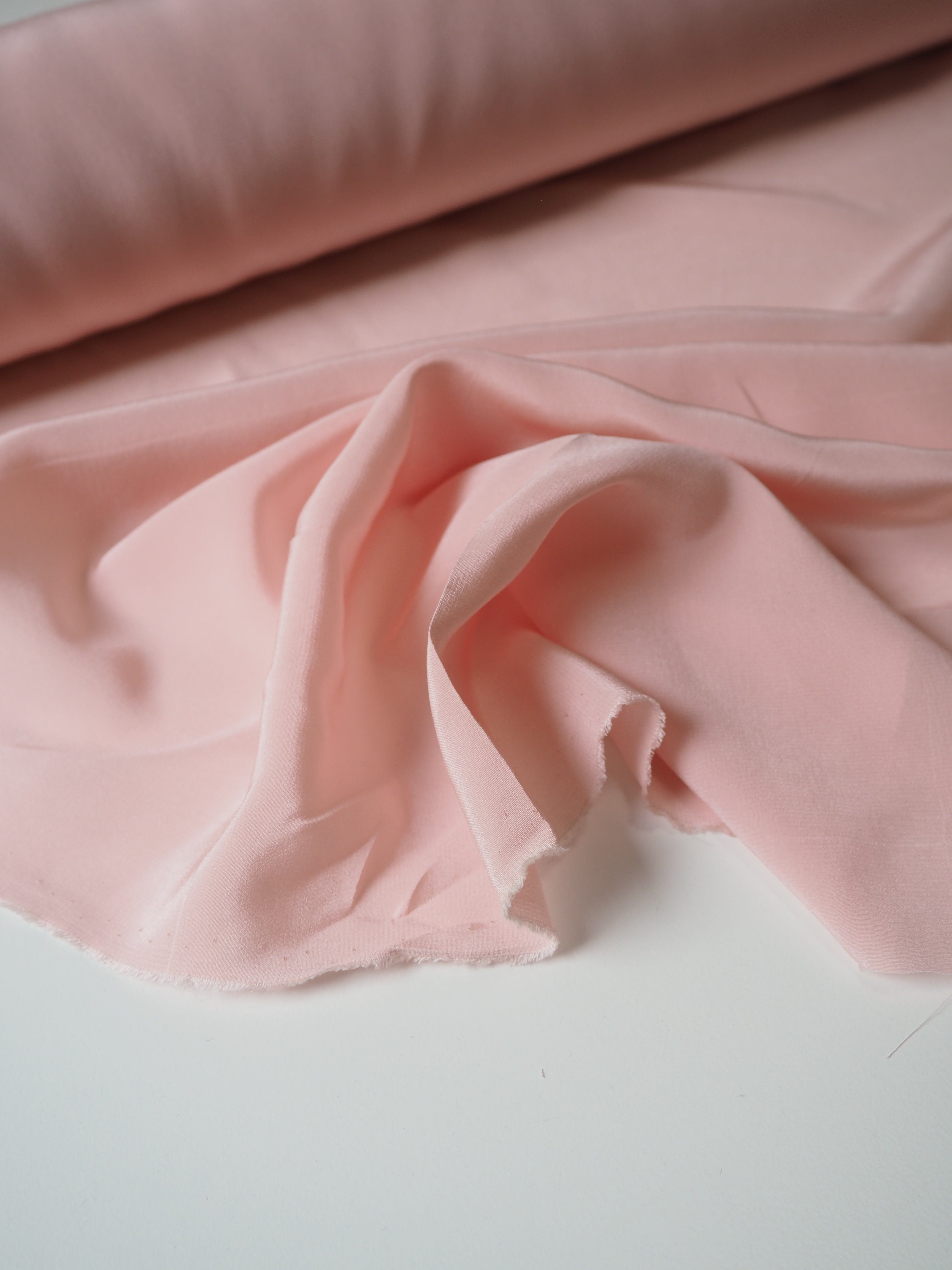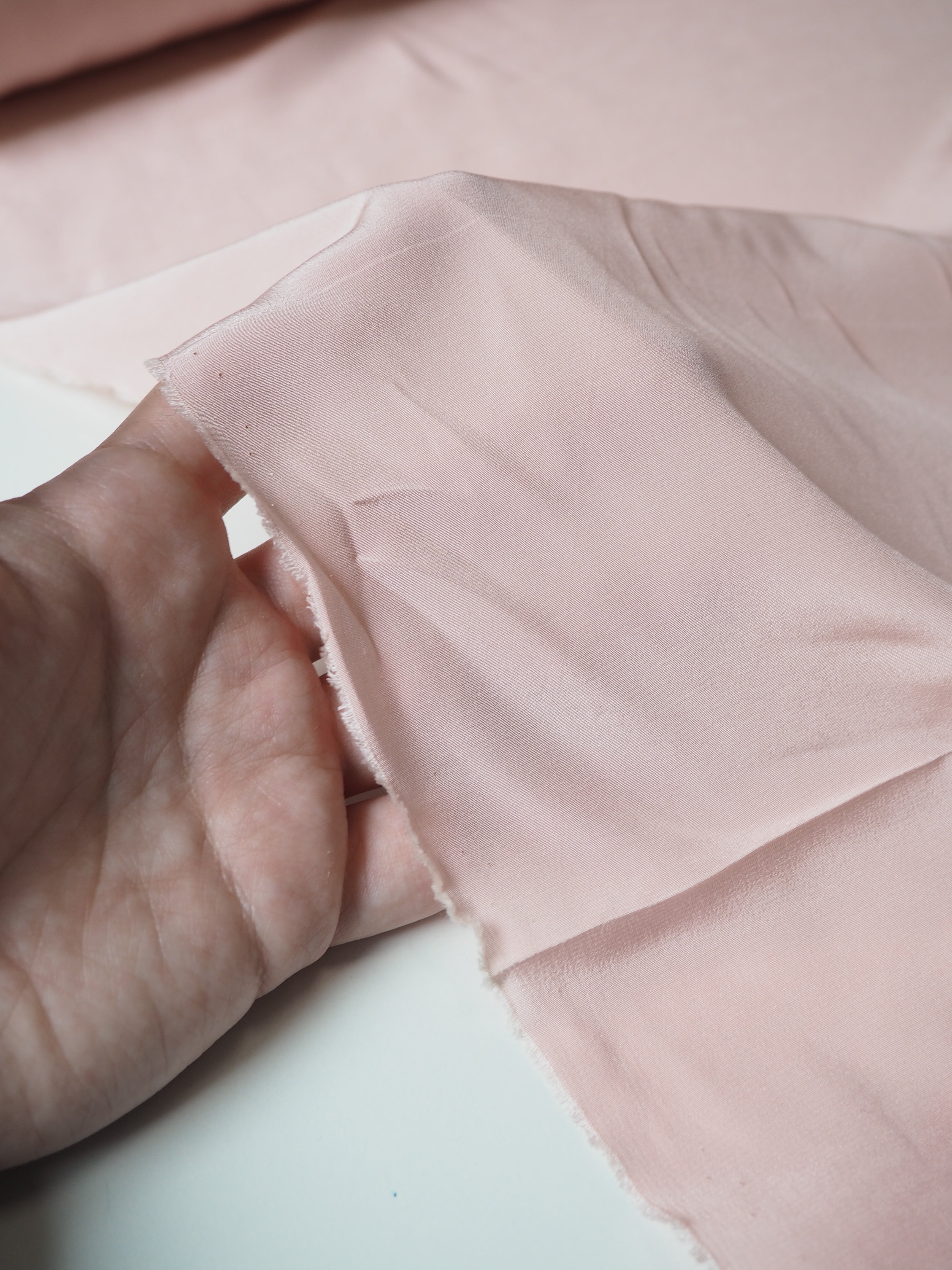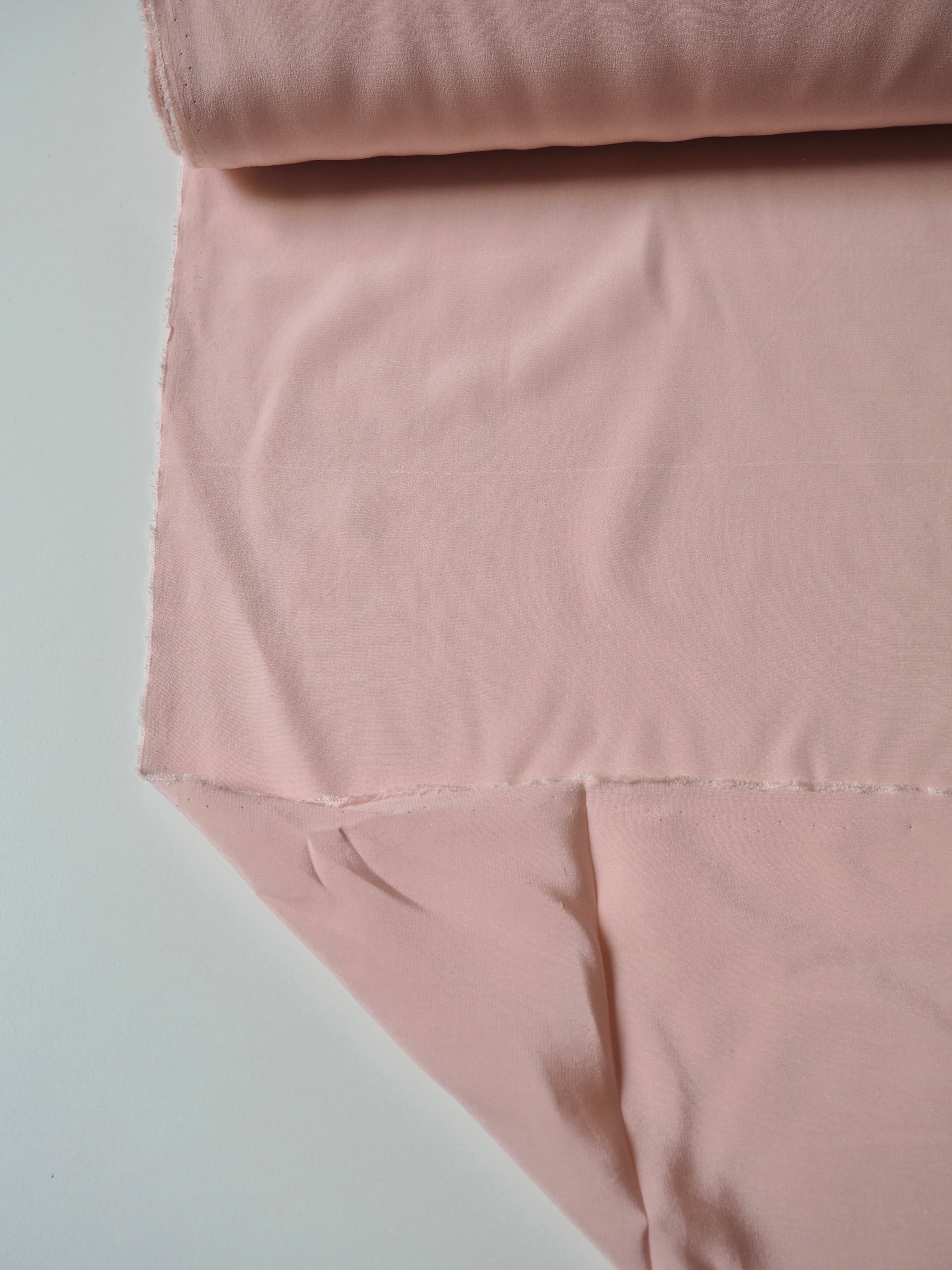This ex-designer fabric is a silk crepe de chine. It has the characteristic gentler crepe texture but is still very soft and lightweight. It's very drapey and has fantastic movement. Almost fully opaque. Has a wonderful silky handle! Would be perfect for a lining in dresses, skirts, blazers, or for a lovely basic button down blouse!