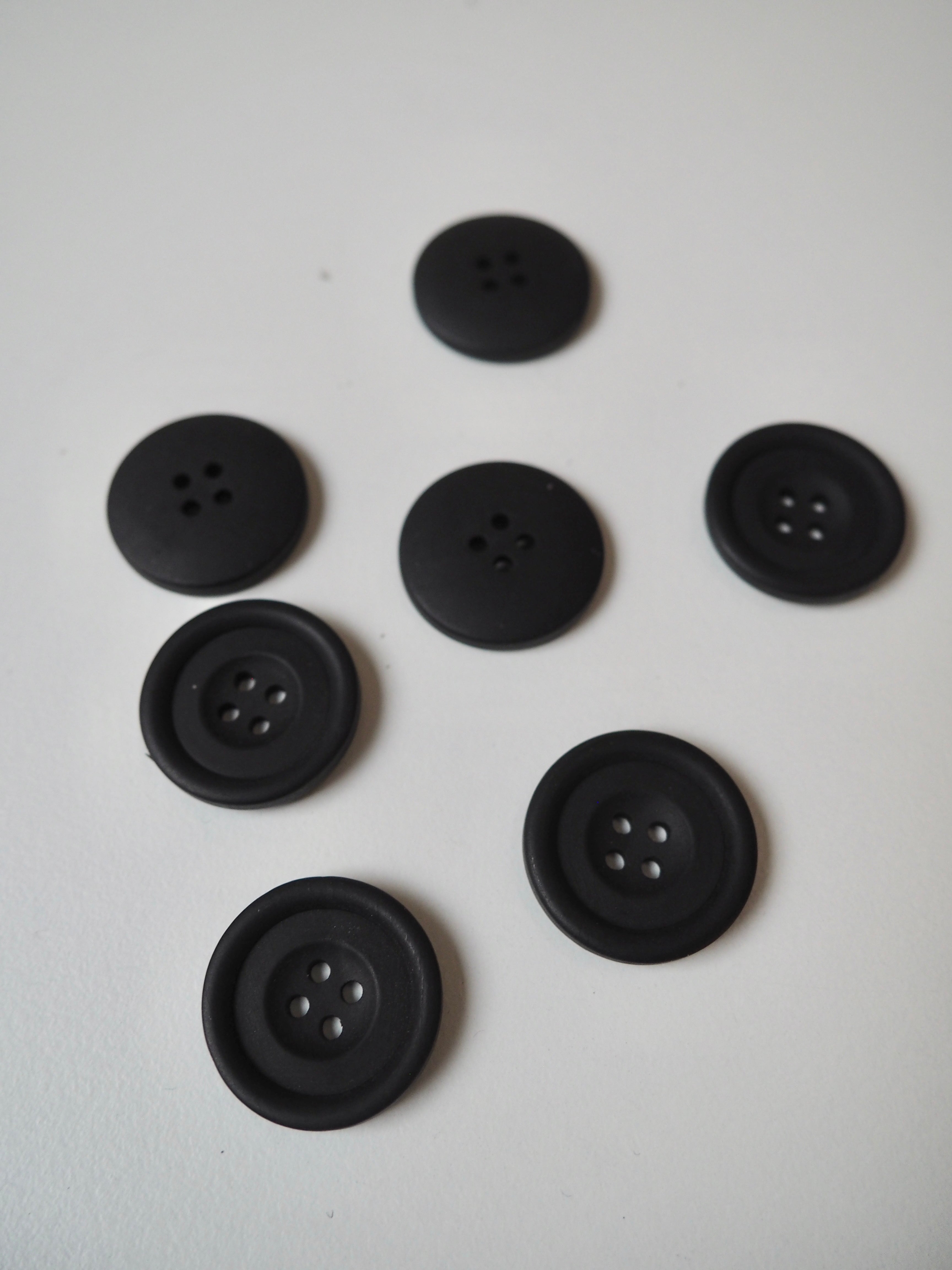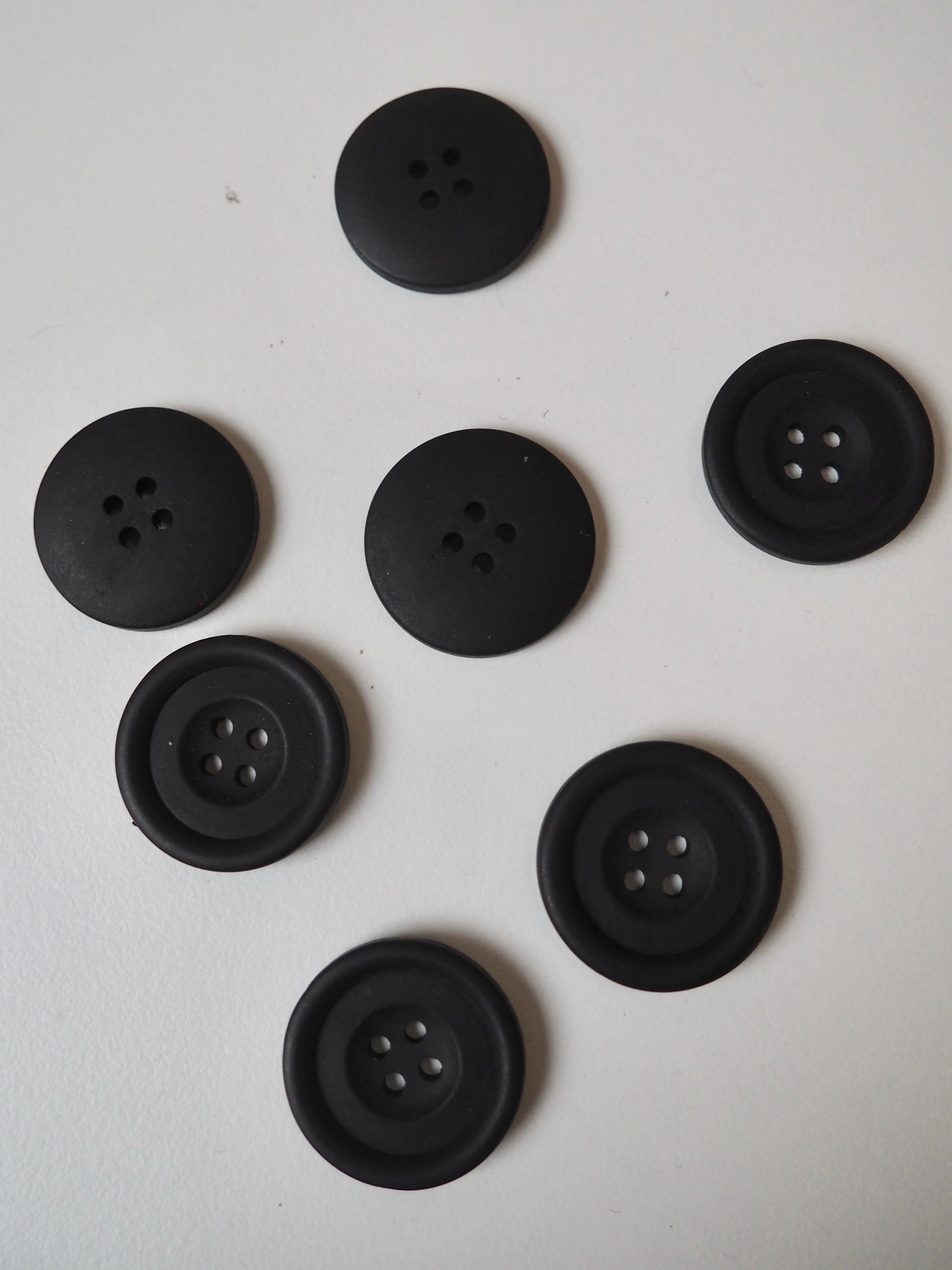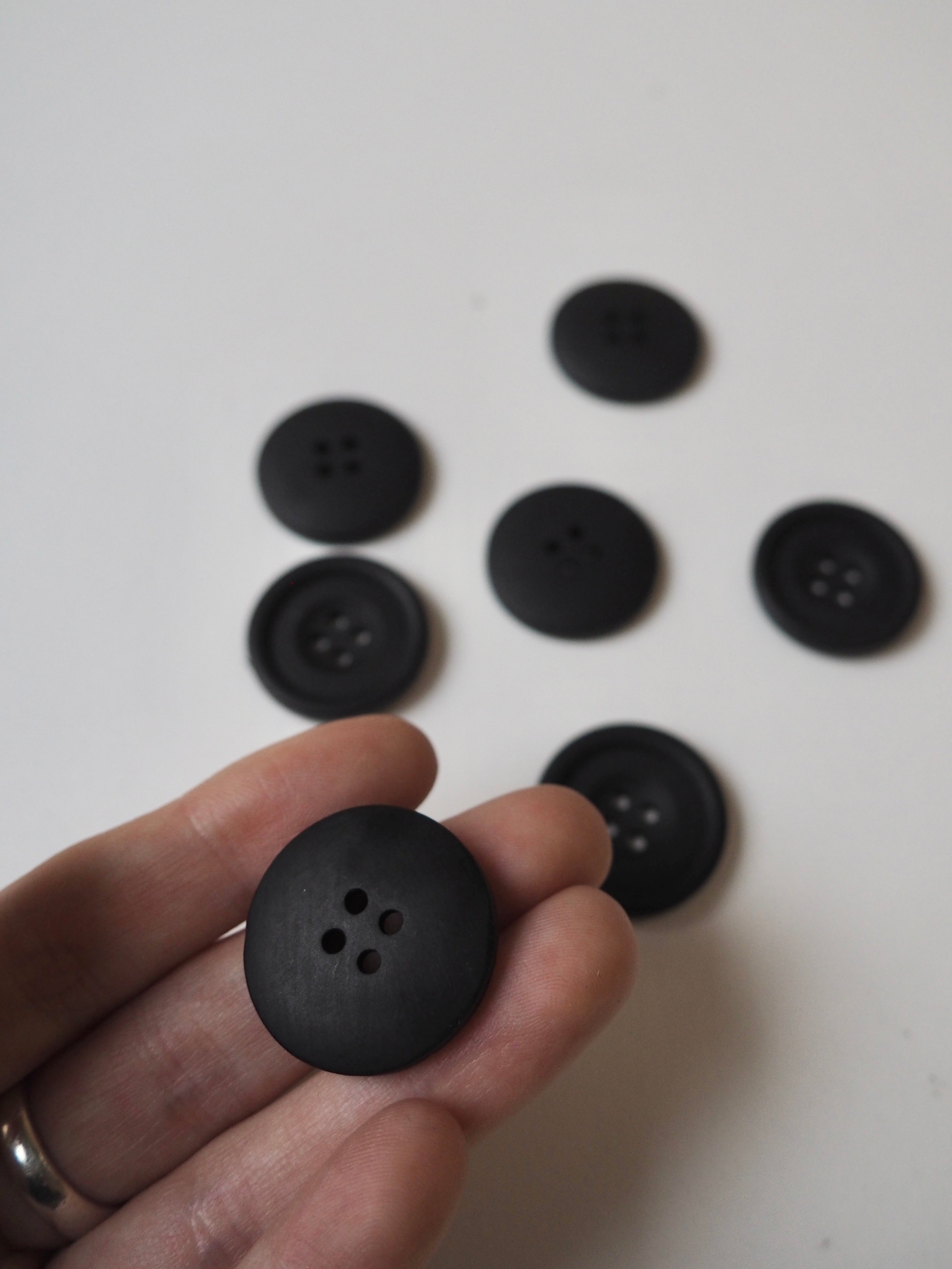 This ex-designer trim are black corozo buttons, 4-hole with a rimmed edge and an indented centre. Corozo is a sustainable alternative to traditional horn or plastic buttons. Made from the nuts of the Tagua Palm, corozo buttons are completely natural and biodegradable. They can be dyed many different colours and have a lovely wood-like grain. Perfect size for coats, jackets and cardigans.