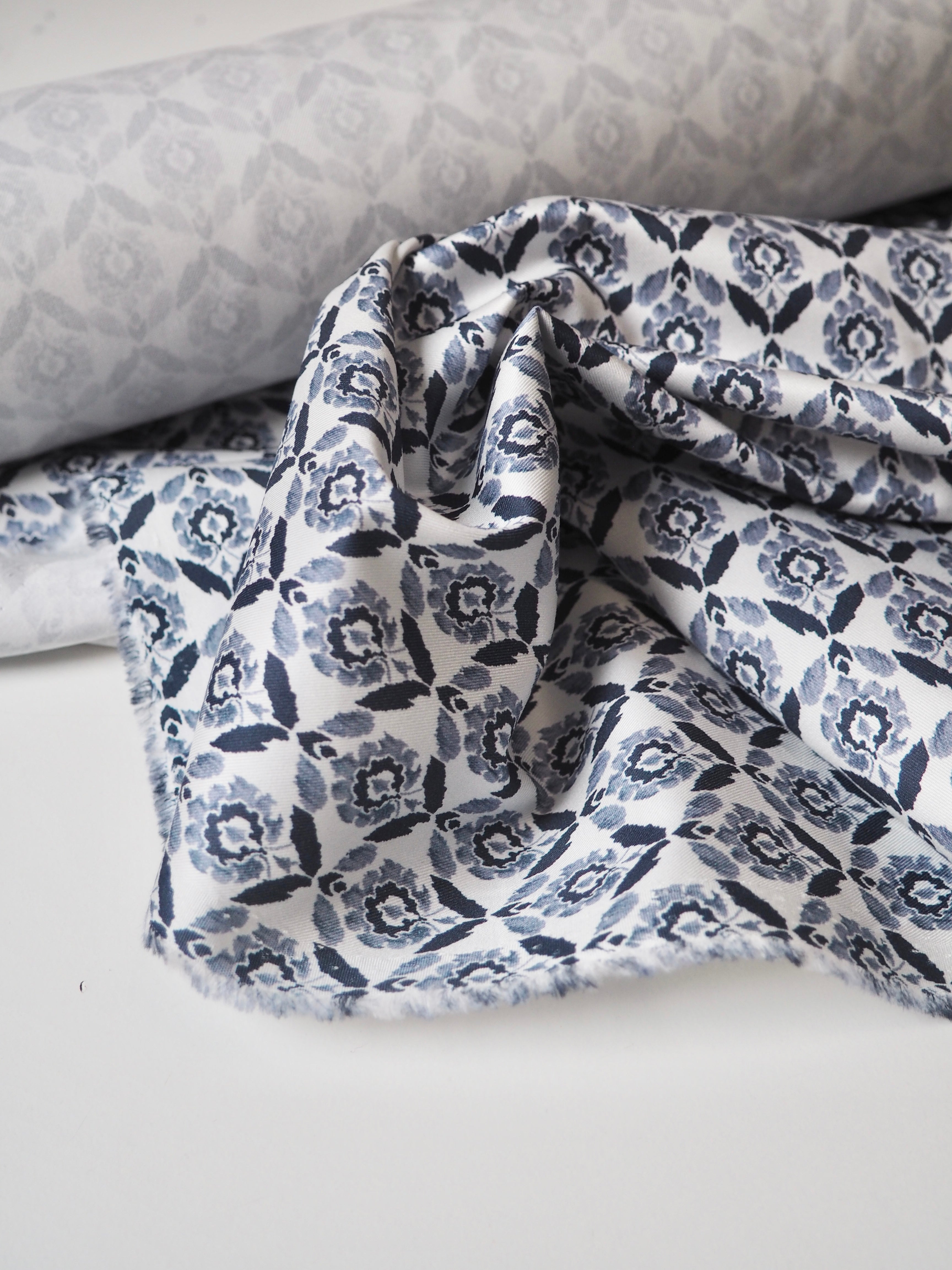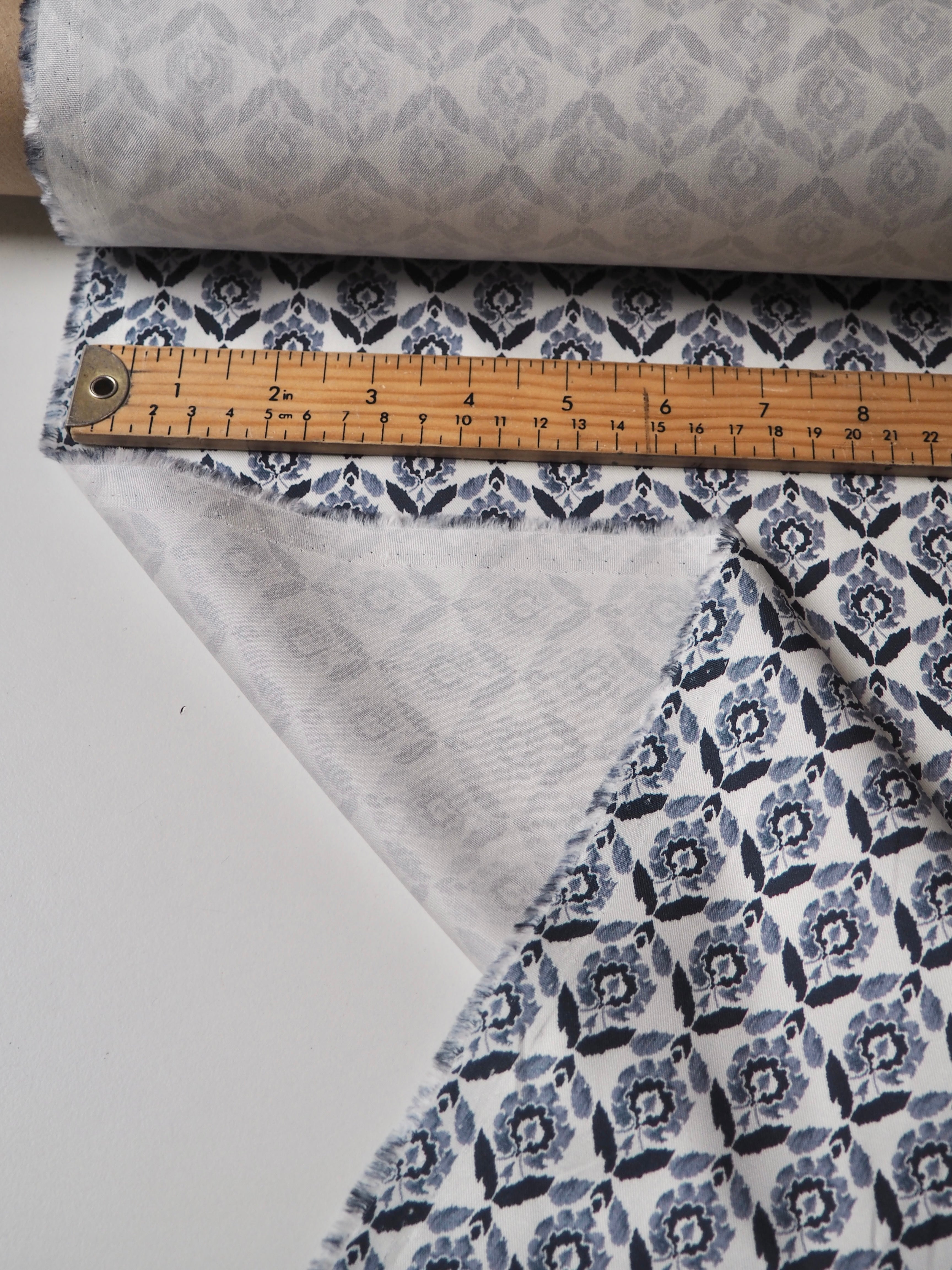 This ex-designer fabric is a classic Liberty cotton twill. It's a medium scale floral print. A top-quality Liberty cotton in a light to medium weight. Soft with a lovely drape and slight crispness. Has a wonderful cotton handle and a slight sheen. Fully opaque! We would love to see a light jacket or bag!