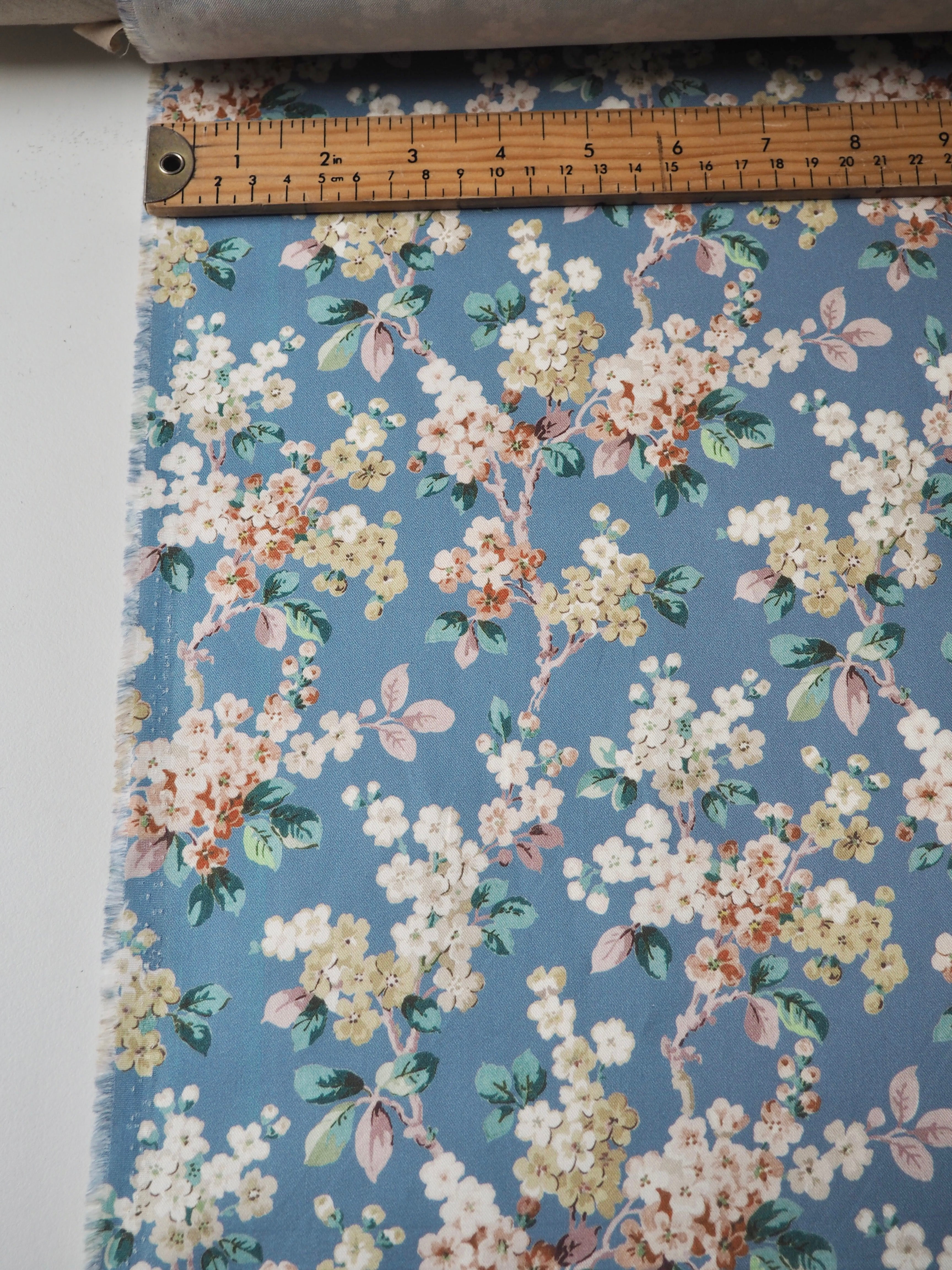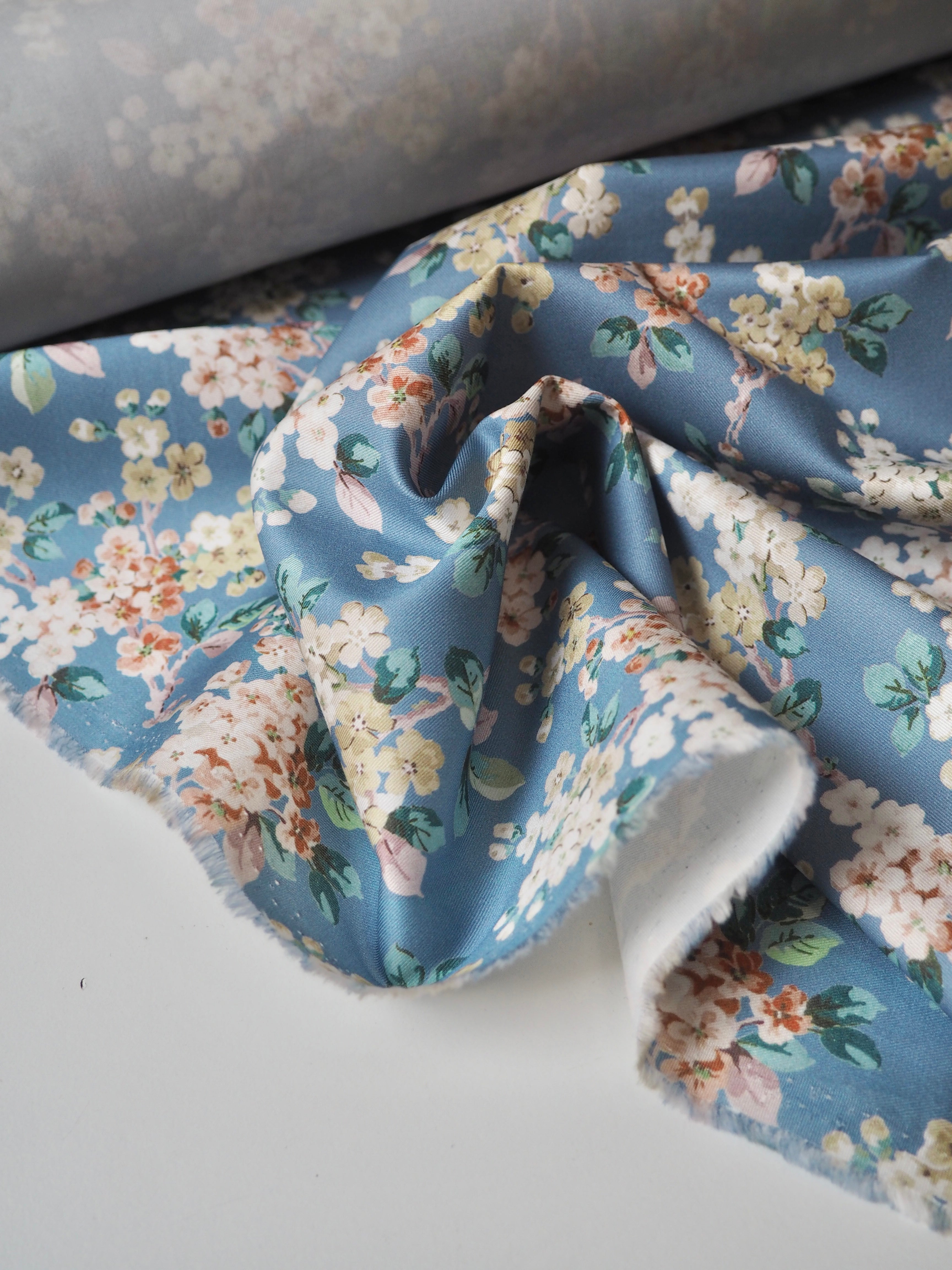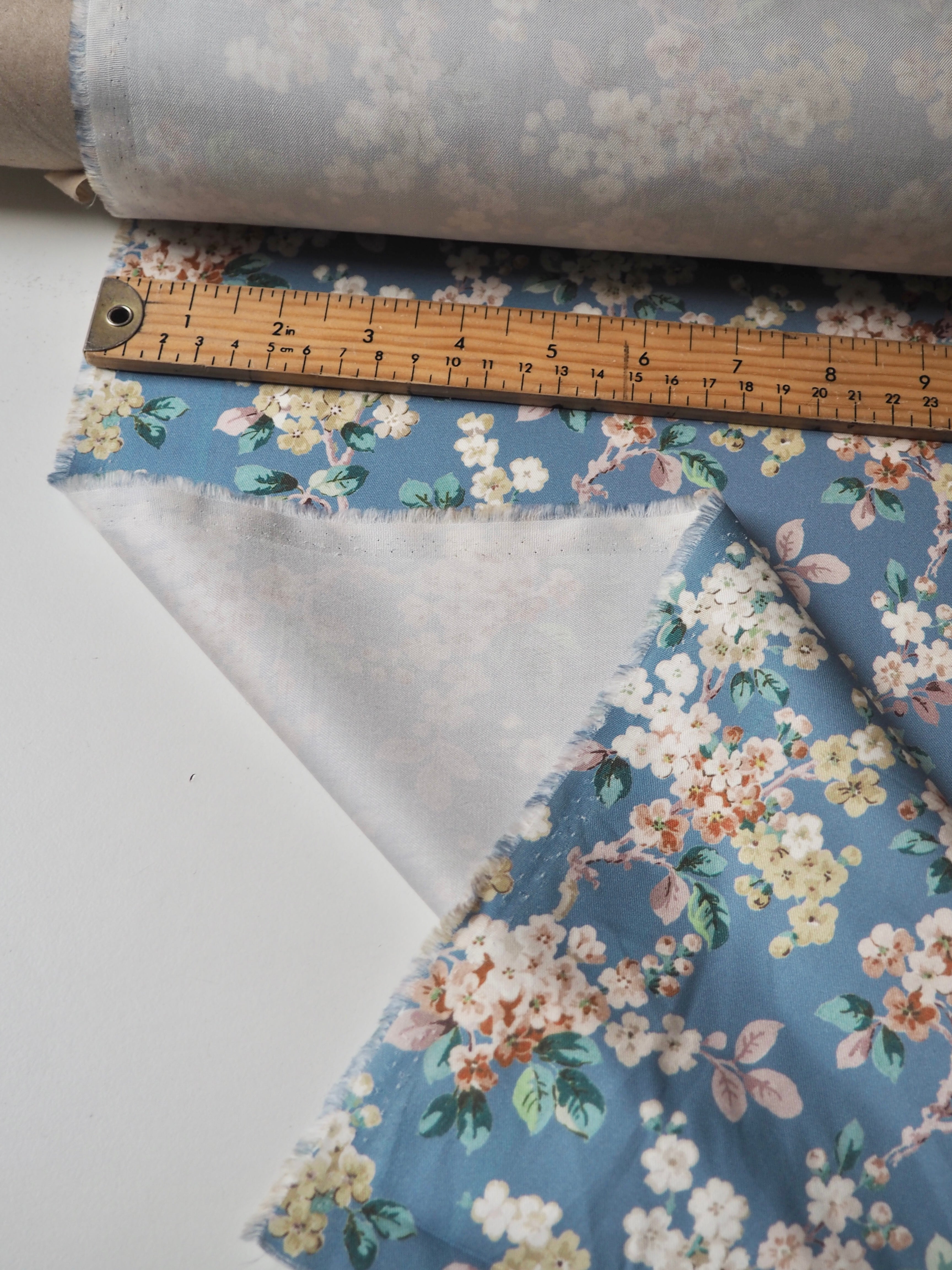 This ex-designer fabric is a classic Liberty cotton twill. It's a medium scale blossoming floral print. A top-quality Liberty cotton in a light to medium weight. Soft with a lovely drape and slight crispness. Has a wonderful cotton handle and a slight sheen. Fully opaque! We would love to see a light jacket or bag!