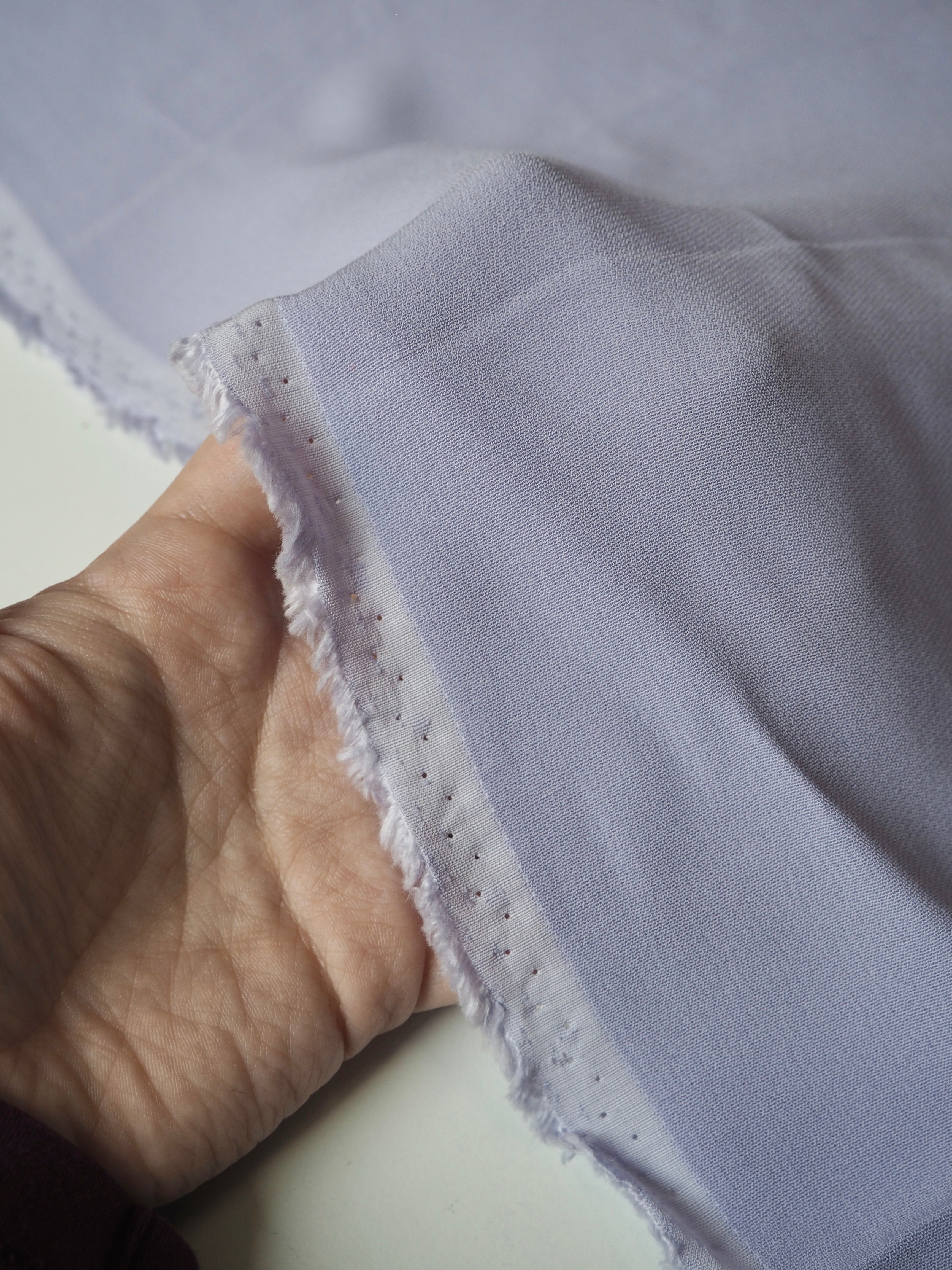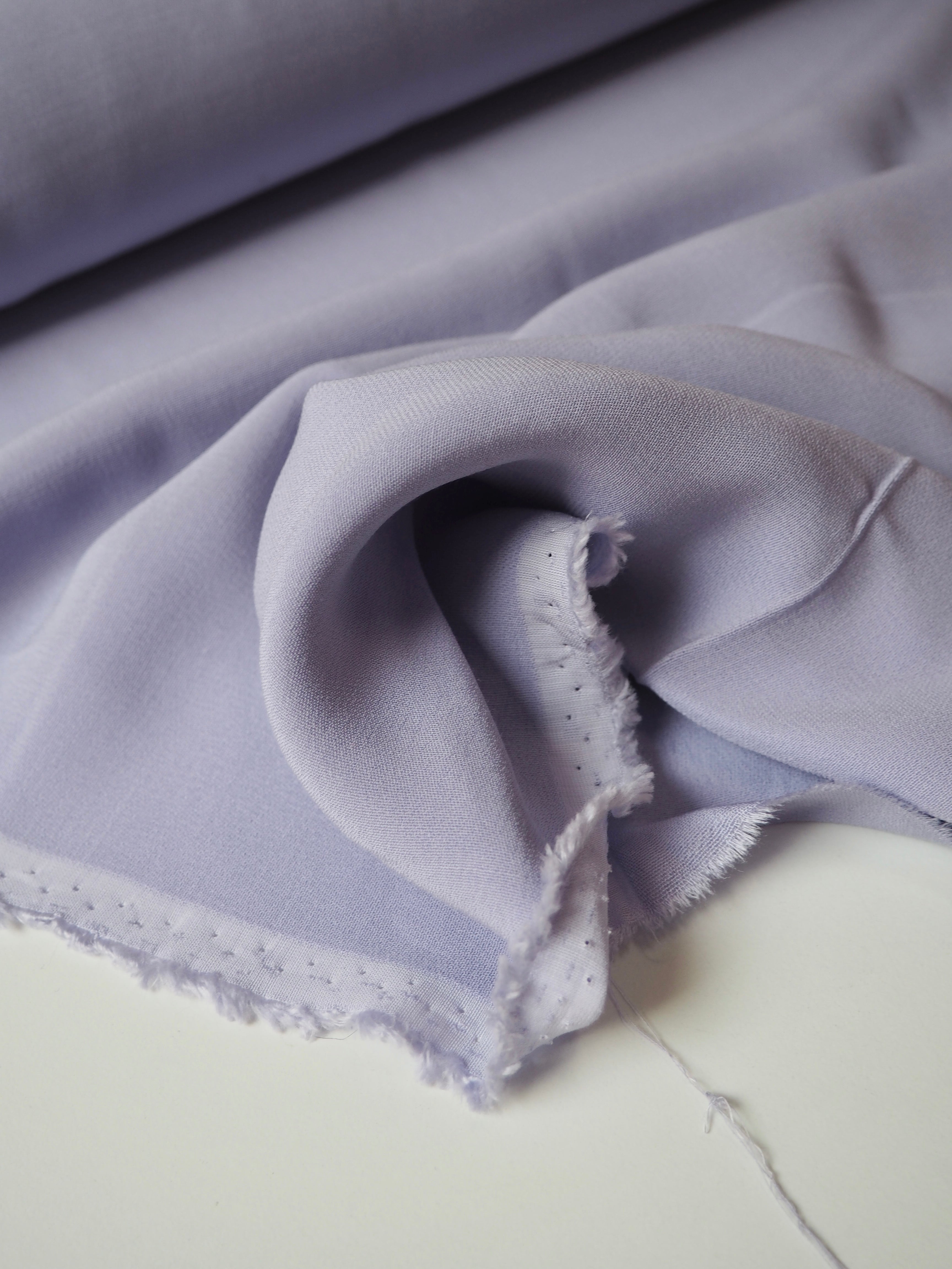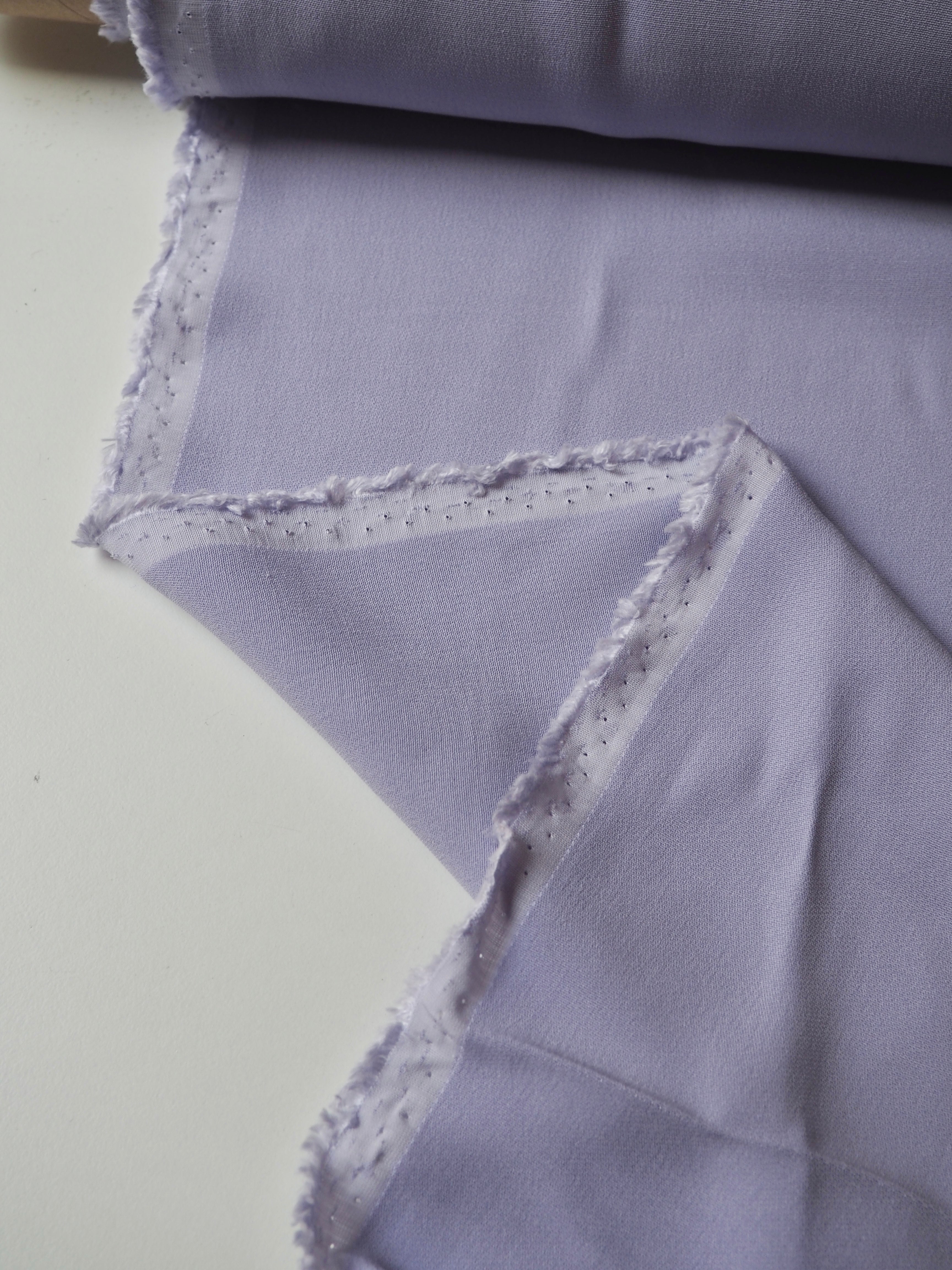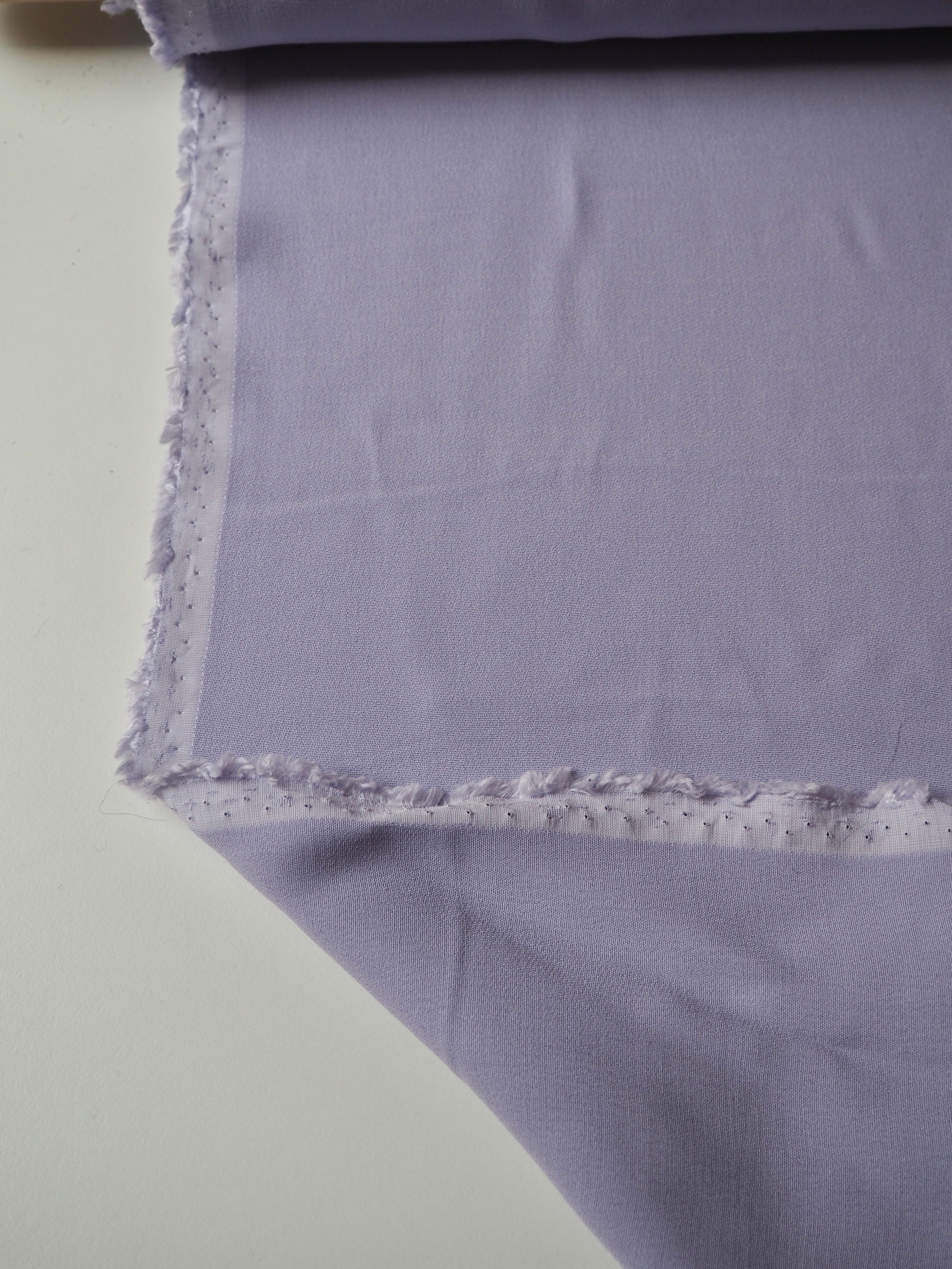This ex-designer fabric is a crepe. It's in a light lilac purple colour. It has a light weight and is very drapey. Opaque with a typical crepe handle, and is so very soft on the skin. Perfect for so many projects, like swishy trousers and dresses!