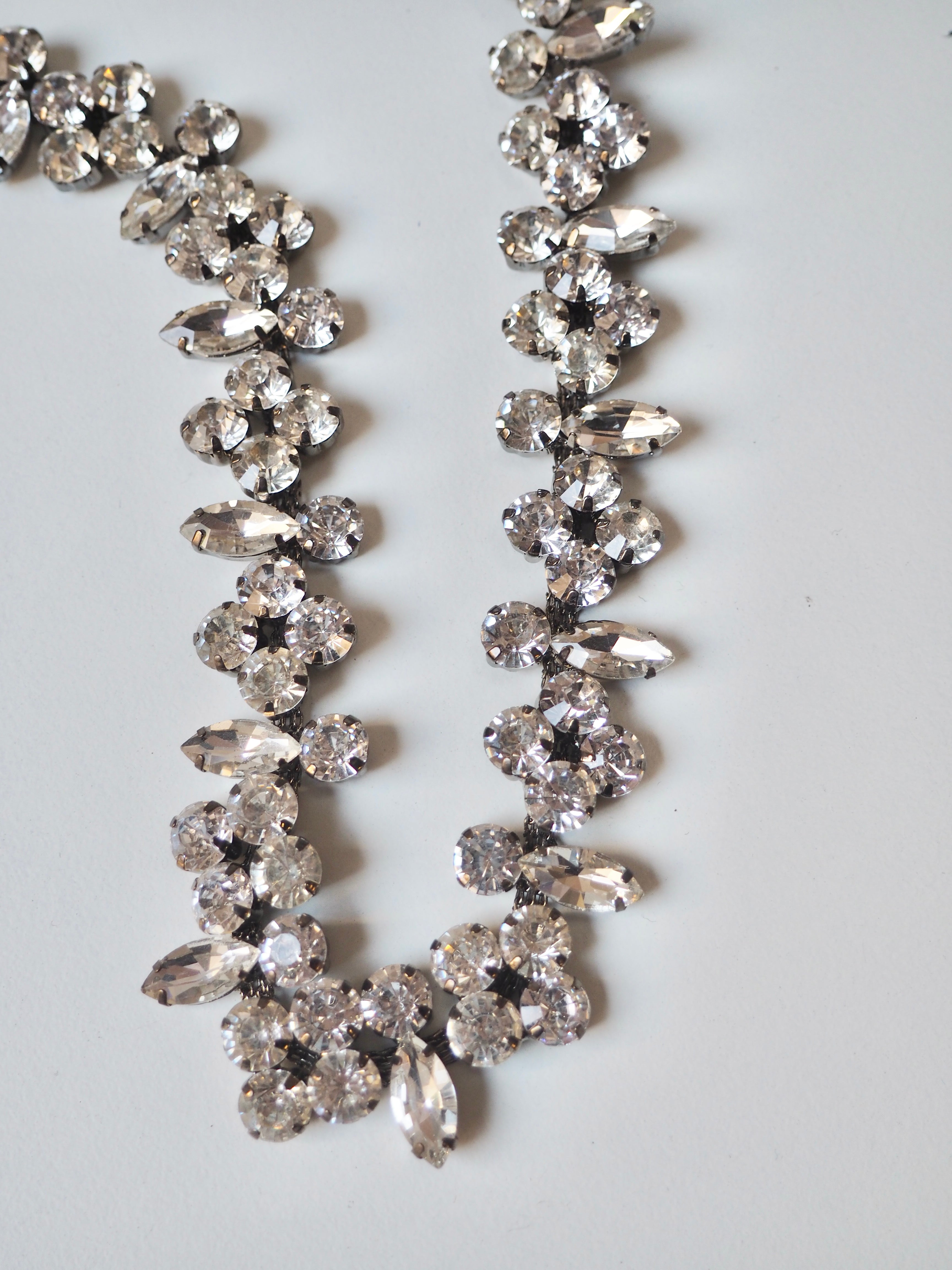 This ex-designer trim is made up of crystal stones. They are set into prong settings and are a repeating design on a metal chain. The crystals really sparkle when they catch the light! Medium weight with beautiful movement! Perfect for jazzing up a bridal look or special piece! This trim has one or two stones missing from the setting, this is reflected in the price.