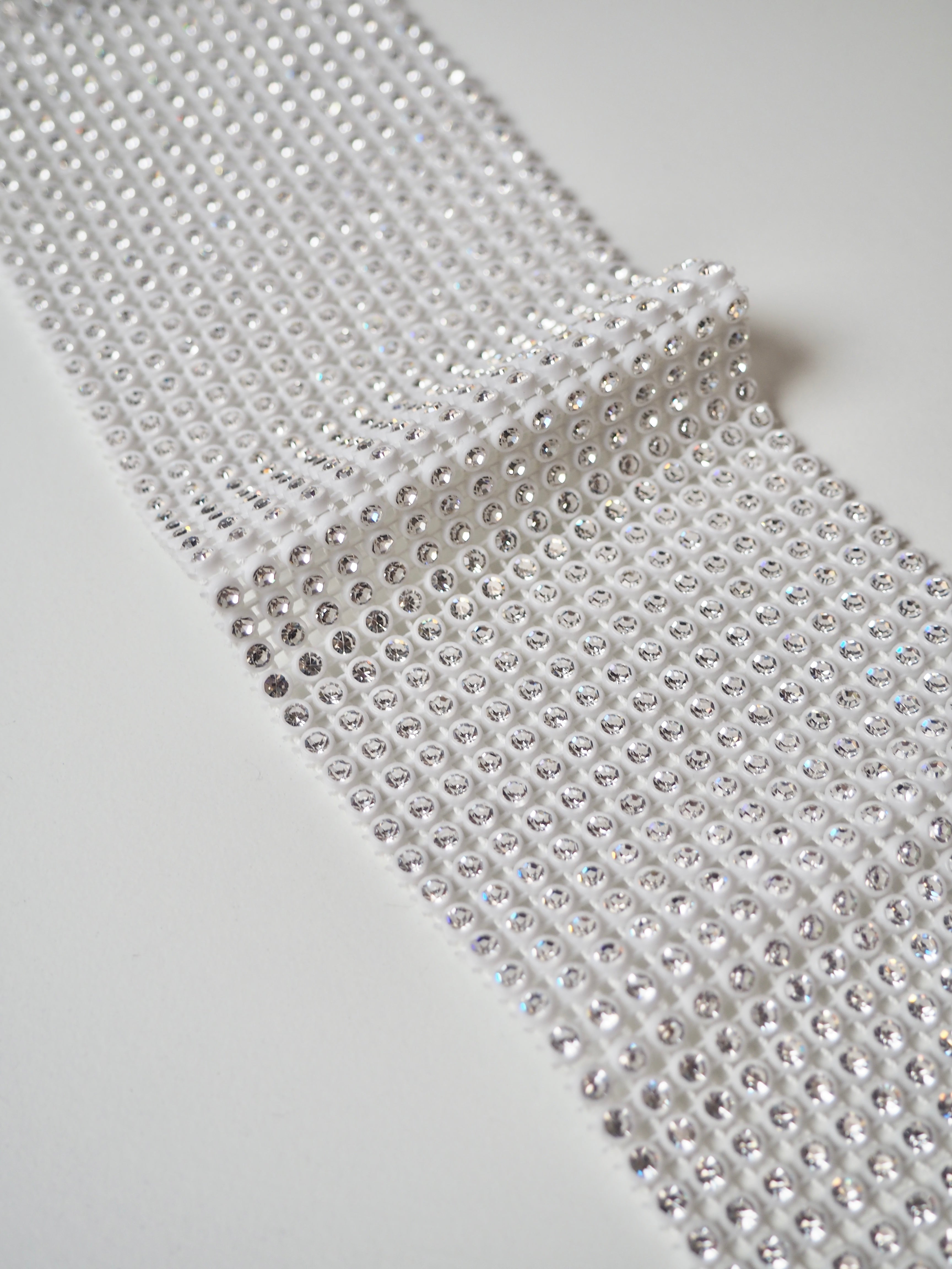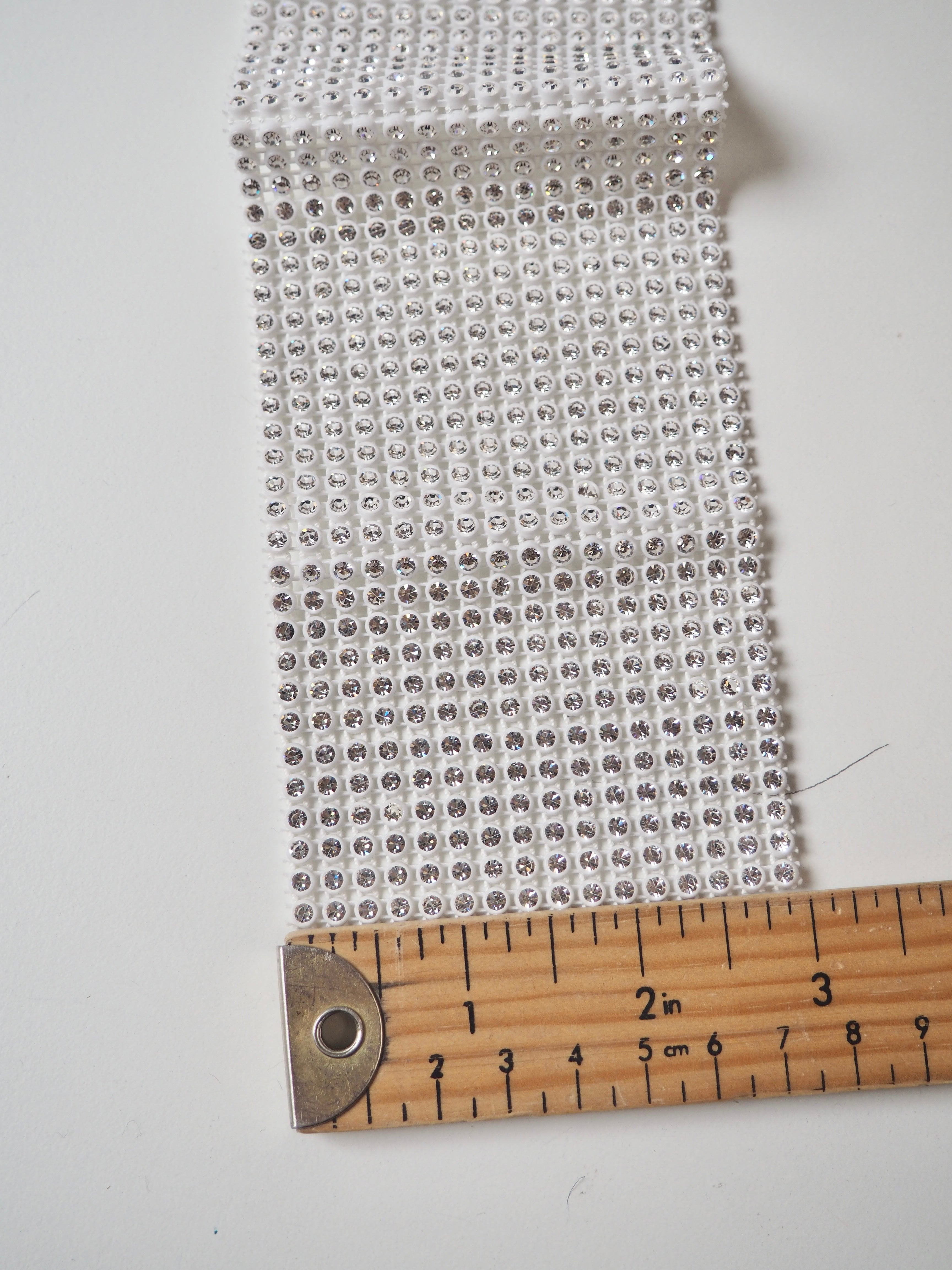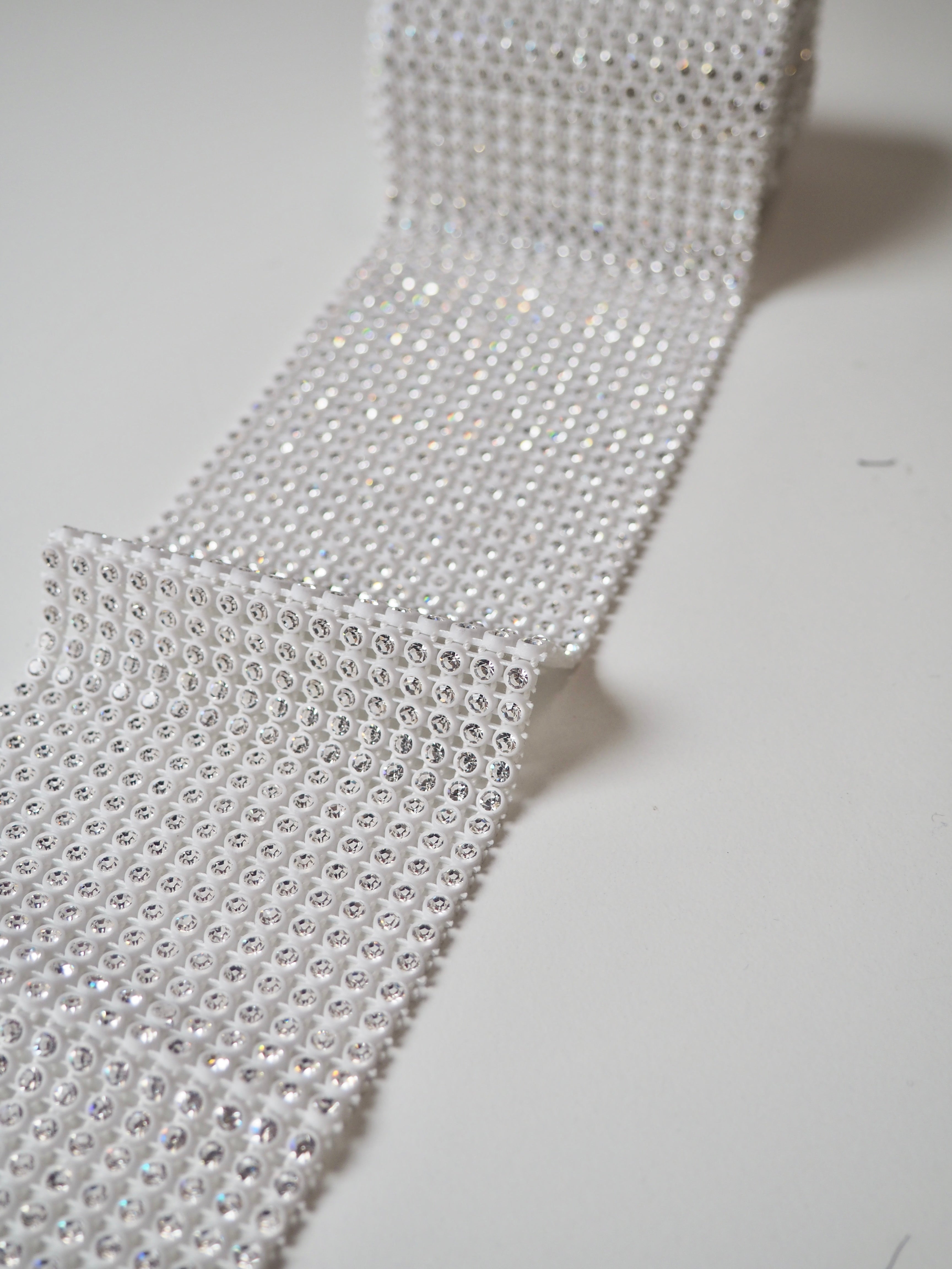 This ex-designer trim is a sparkly diamante trim. Preciosa is a top-quality Czech trim supplier, similar to Swarovski. Made up of crystals in a white setting, chained together in a gridded weave. The crystals are super high quality and really sparkle when they catch the light! Medium weight with decent movement, and easy to cut! Could be used for cuffs, jewellery, accents, and so many other fun projects!