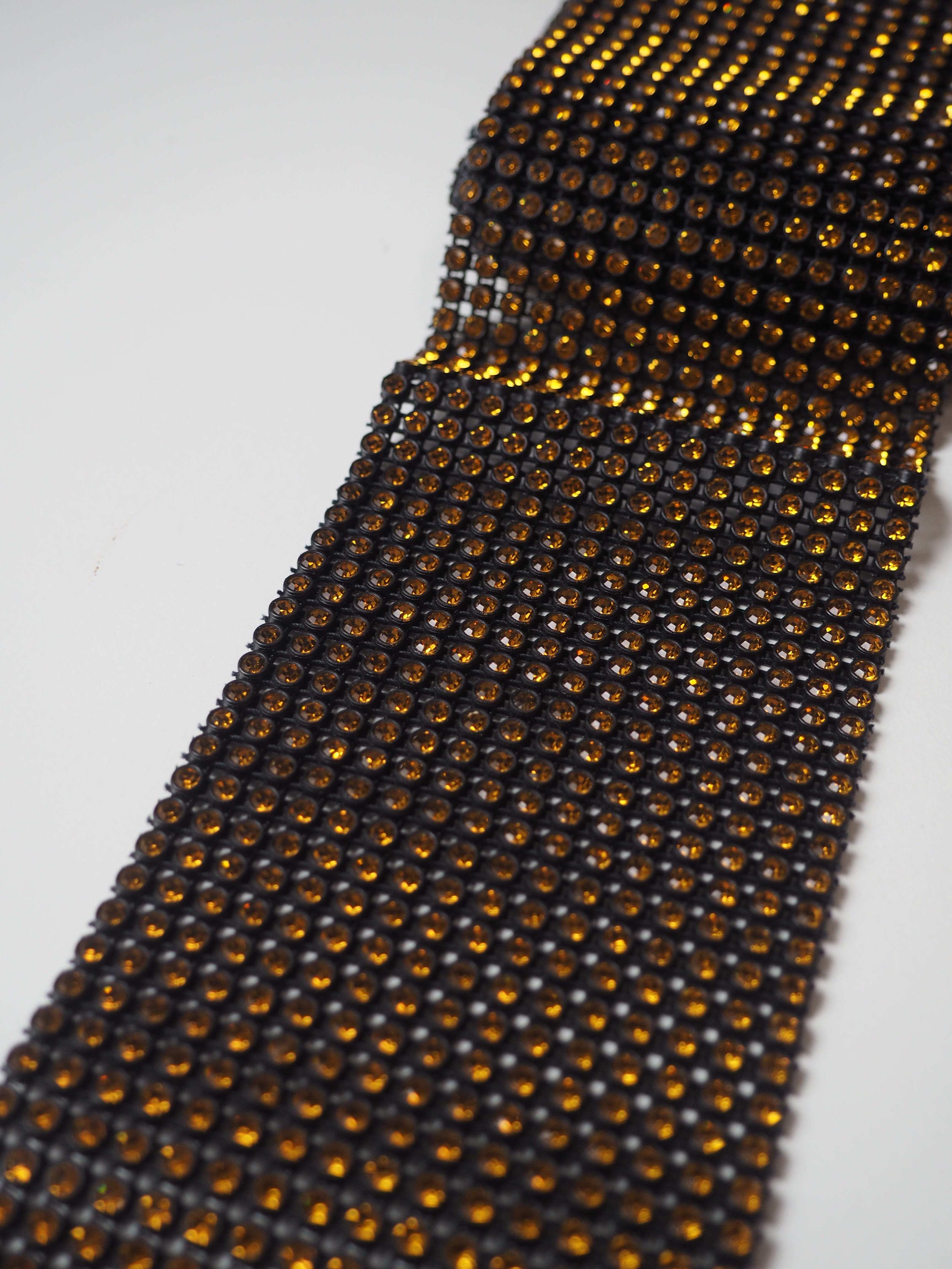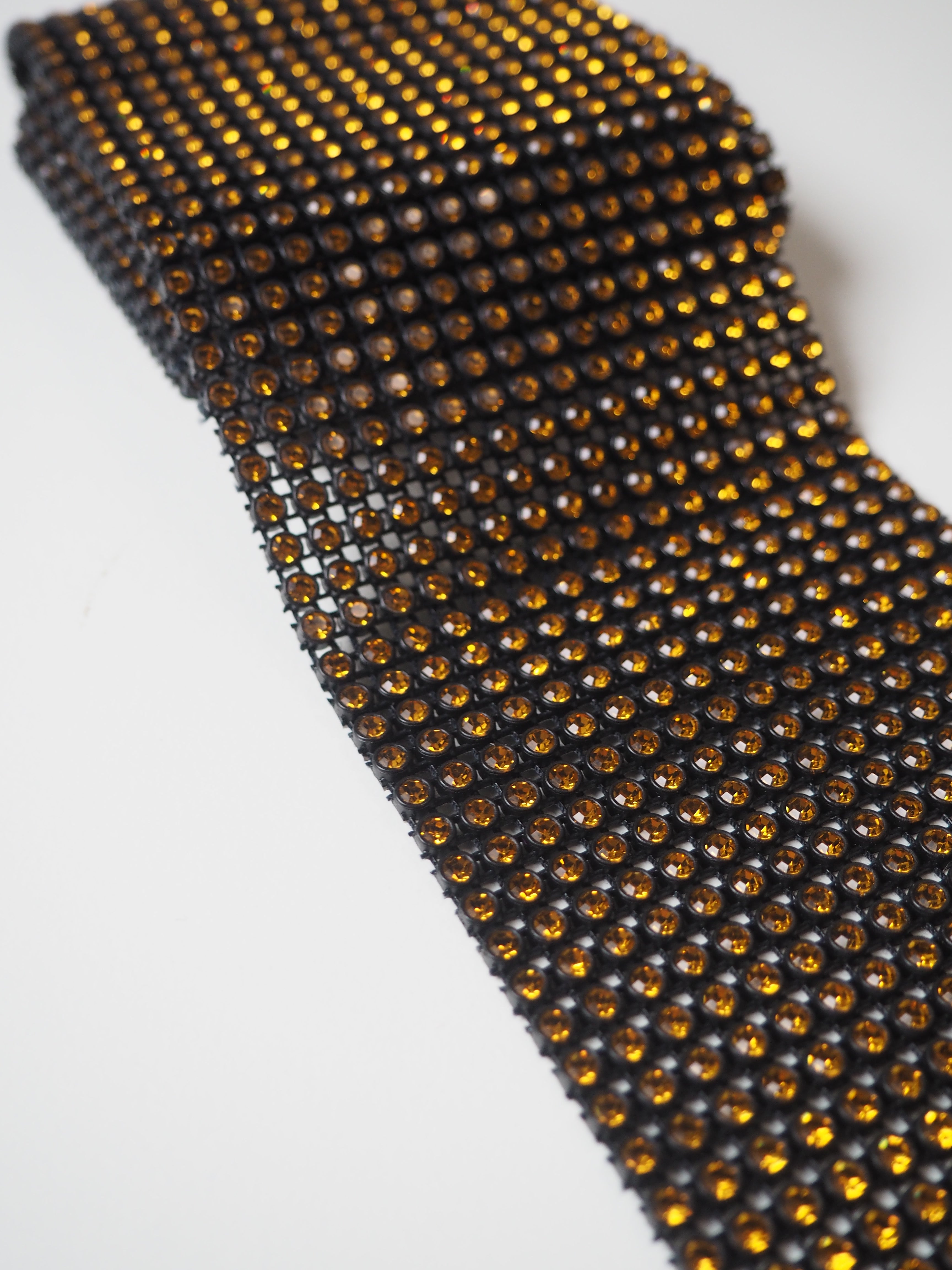 This ex-designer trim is a sparkly diamante trim. Preciosa is a top-quality Czech trim supplier, similar to Swarovski. Made up of crystals in a black setting, chained together in a gridded weave. The crystals are super high quality and really sparkle when they catch the light! Medium weight with decent movement, and easy to cut! Could be used for cuffs, jewellery, accents, and so many other fun projects!