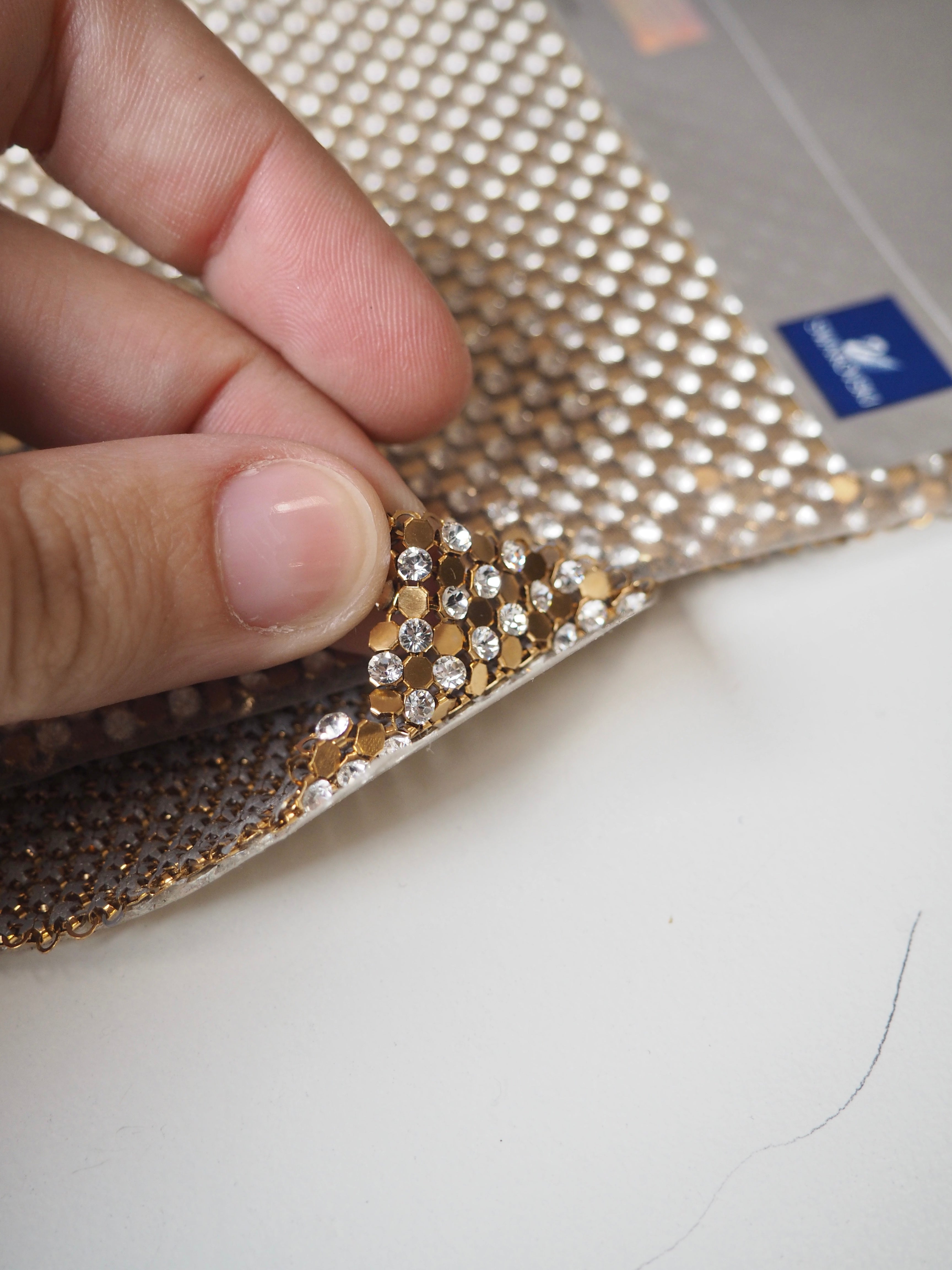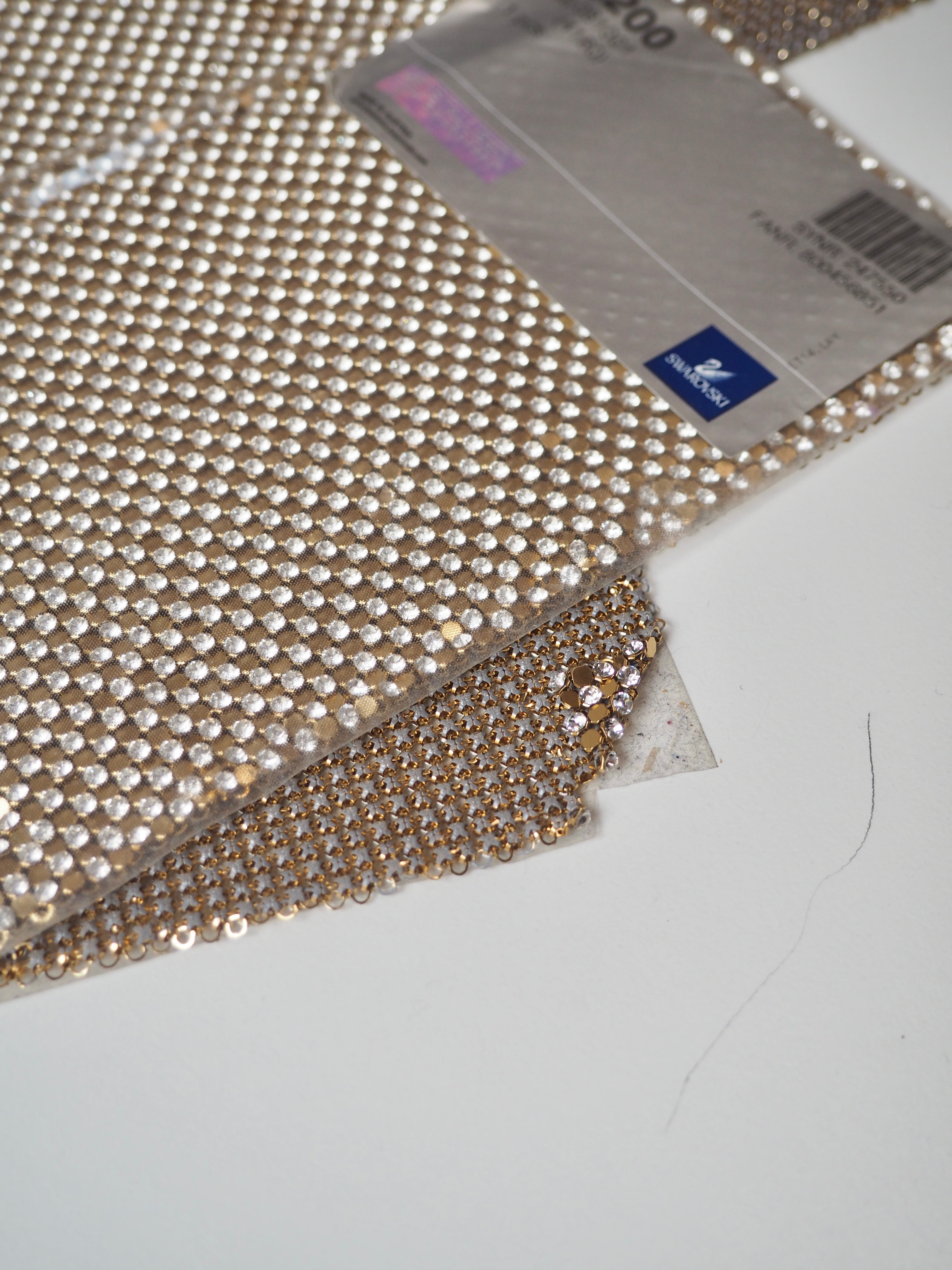 This ex-designer trim is a chainmail. It's a top-quality Swarovski chainmail with alternating gold and crystal links. It's medium weight and very drapey, and easy to cut down or re-link with pliers. Would be a great bag, or could be cut down for accessories or trims!
