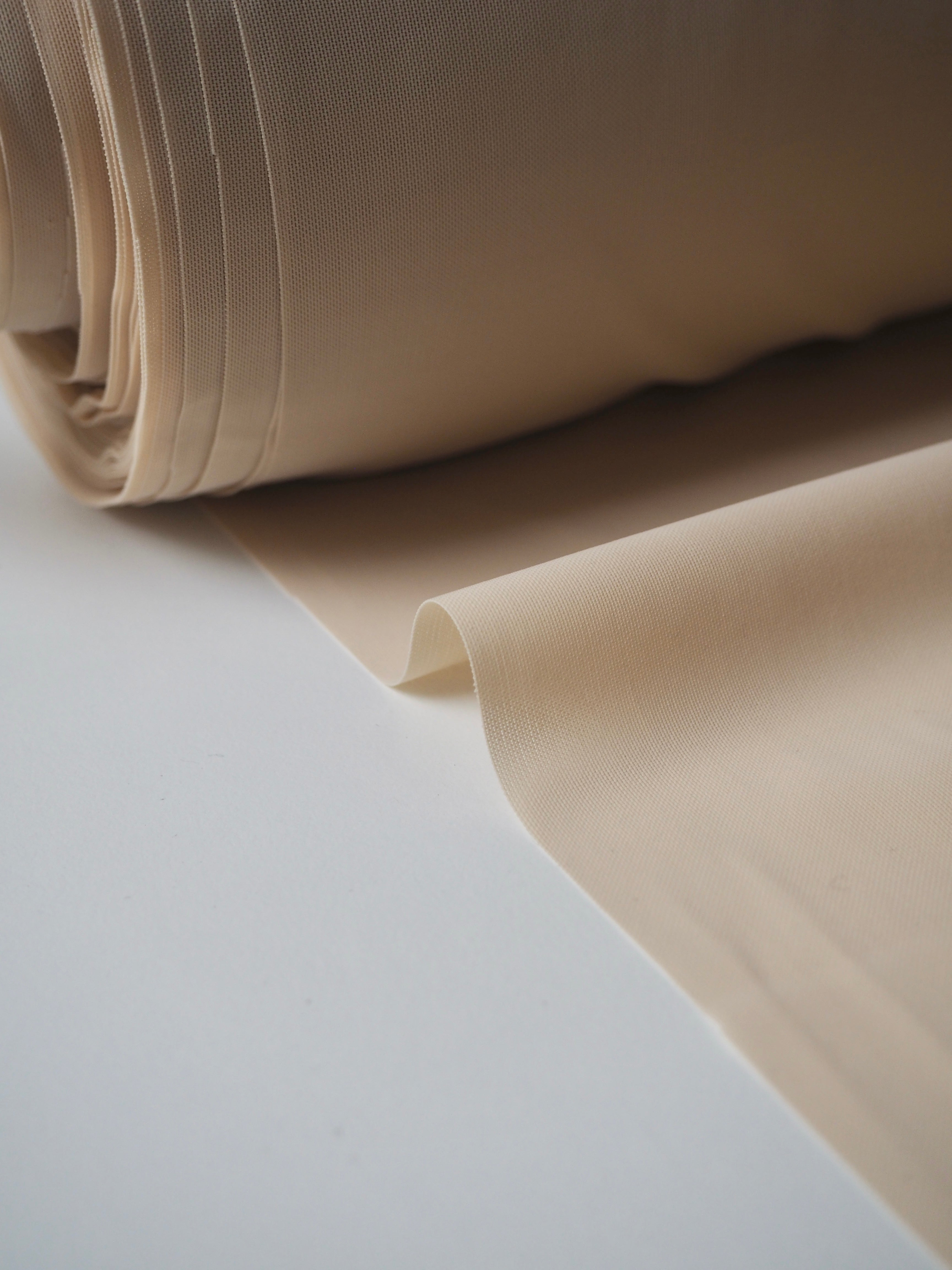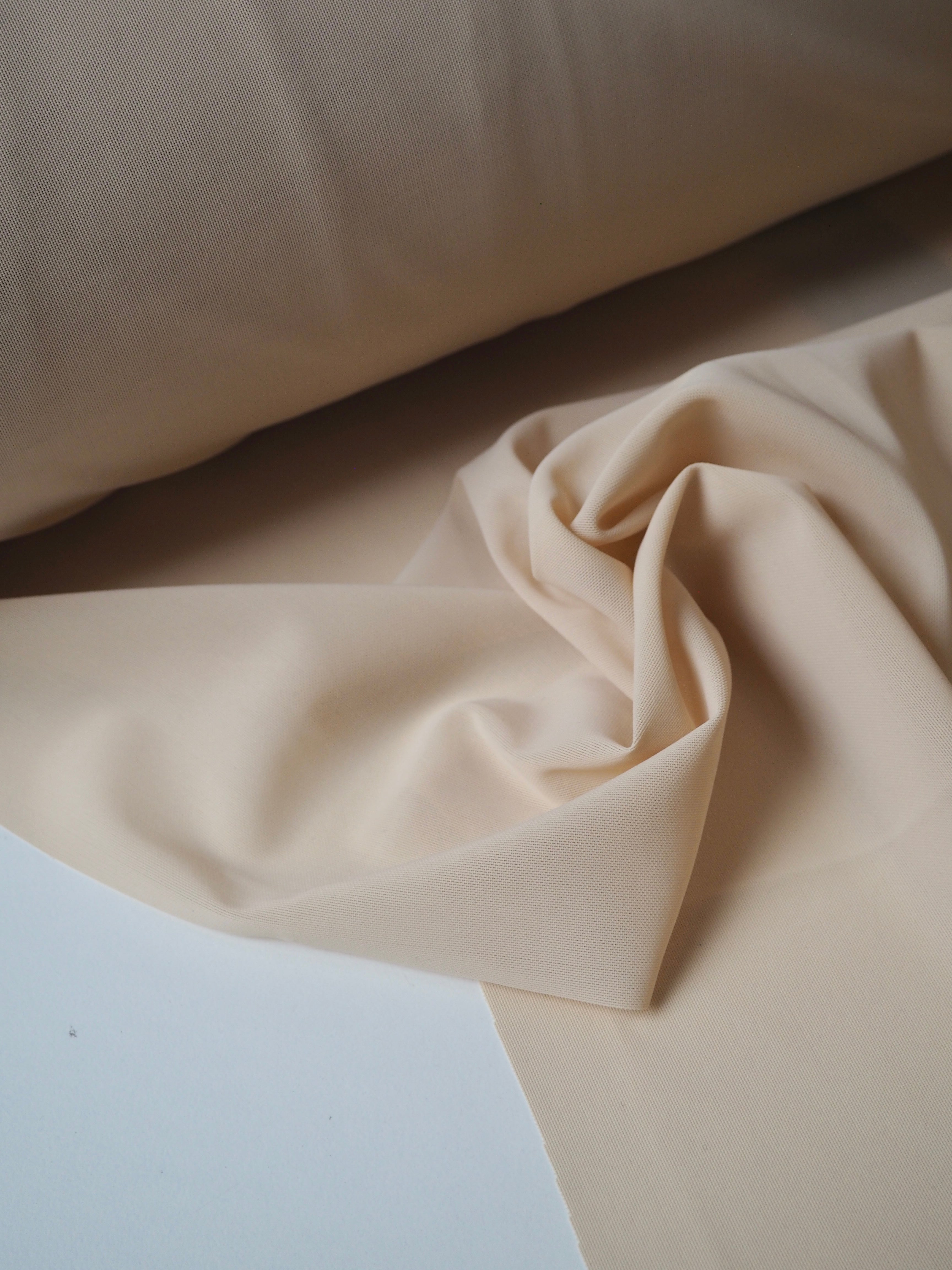 This ex-designer fabric is a stretch powernet. Powernet is a high-stretch fuller coverage mesh, with excellent recovery and great breathability. It's common for performance wear and undergarments. It's lightweight and has great support with its dense structure, but still slight sheerness when stretched. It's soft and comfy! Pairs so well with lingerie, swim, and activewear! Perfect for our lingerie patterns, and we even have bra finding kits!