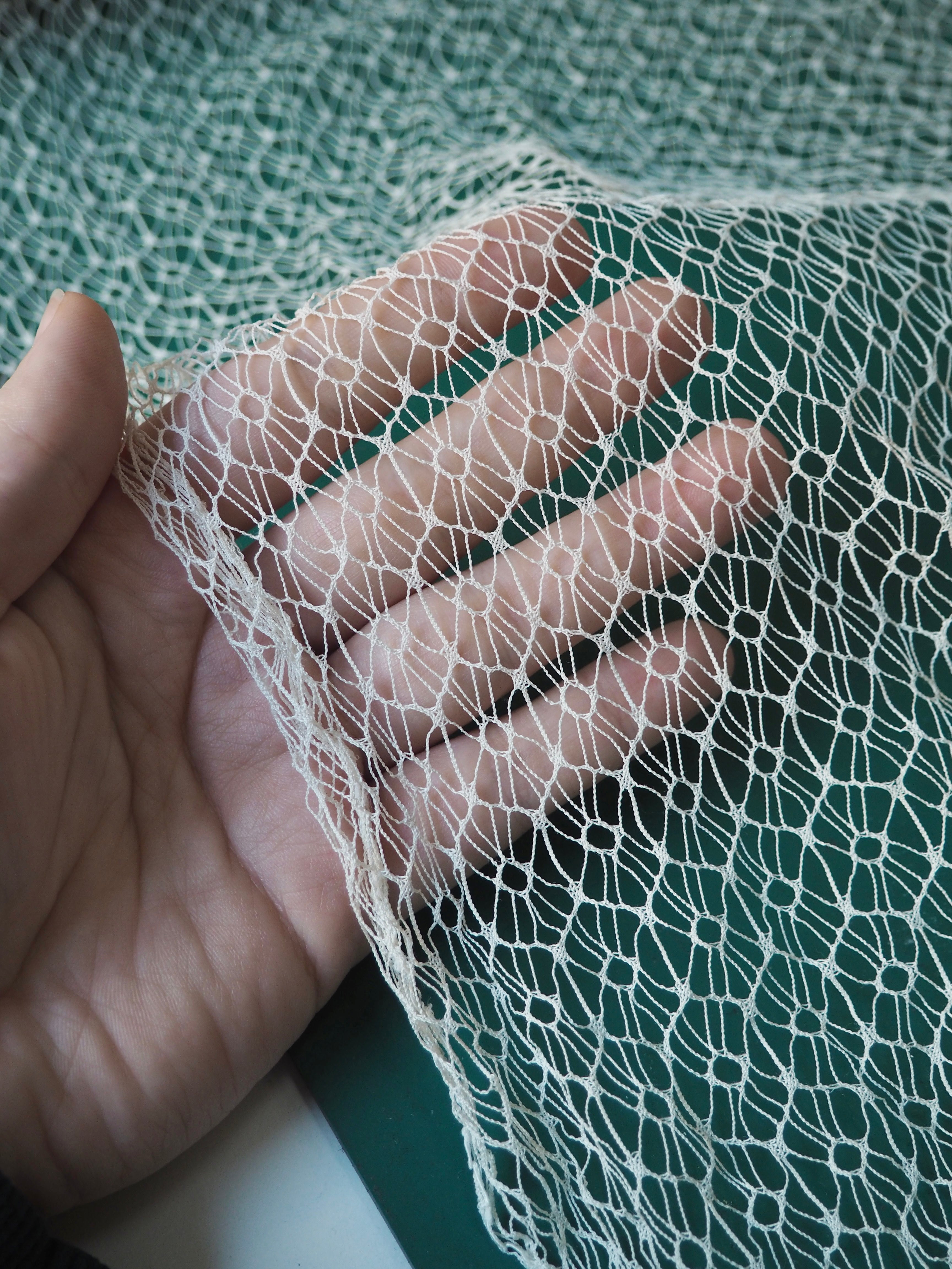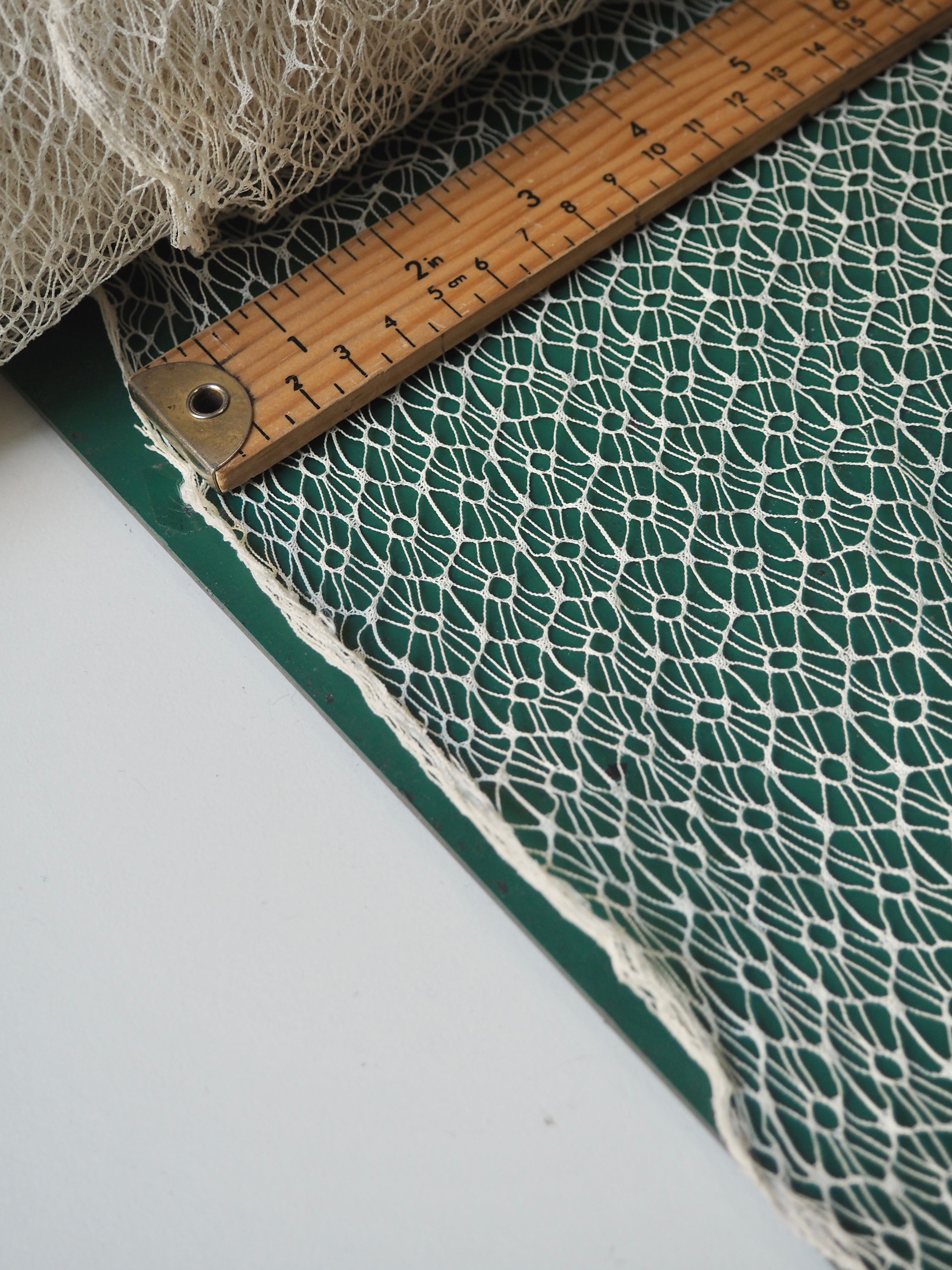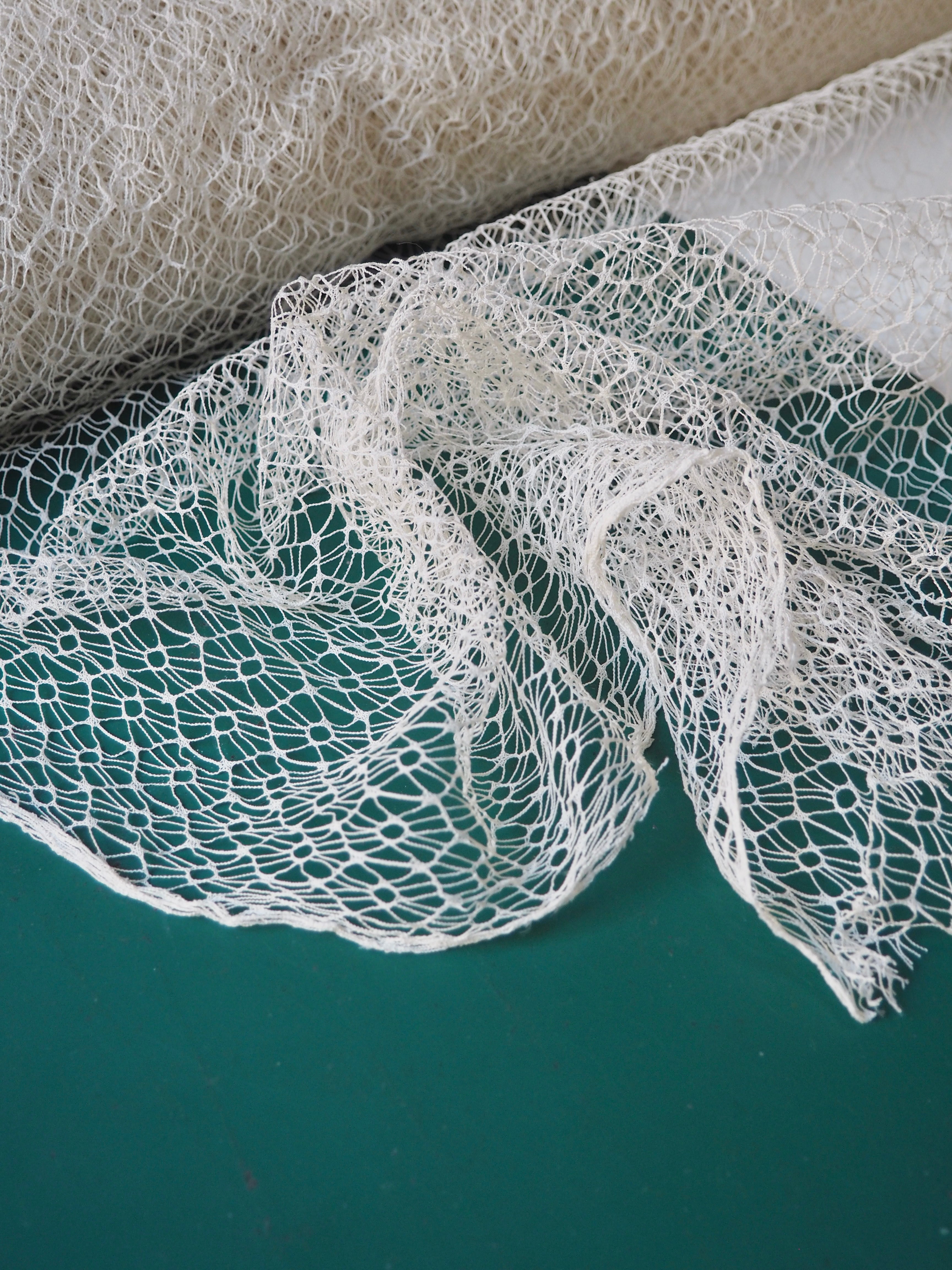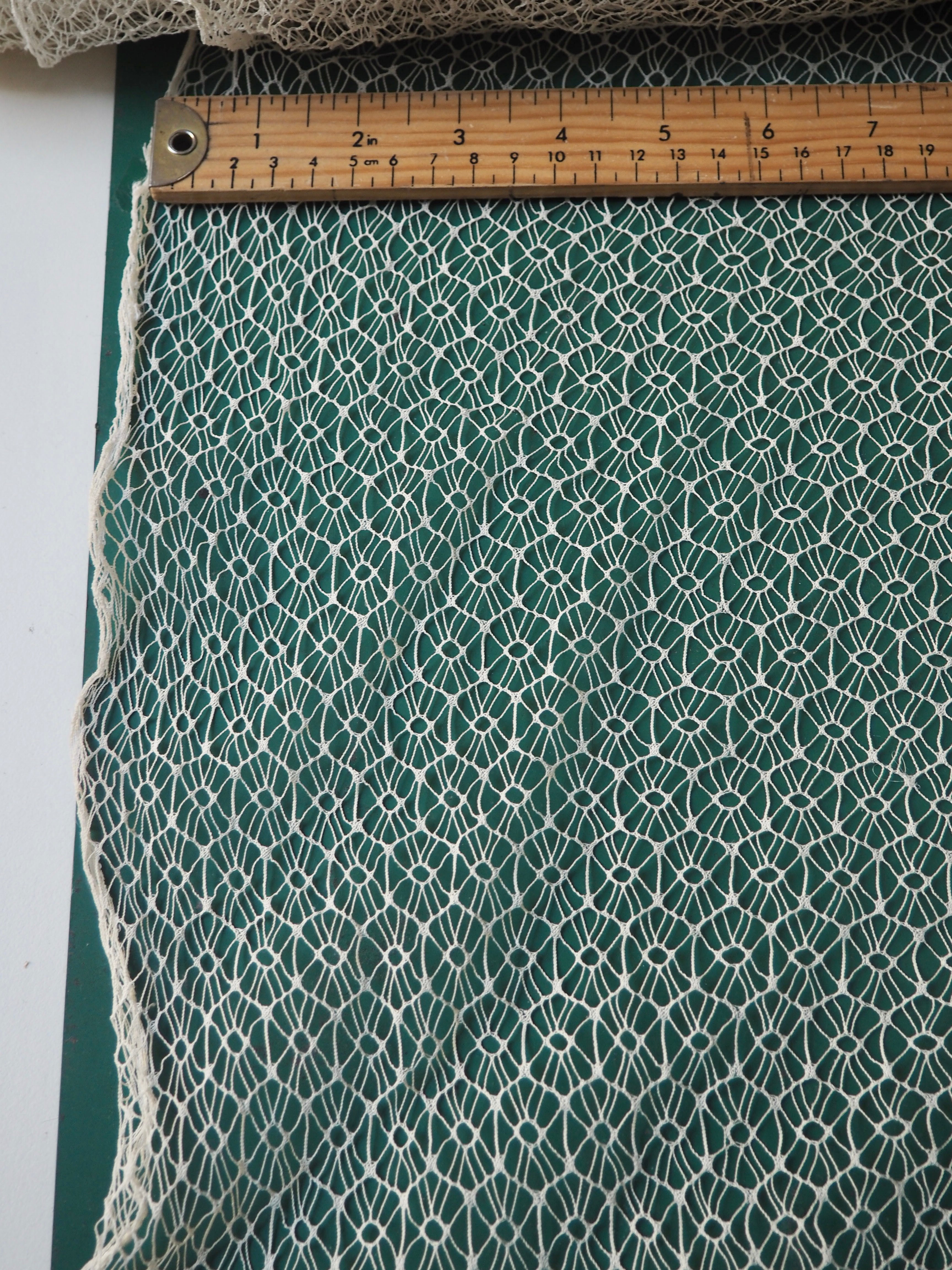 This ex-designer fabric is an exquisite lace. It is very delicate, with a latticed design. In a creamy antique shade with a flat finish. It's super lightweight and has such a lovely textured handle. Drapes so well and has a gentle structure. Very unique in a silk fibre! Would make a gorgeous dress or top overlay, or be great for hats and veils!