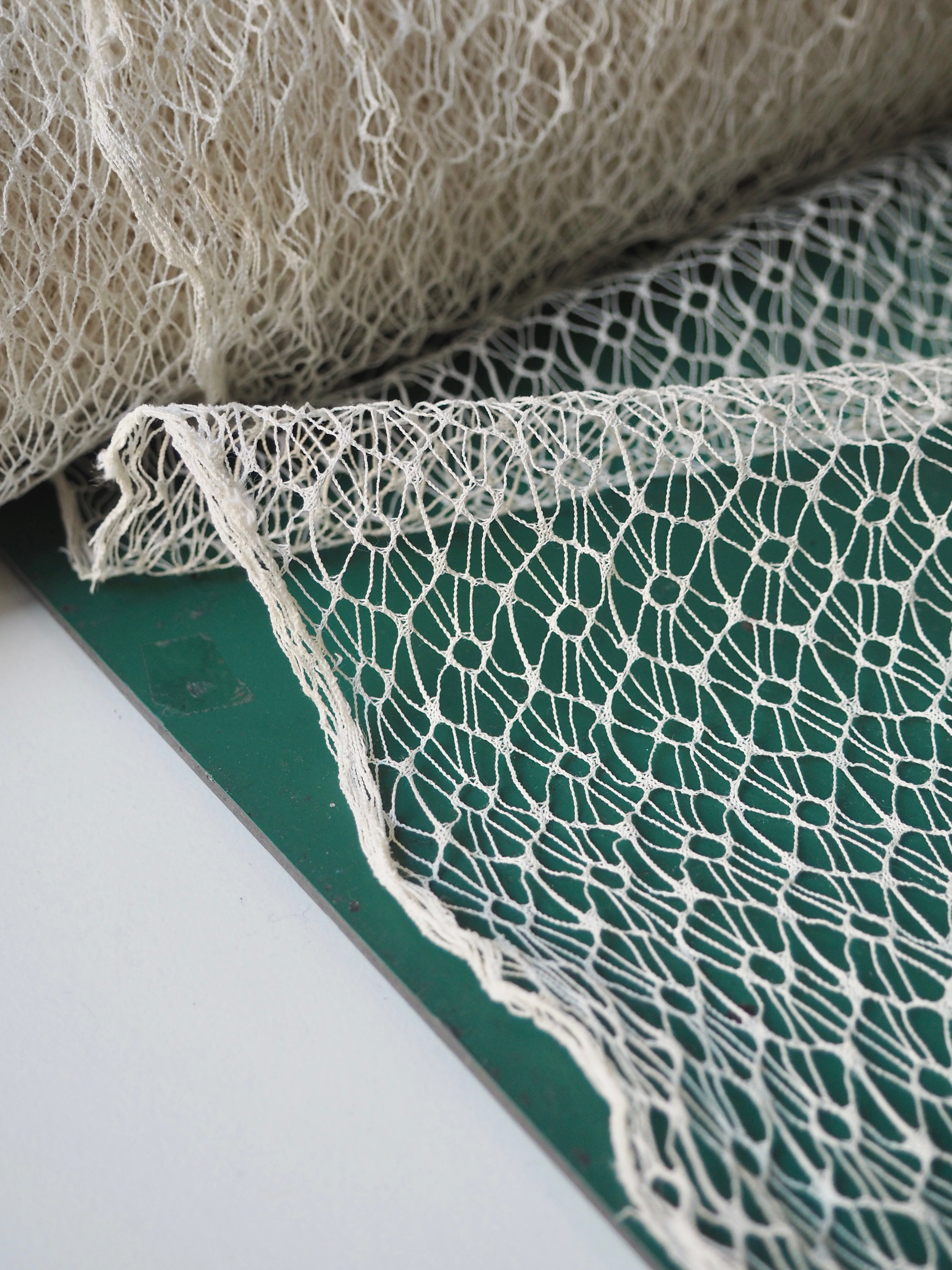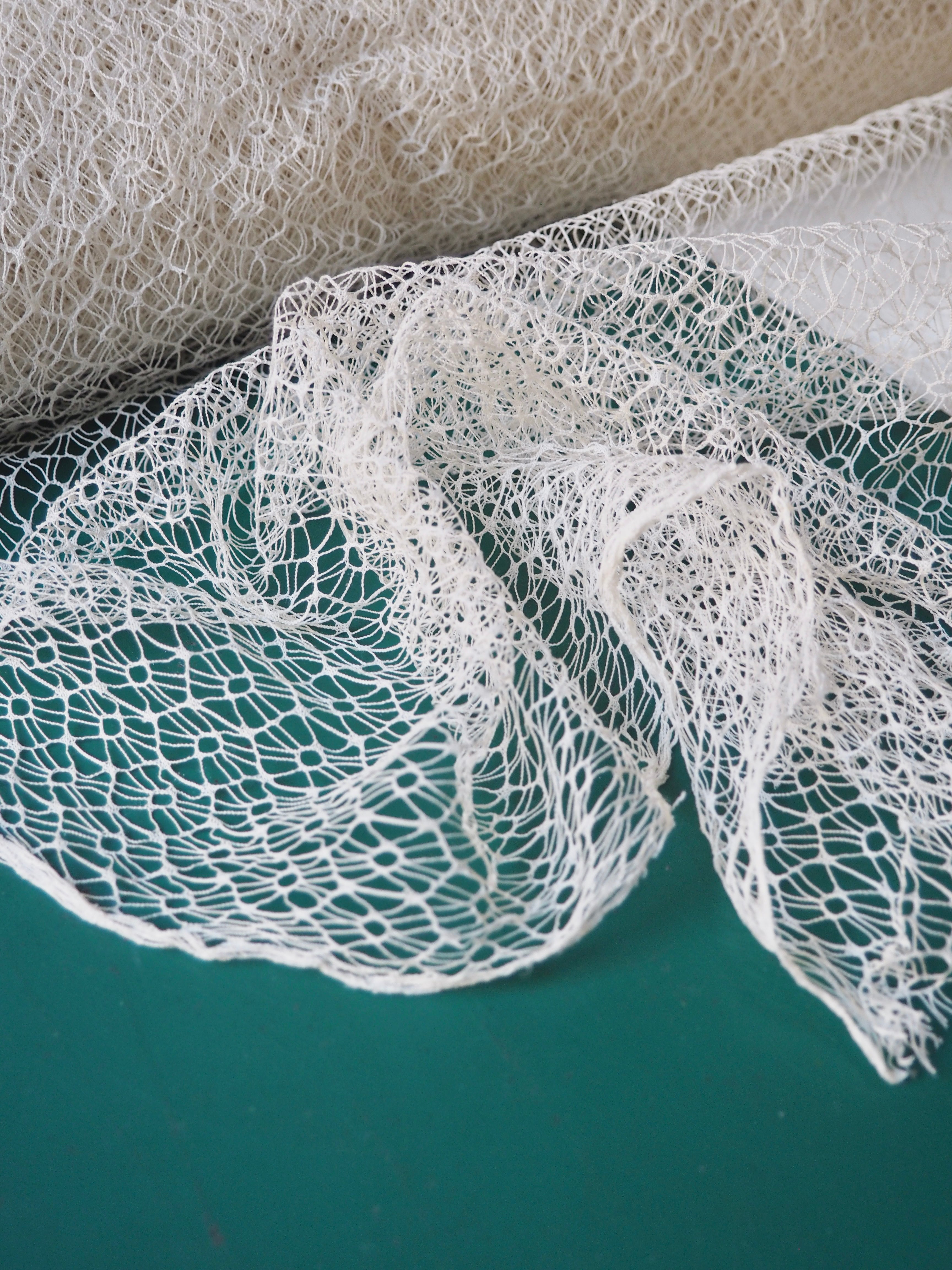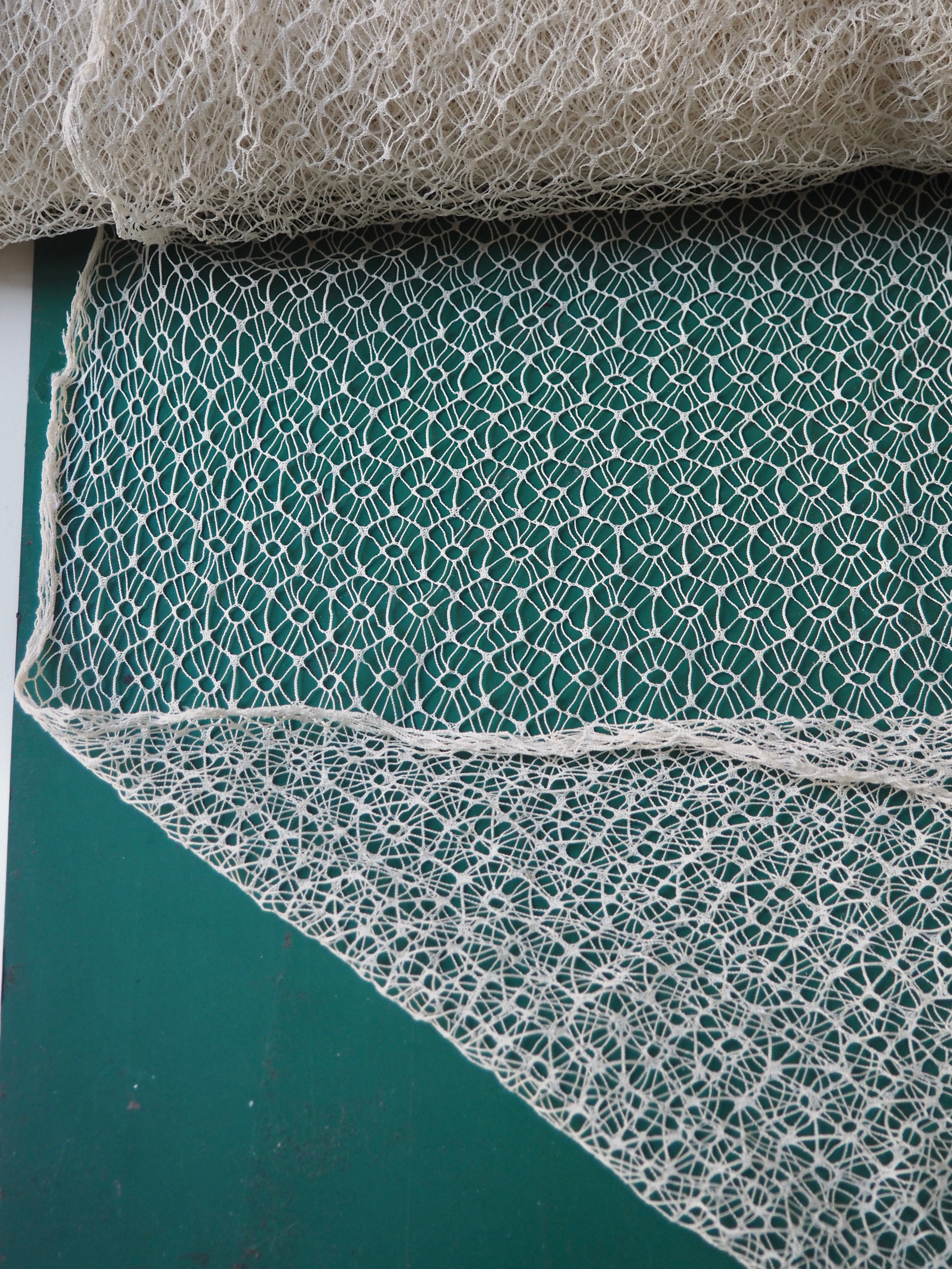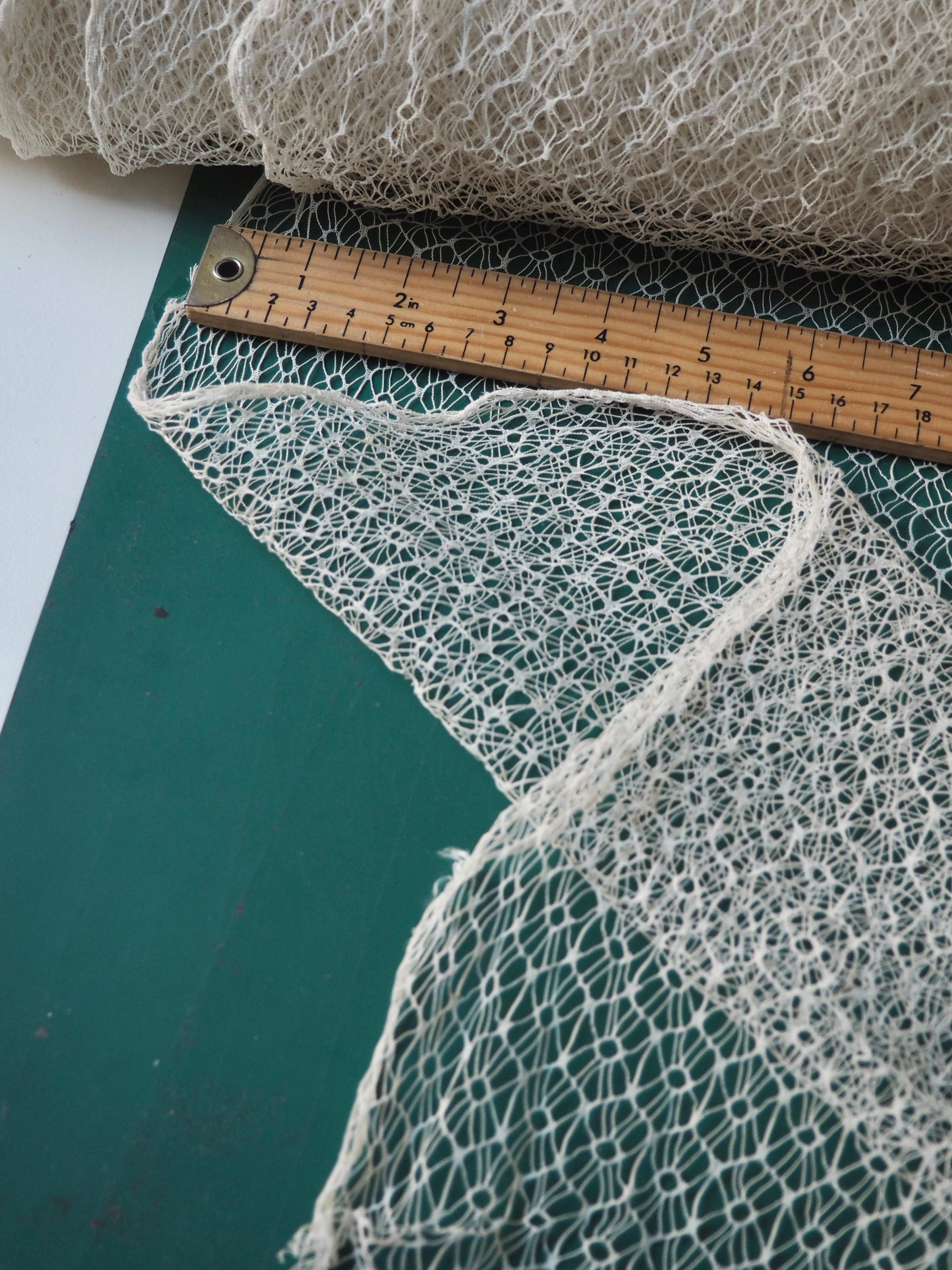 This ex-designer fabric is an exquisite lace. It is very delicate, with a latticed design. In a creamy antique shade with a flat finish. It's super lightweight and has such a lovely textured handle. Drapes so well and has a gentle structure. Very unique in a silk fibre! Would make a gorgeous dress or top overlay, or be great for hats and veils!