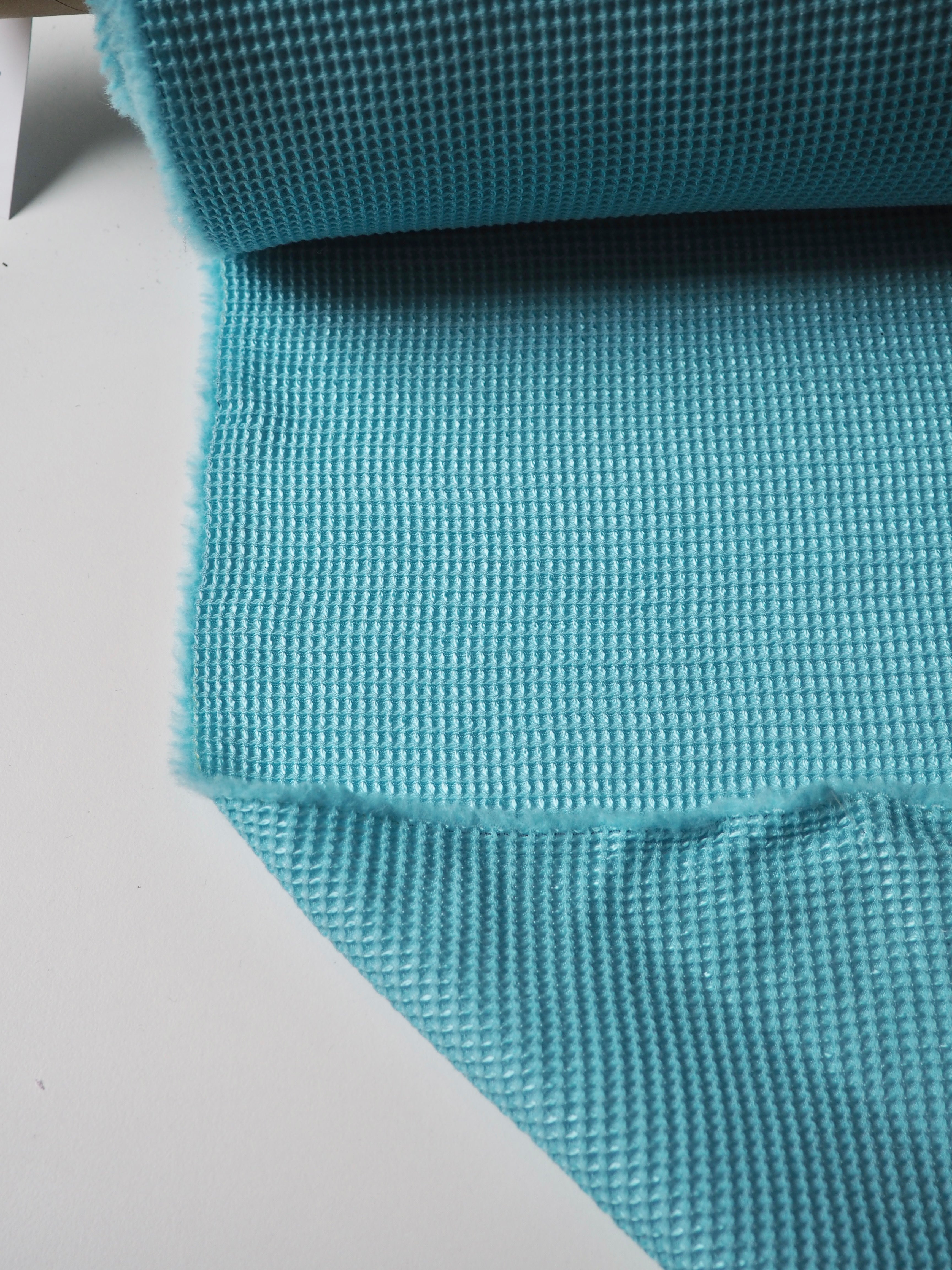 This ex-designer fabric is a jacquard. It's a unique gridded honeycomb-like weave that gives it an interesting depth. It's light to medium weight and sponge-y in texture. Opaque and has a soft structure to play with. The slight silk fibre blend gives it a lovely sheen finish, and the wool blend gives it warmth and cosiness. Would be lovely in a boxy top or dress!