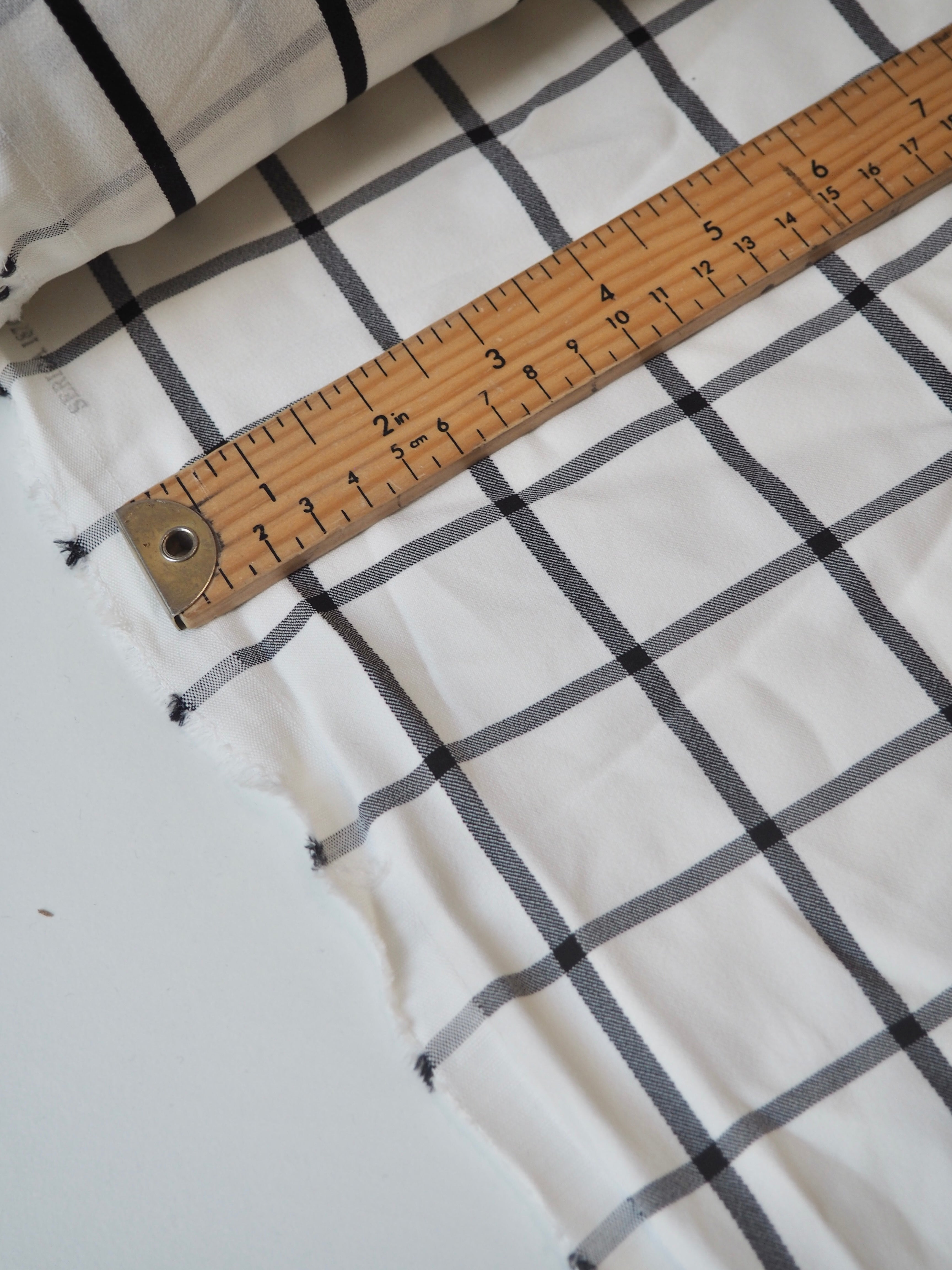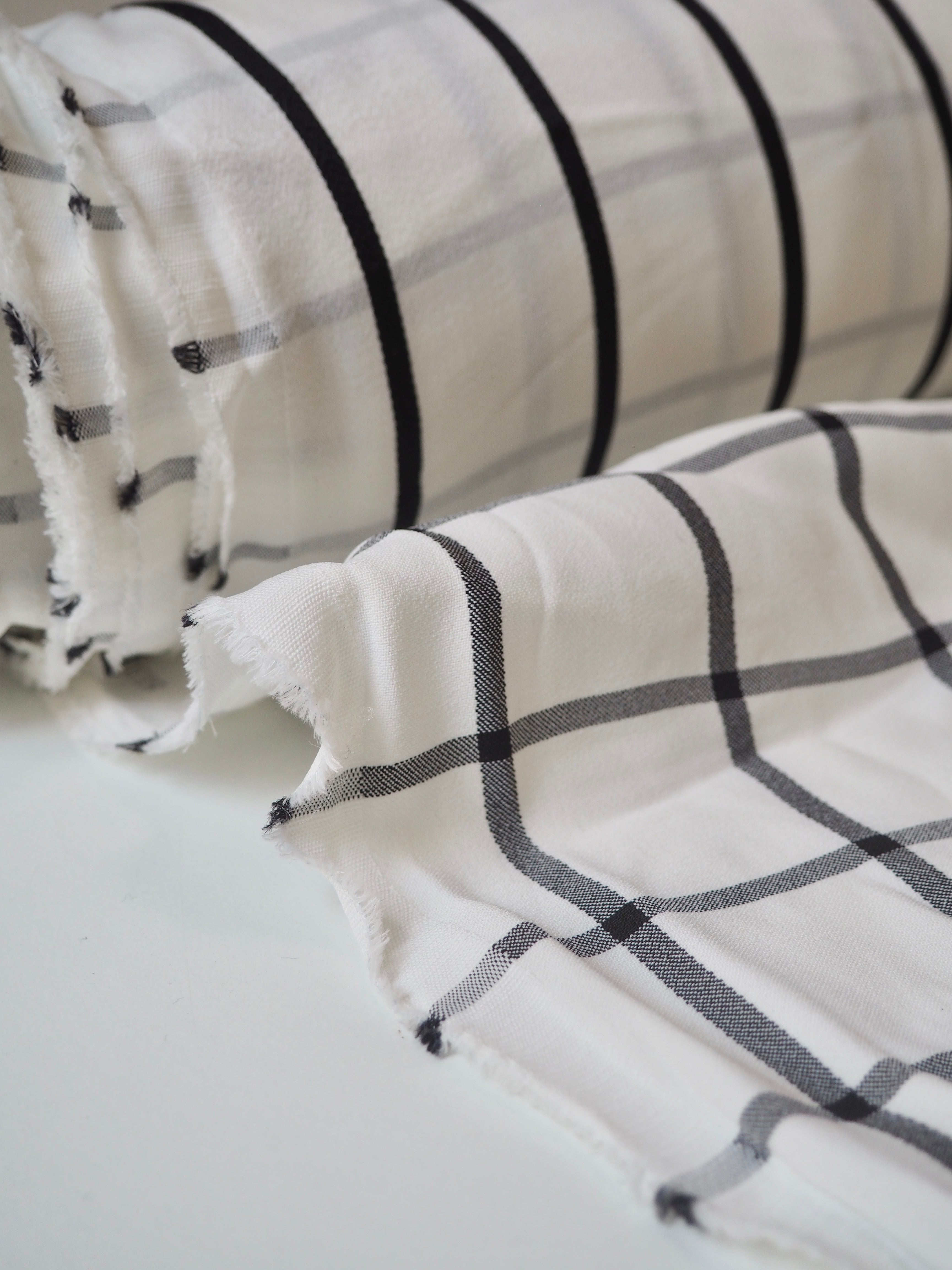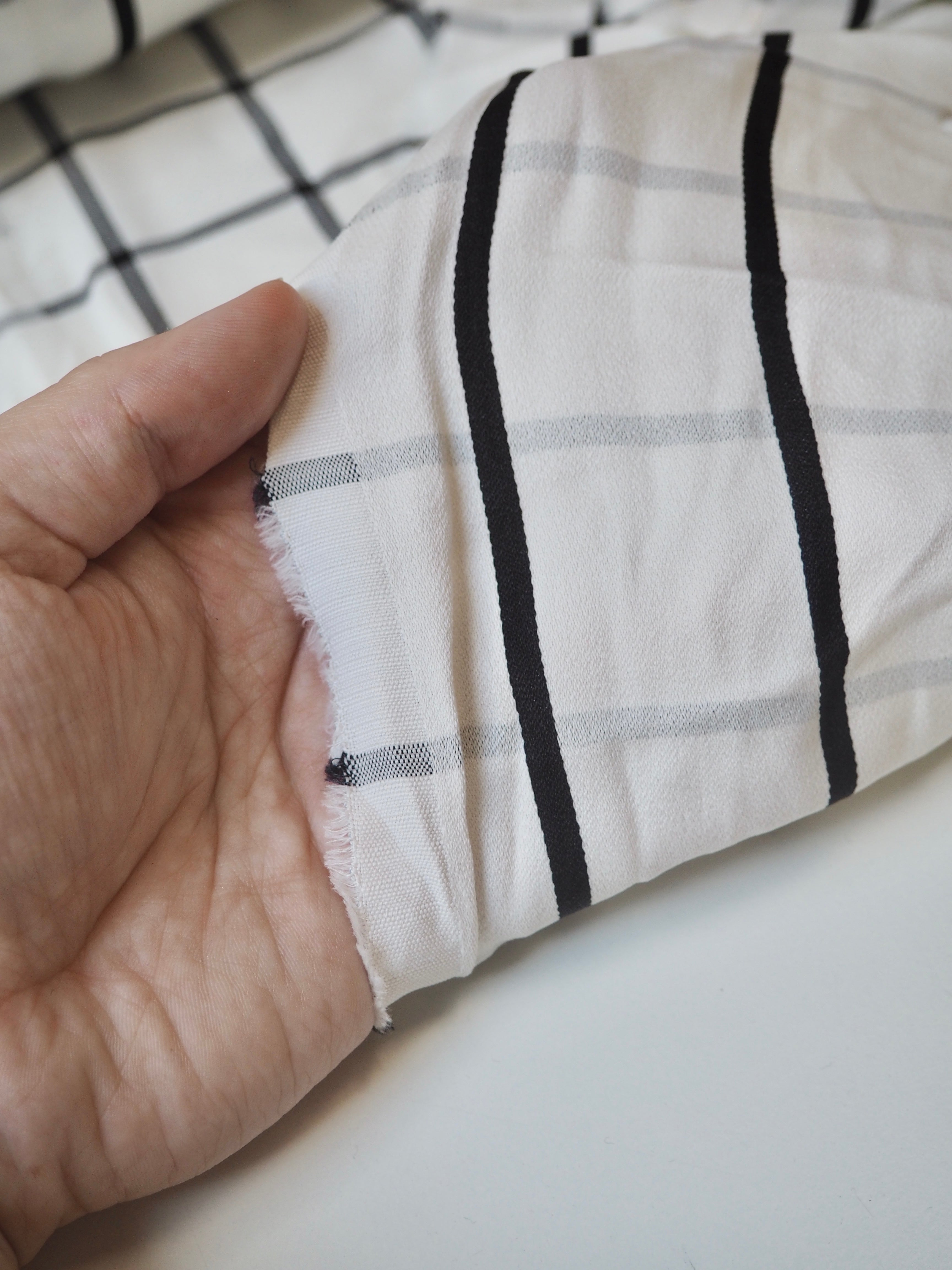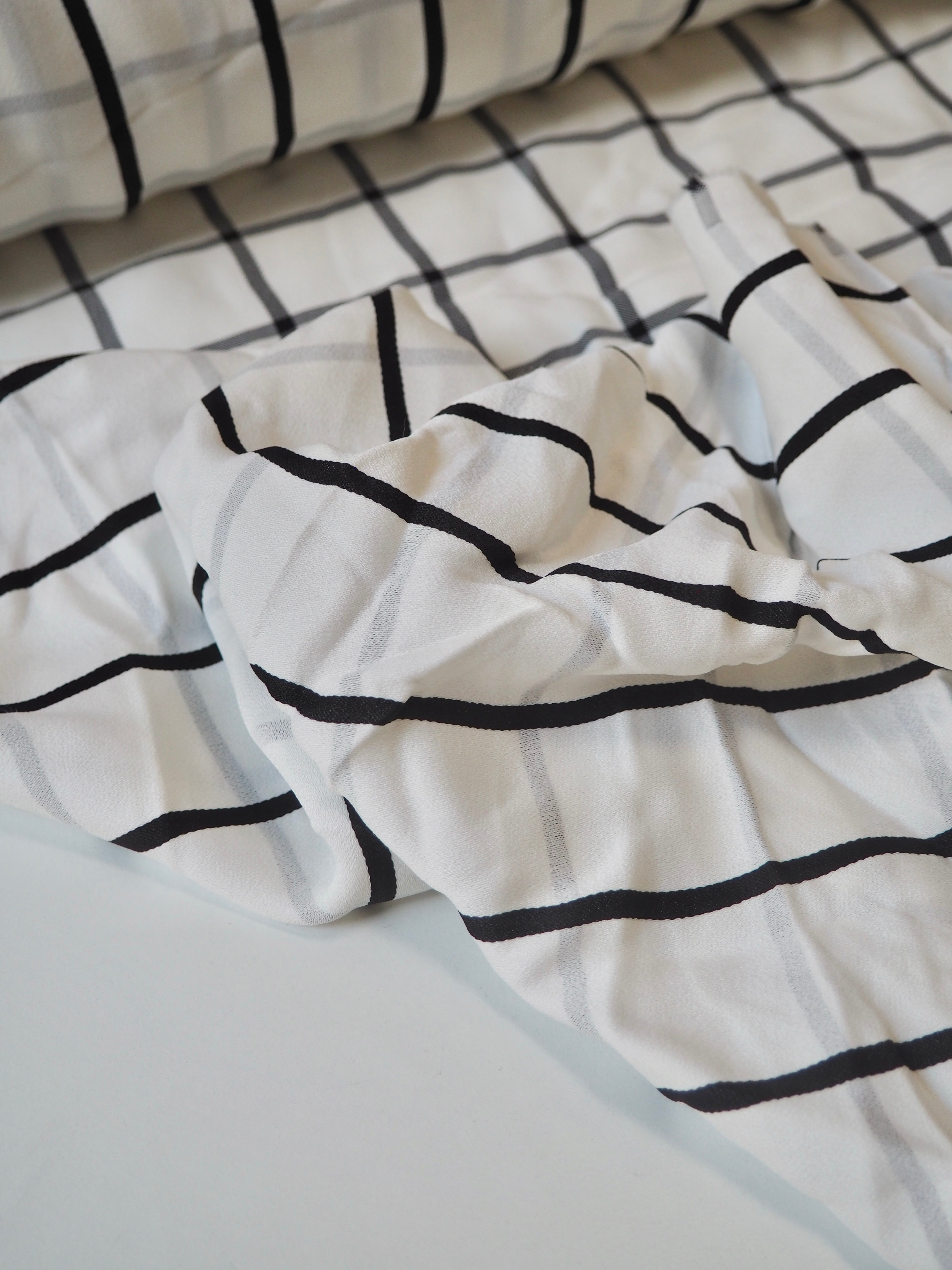 This ex-designer fabric is a gorgeous viscose satin. It's a unique double-sided cloth, with a black stripe on the satin side, and a black check on the crepe side. It's mostly opaque, quite slinky and smooth, and lovely against the skin. It has a silky, viscose handle and swishes so well! It's very drapey and lightweight, with such a lovely bright sheen on the satin side. Perfect for a wrap dress or top!