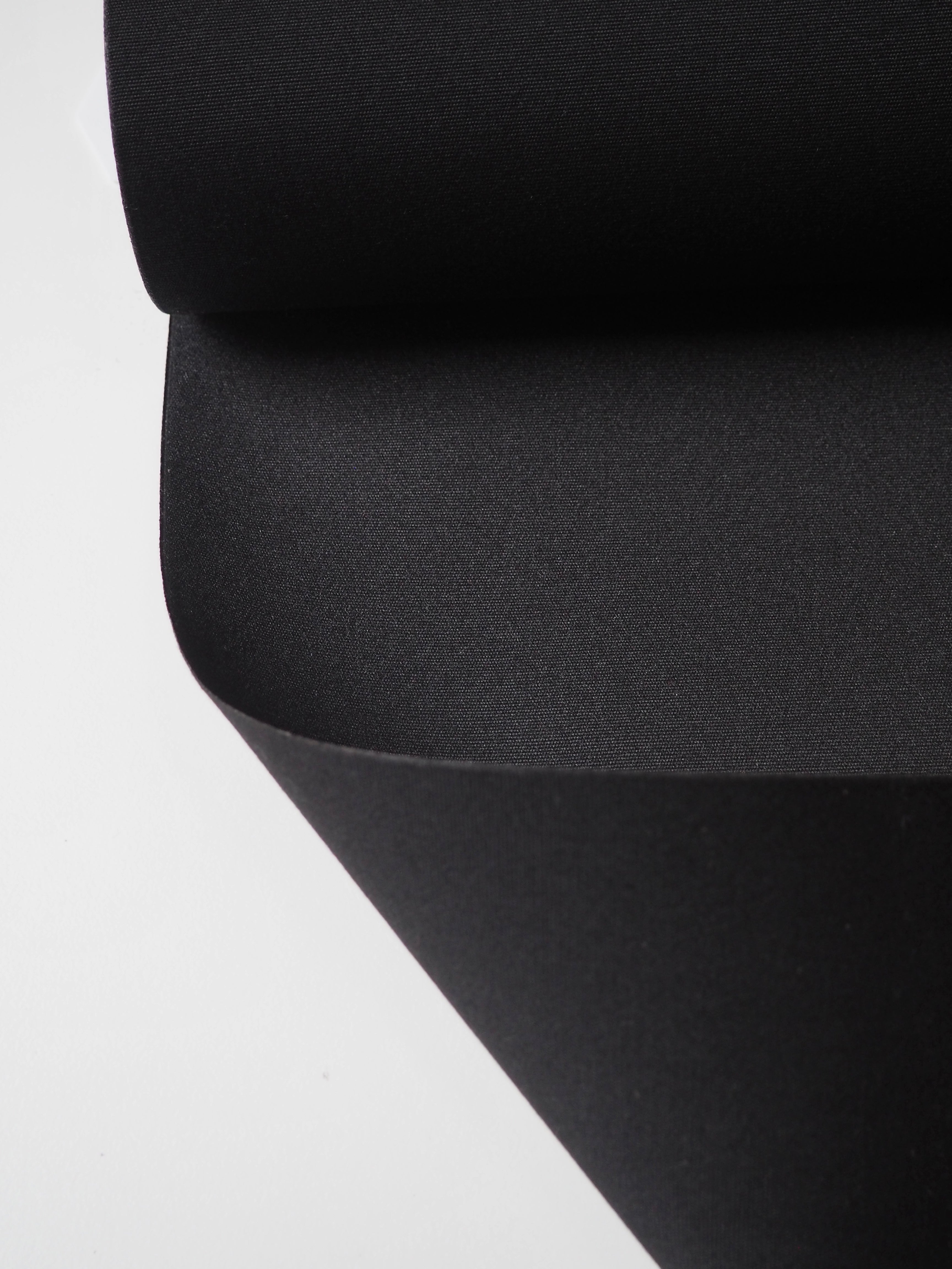 This ex-designer fabric is a canvas. It's black with a coated backing. Lightweight with a typical canvas weave and sturdy handle. It's a very structured canvas made for furnishing projects, but can be used as you like!