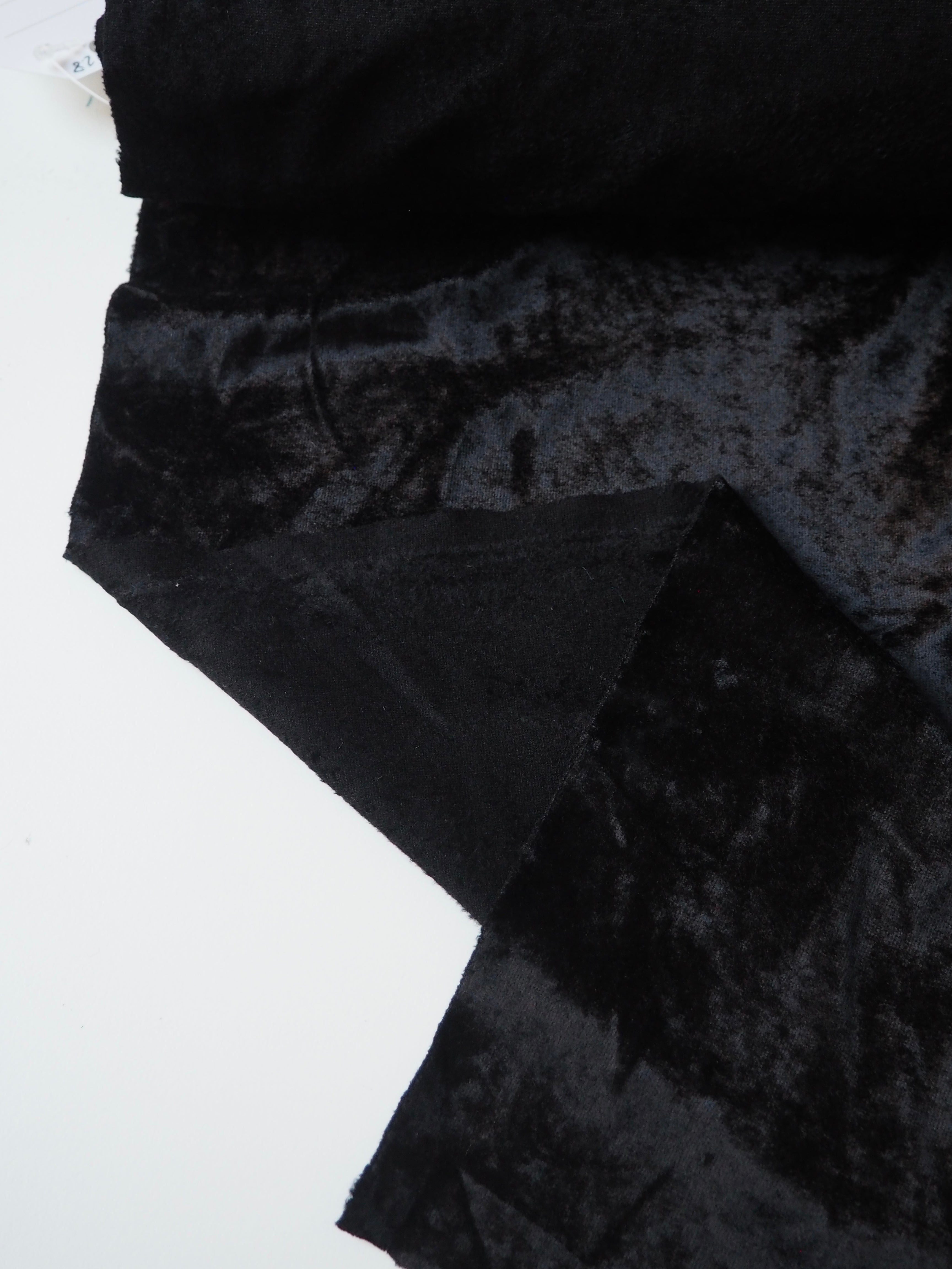 This ex-designer fabric is a velour. This black stretch velour jersey has a crushed finish. It's light to medium weight but still drapey and very eye-catching! Has about 40% stretch both-ways. Super soft with a nice handle. Would be amazing for a dress or top!