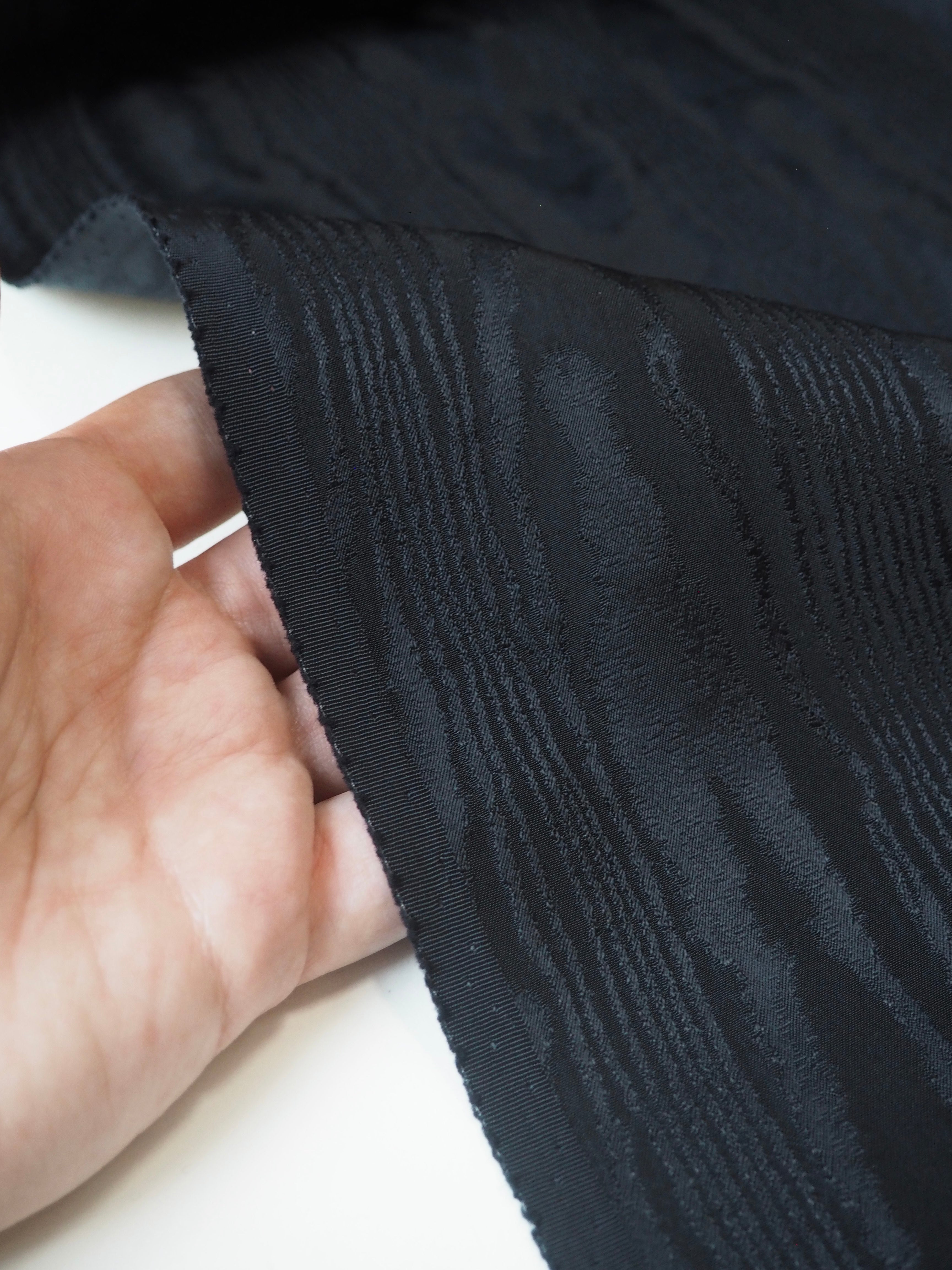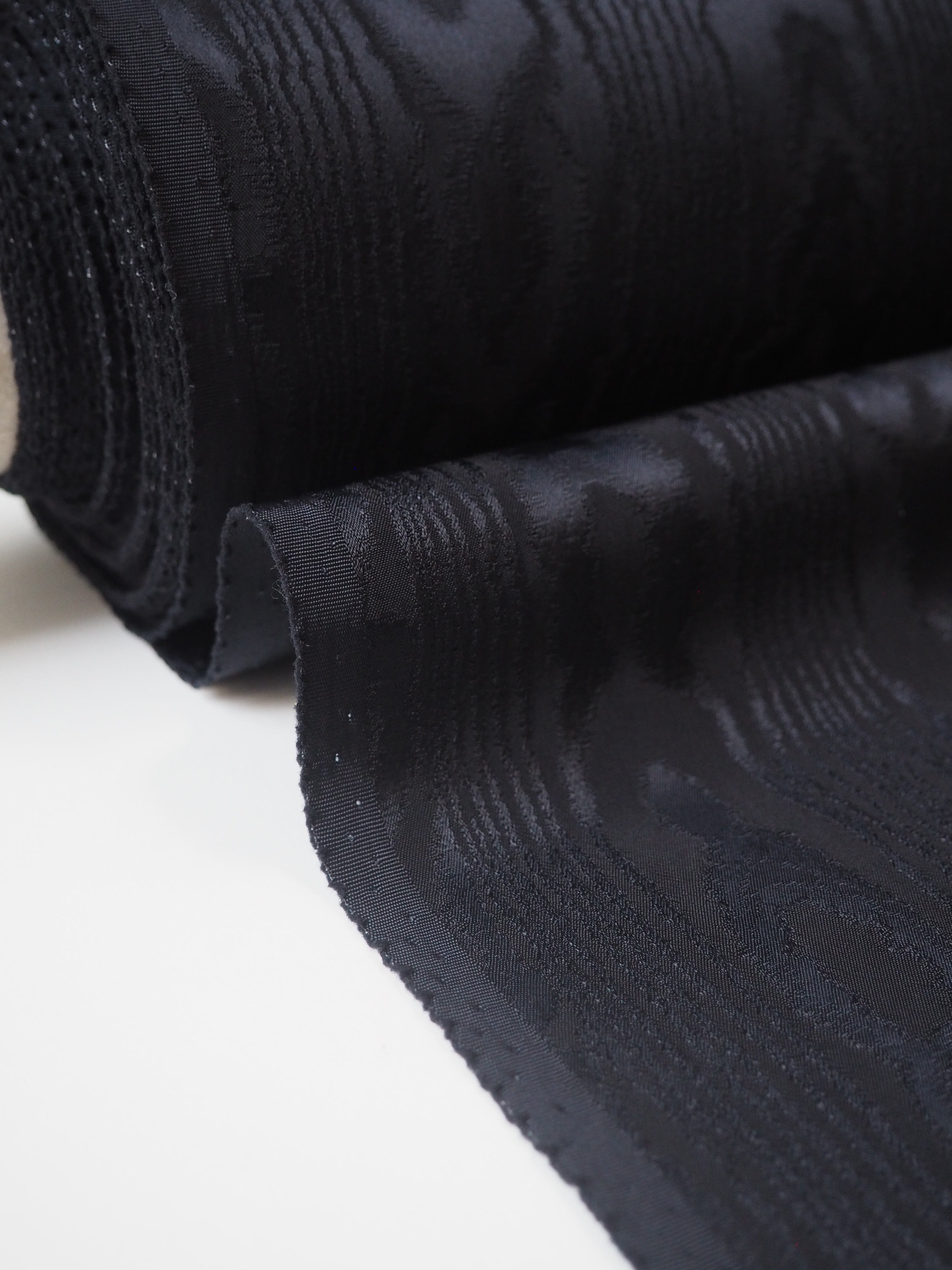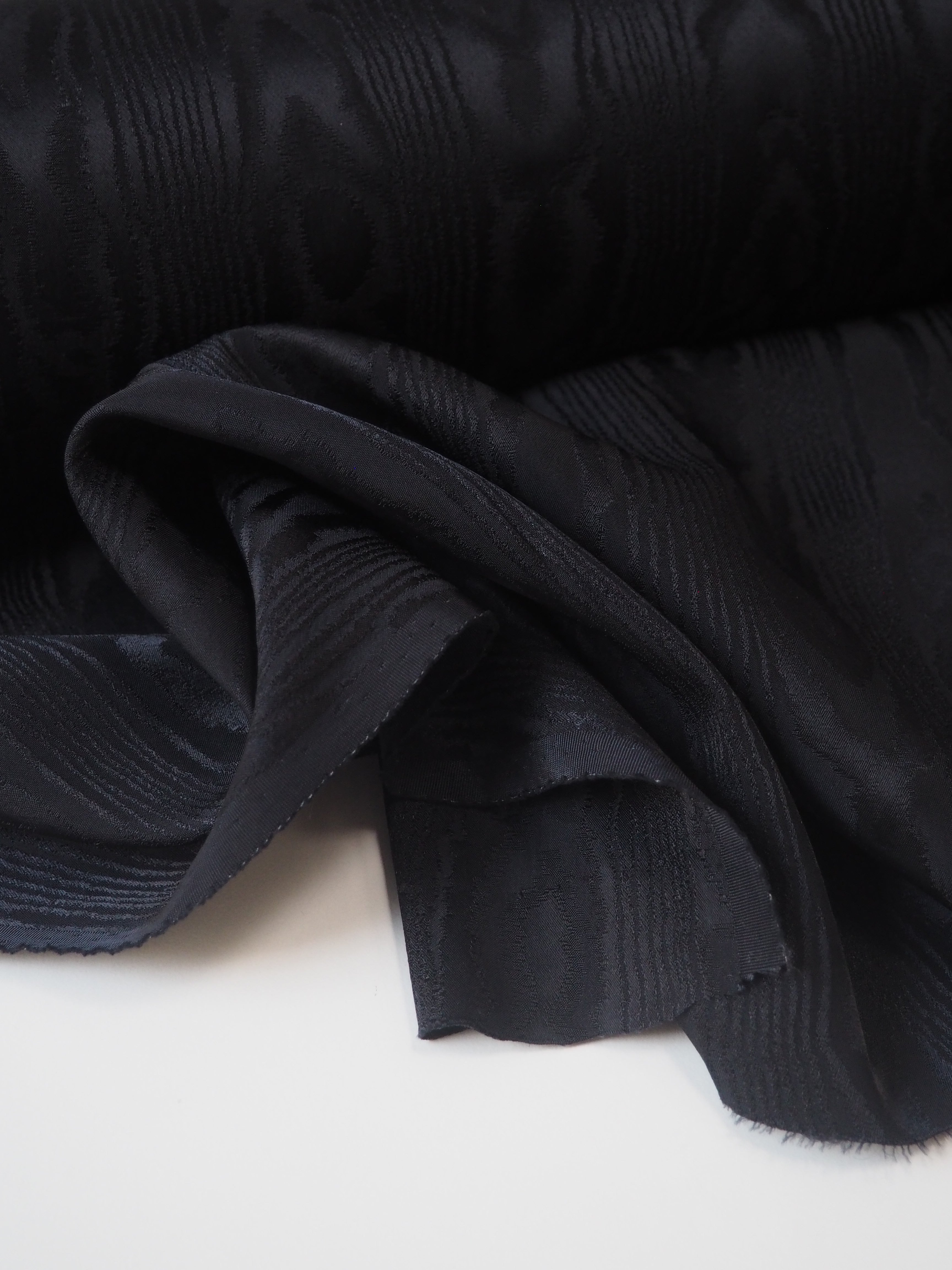 This ex-designer fabric is a nylon moiré. Moiré is a finish that is typically applied to ribbed fabric such as a grosgrain that creates a watermark pattern. The finish is created through a process called calendaring, where fabric is passed through rollers are high pressures and temperatures. With moiré, the rollers cause the ribs of the grosgrain to be compressed in different places which creates the unique pattern. This fabric has a moiré jacquard weave, rather than the typical machine compression. It has a lovely structured drape and a bright sateen shine. Light to medium weight with a slinky, smooth handle. Such a special cloth! Would make a stunning LBD!