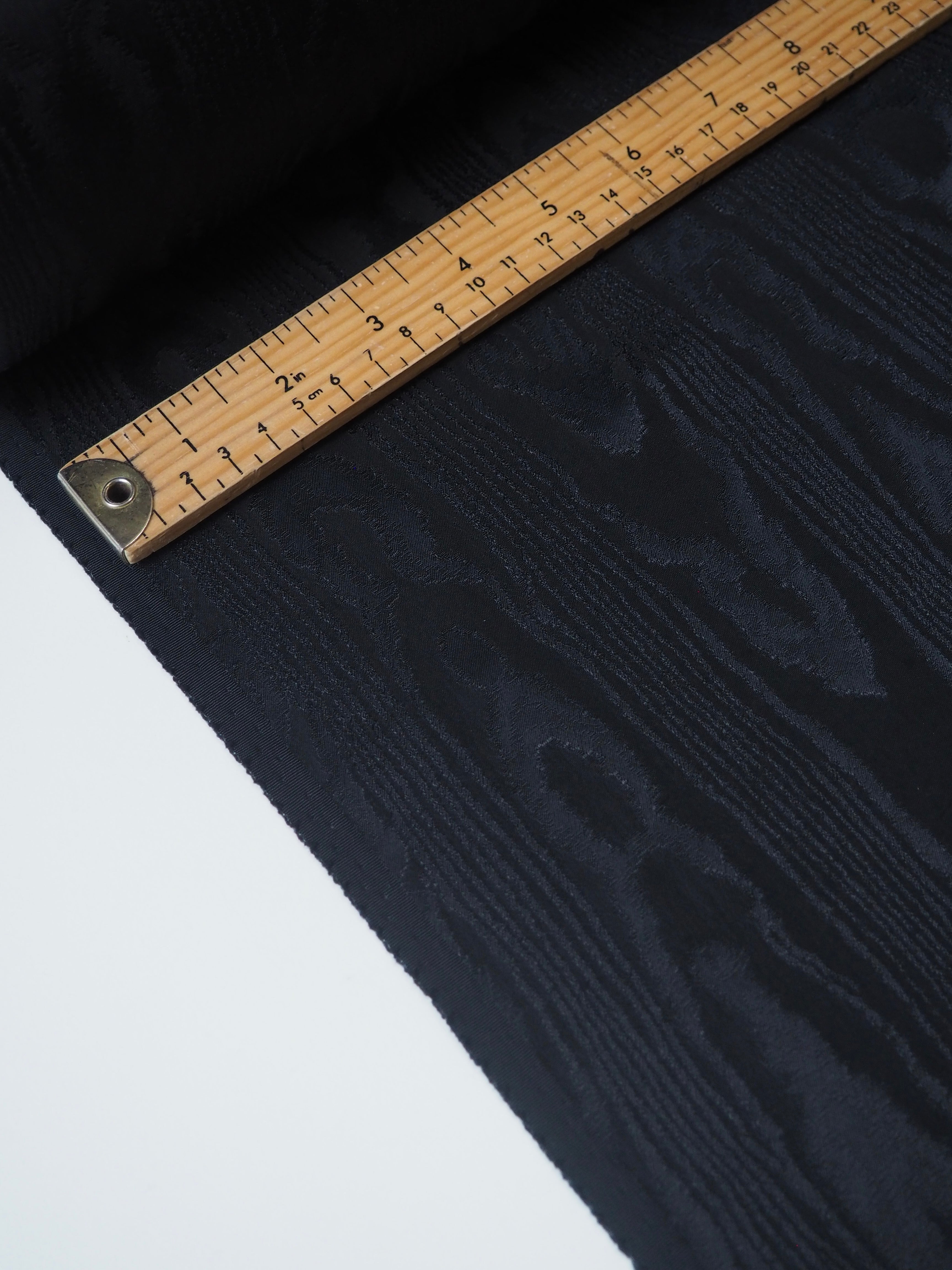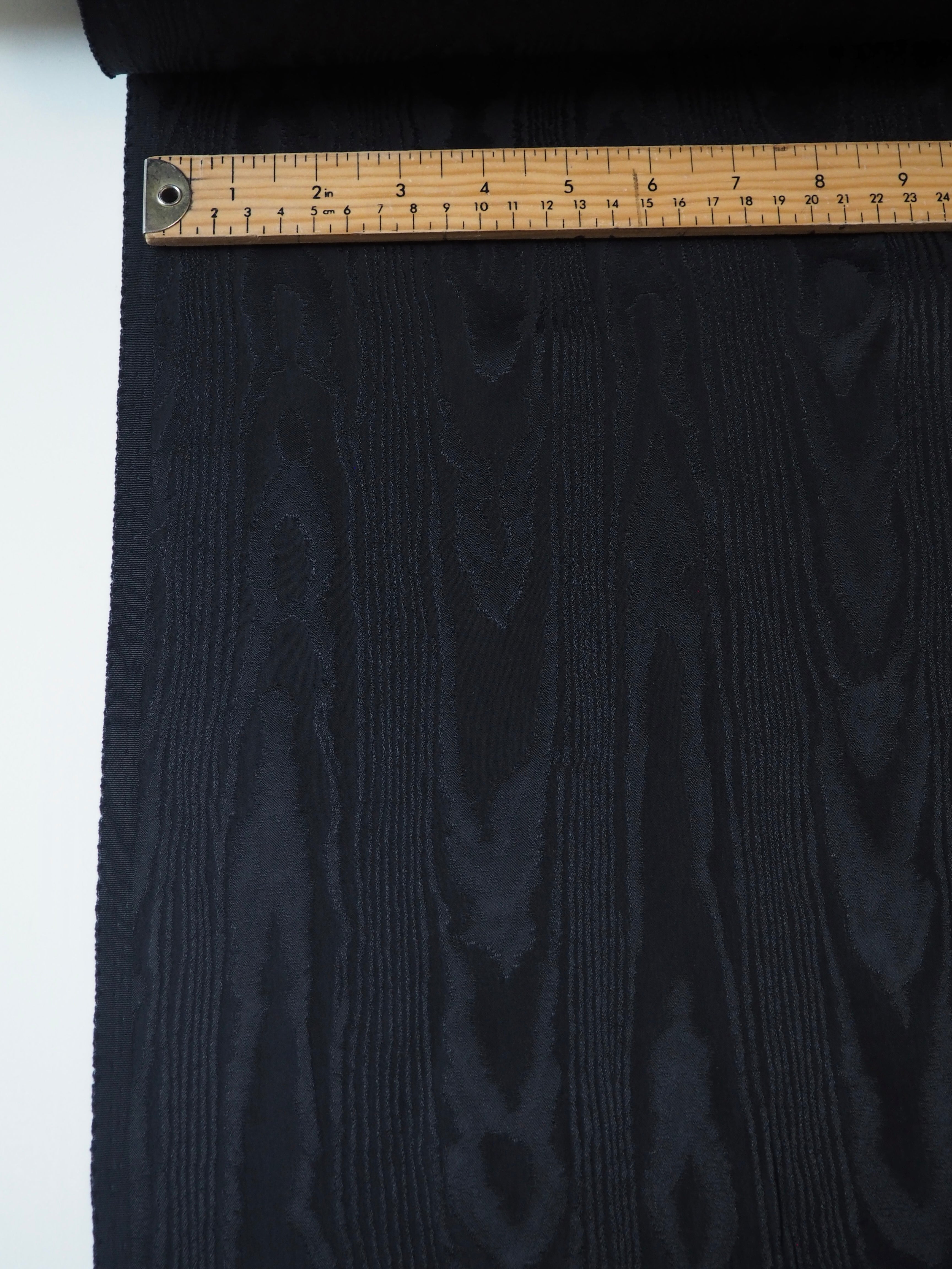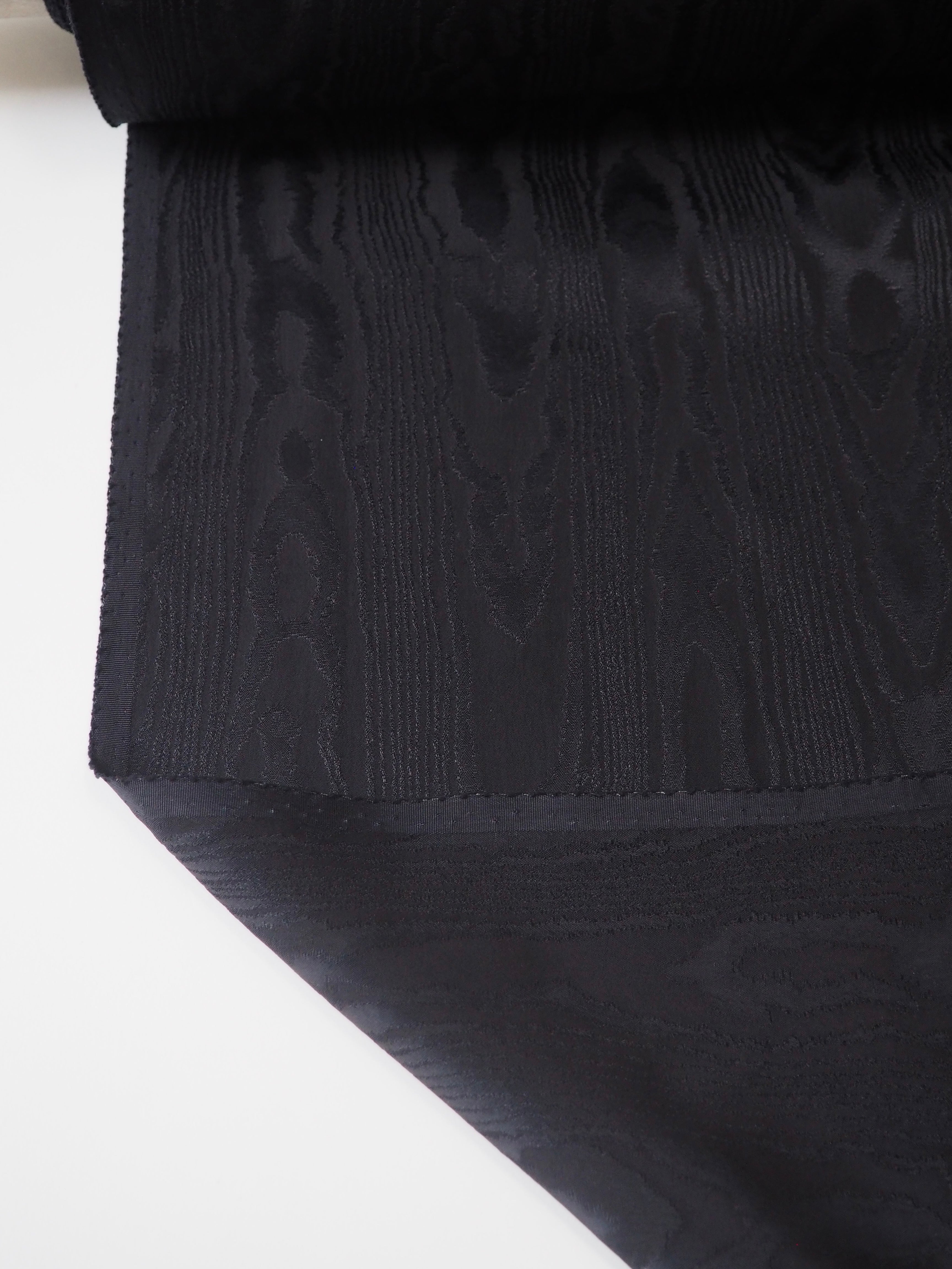 This ex-designer fabric is a nylon moiré. Moiré is a finish that is typically applied to ribbed fabric such as a grosgrain that creates a watermark pattern. The finish is created through a process called calendaring, where fabric is passed through rollers are high pressures and temperatures. With moiré, the rollers cause the ribs of the grosgrain to be compressed in different places which creates the unique pattern. This fabric has a moiré jacquard weave, rather than the typical machine compression. It has a lovely structured drape and a bright sateen shine. Light to medium weight with a slinky, smooth handle. Such a special cloth! Would make a stunning LBD!