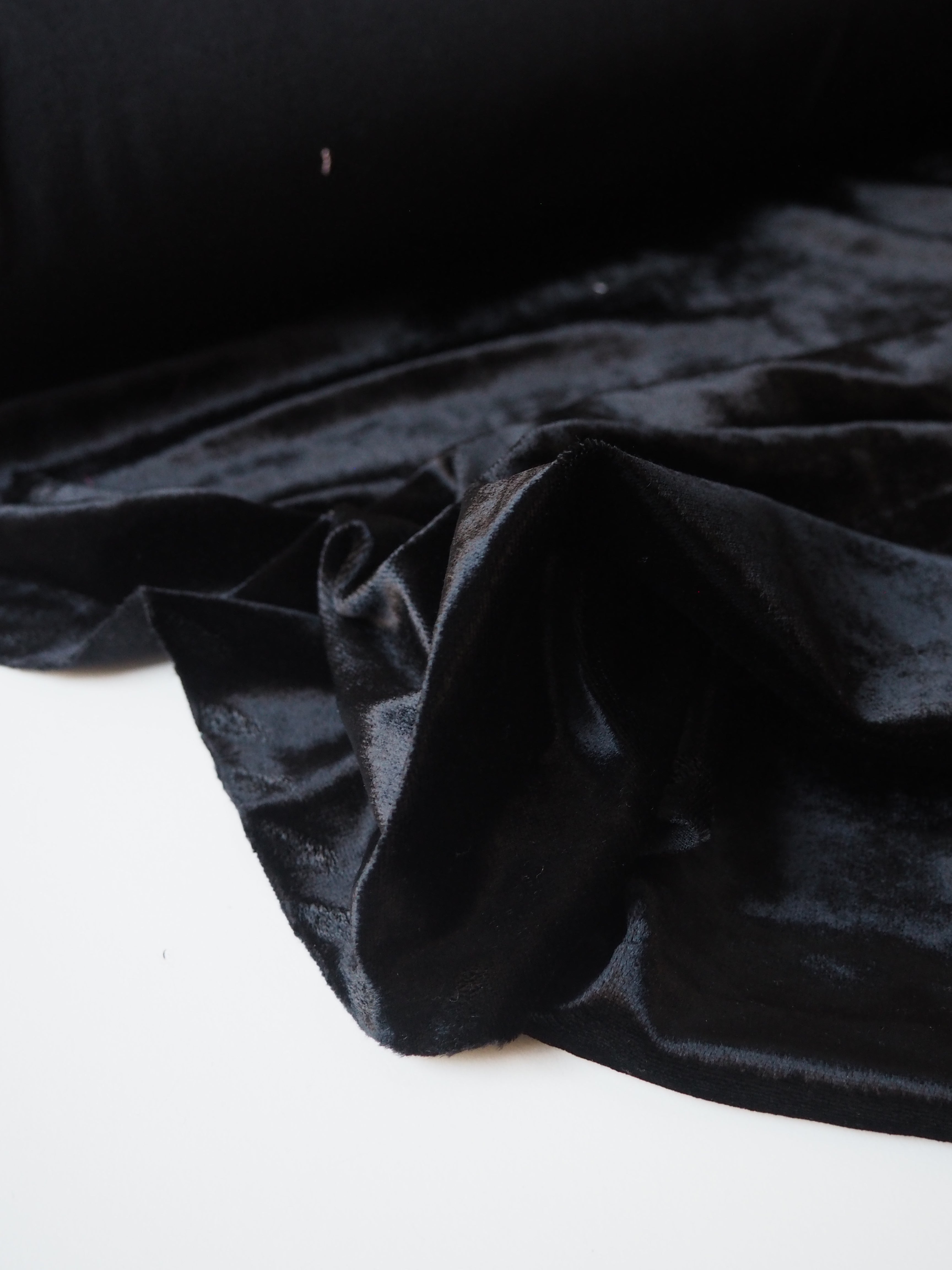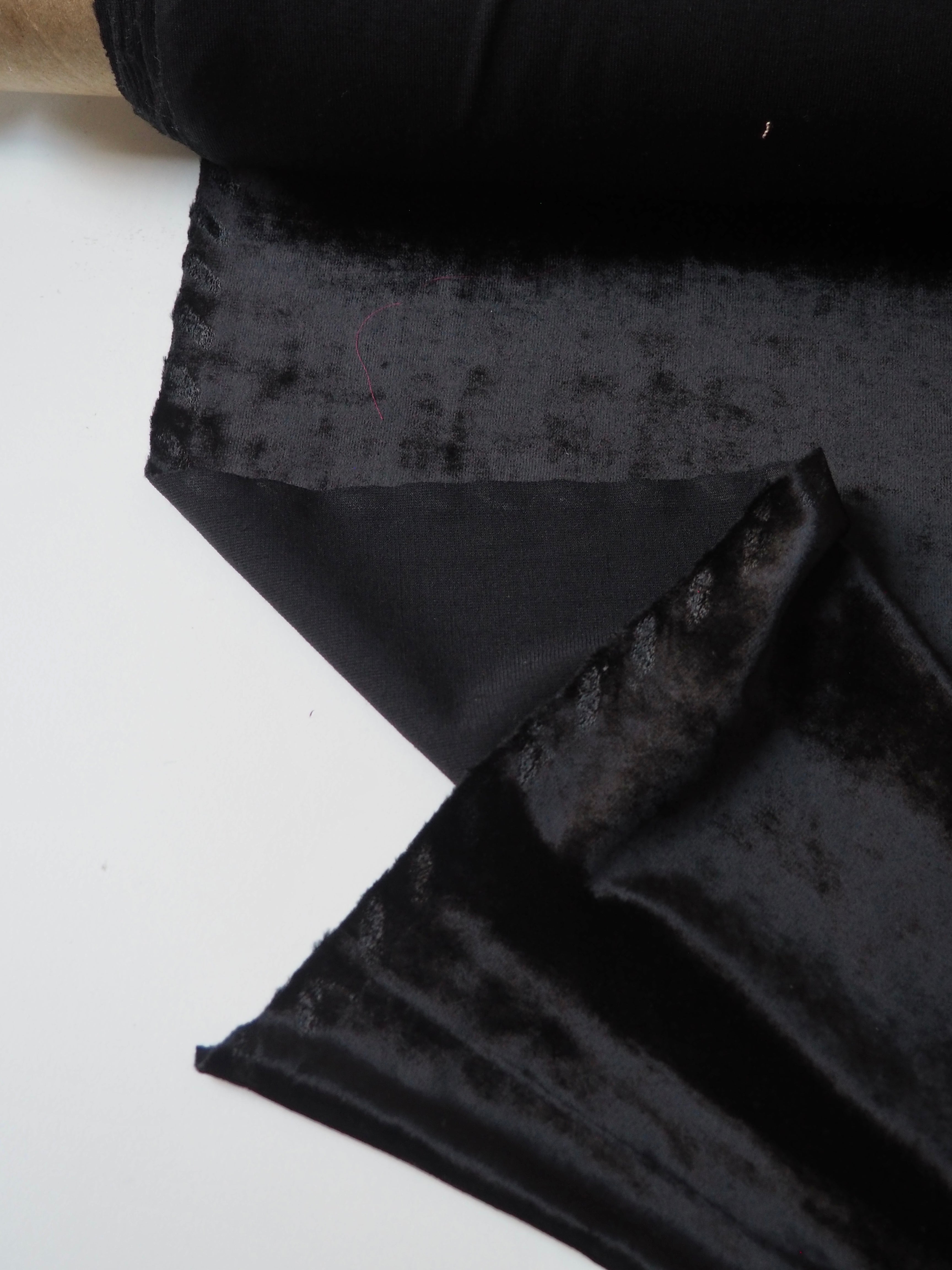 This ex-designer fabric is a velour. This black stretch velour jersey has a lovely sheen finish. It's light to medium weight but still drapey and very eye-catching! Has about 40% stretch both-ways. Super soft with a nice handle. Would be amazing for a dress or top!